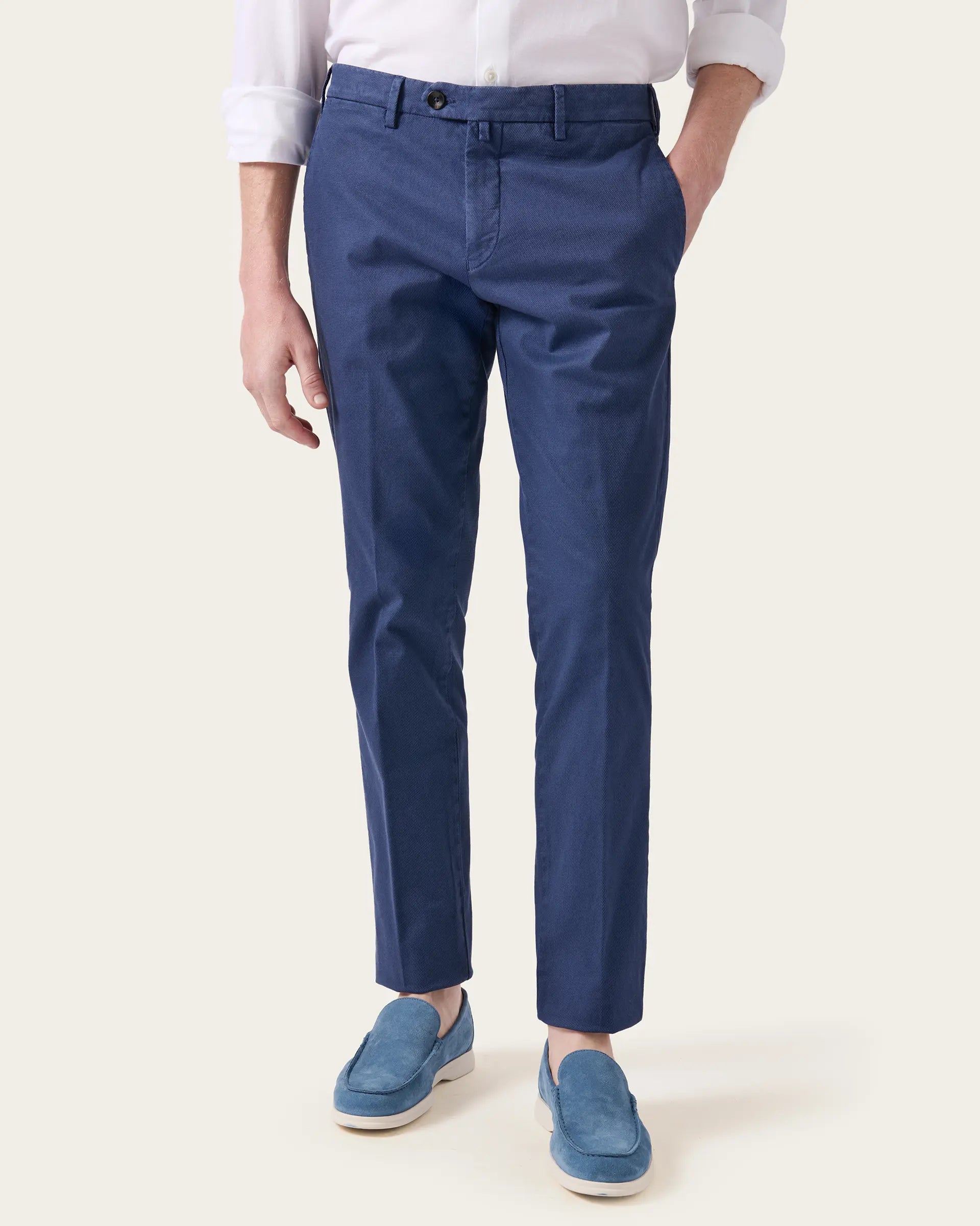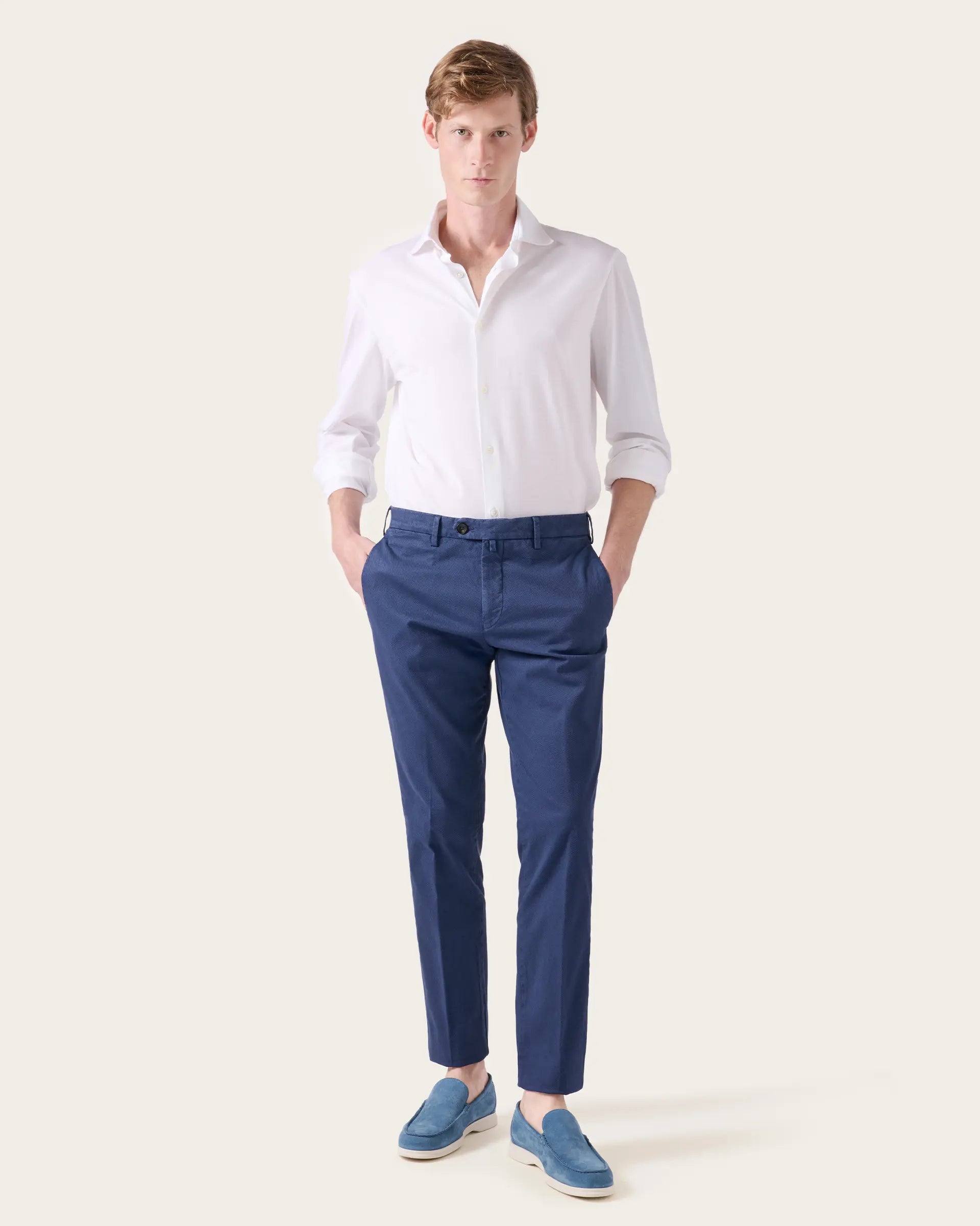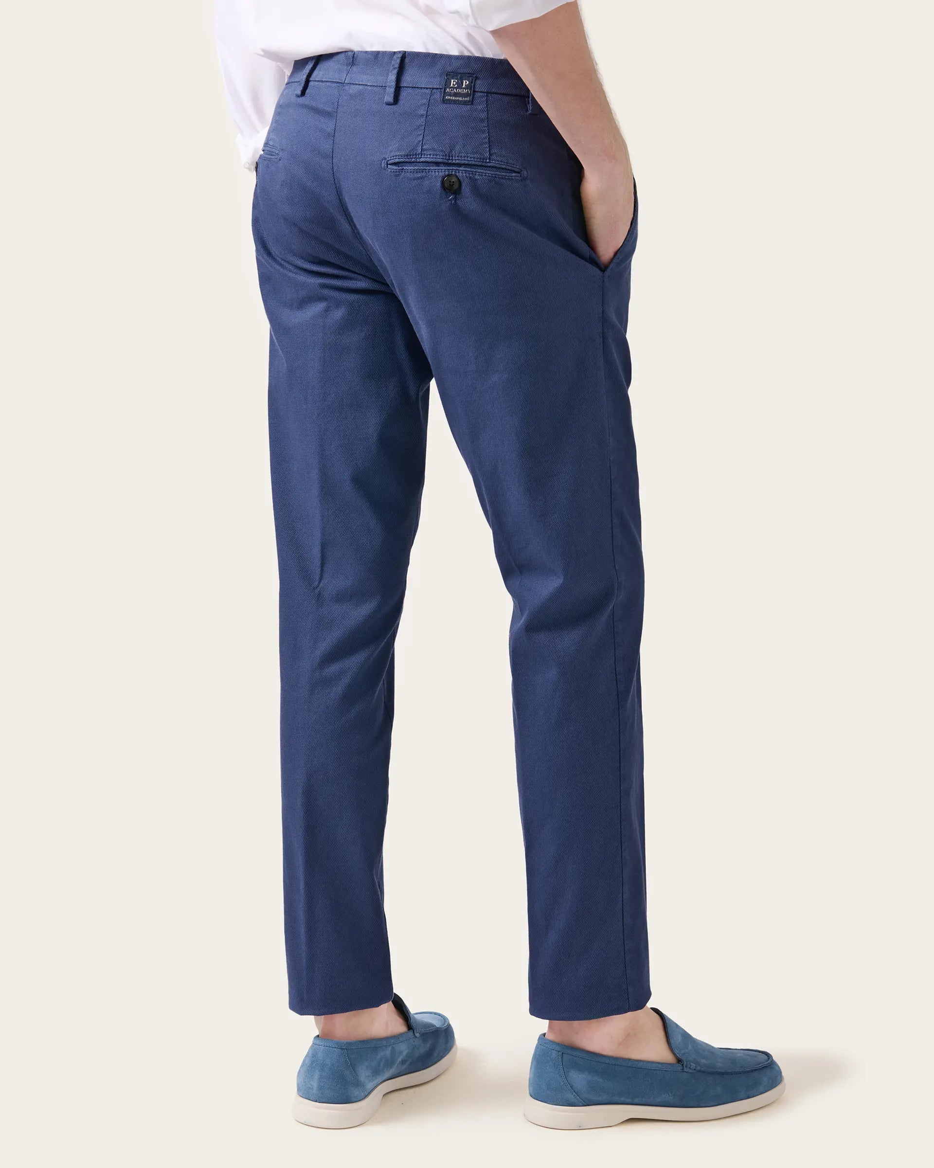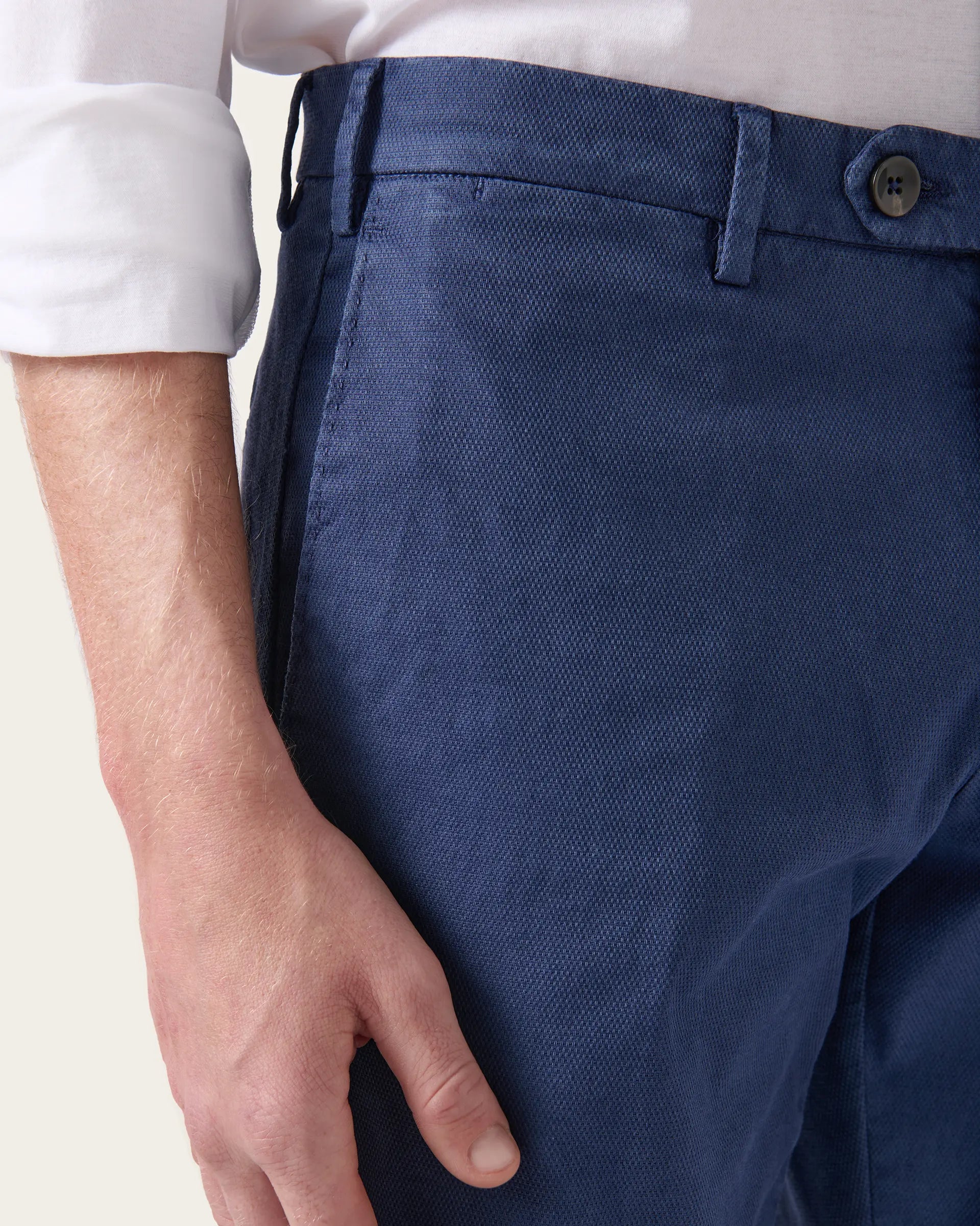 Pantalone chino realizzato in cotone reps stretch tinto in capo, caratterizzato da un tessuto armaturato derivante da un particolare intreccio tra la trama e l’ordito. Il risultato è un pantalone fresco e robusto particolarmente confortevole e pratico per il lavoro e per il tempo libero. La tintura in capo aggiunge un piacevole effetto cromatico ad un capo smart casual esaltando i tuoi outfit con sobrietà ed eleganza.