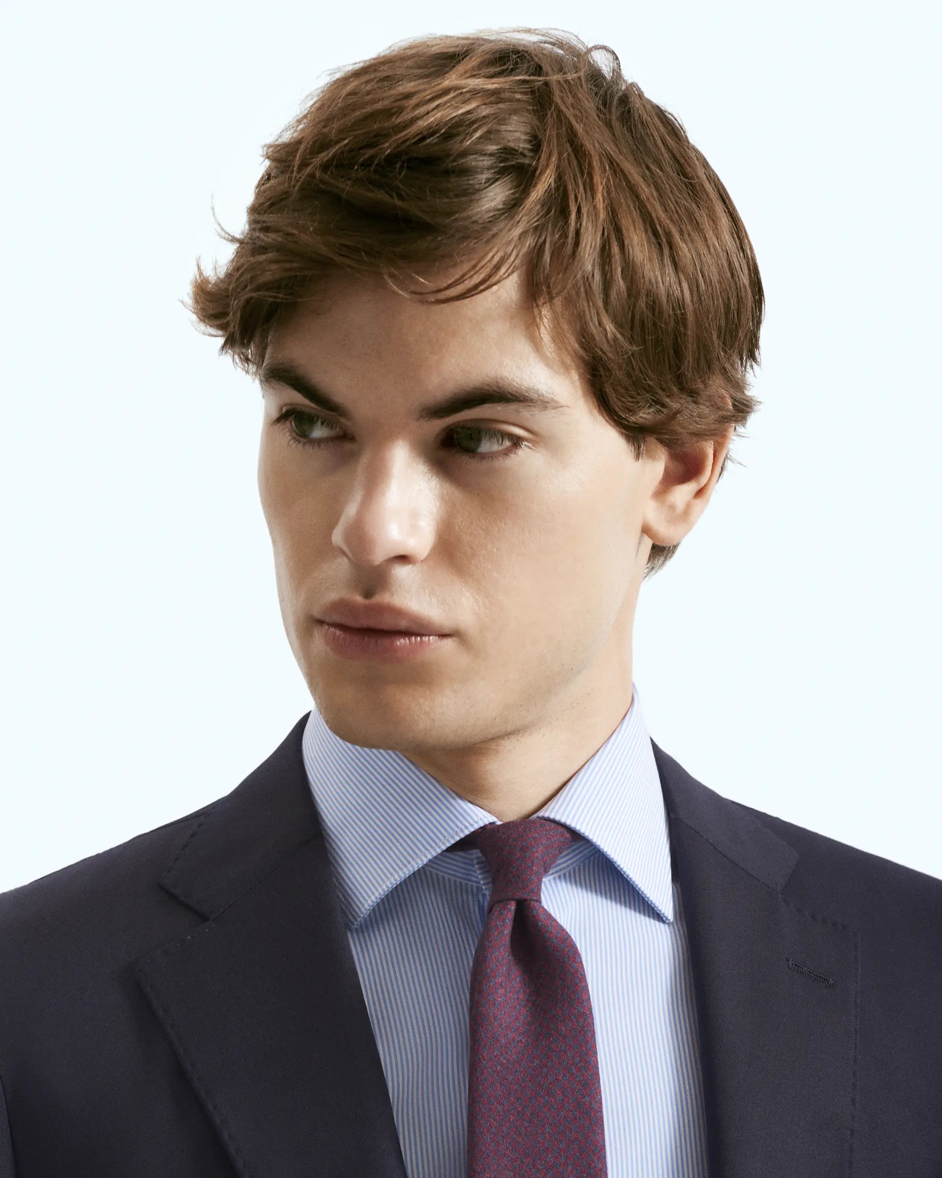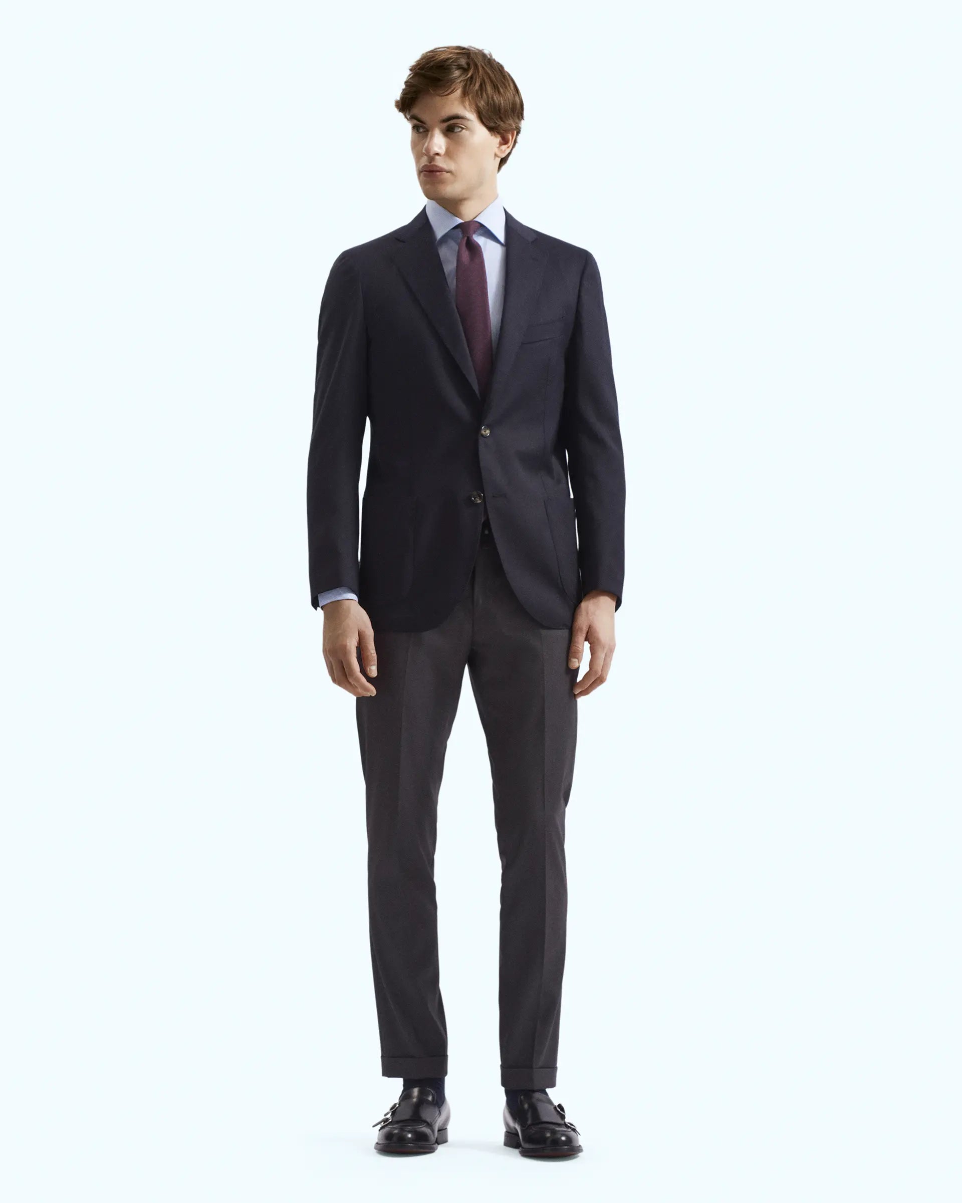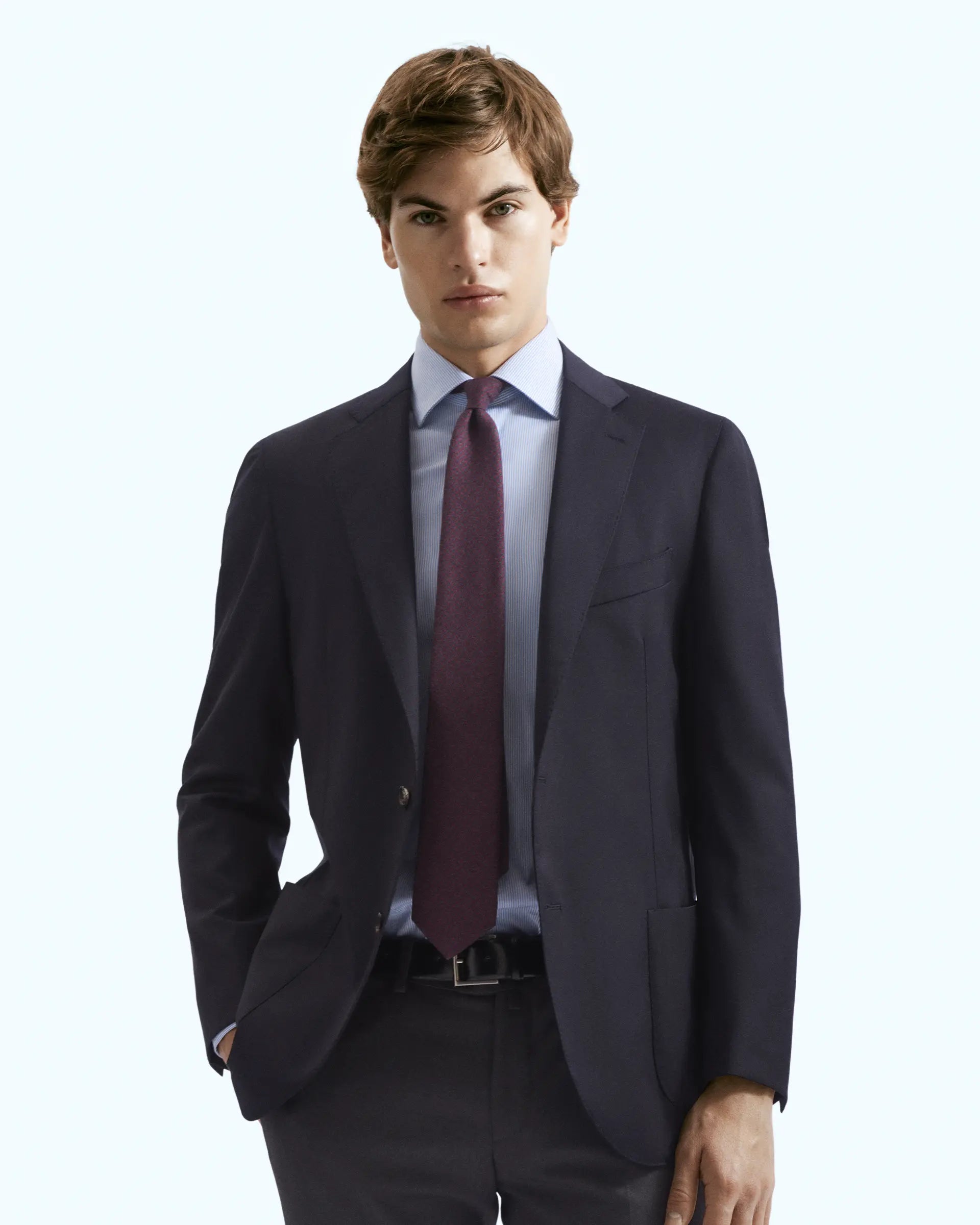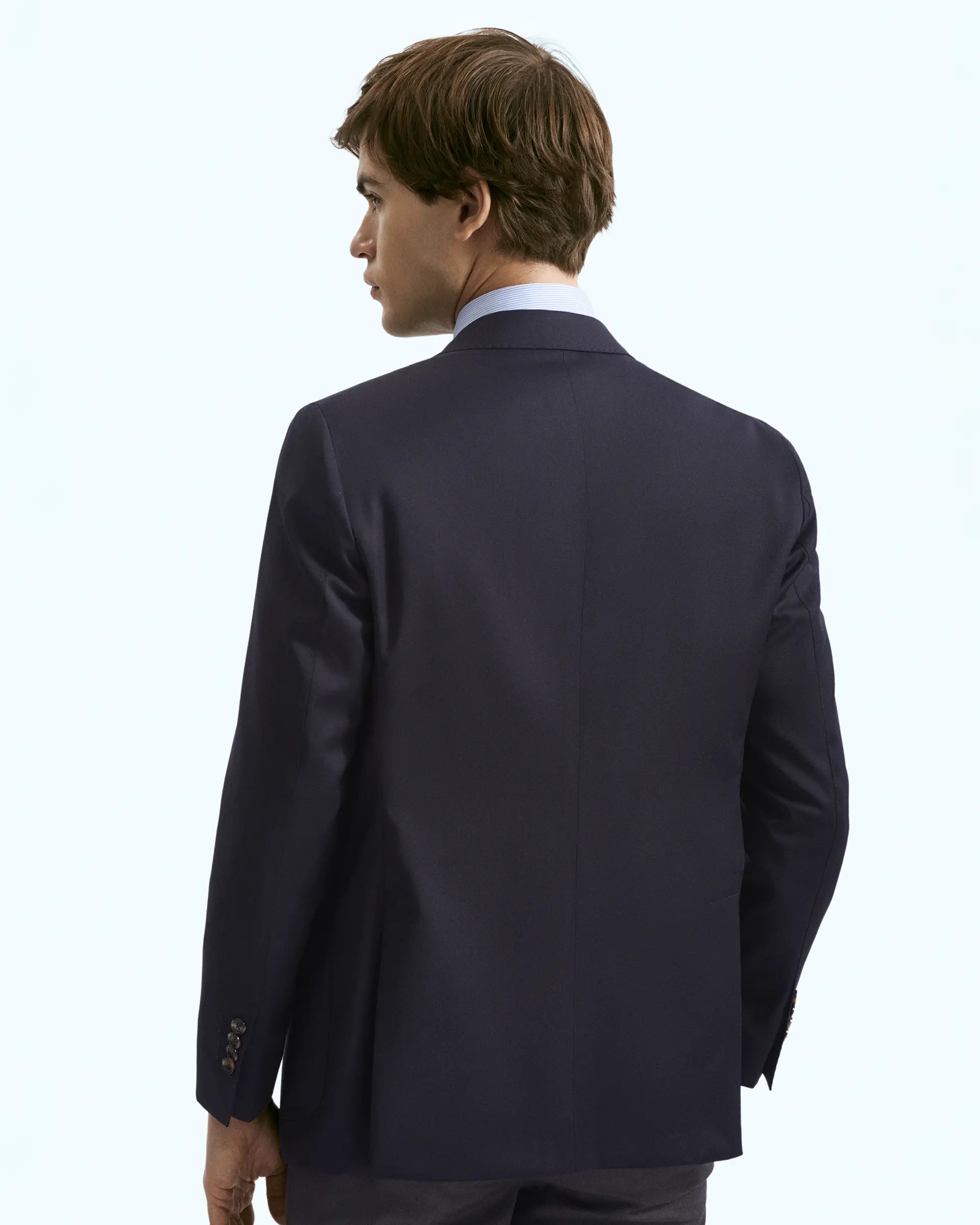 Blazer monopetto sfoderato d’ispirazione sartoriale con trama micro-design blu realizzato con tessuto Reda della linea "Flexo" che spicca per le sue elevate caratteristiche di elasticità e sostenibilità adattandosi perfettamente alla silhouette per una vestibilità confortevole. Modello a due bottoni con spallina leggera, doppio spacco e tasche applicate. Un capo capace di adattarsi ad ogni occasione.