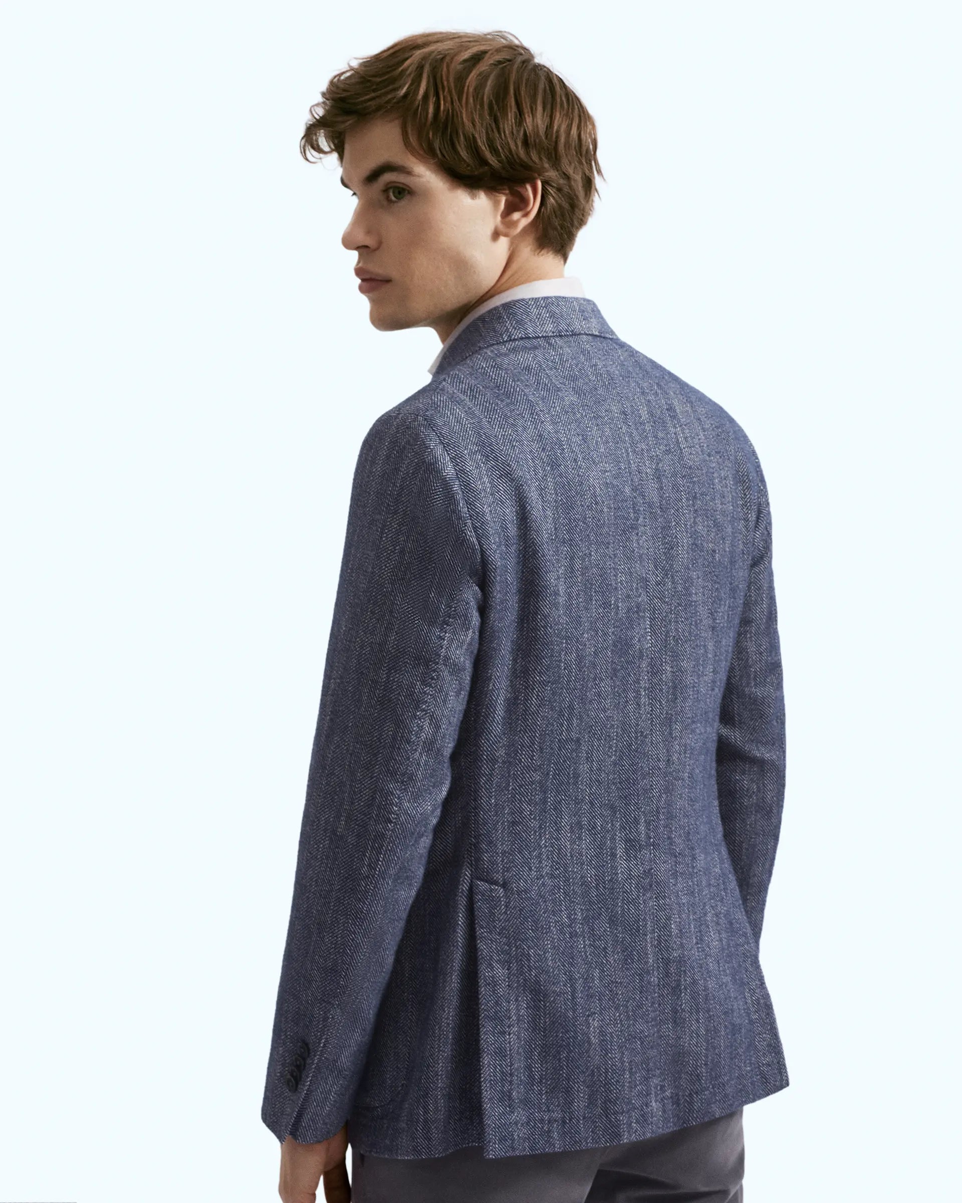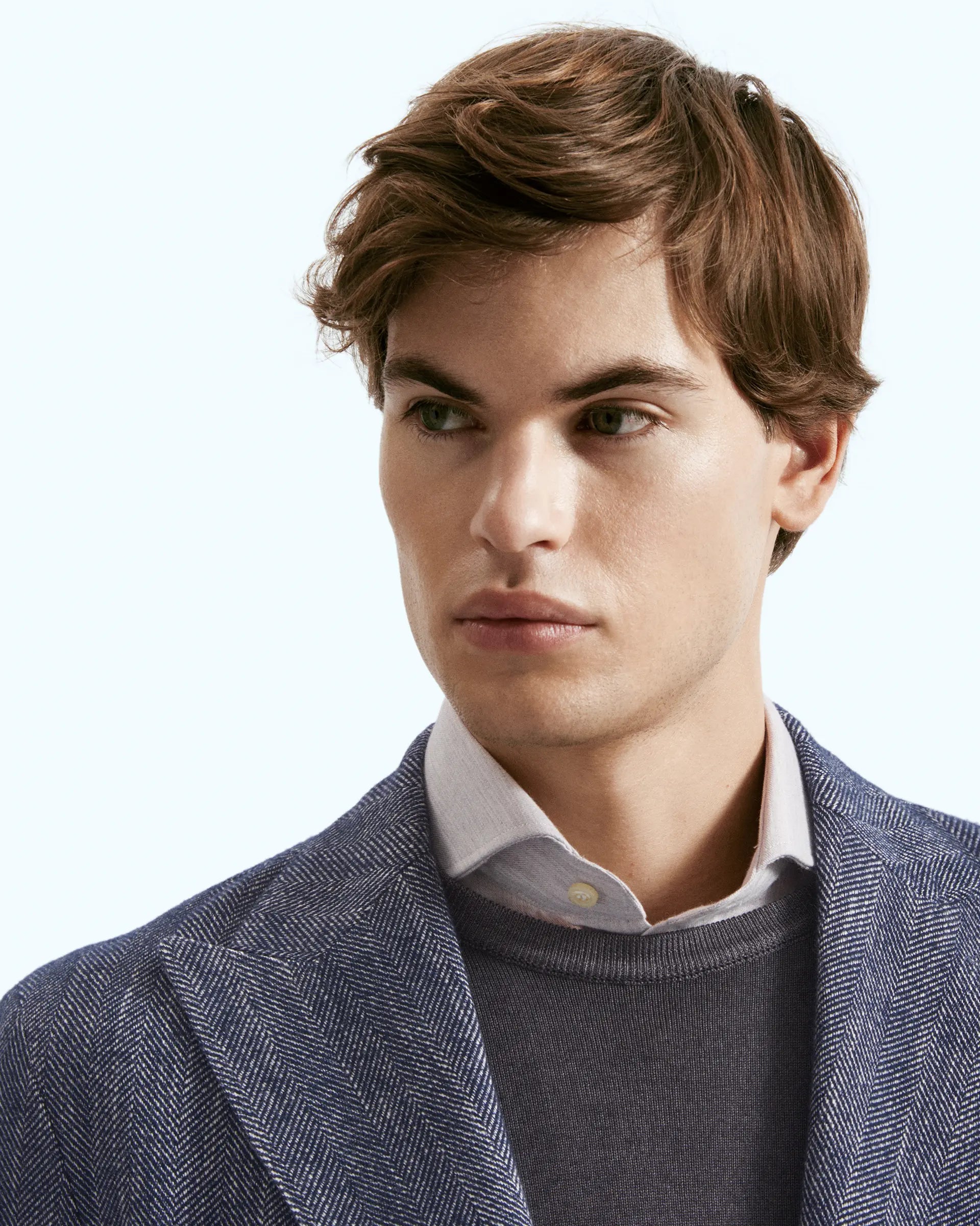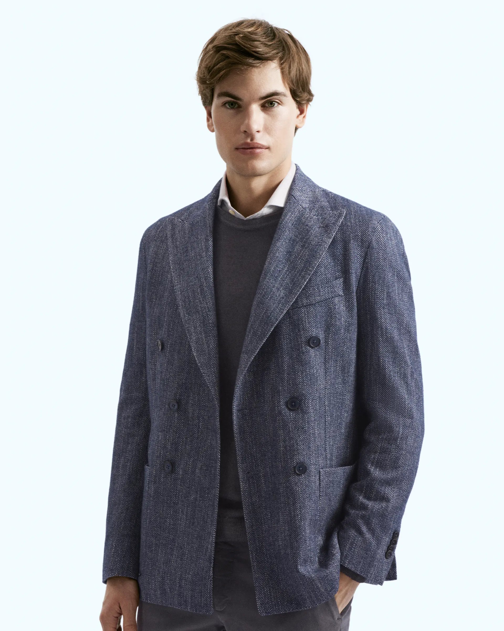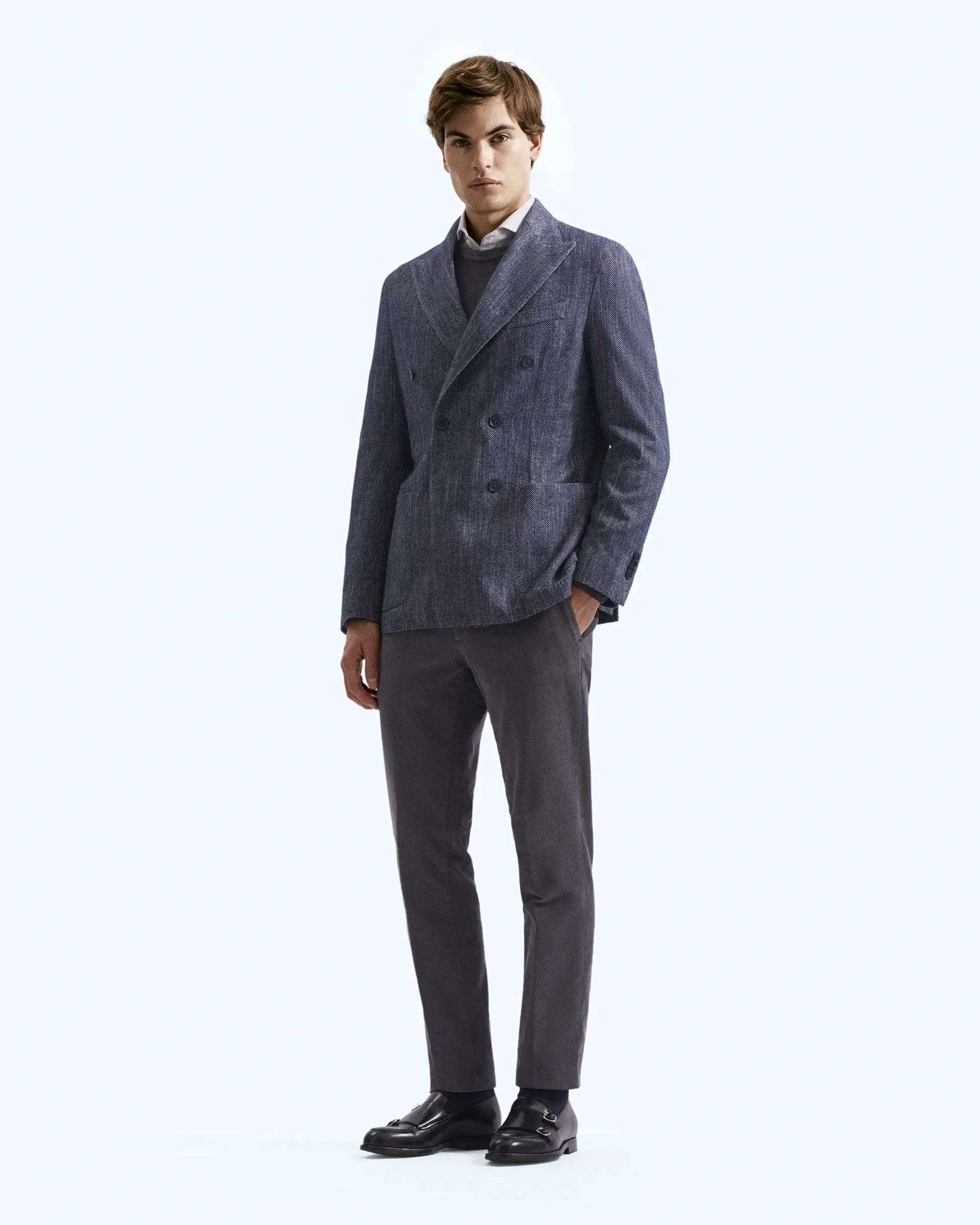 Giacca doppiopetto da uomo in 100% cotone lavata in capo. La texture è caratterizzata da un delicato disegno a micro-resca tono su tono. Il rever a punta lancia e le tasche a toppa completano il taglio sartoriale di questo blazer elegante e raffinato. Un approccio innovativo all’idea della giacca formale.