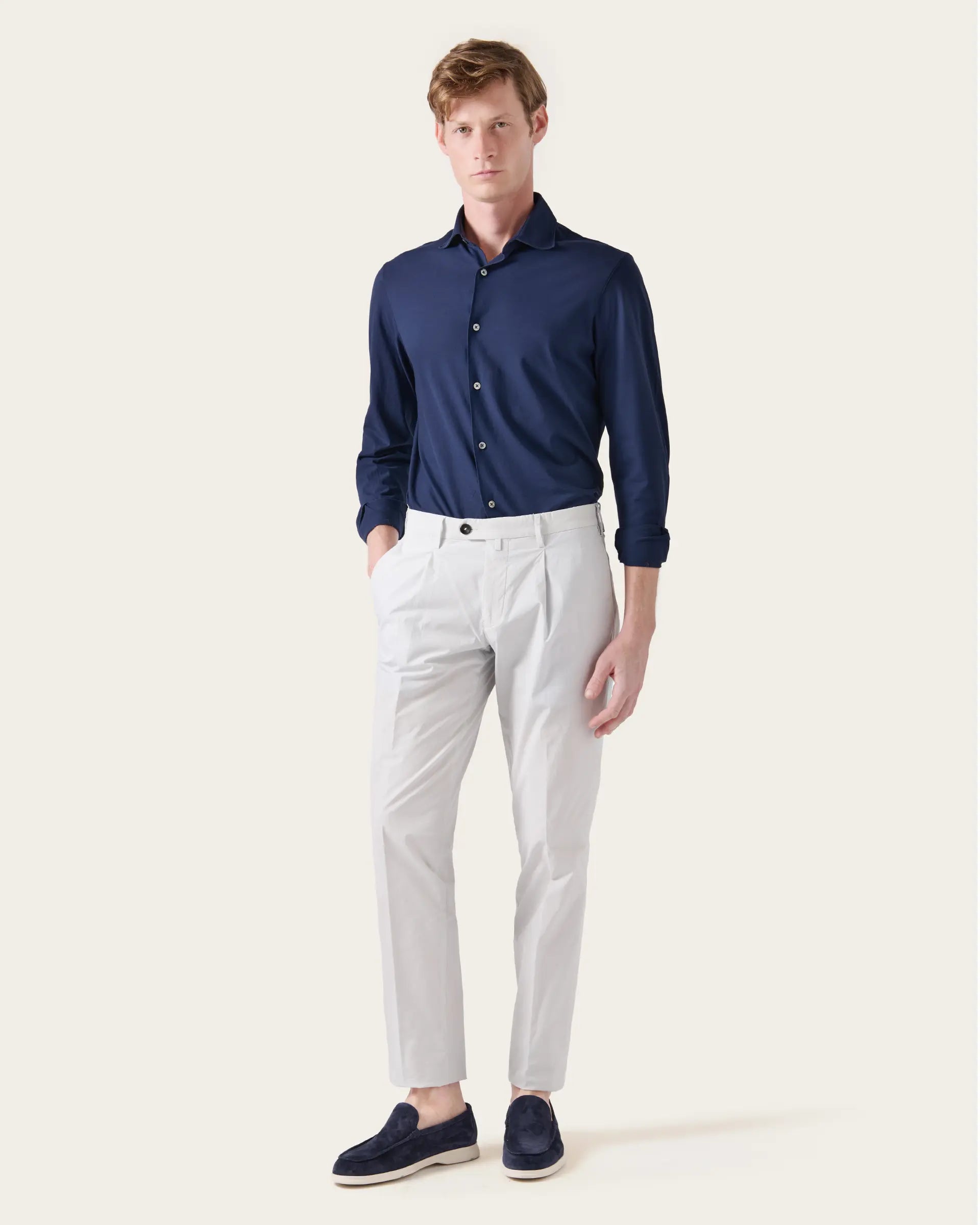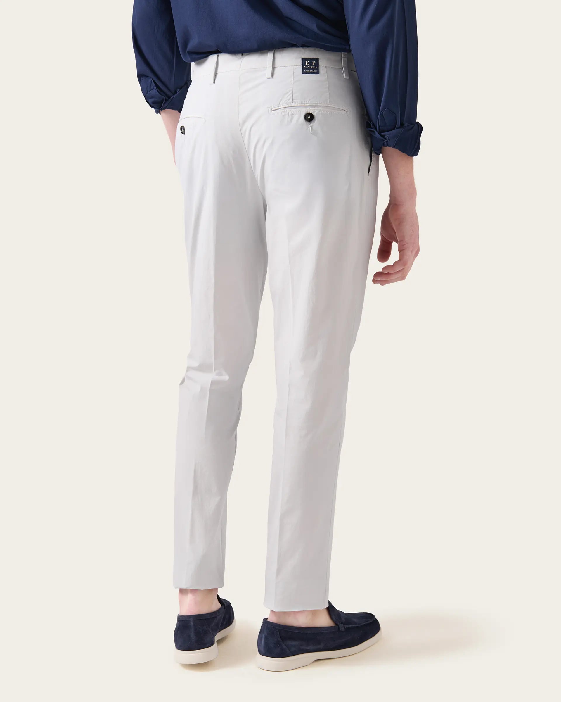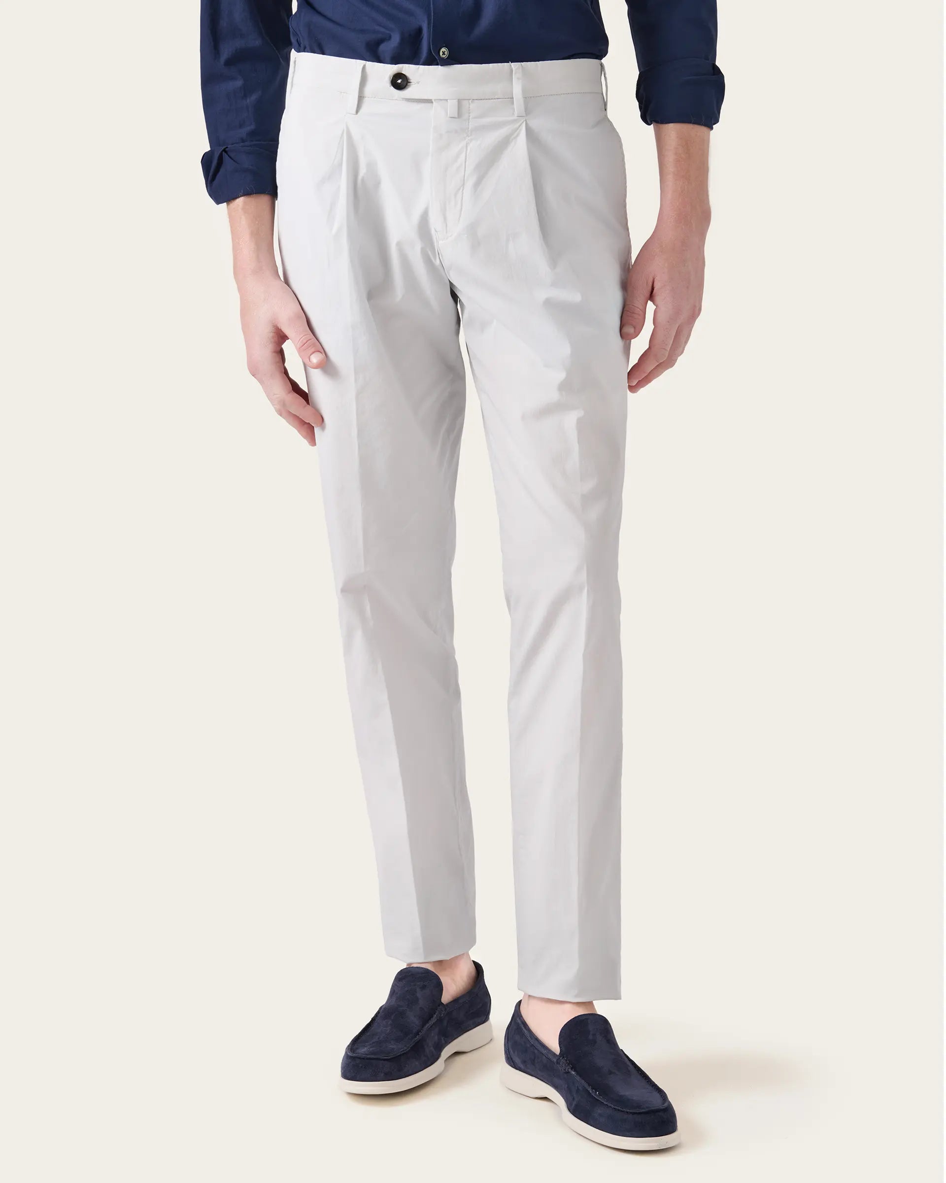 Pantalone ghiaccio con pence in cotone popeline stretch tinto in capo
