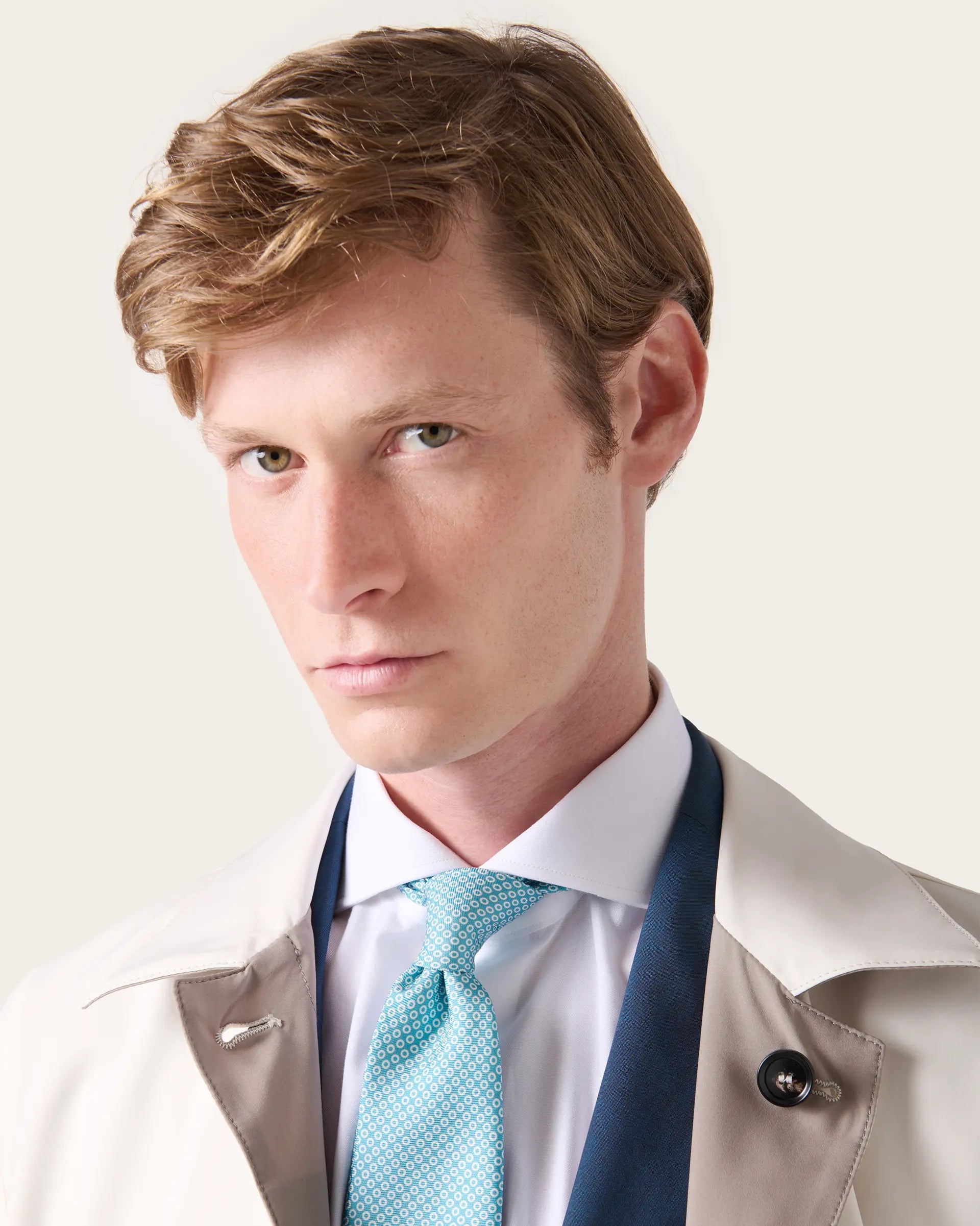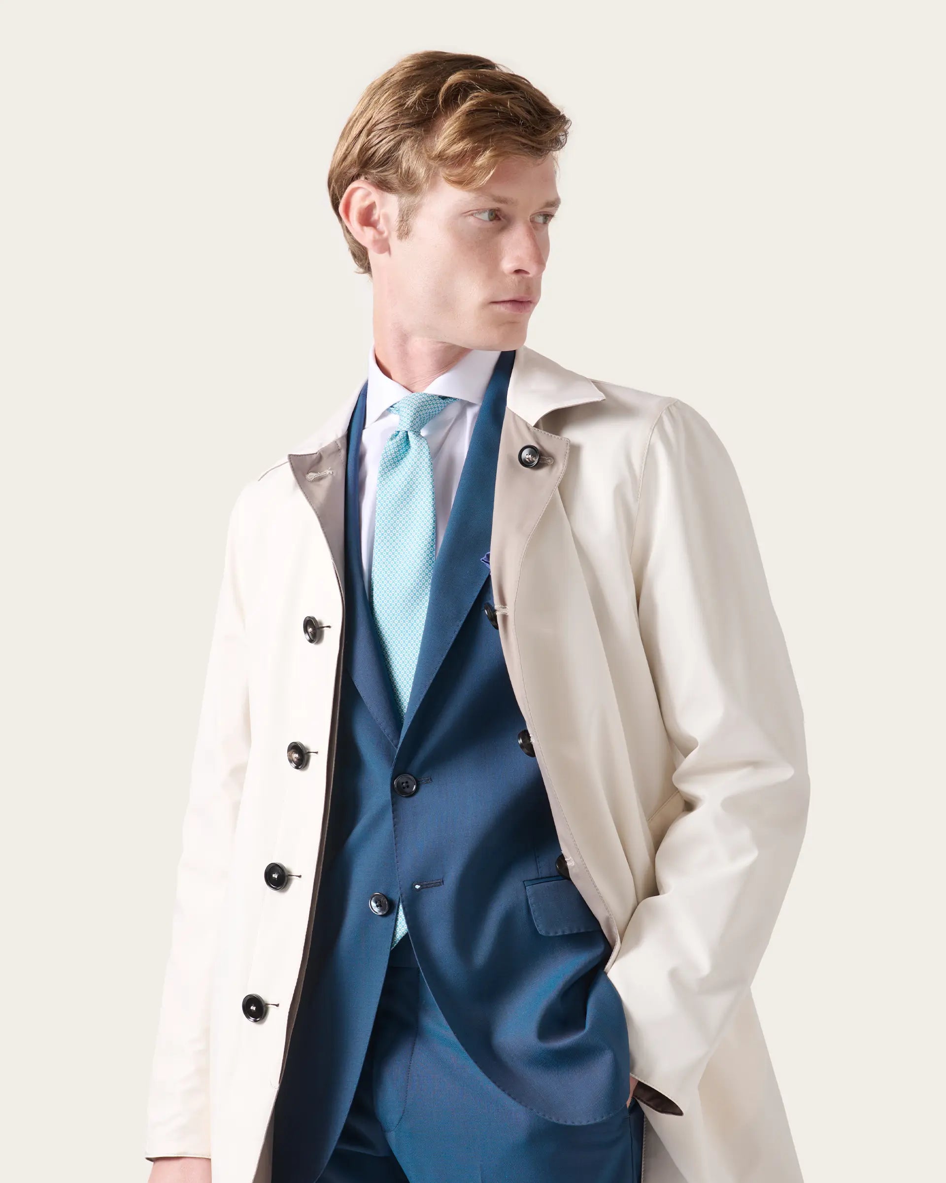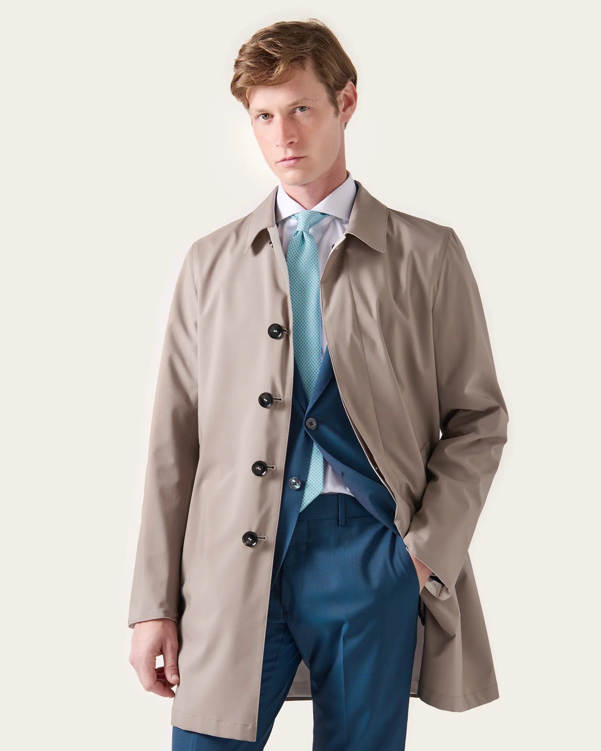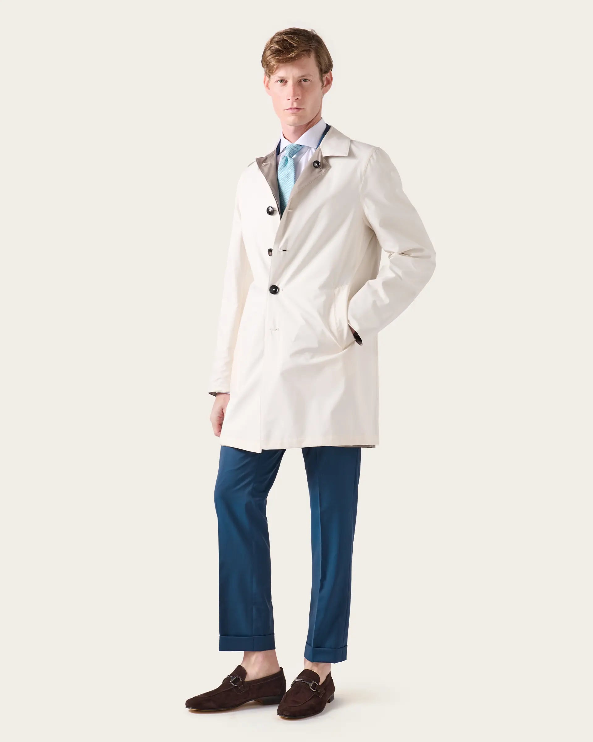 Impermeabile reversibile realizzato in tessuto tecnico Olmetex che combina in un design sofisticato la versatilità di un capo che offre due look diversi e una protezione completa dalla pioggia e dal vento. Il tessuto è caratterizzato da una texture che ne esalta il fitting sartoriale e da  materiali di alta qualità che garantiscono confort e resistenza nel tempo. Un outwear raffinato che si completa di dettagli curati e funzionali per chi cerca praticità, funzionalità ed eleganza in un unico capo.