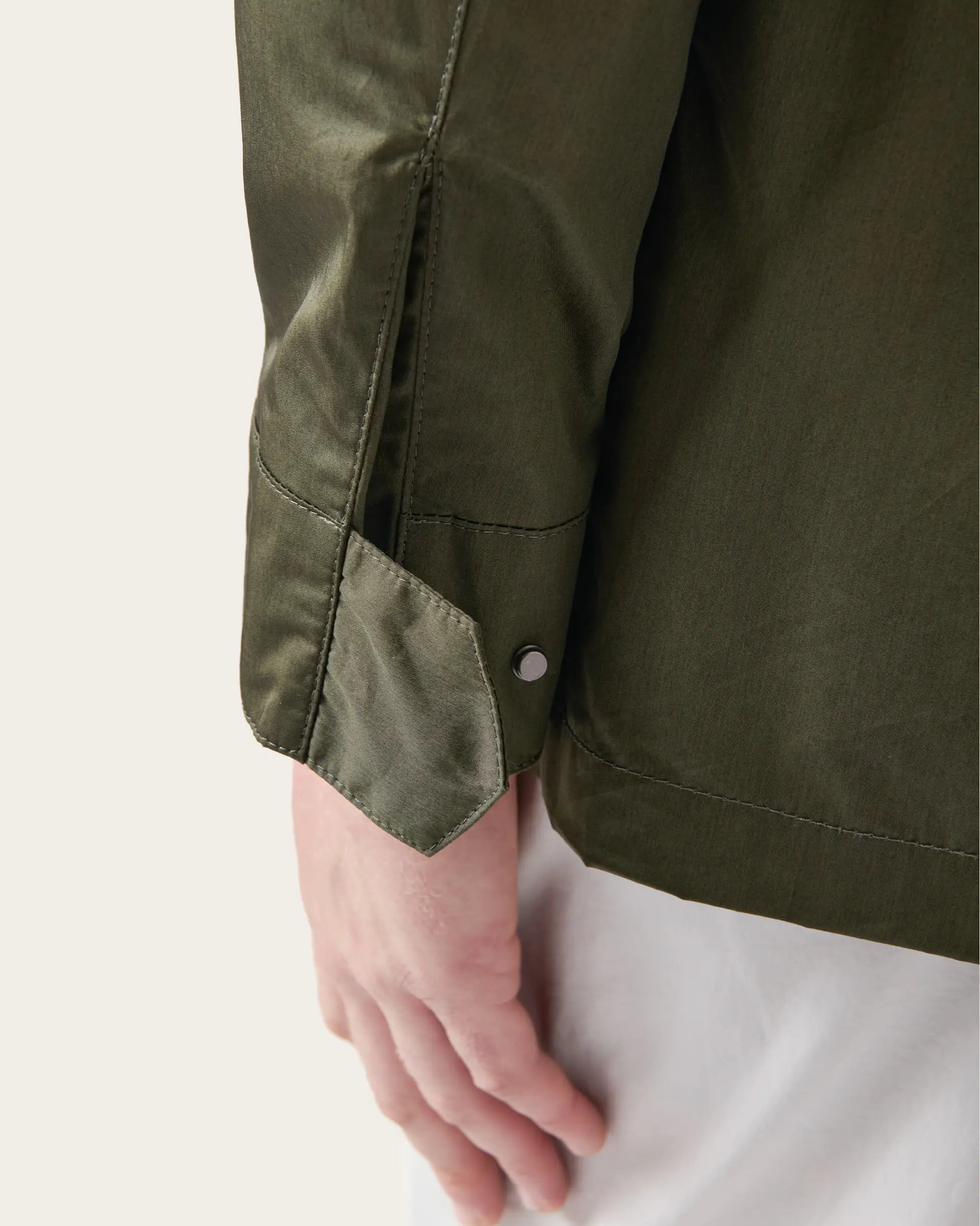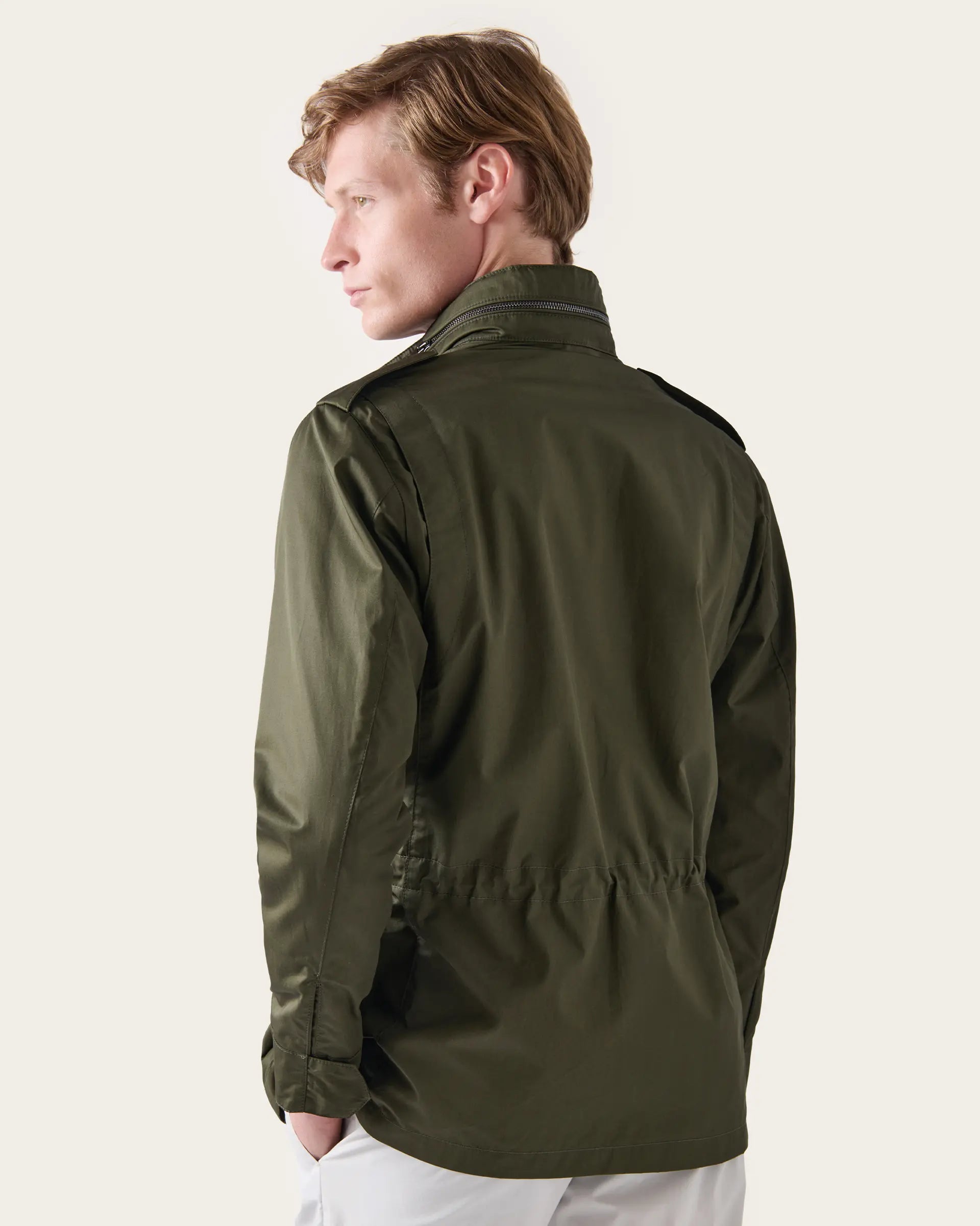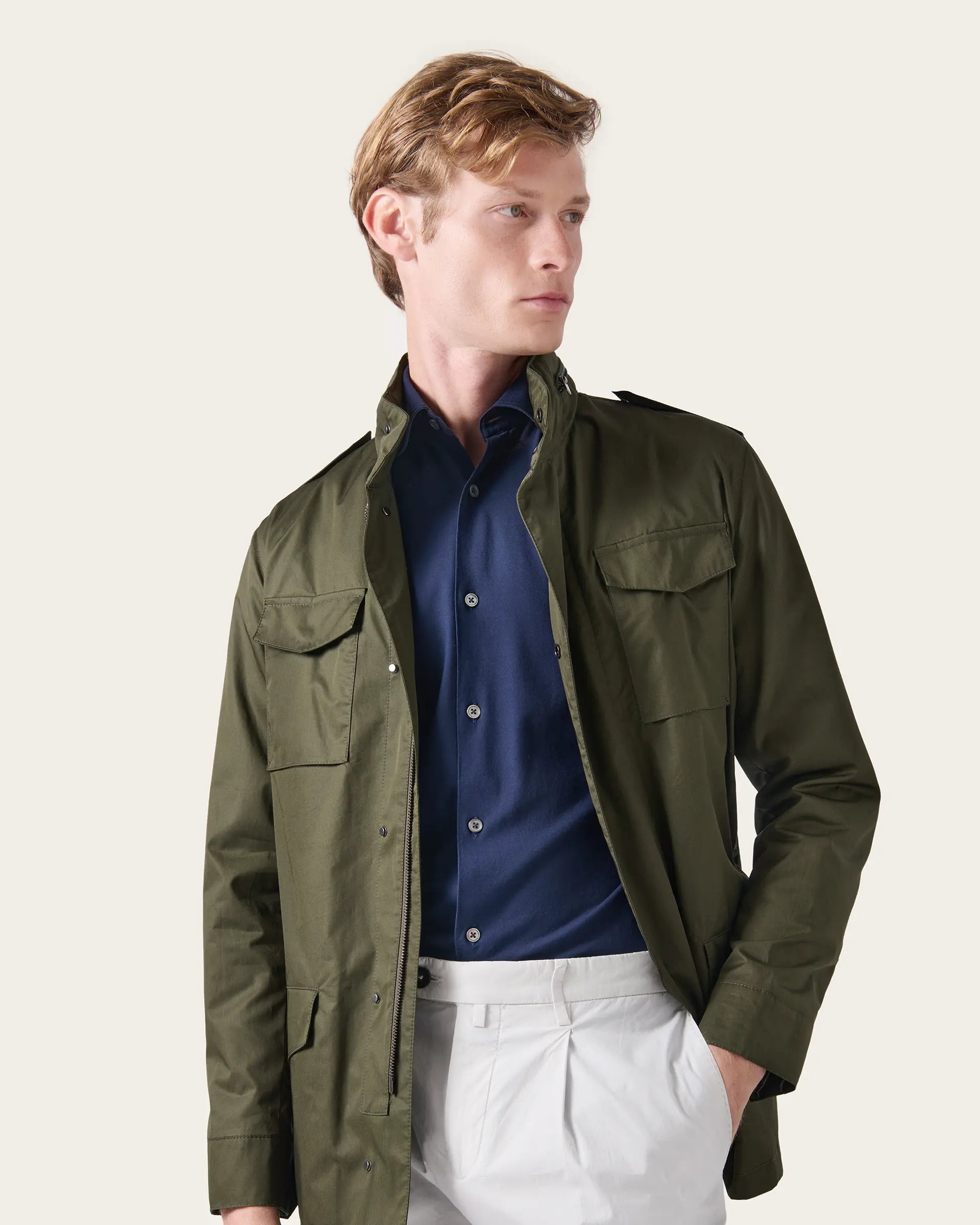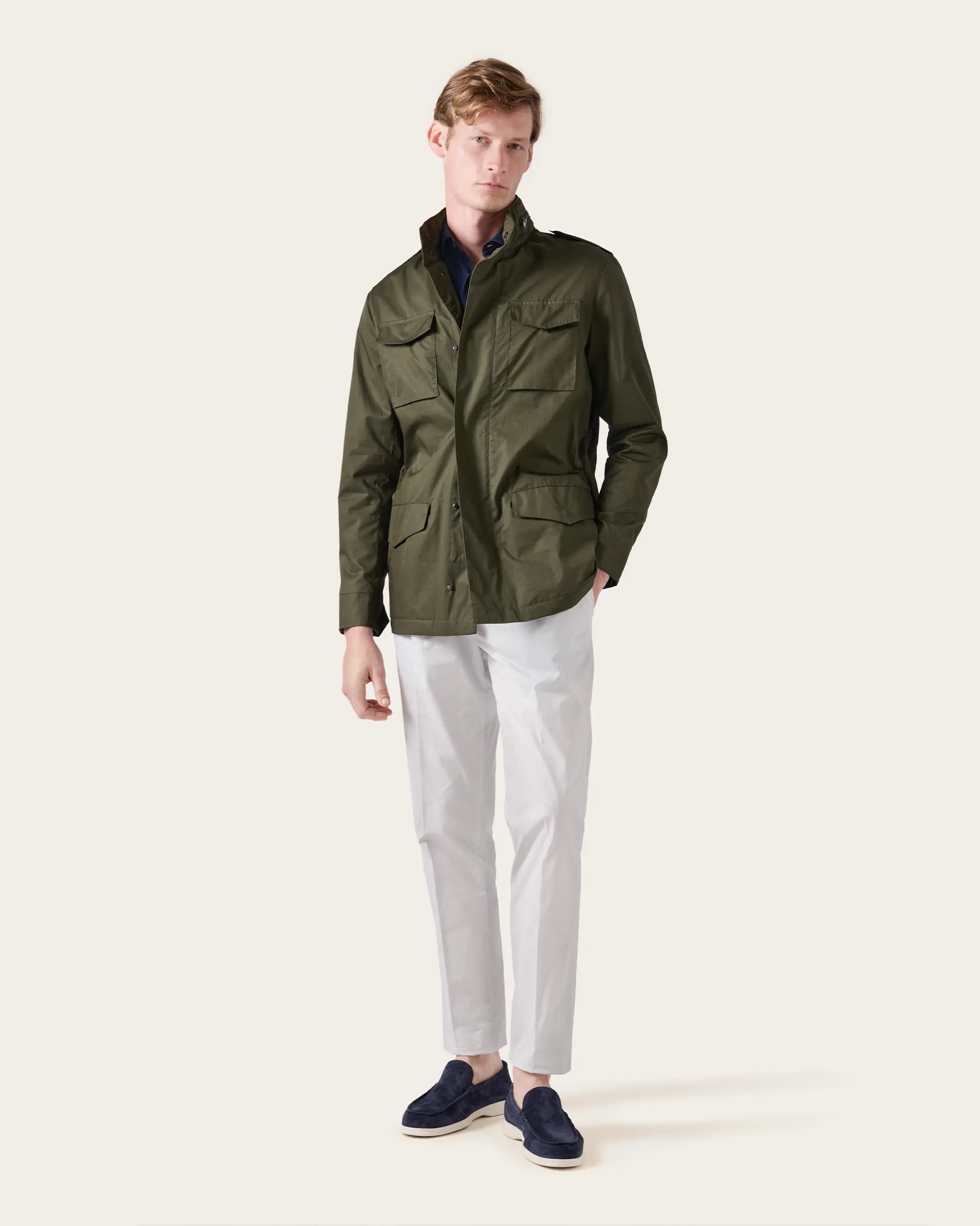Field jacket multi tasche realizzata in gabardina di cotone resa unica dal trattamento idrorepellente e antivento che caratterizzano i tessuti Olmetex. Un classico delle avventure outdoor che diventa un essenziale del guardaroba metropolitano perché combina una costruzione funzionale a materiali pregiati. Si completa di pratiche tasche, cappuccio antipioggia a scomparsa e di una coulisse interna al punto vita per regolare la vestibilità.