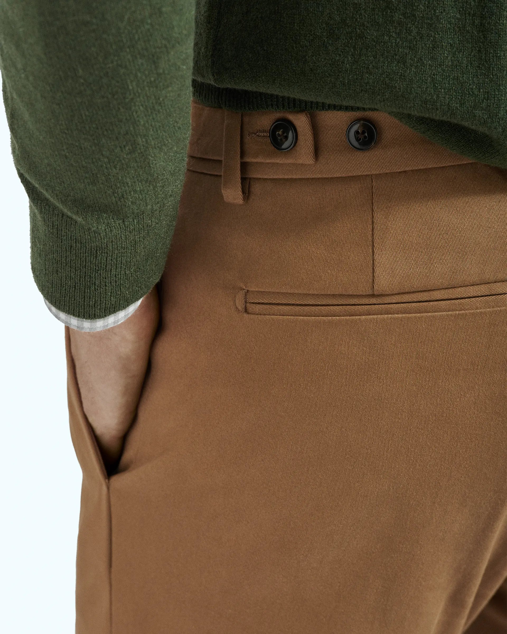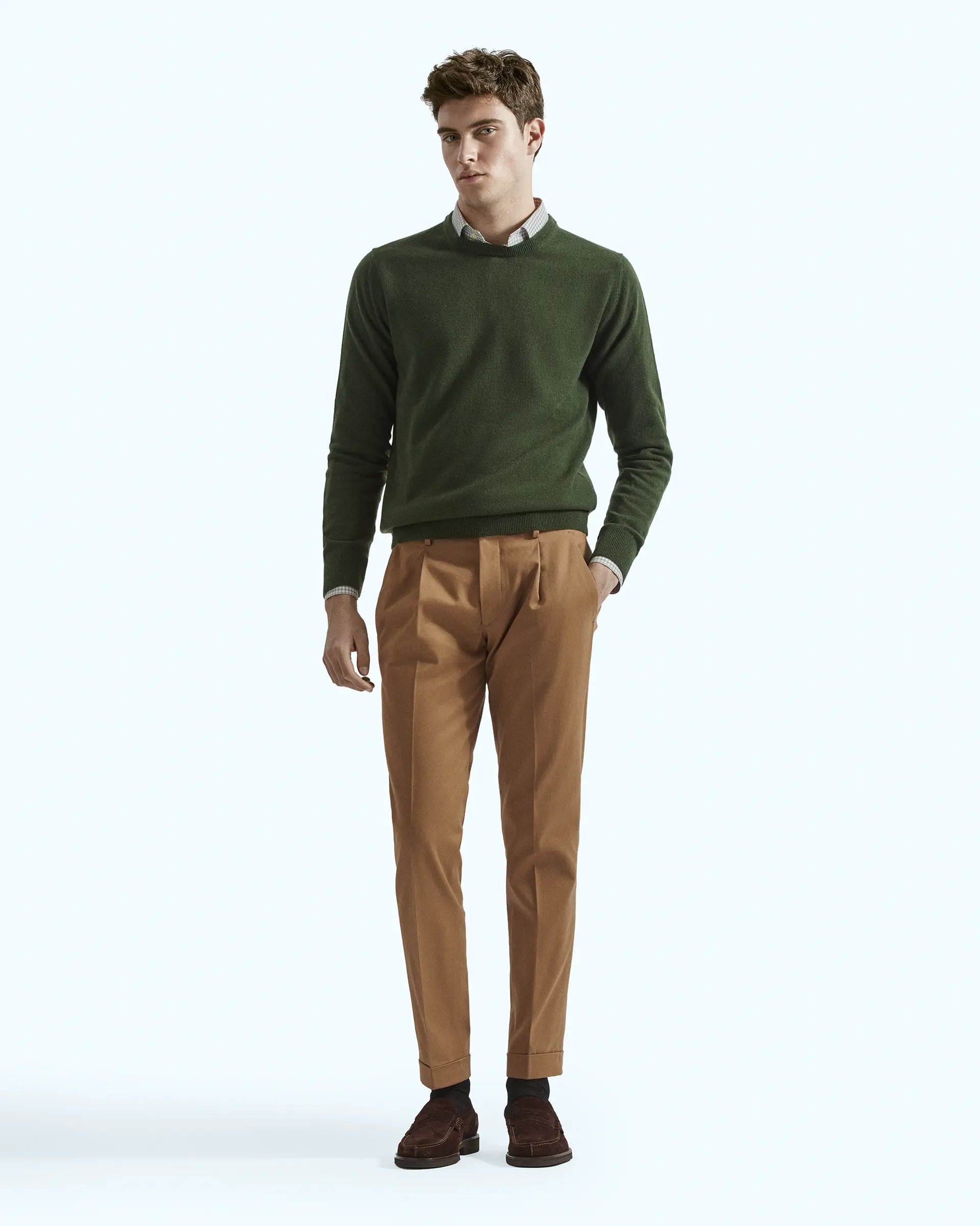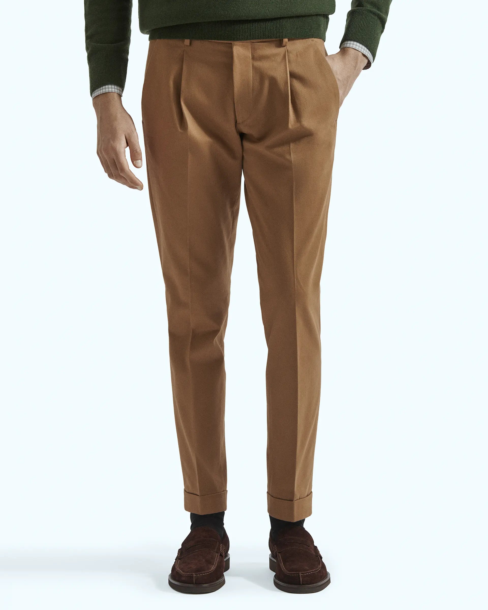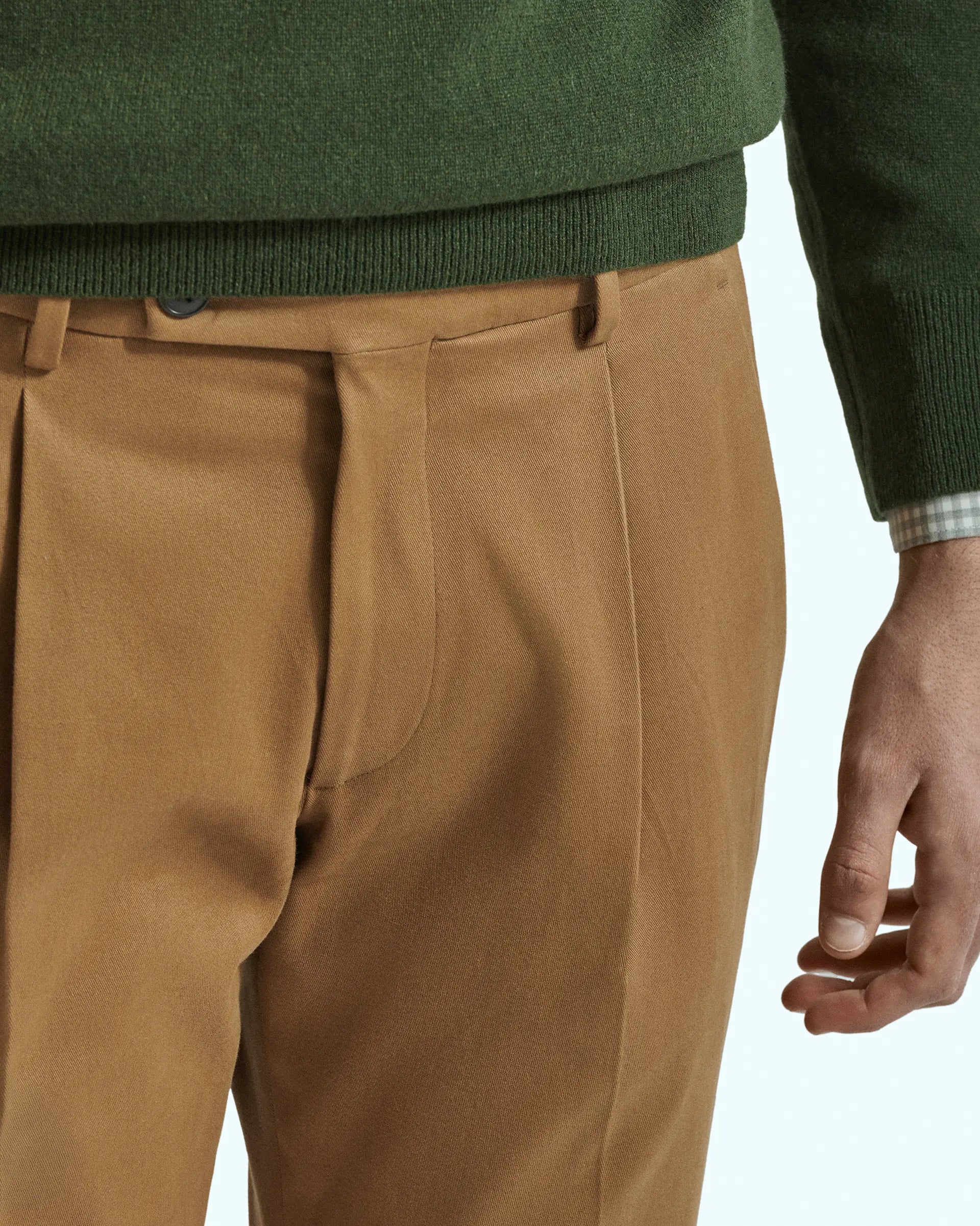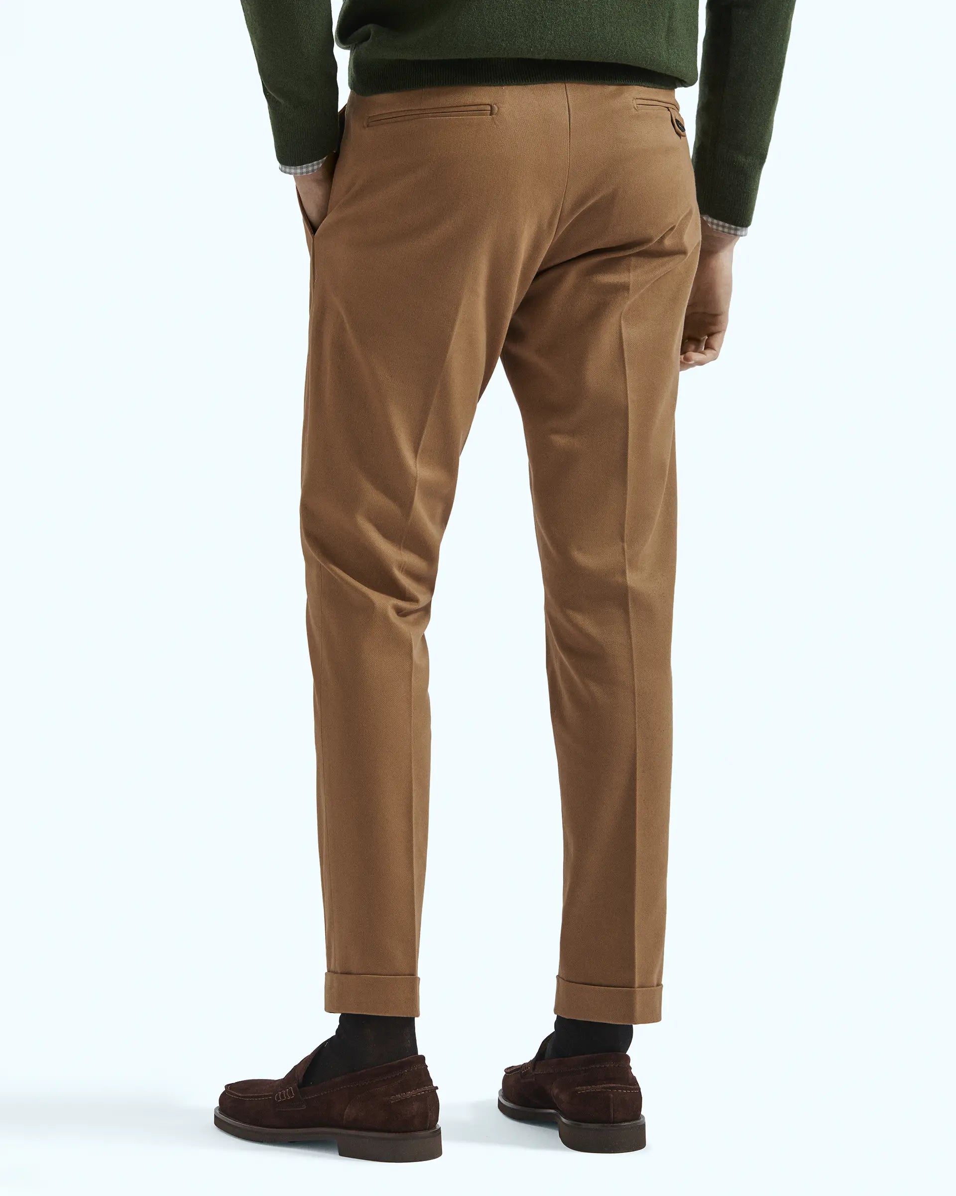 The casual origin fabric of stretch cotton gabardine marries with a sartorial-inspired model and gives life to a comfortable and versatile pair of trousers characterized by soft proportions on the hips and a line close to the body. The leisure fit is enriched by the deep pleat and the button placket on the belt for a modern and refined style. An exclusive pair of trousers to combine in different seasonal looks.