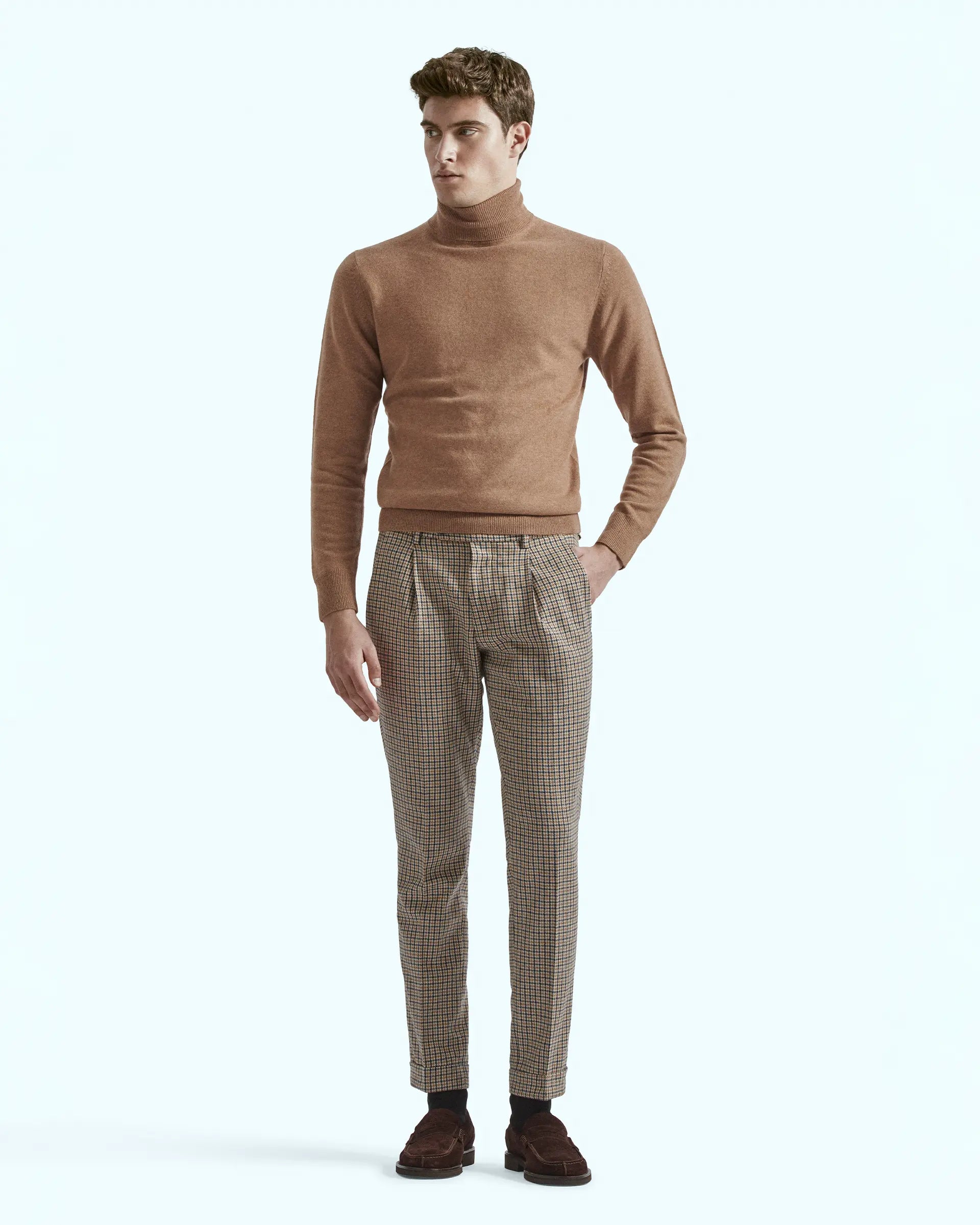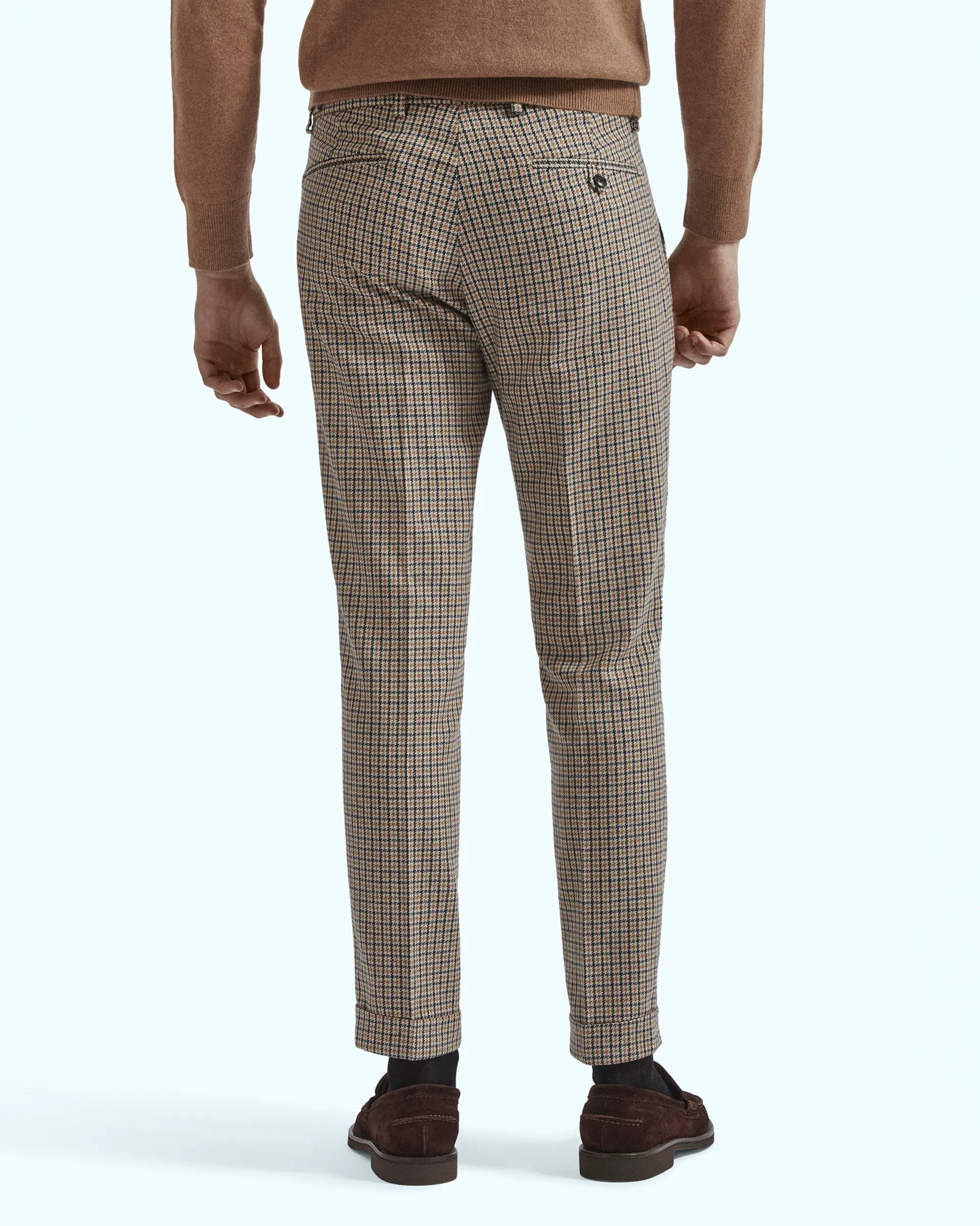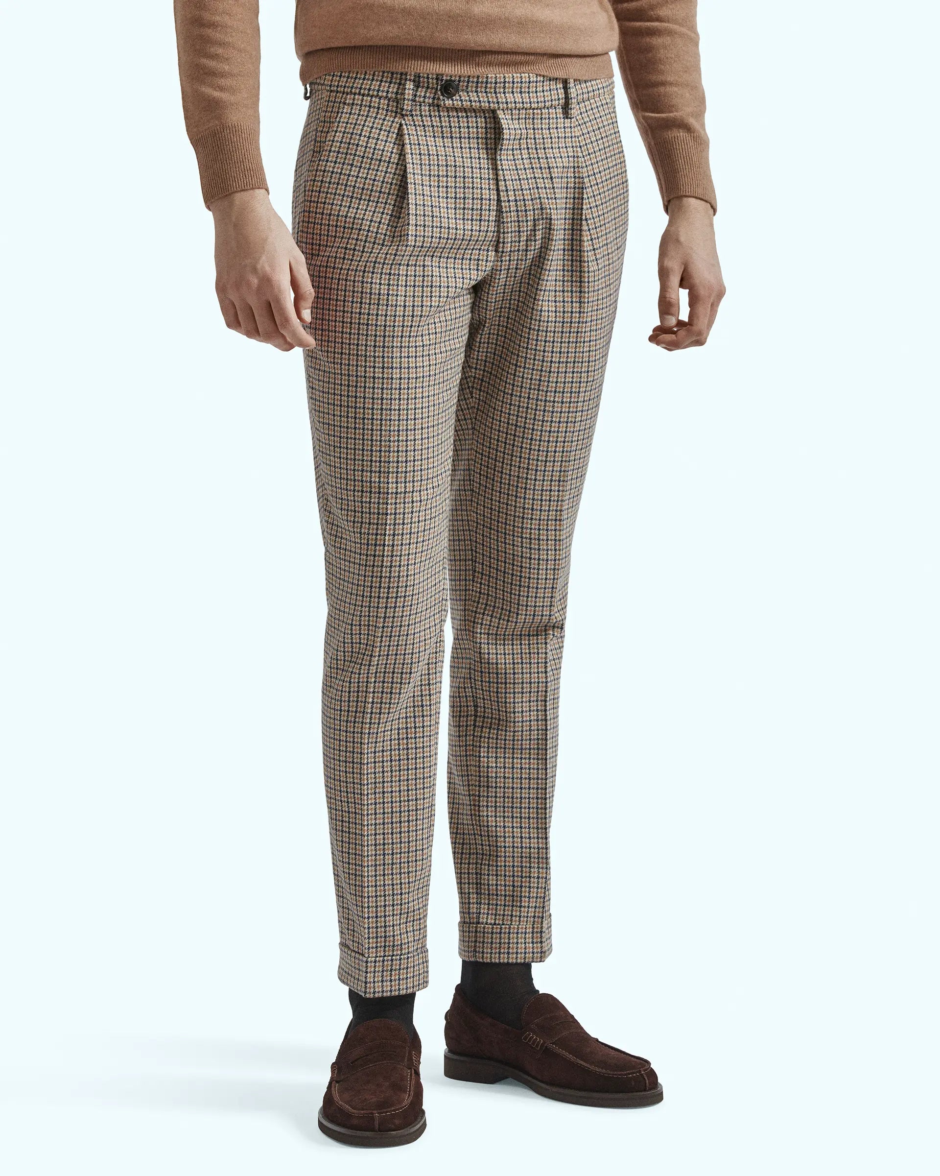 A balance of classic and sporty elements defines the classic and contemporary style of these trousers made from a fine blend of cotton and stretch wool in the classic houndstooth pattern. The construction with deep pleats and button placket on the belt add maximum comfort and freedom of movement to a bold, comfortable garment that does not go unnoticed. An exclusive pair of trousers to combine in different seasonal looks.