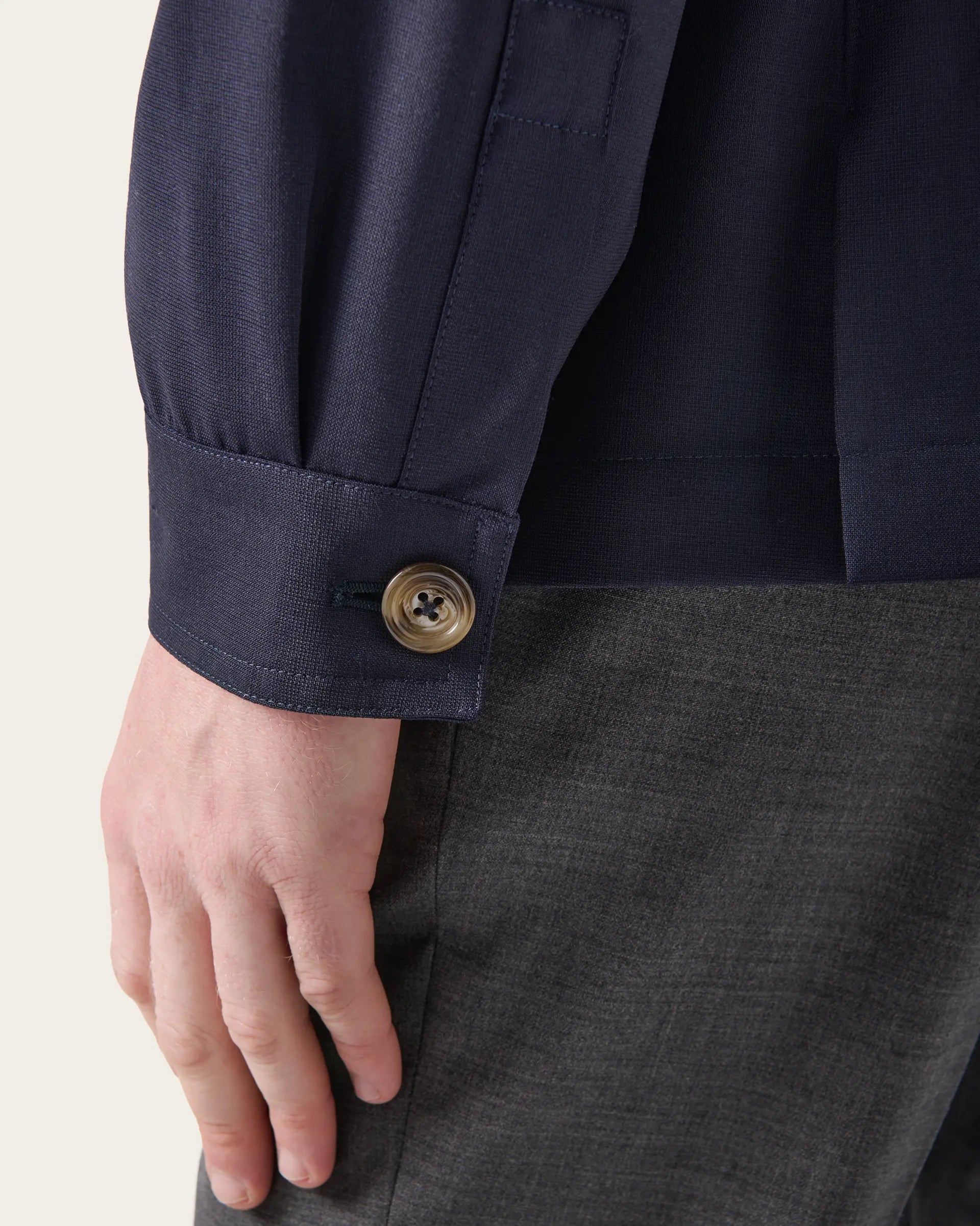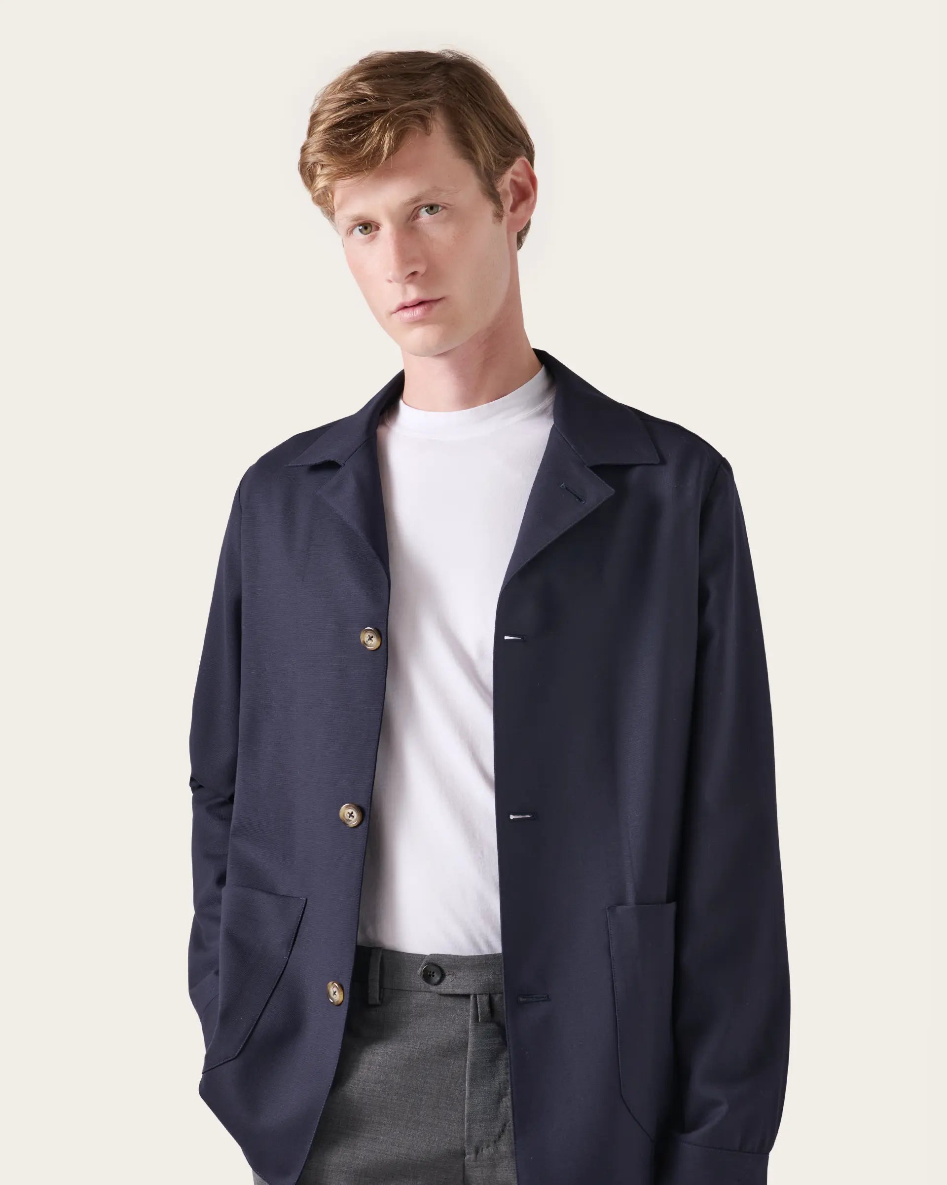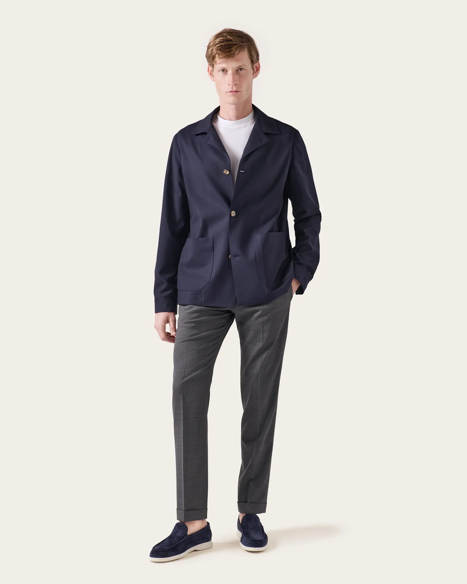 The shirt jacket is the proposal that responds to the needs of the modern man; a functional urban garment, easy to wear and that lends itself to different combinations and in which the sartorial mold of our jackets echoes. Made of stretch wool Jerzey confortable fit it is perfect to be used both as a light blouson and as layering for the beginning of the season.