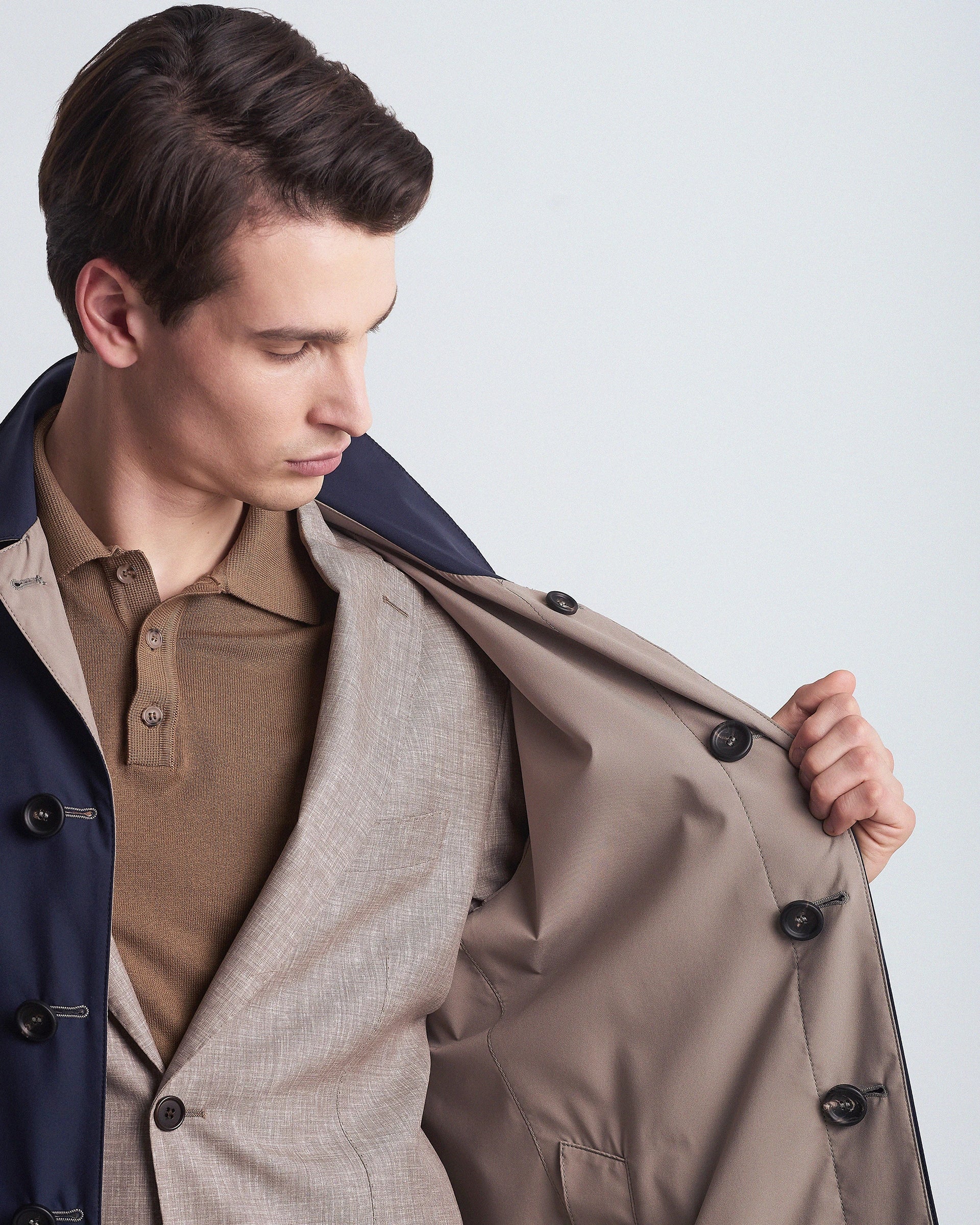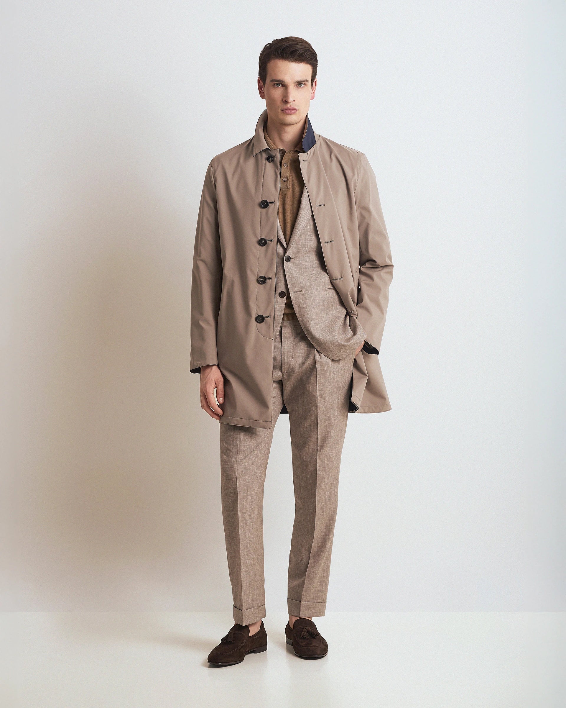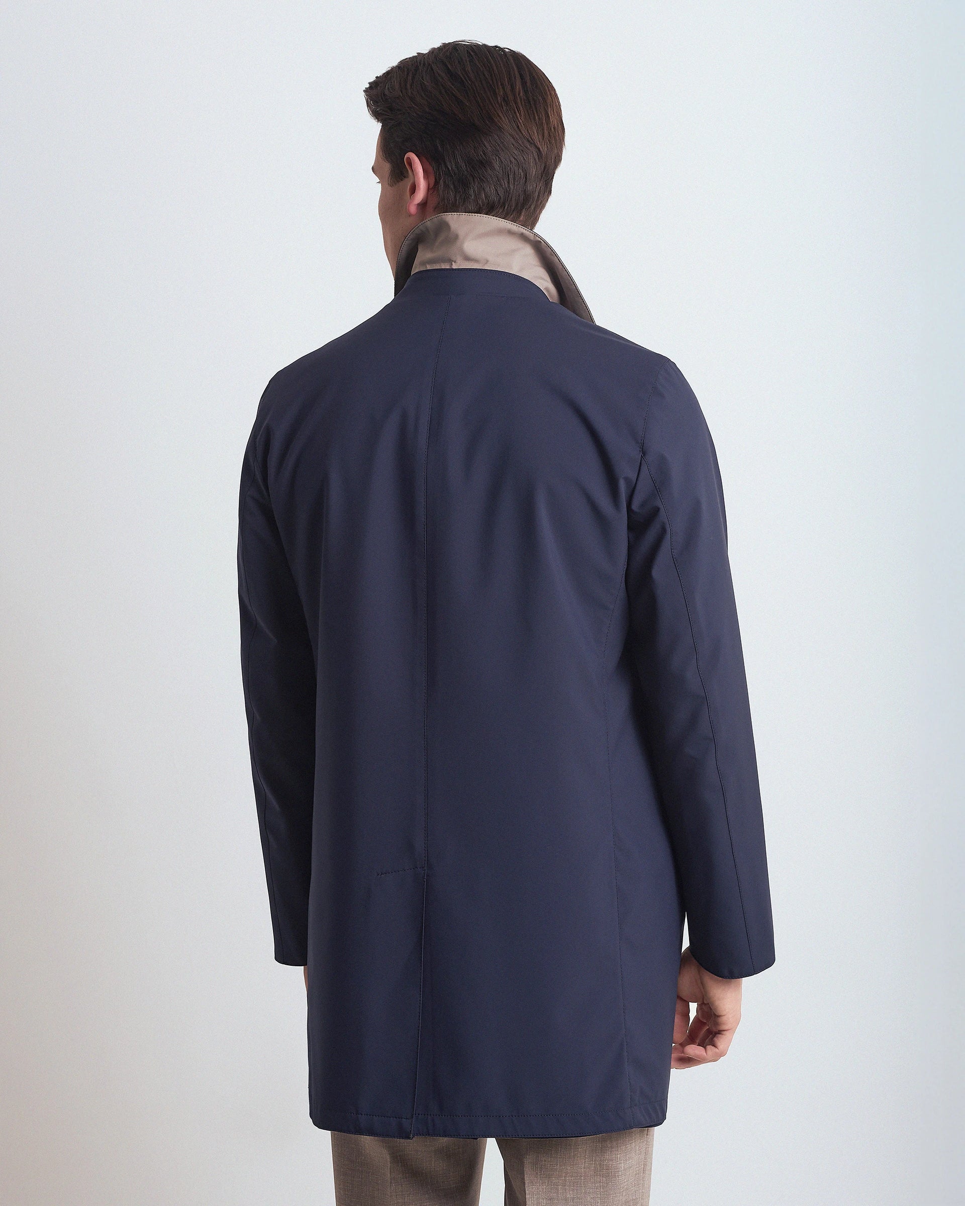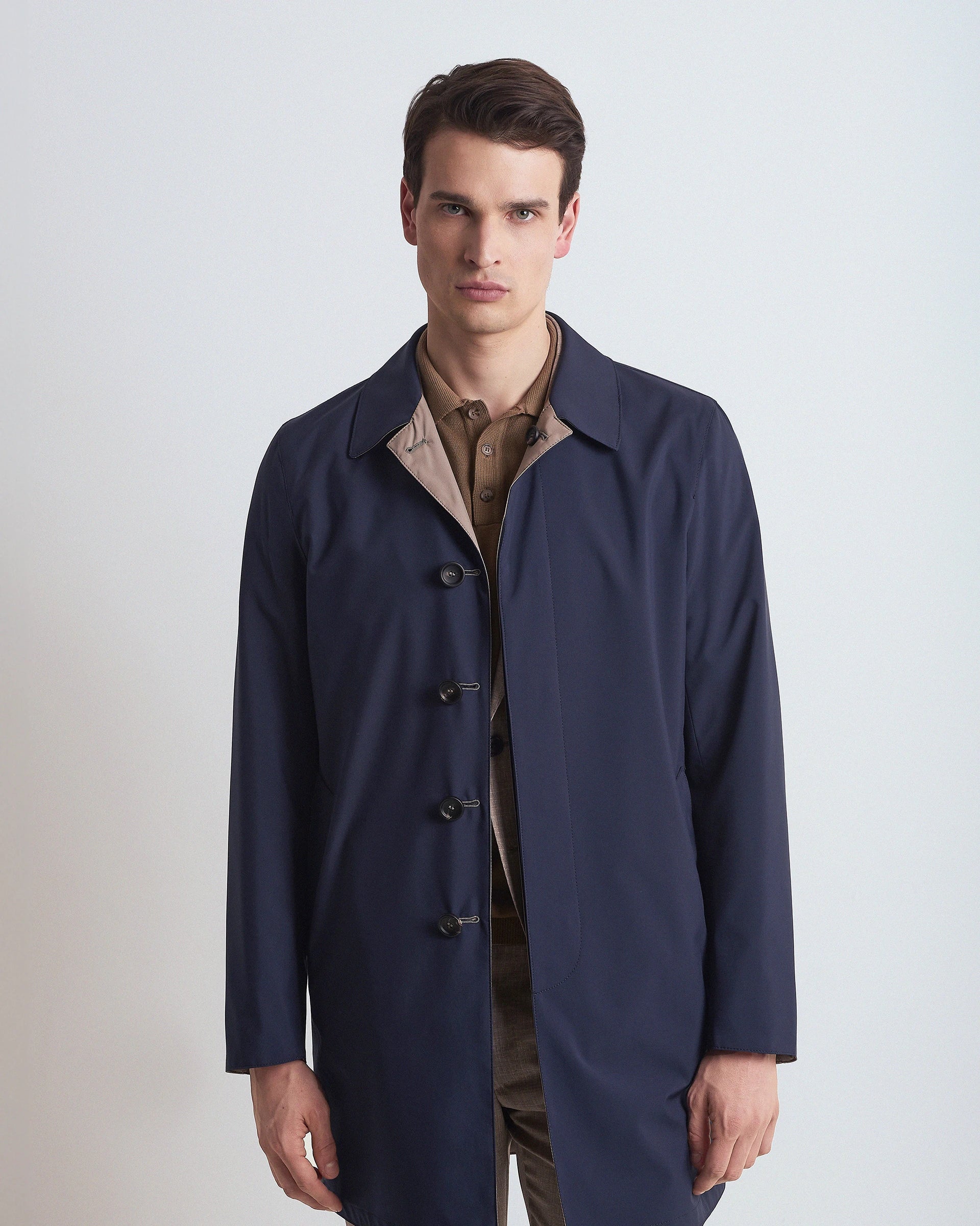 Reversible raincoat made of Olmetex technical fabric that combines in a sophisticated design the versatility of a garment that offers two different looks and complete protection from rain and wind. The fabric is characterized by a texture that enhances the tailored fit and high-quality materials that guarantee comfort and resistance over time. A refined outwear that is completed with refined and functional details for those looking for practicality, functionality and elegance in a single garment.