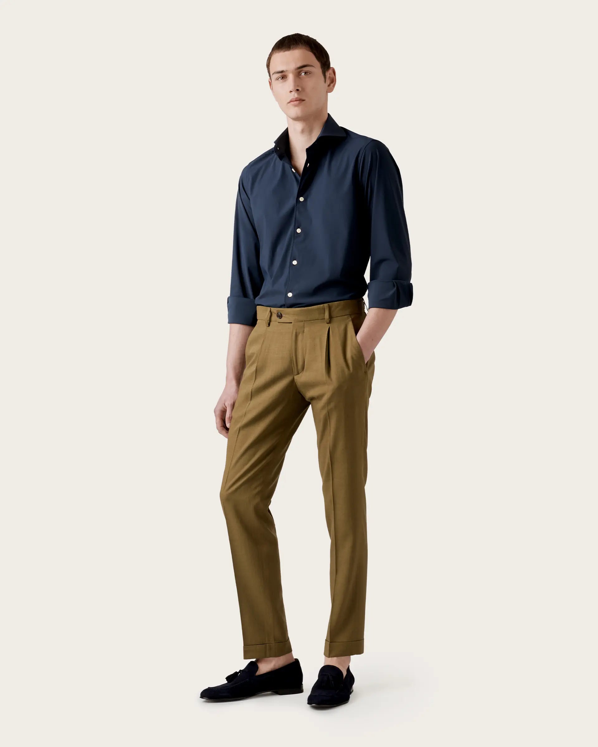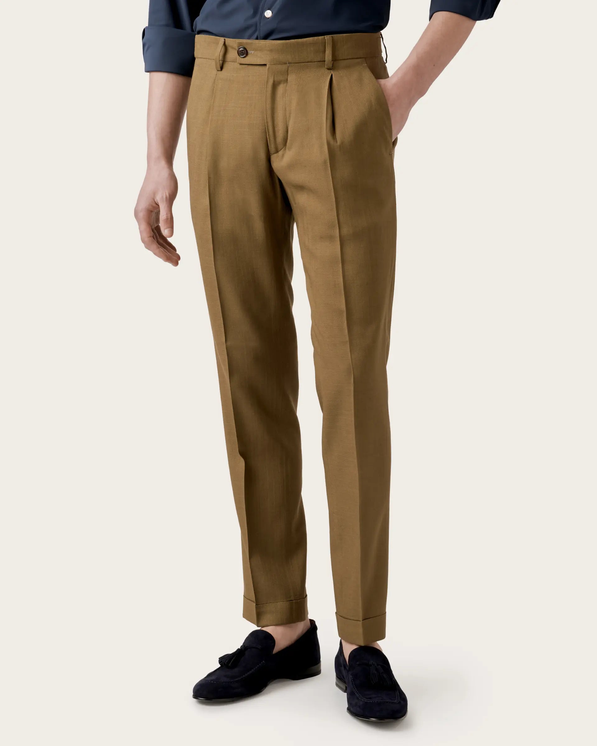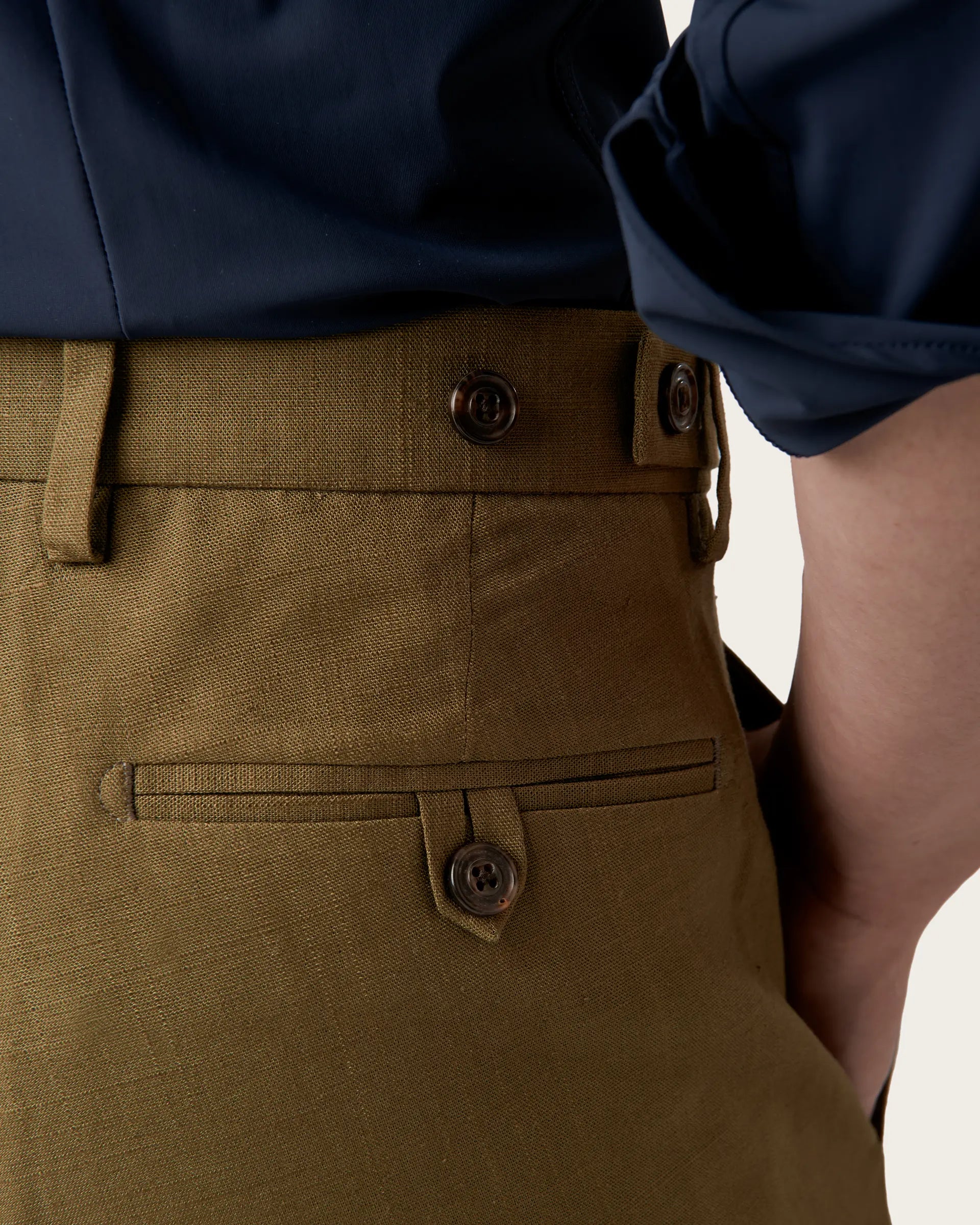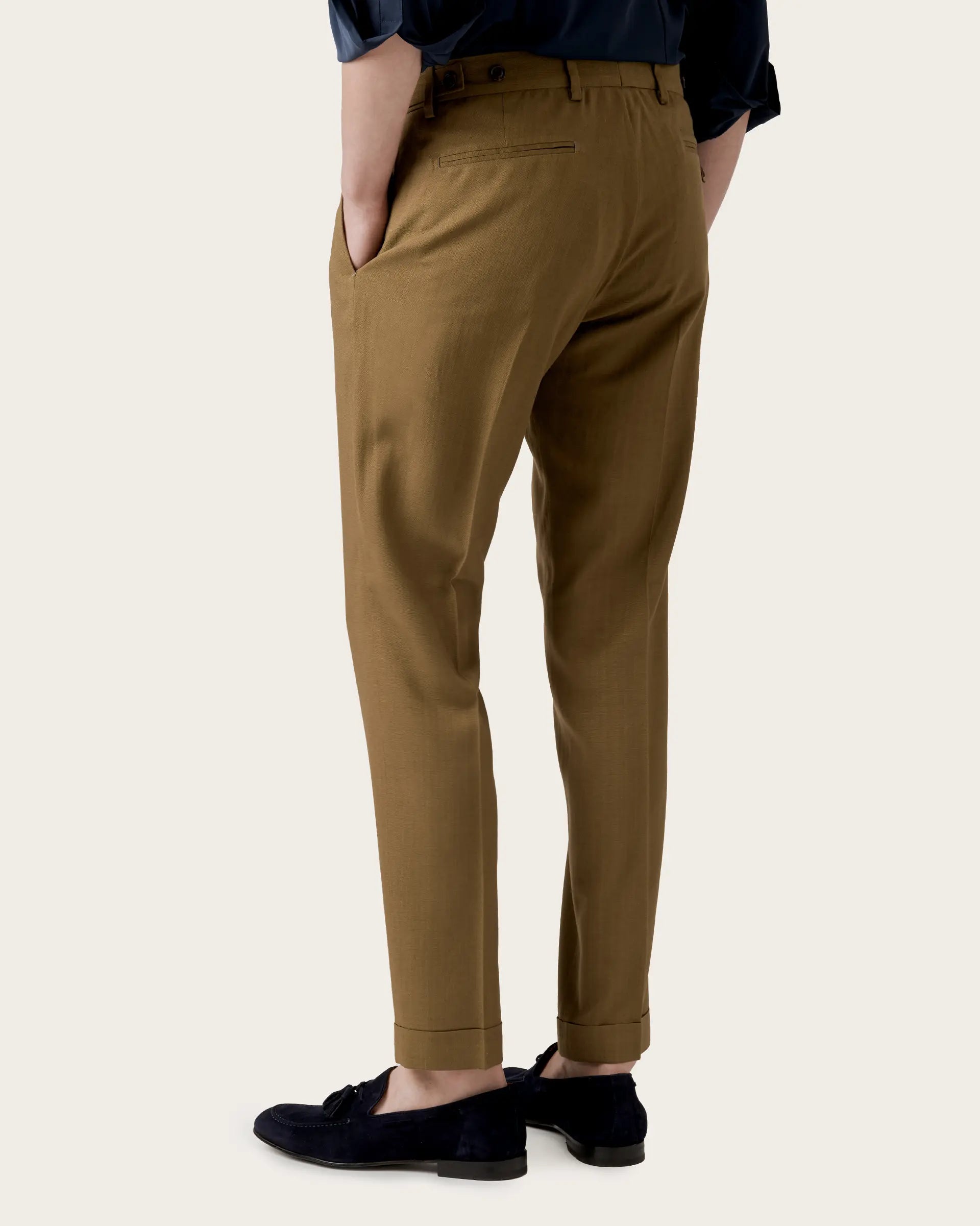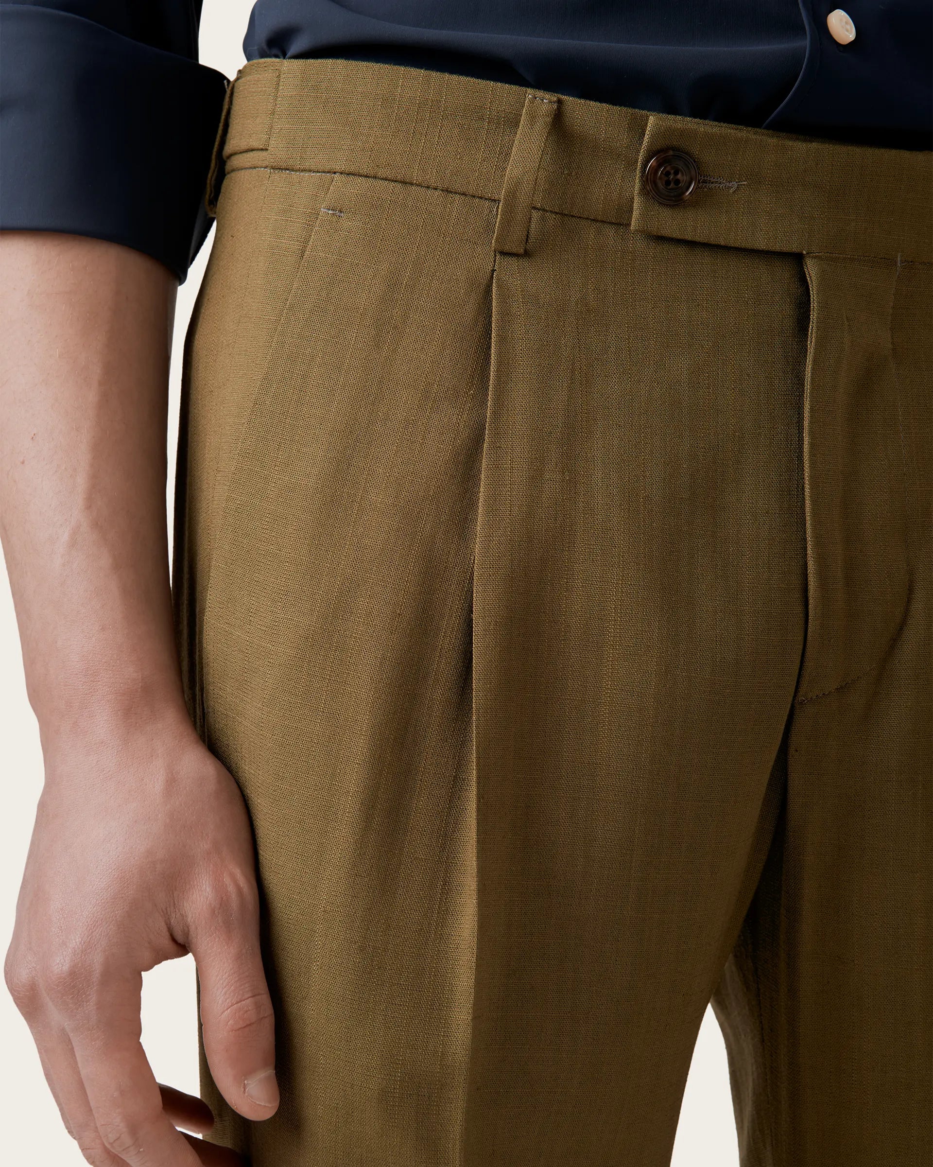 From a balanced blend of linen and viscose with the combination of elastane that guarantees superior comfort, these tailored-inspired trousers with a characteristic uneven texture are born. Modern style and refined lines with soft volumes on the hips and a leg line close to the body. The leisure fit is enriched by the deep pleat and the button placket on the belt for a modern and refined style. An exclusive pair of trousers to combine in different seasonal looks.