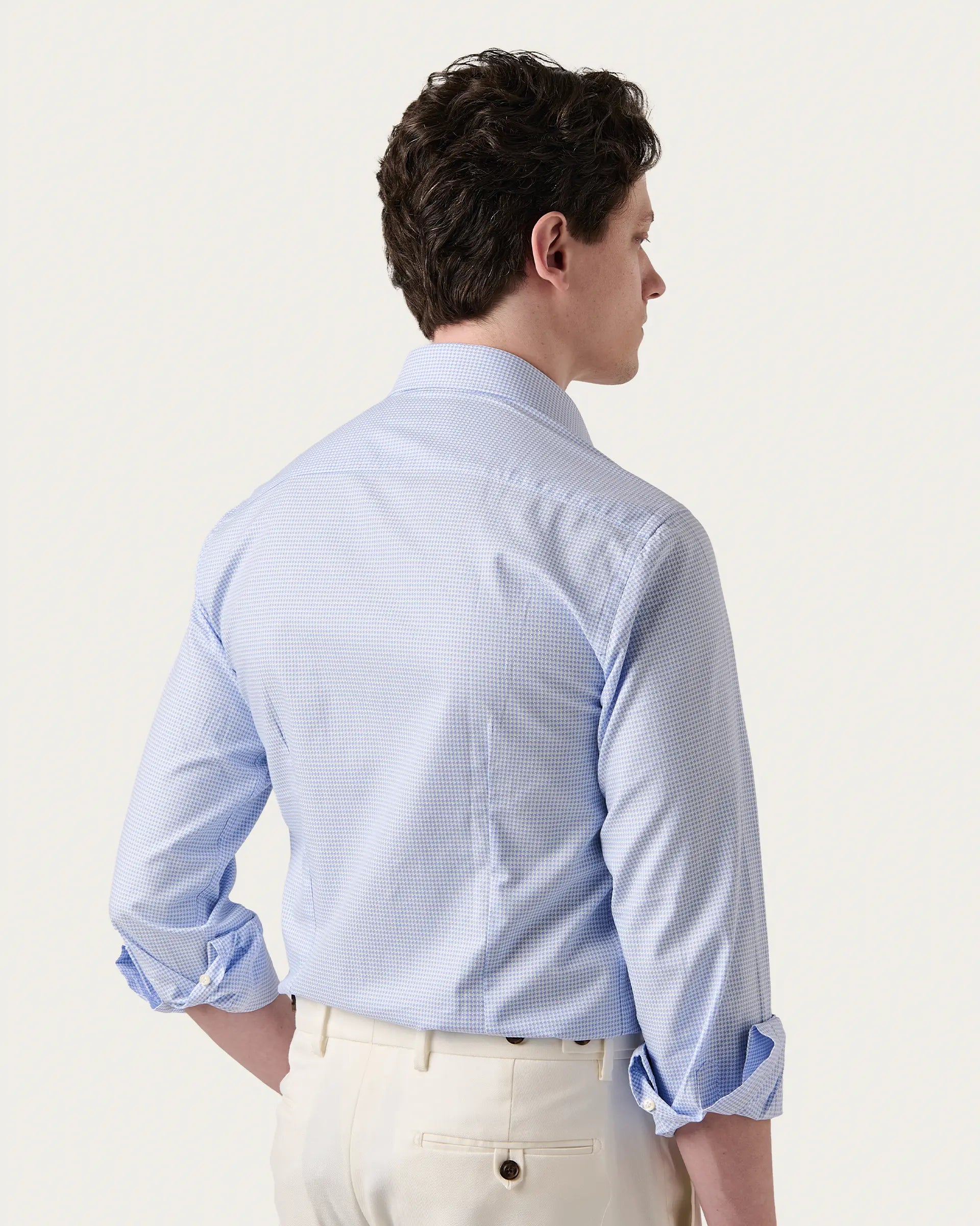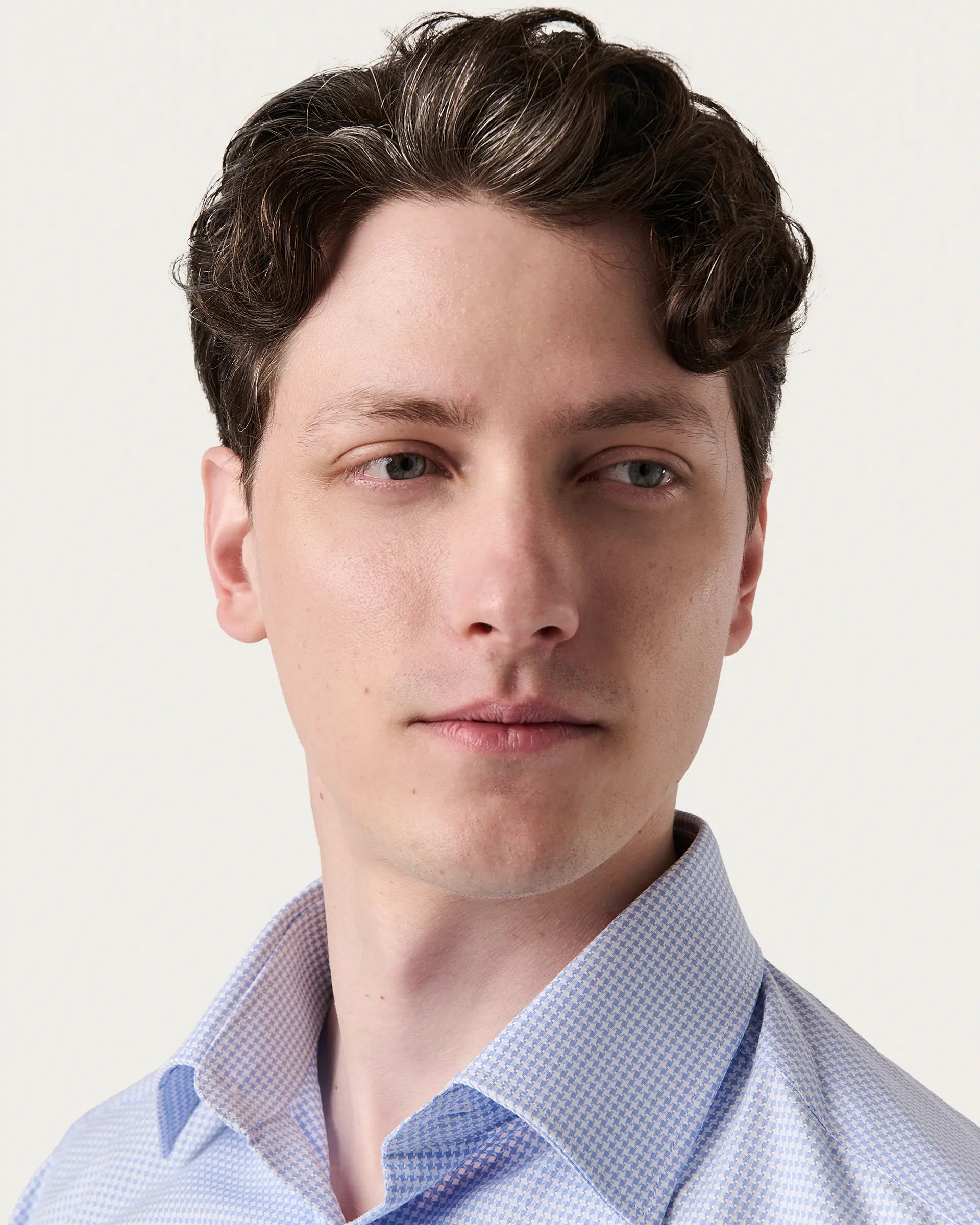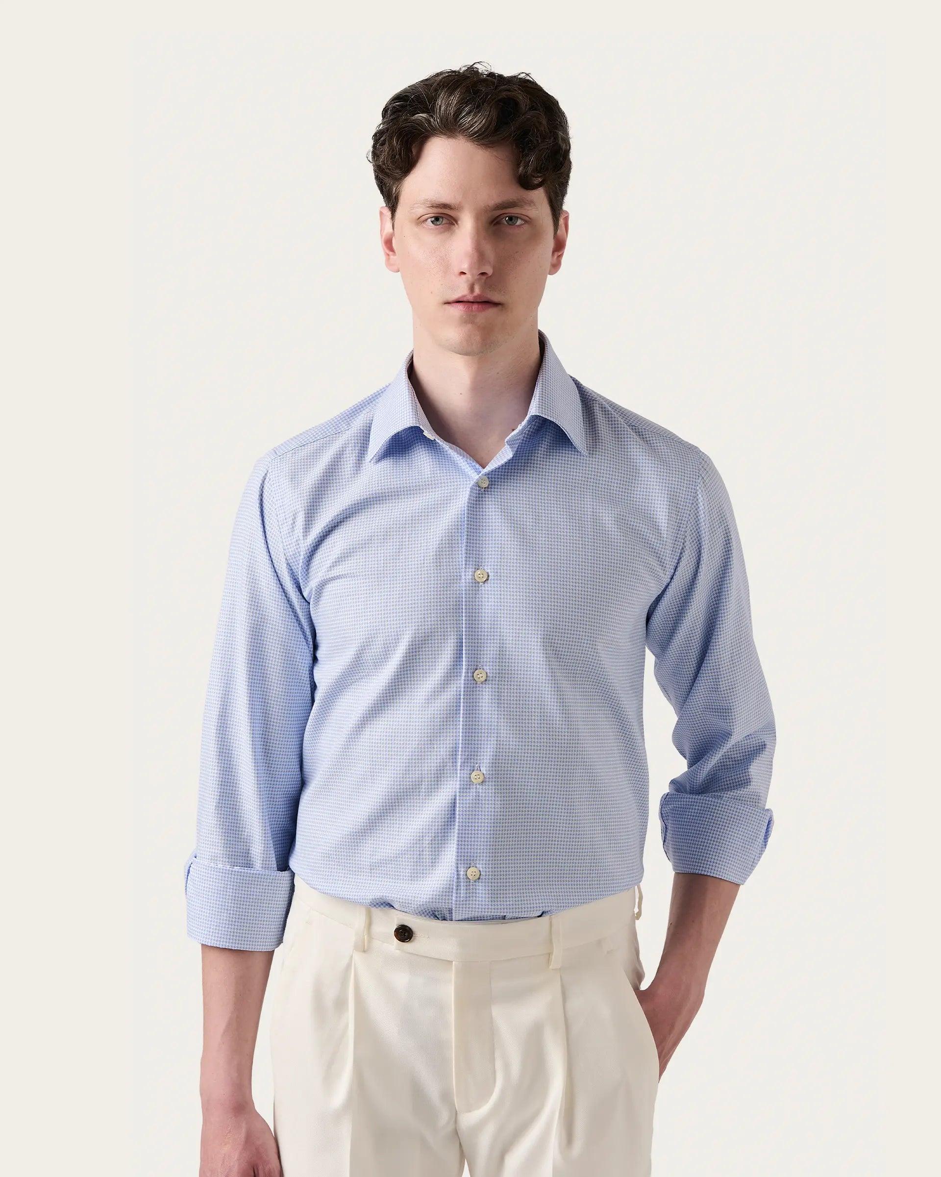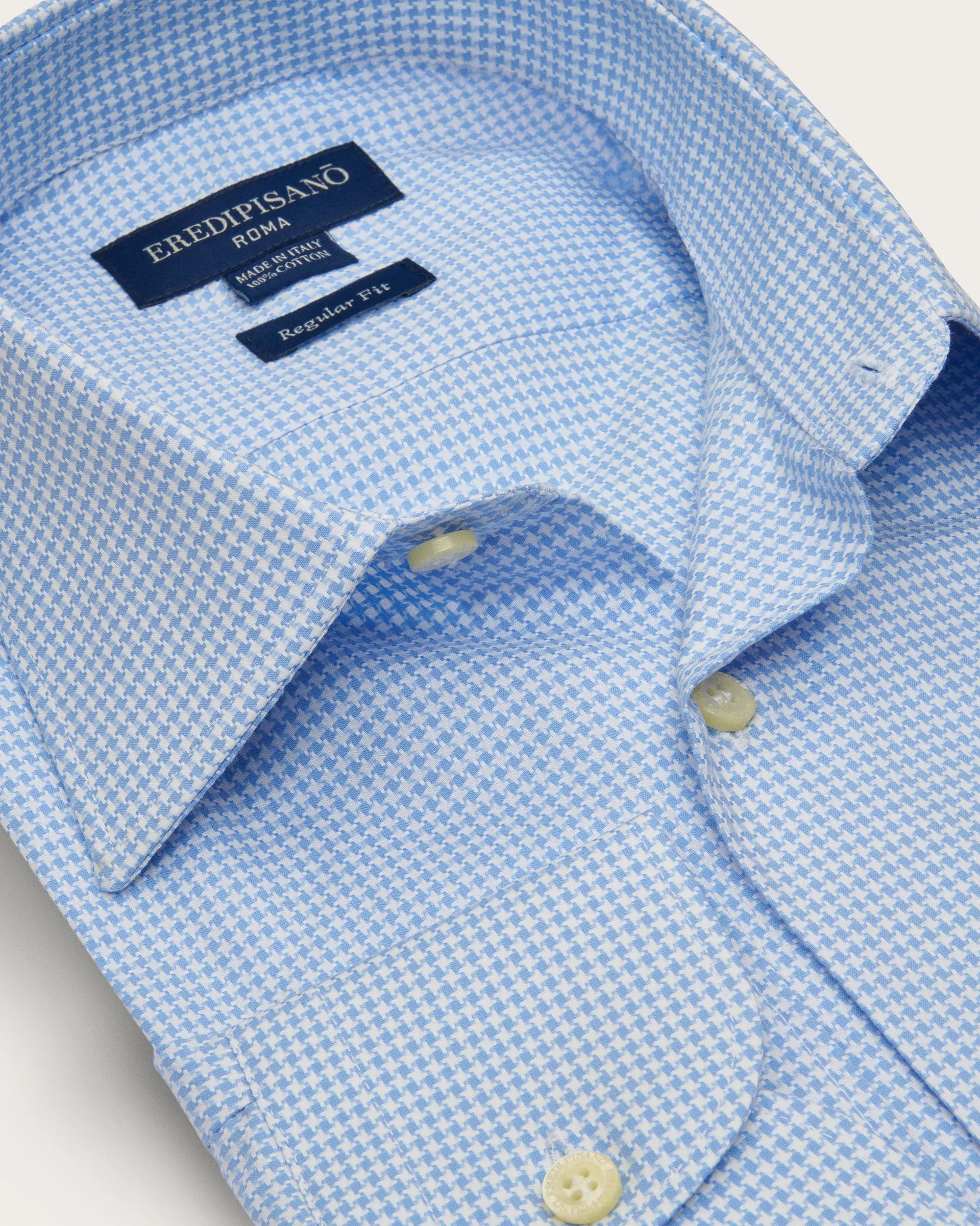 Tailored shirt made of pure double twisted cotton with a renewed Italian collar, a great classic presented in an updated version suitable for more formal occasions but also for everyday life. It is proposed in the comfortable regular fit in a refined houndstooth pattern perfect for those looking for a touch of originality and elegance at the same time.