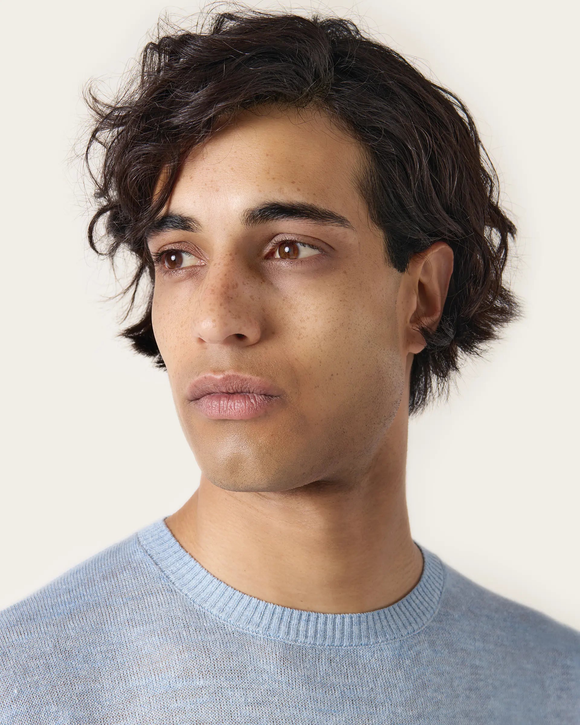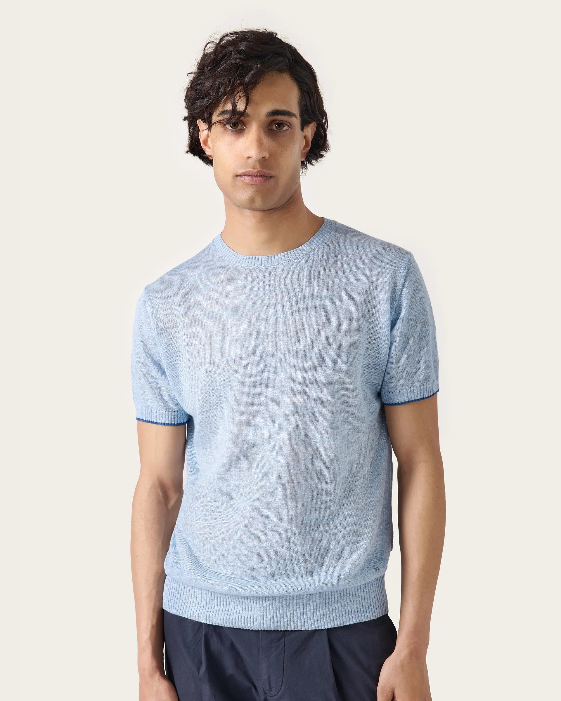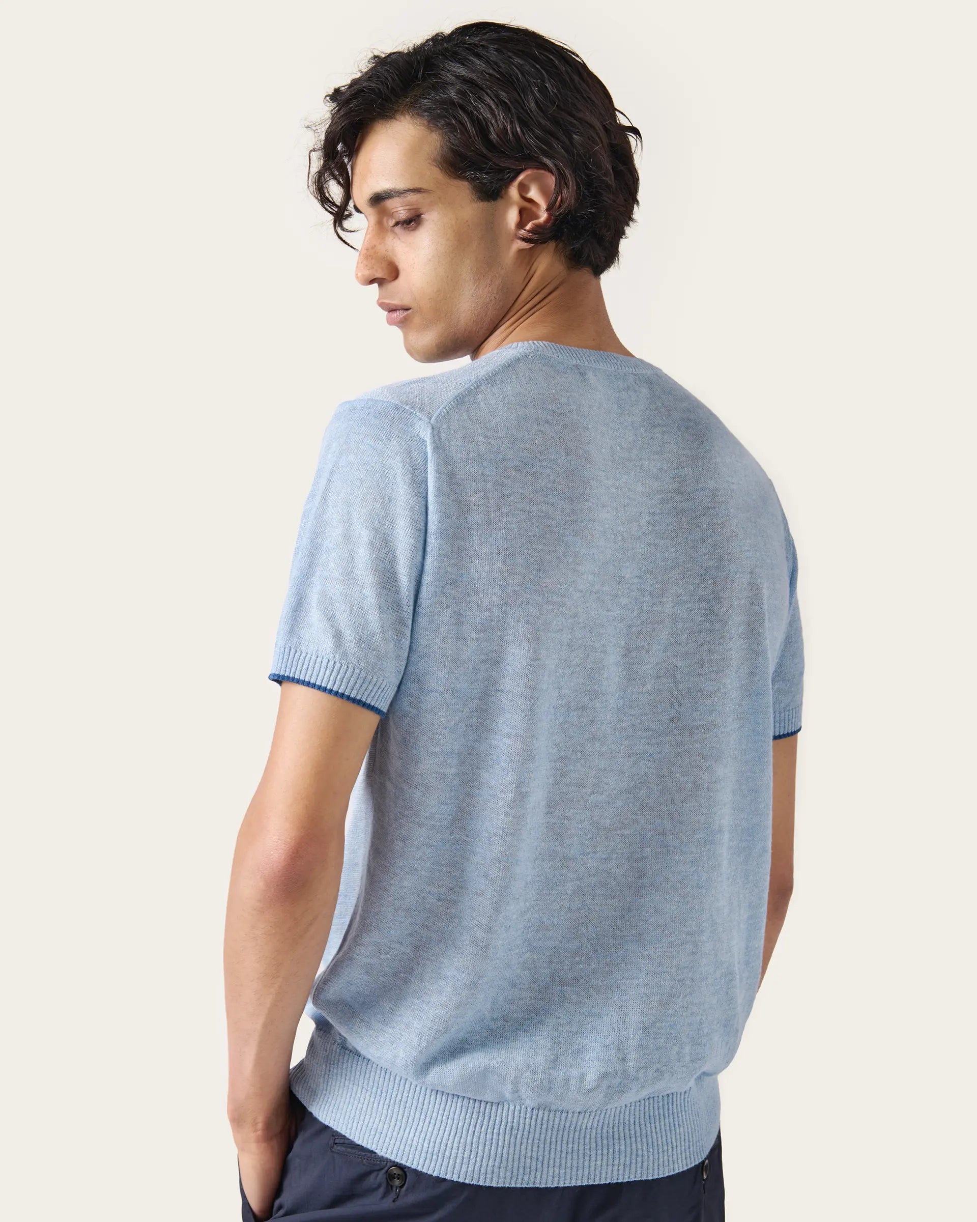 Short-sleeved sweater made with a fine blend of linen and extra-fine 14-gauge shaved cotton to guarantee a sensation of freshness perfect for summer days. The melange effect gives three-dimensionality to the garment while maintaining a classic elegance revisited in a contemporary key. To be worn under a jacket as an alternative to a shirt or alone with a pair of casual trousers.