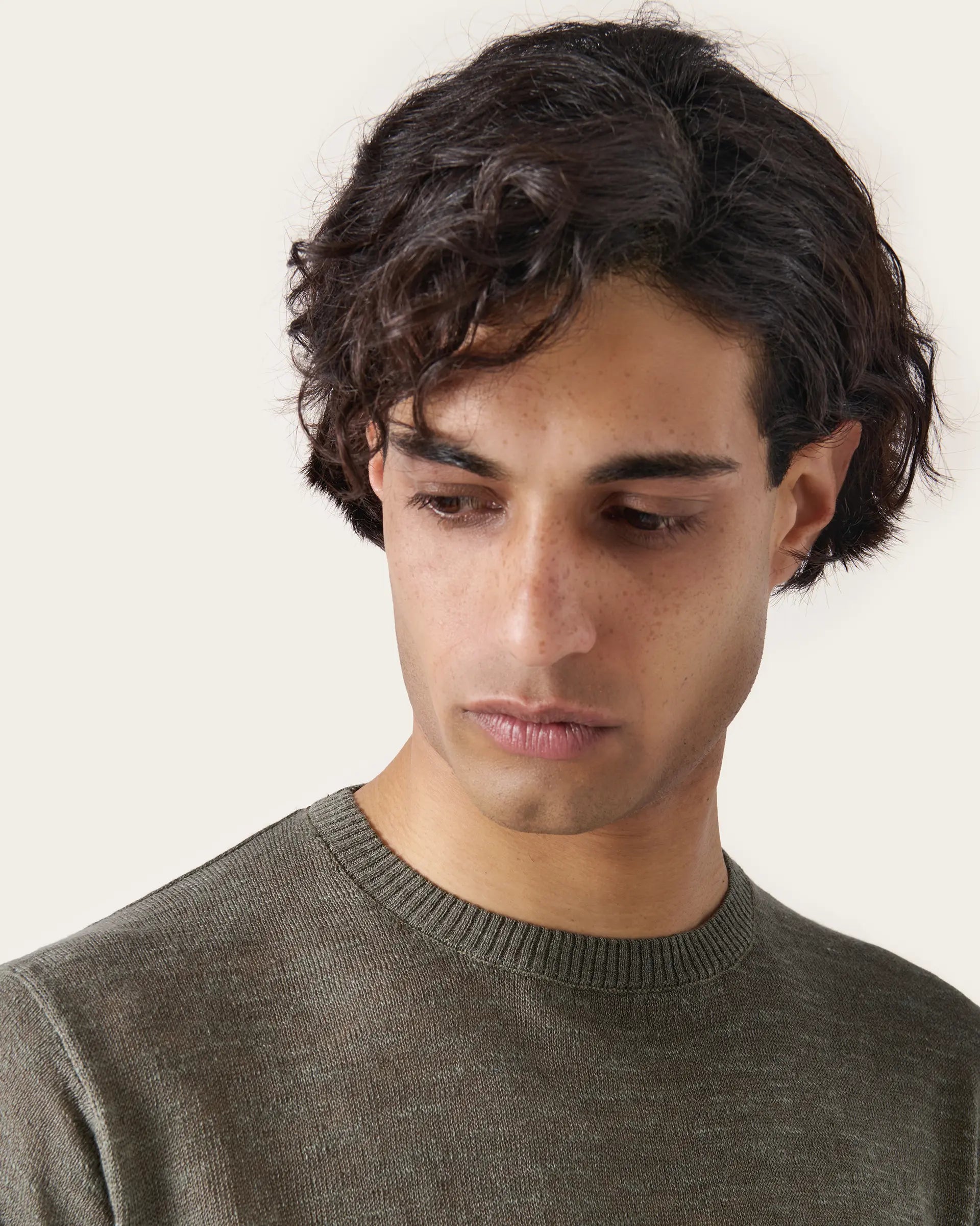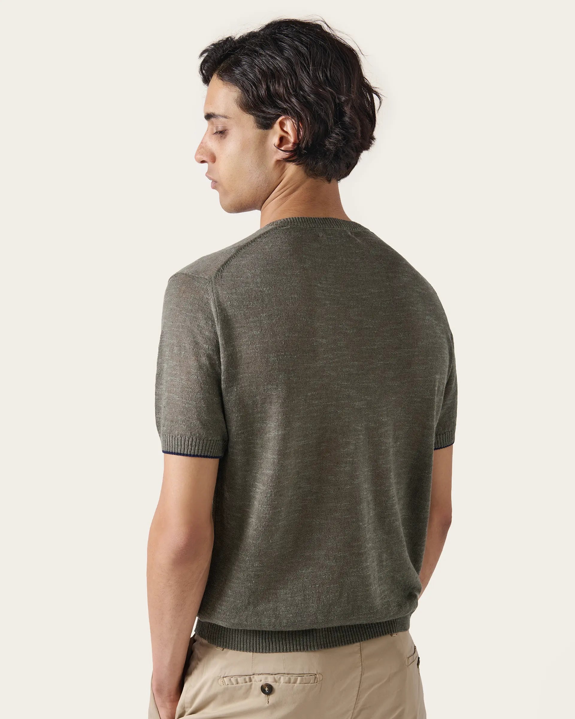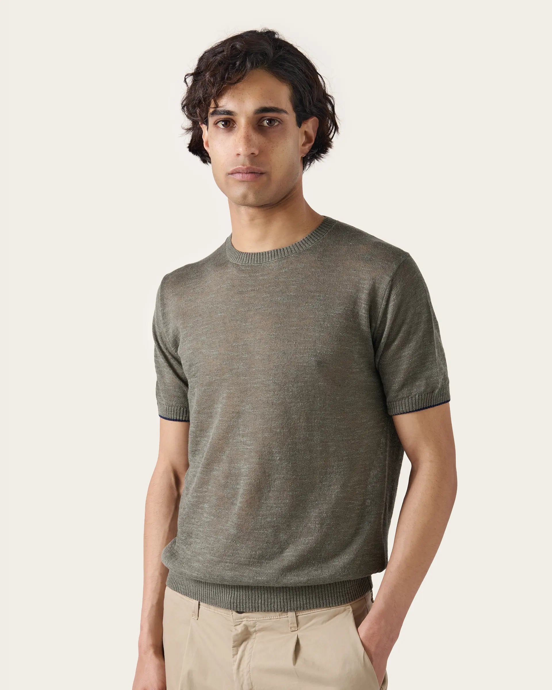 Short-sleeved sweater made with a fine blend of linen and extra-fine 14-gauge shaved cotton to guarantee a sensation of freshness perfect for summer days. The melange effect gives three-dimensionality to the garment while maintaining a classic elegance revisited in a contemporary key. To be worn under a jacket as an alternative to a shirt or alone with a pair of casual trousers.