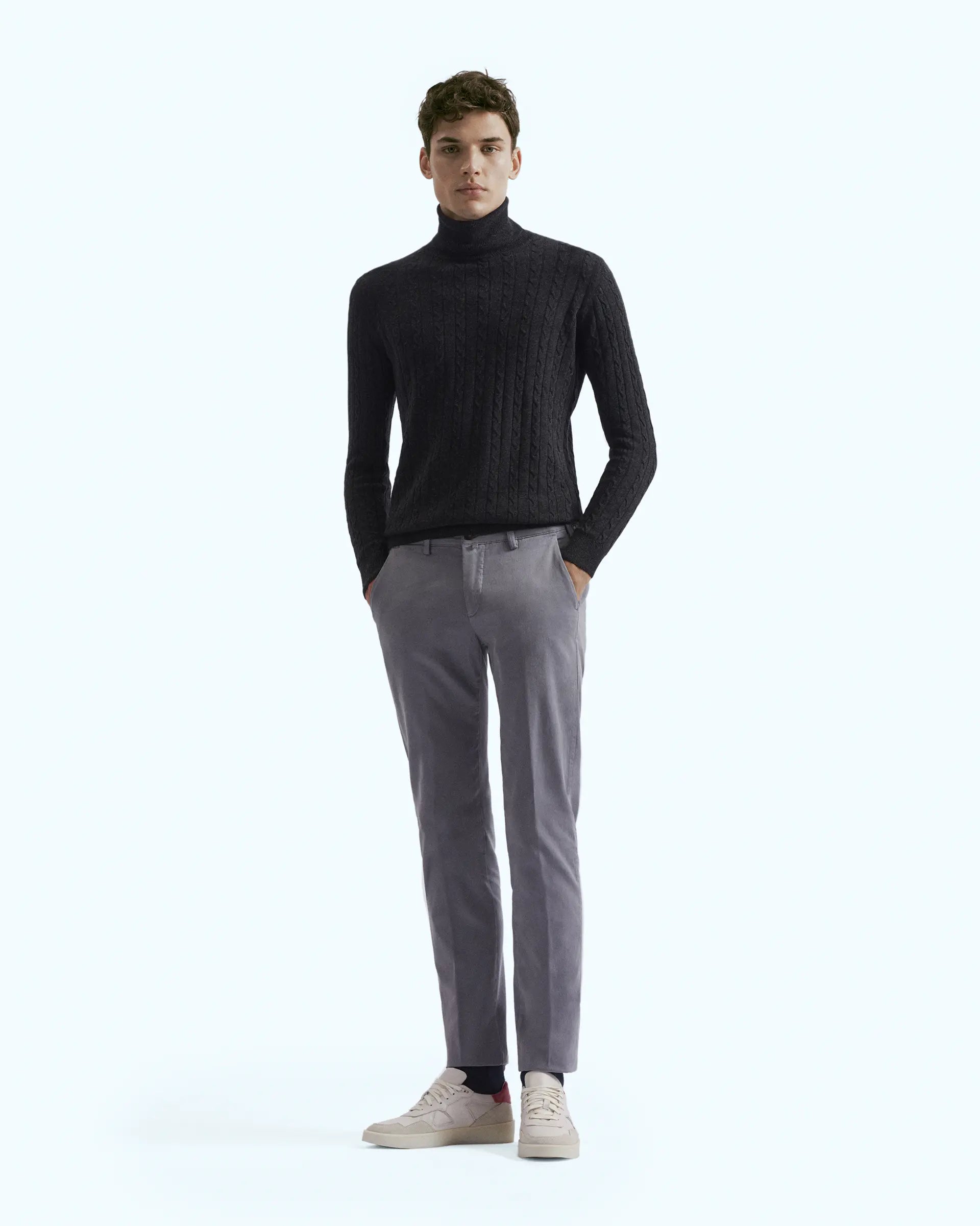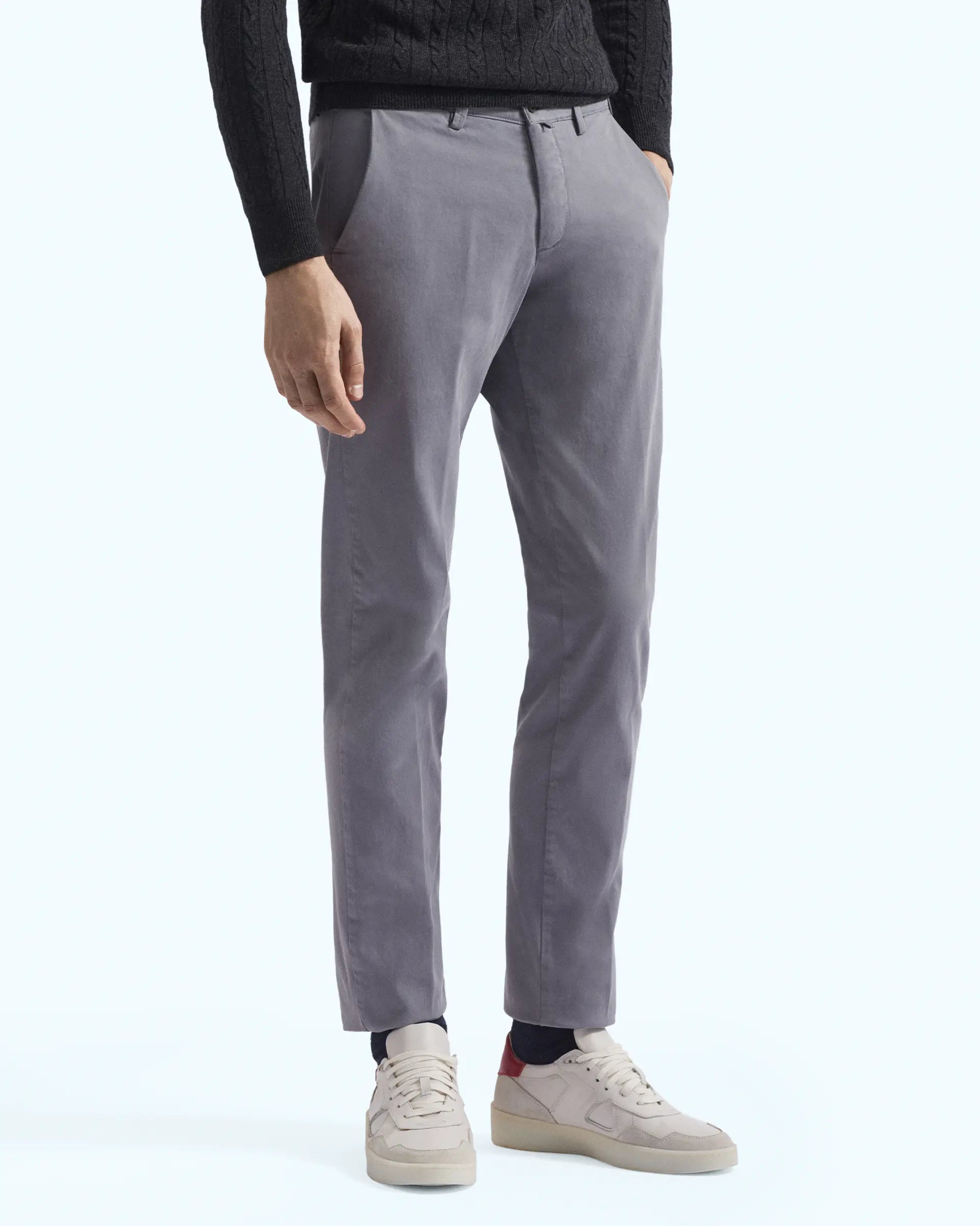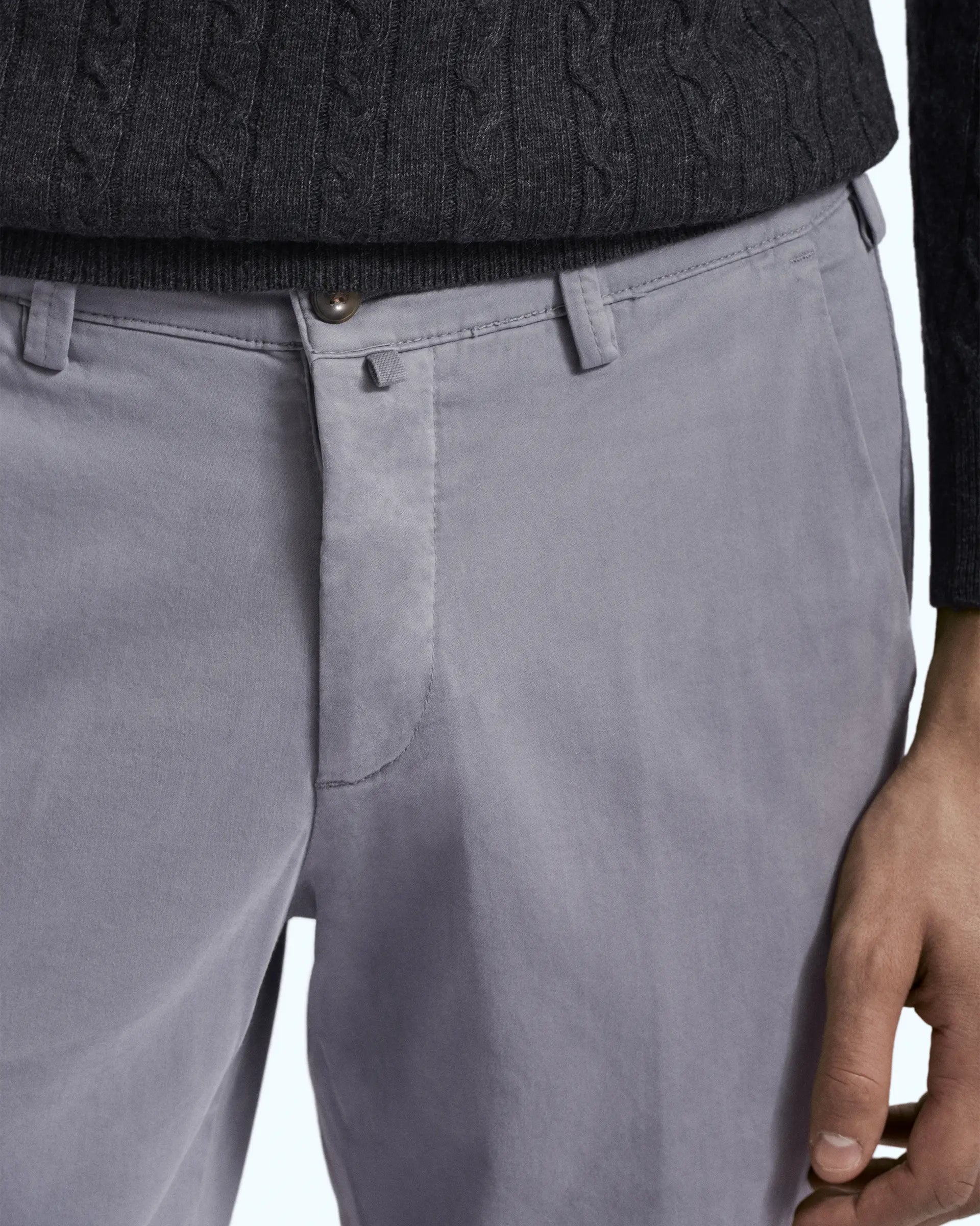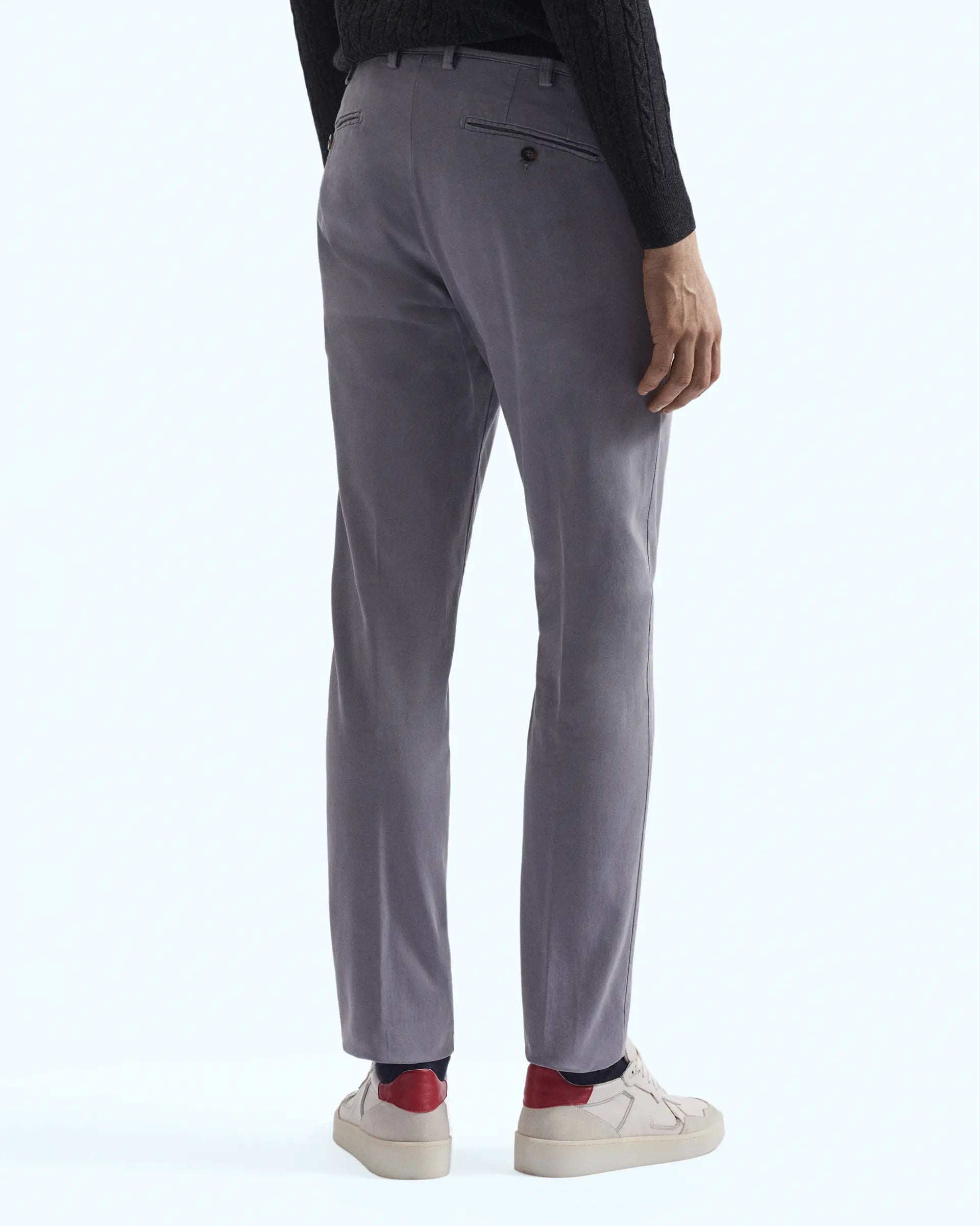Chino trousers in stretch cotton bull with denim effect, a strong and resistant fabric but at the same time soft and comfortable. The casual-inspired fabric marries with sartorial details giving life to a modern and refined garment. The garment dyeing adds a pleasant shaded chromatic effect