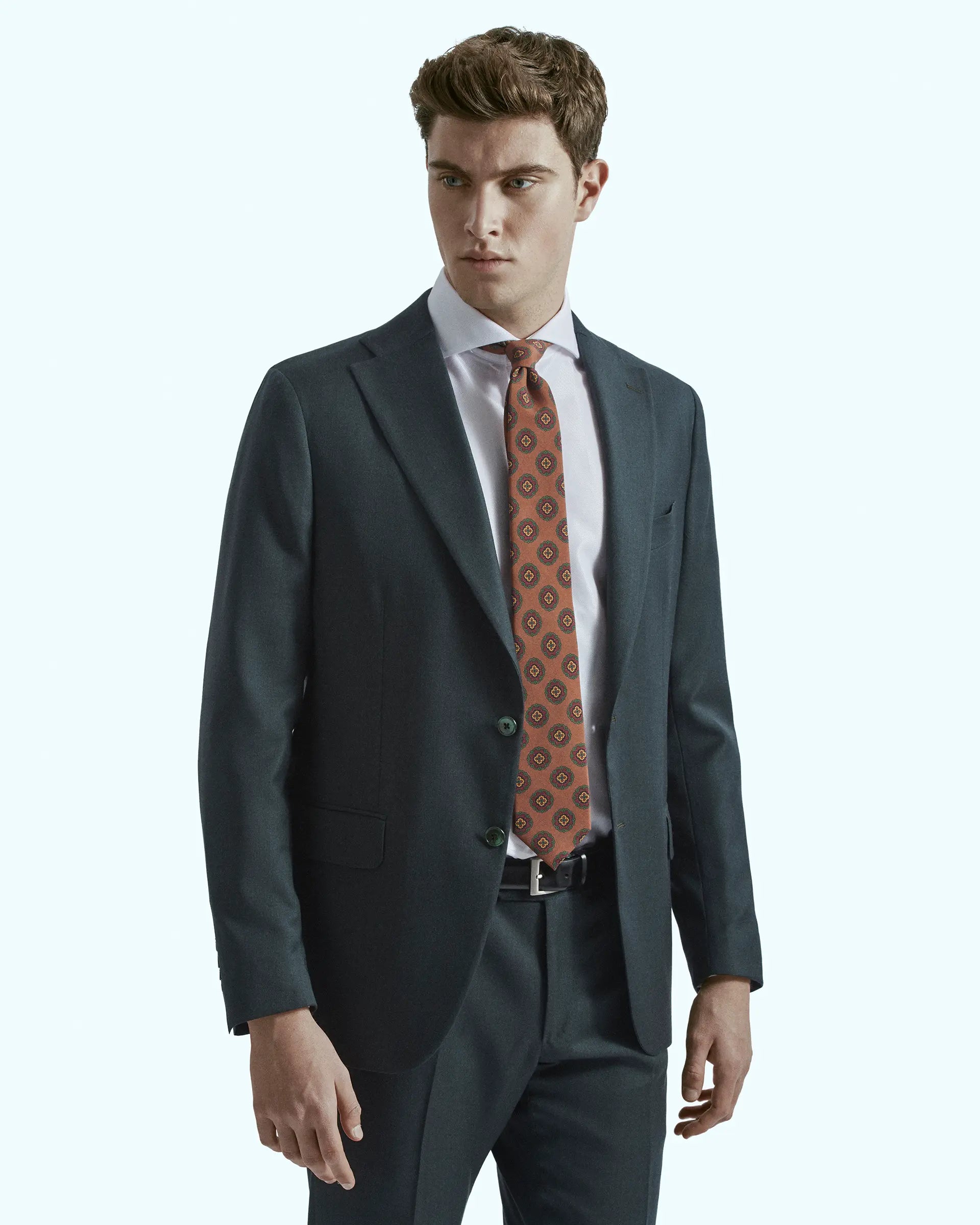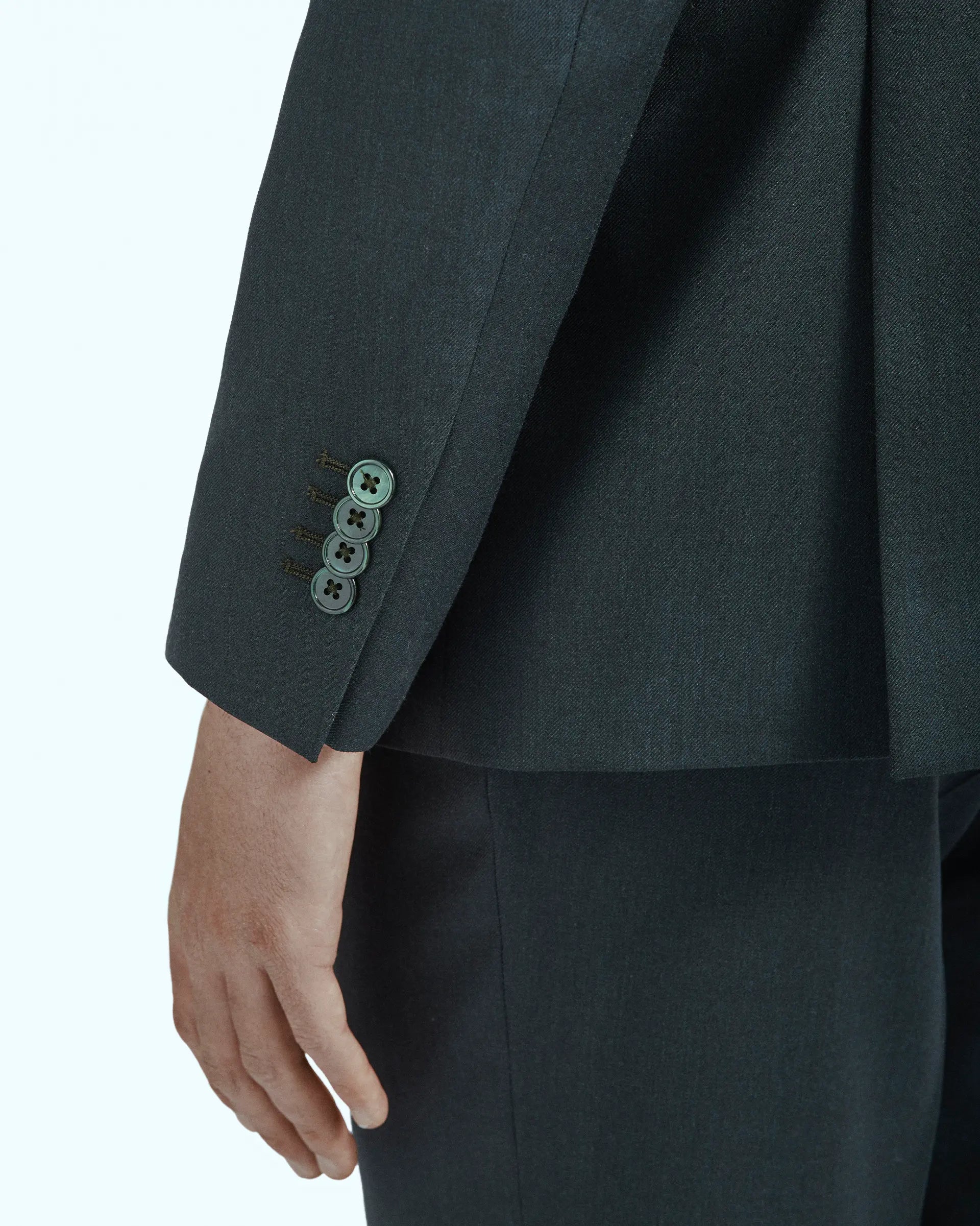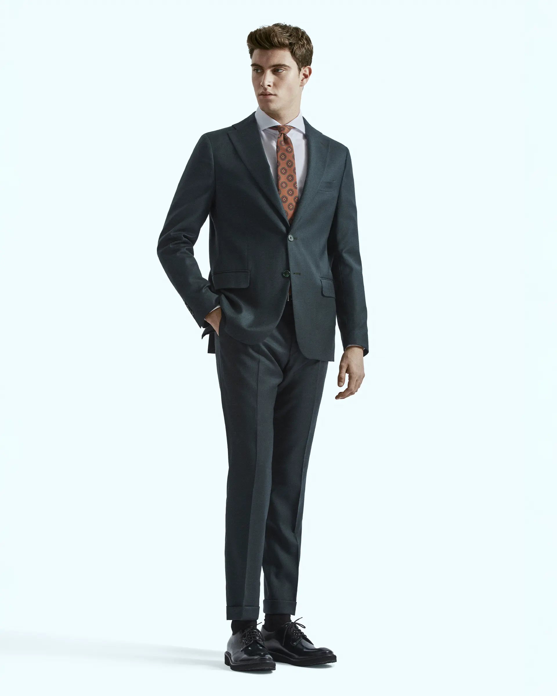 Tailored suit made with exclusive "Zelander Dream" fabric from Lanificio Loro Piana. The lined jacket, with semi-lined construction and light shoulder pad for a comfortable and enveloping fit that adapts perfectly to the body, is combined with crease-free trousers combining aesthetics and functionality. The luxurious details such as the internal silk finishes, the real buttonholes to be finished and the real corozo buttons express the pursuit of excellence in every detail.