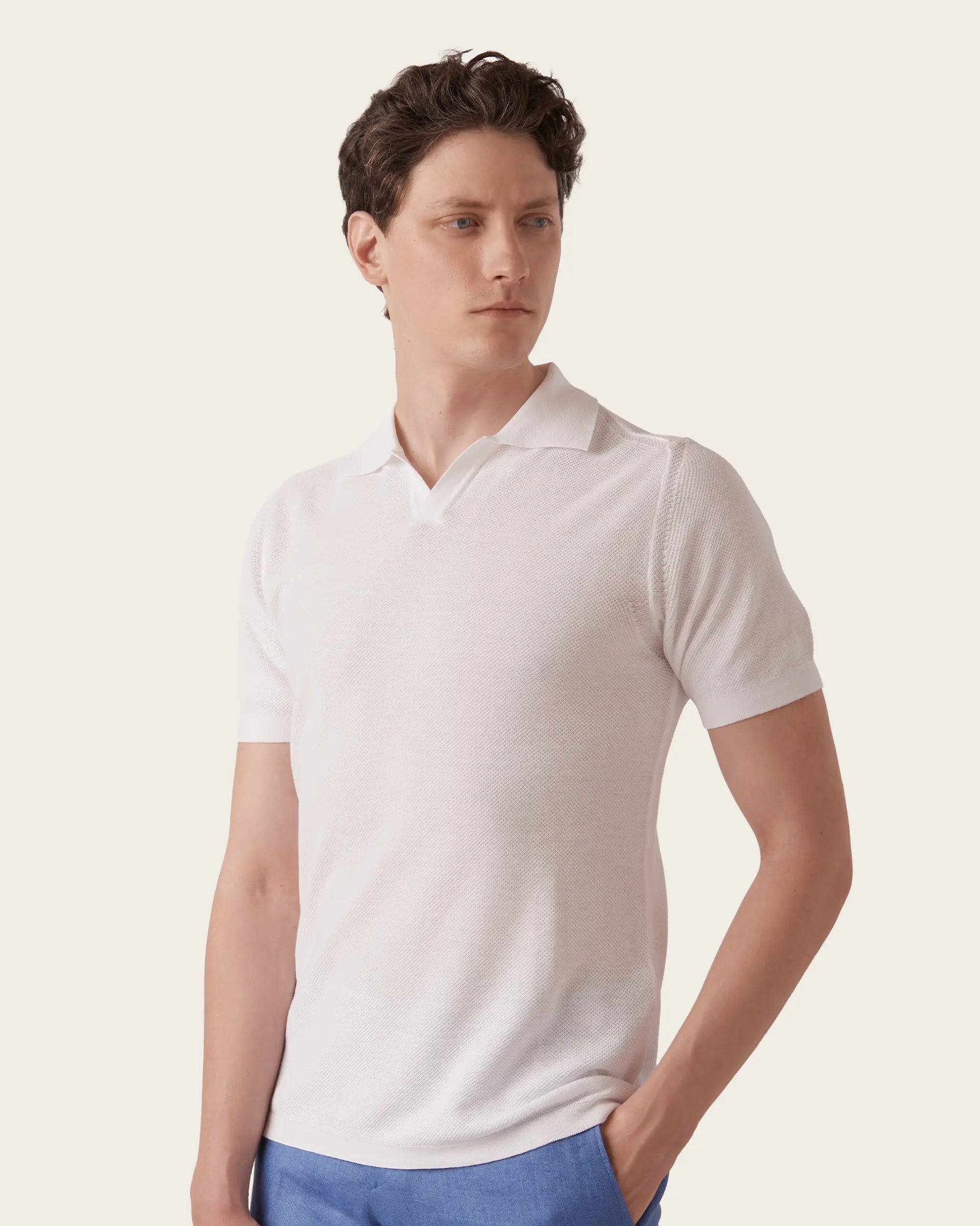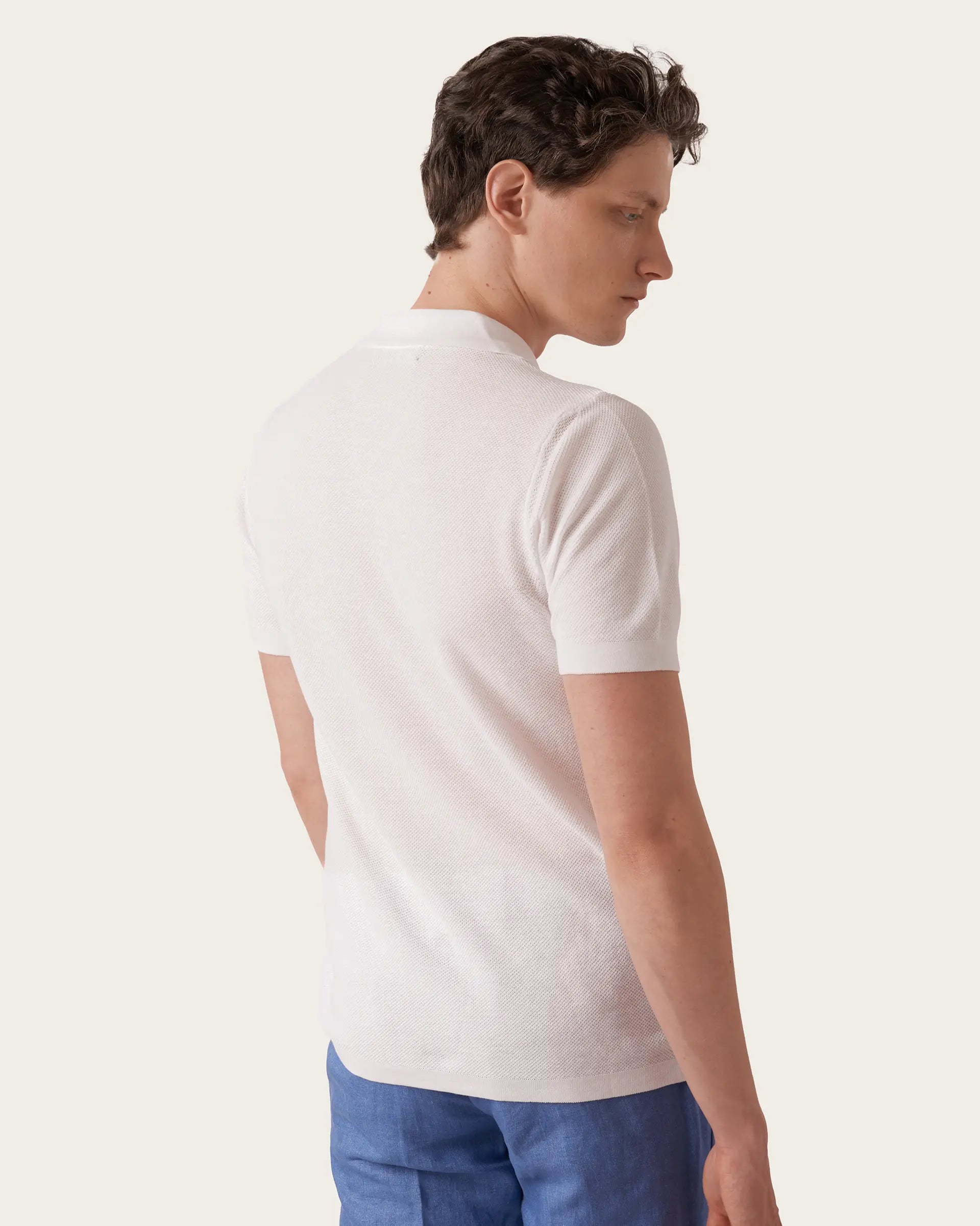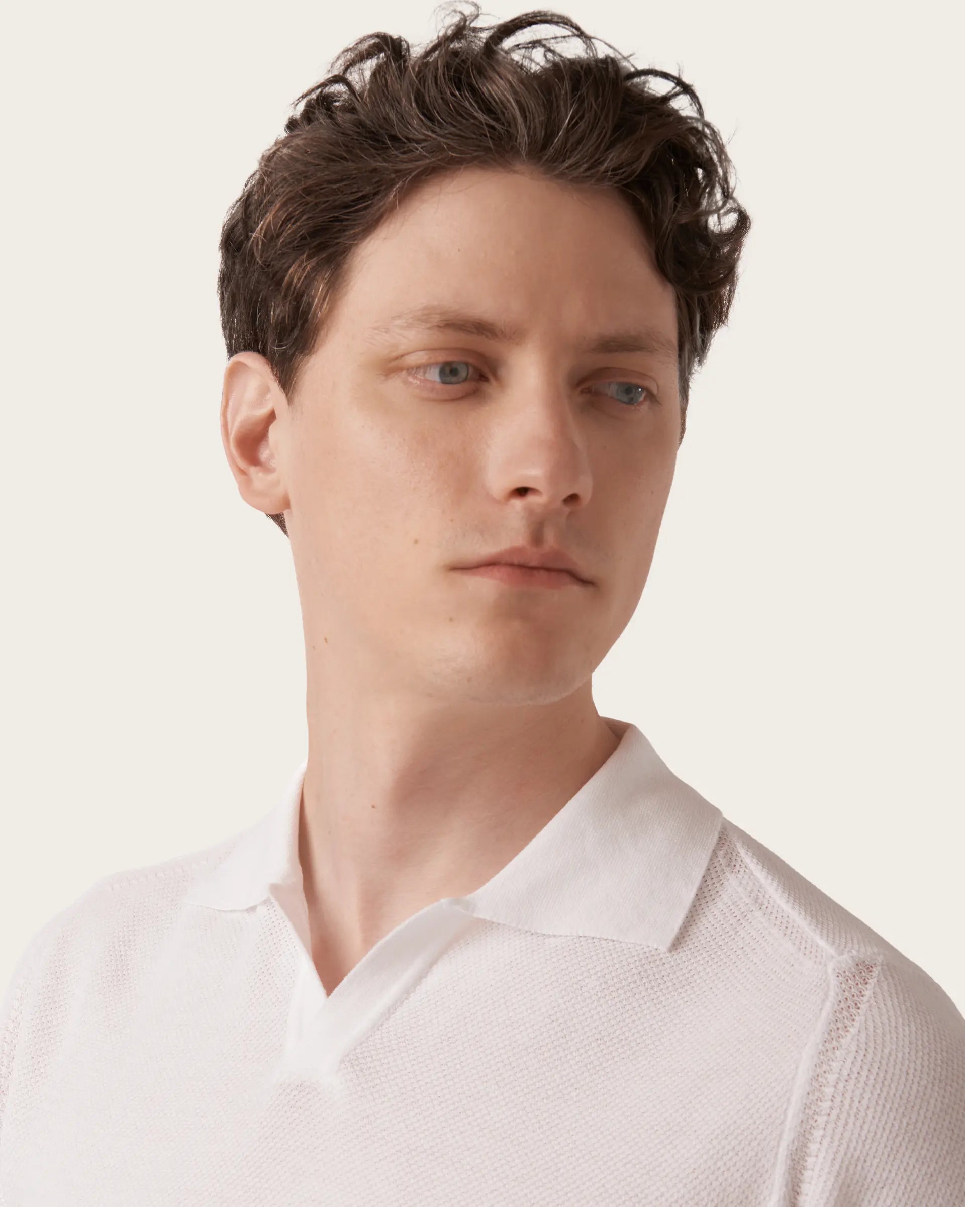 Short-sleeved polo characterized by a v-neck that revisits a classic garment in a modern perspective. The style is defined by a honeycomb workmanship that gives character and softness to the shirt while the garment dyeing guarantees unique and intense shades of color. Perfect expression of a sporty but refined garment that adds a little lightness to spring summer outfits.
