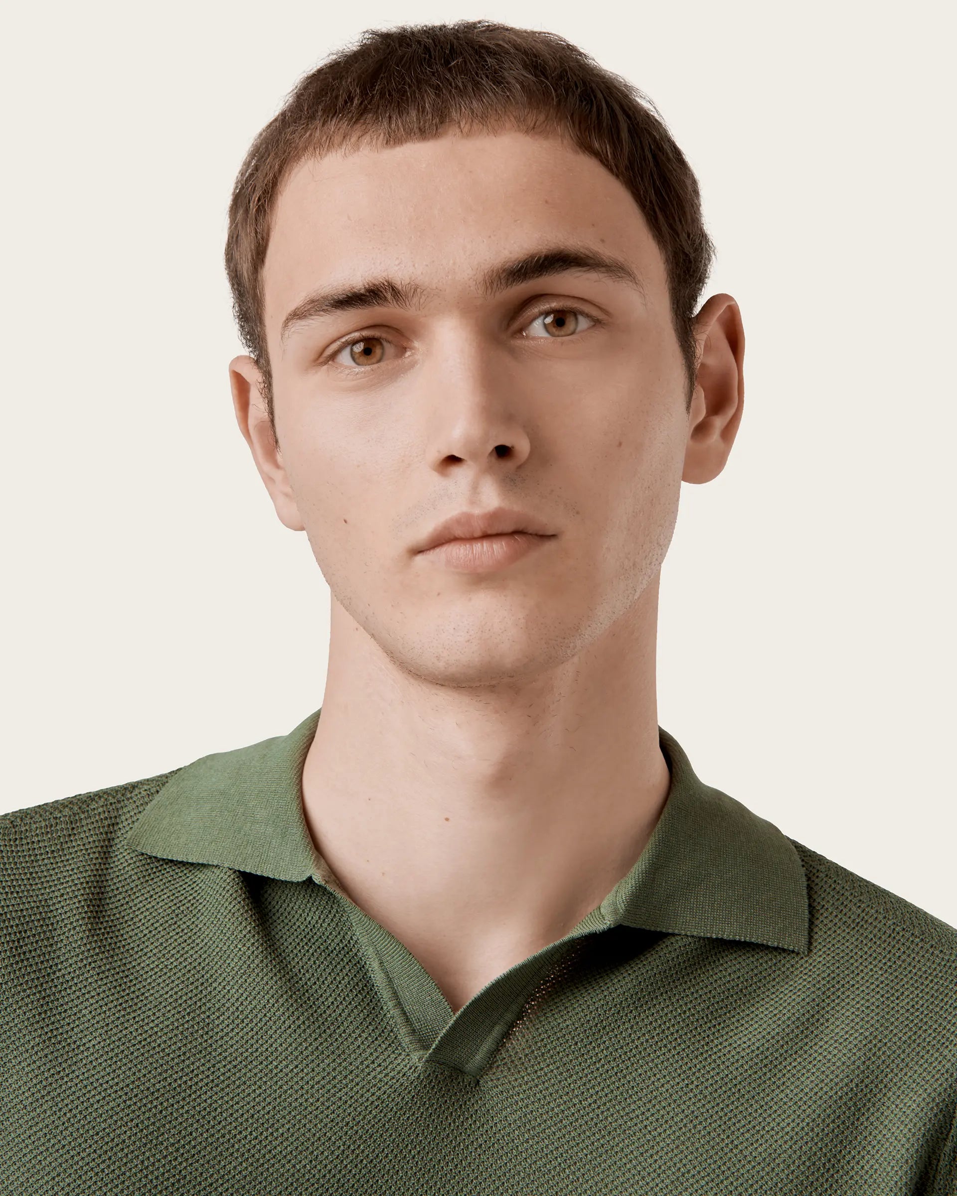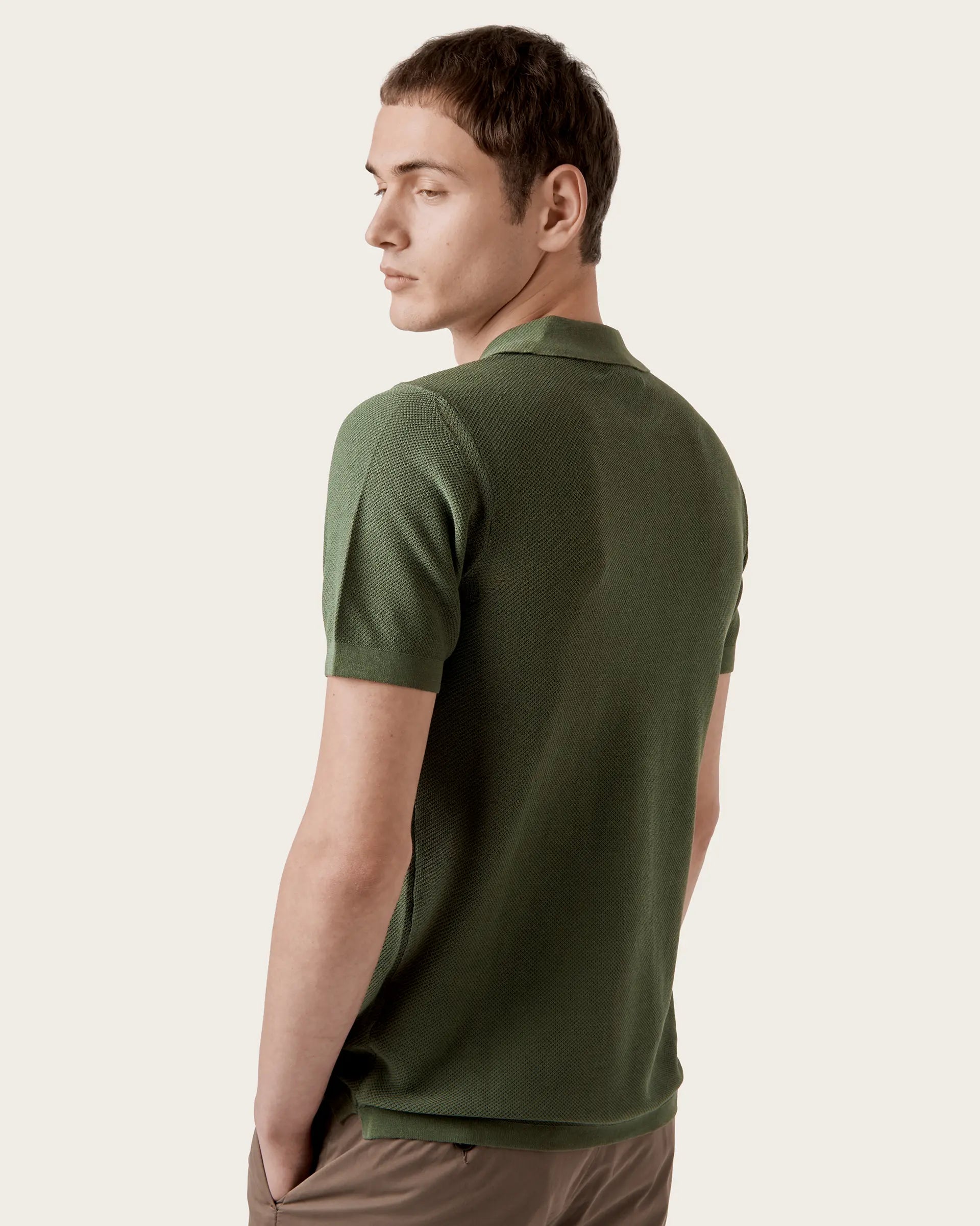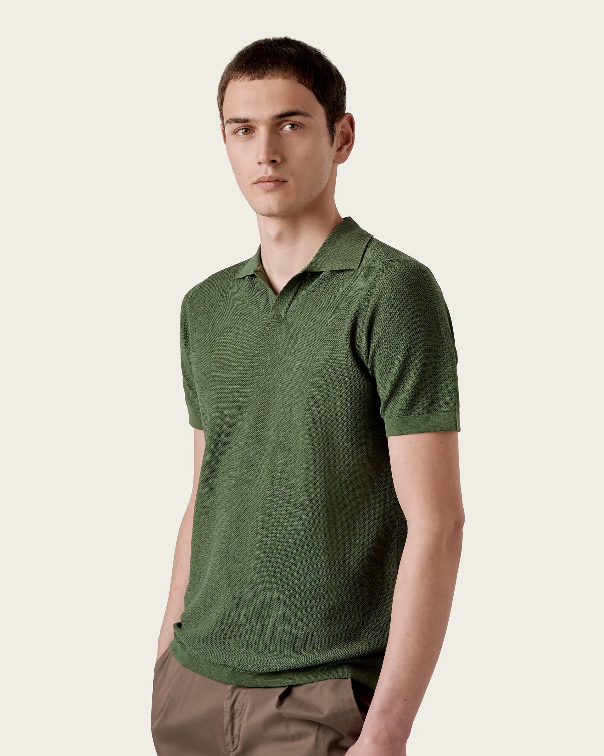 Short-sleeved polo characterized by a v-neck that revisits a classic garment in a modern perspective. The style is defined by a honeycomb workmanship that gives character and softness to the shirt while the garment dyeing guarantees unique and intense shades of color. Perfect expression of a sporty but refined garment that adds a little lightness to spring summer outfits.