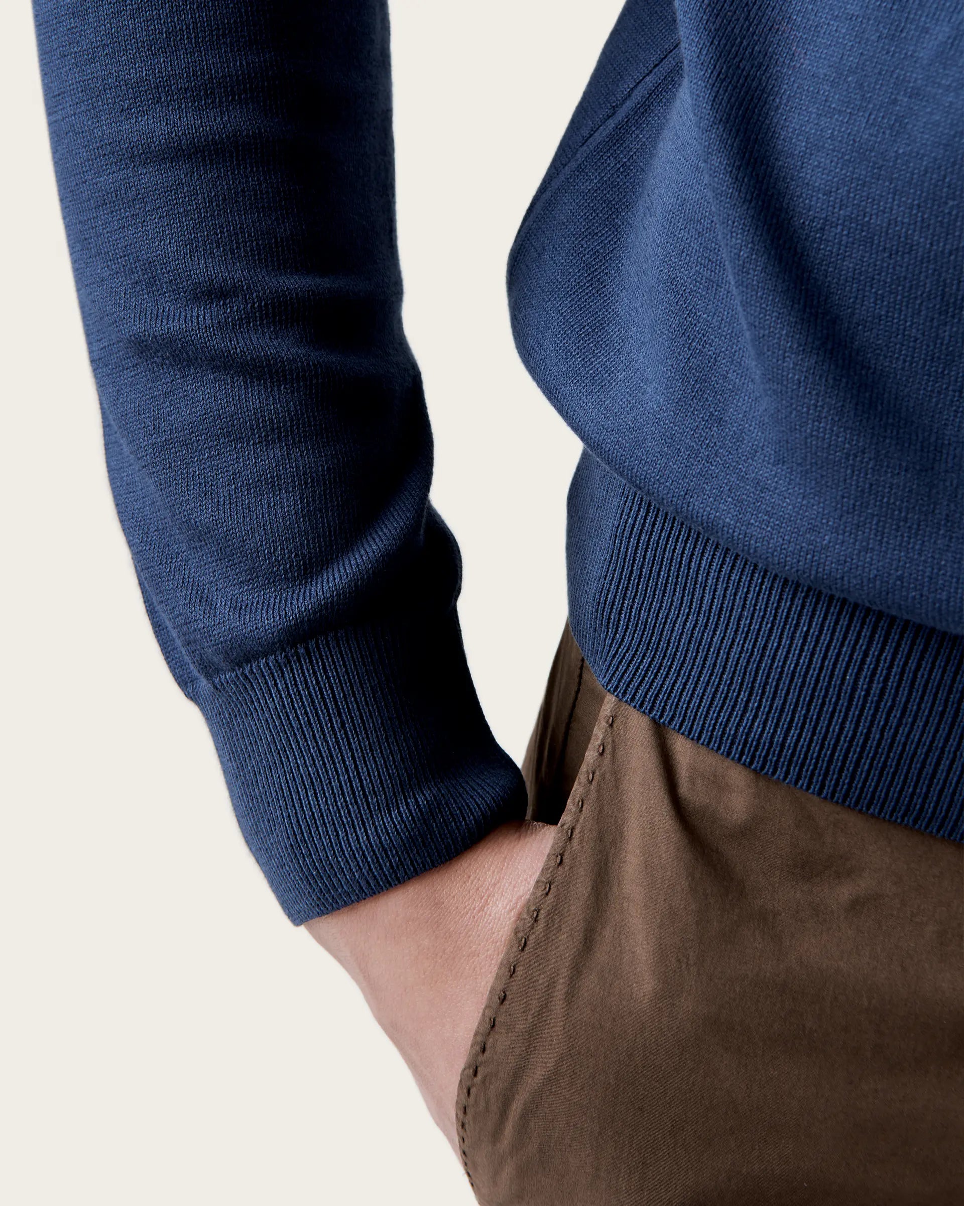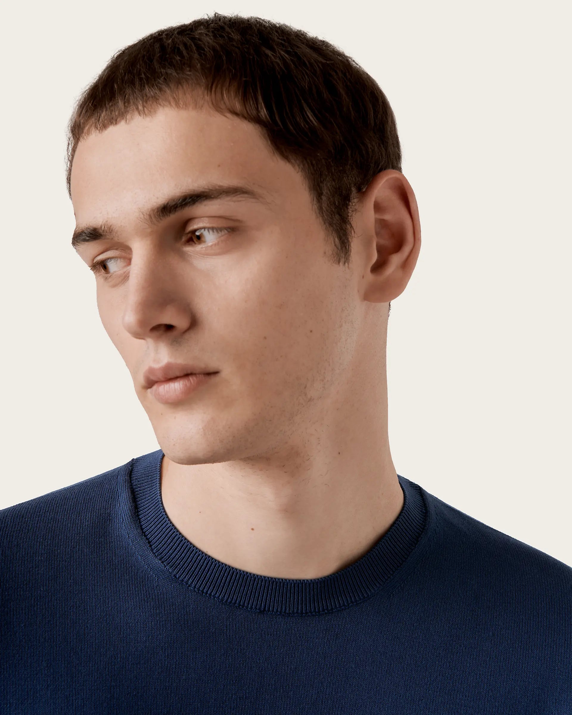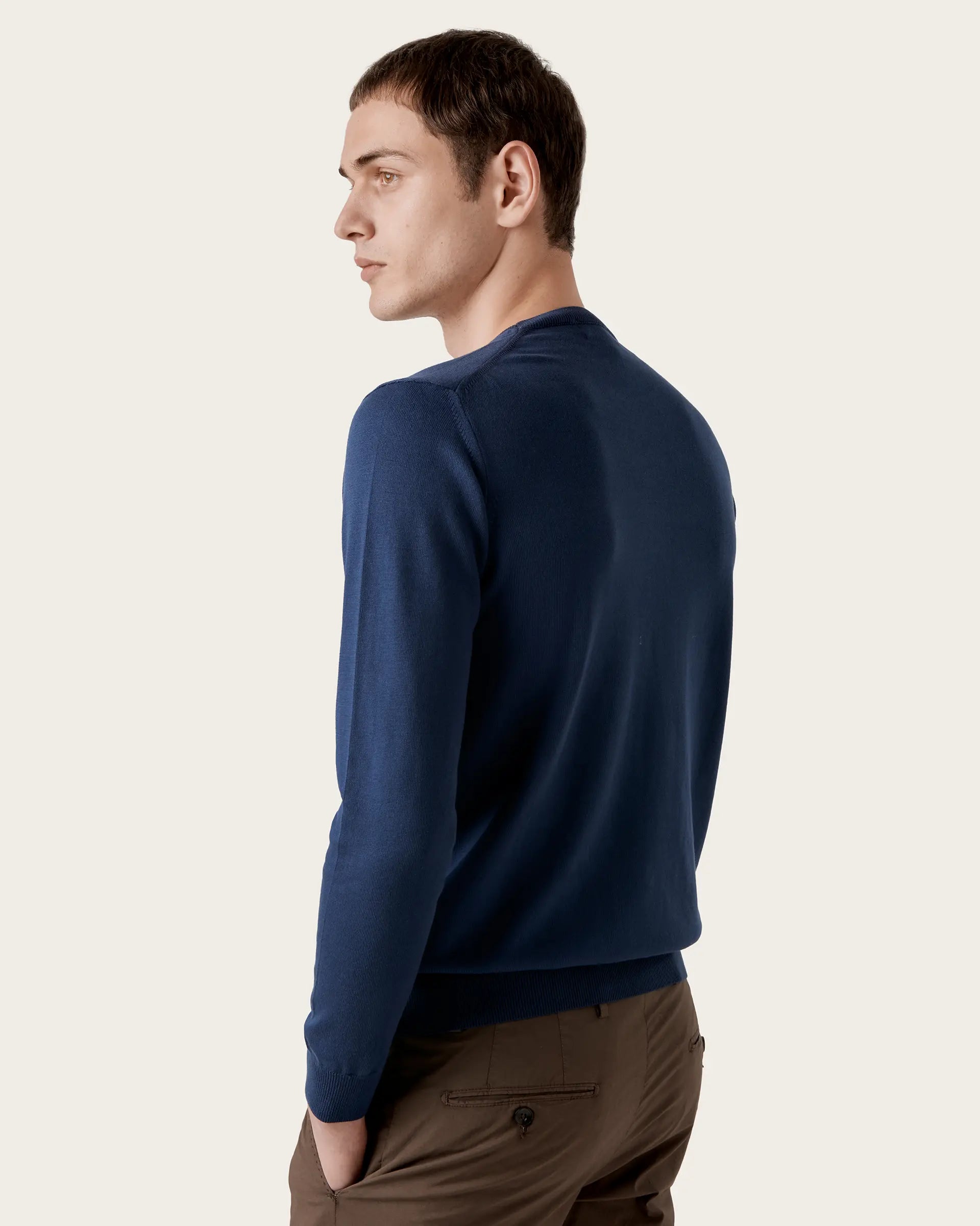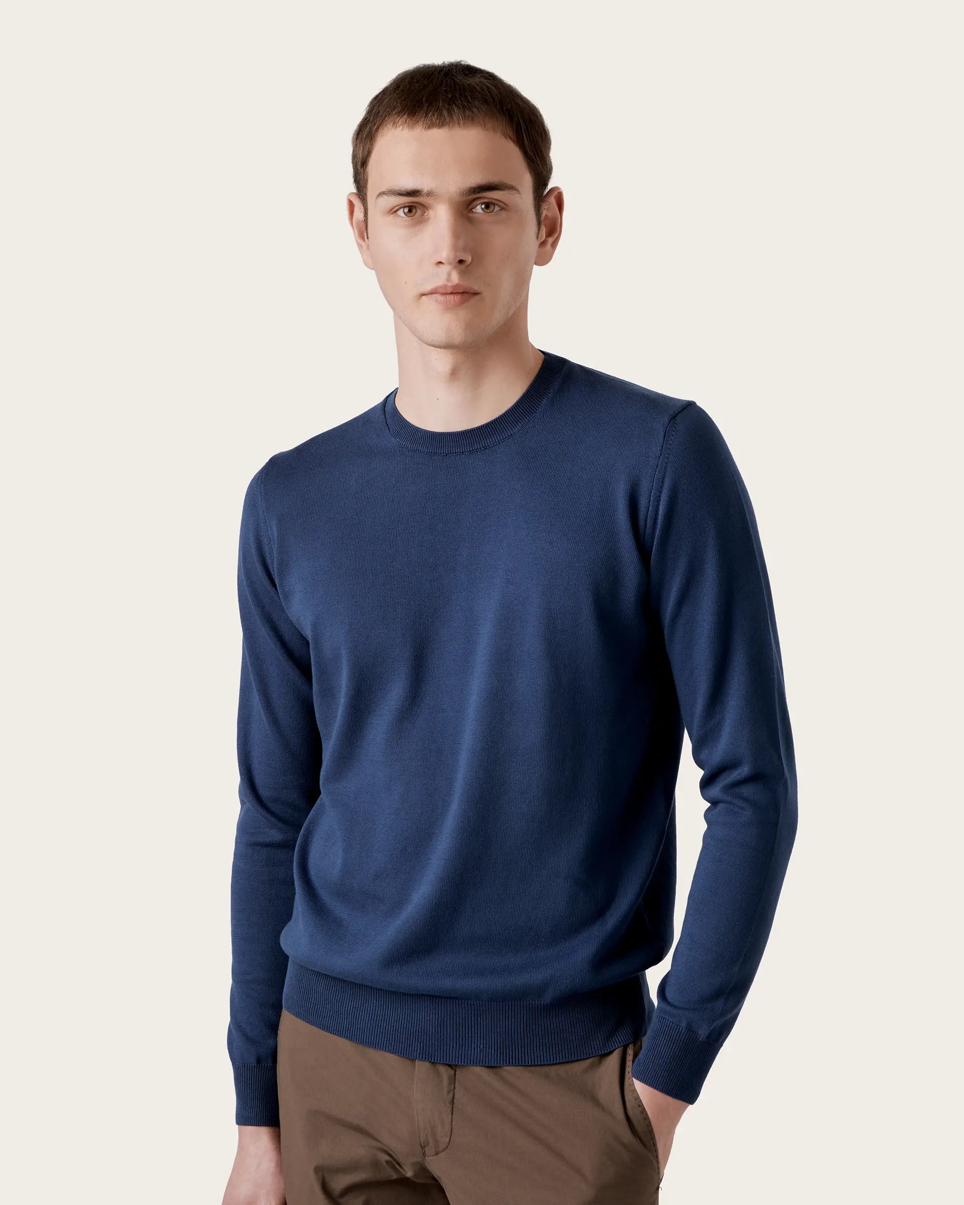 Crew neck, long-sleeved sweater made of extra-fine shaved cotton worked with a single thread in gauge 14. A garment with an essential style, comfortable and light, embellished by the garment dyeing that gives it a soft touch and unique and intense shades of color and by the characteristic texture that gives it the right weight to face the change of season.