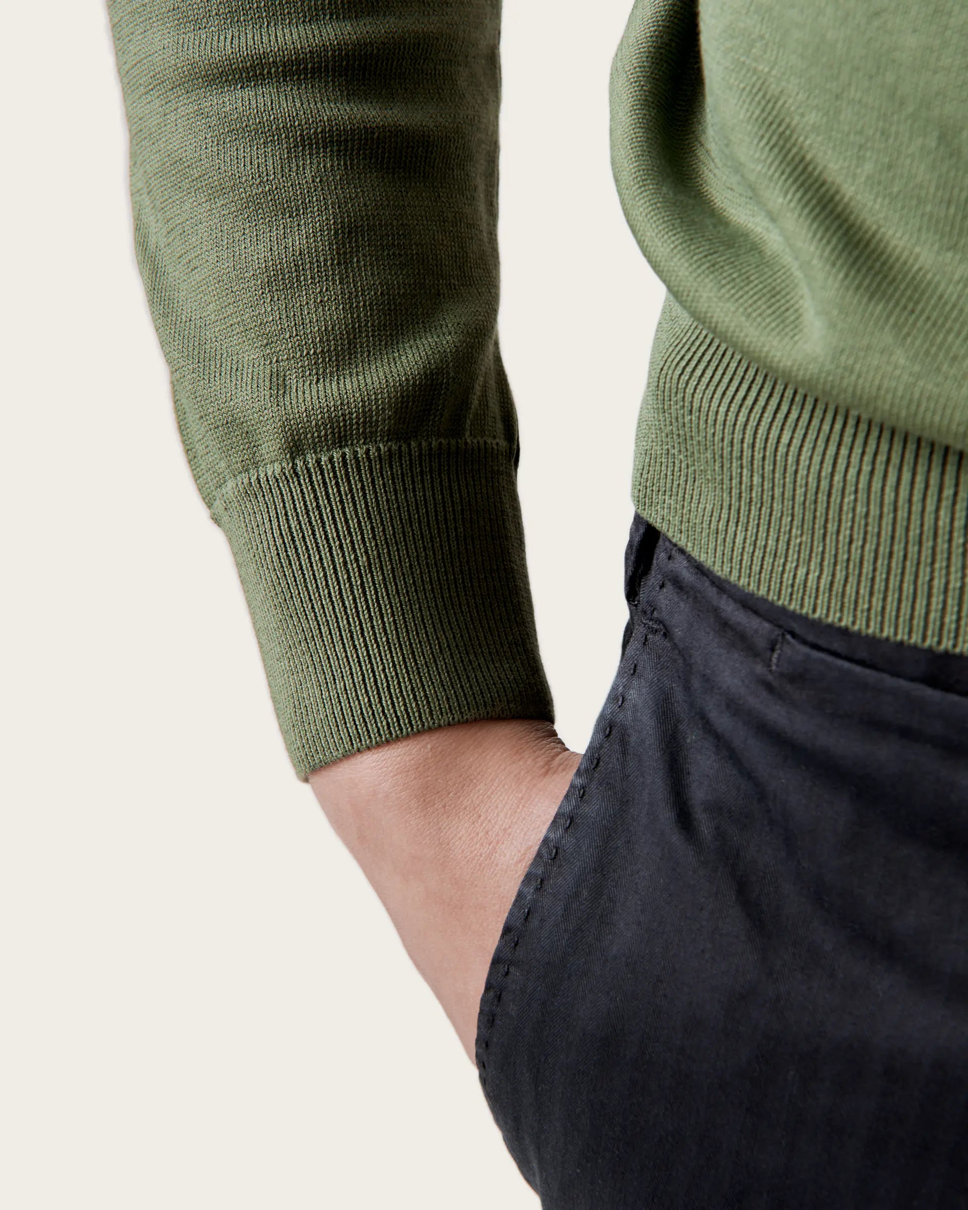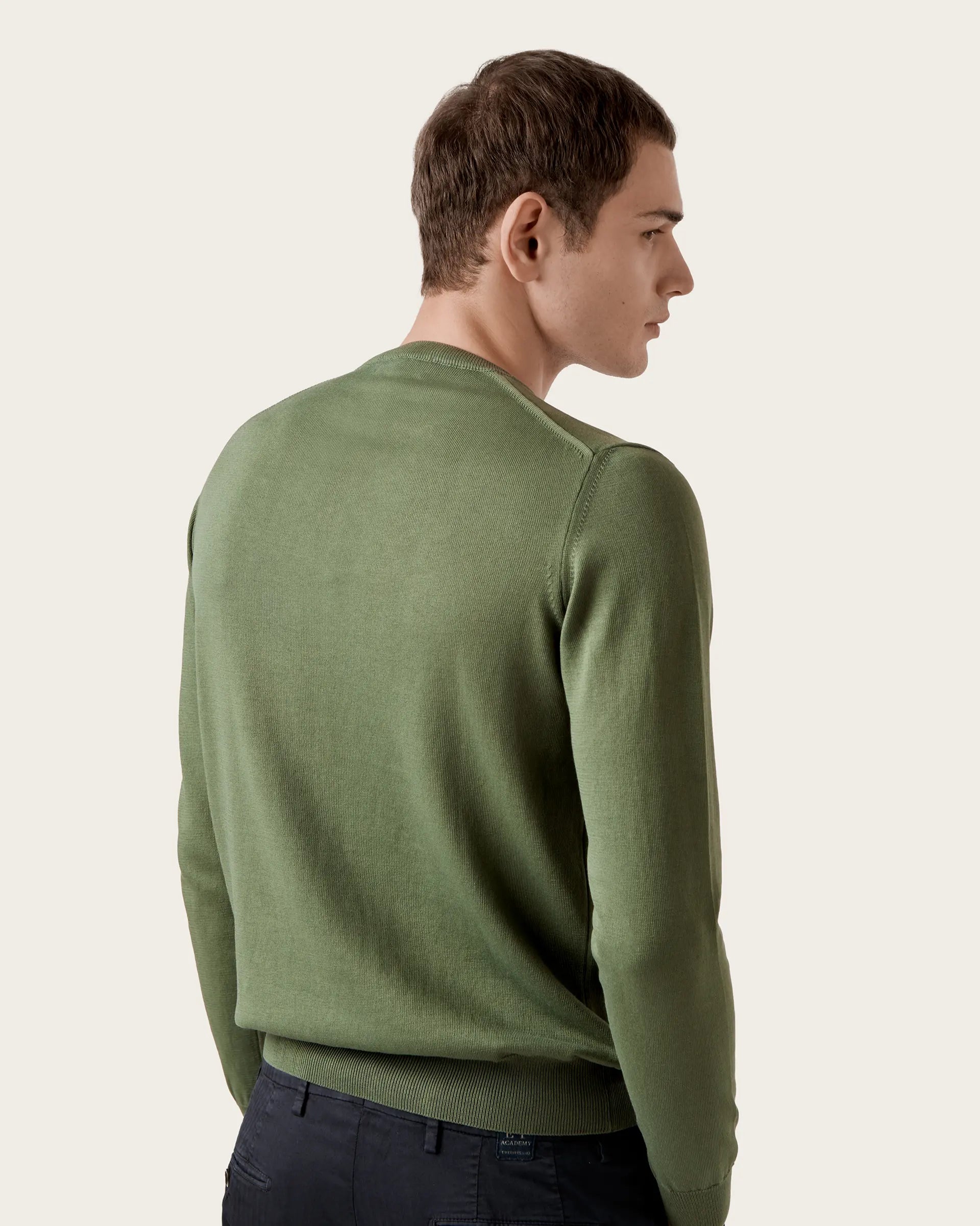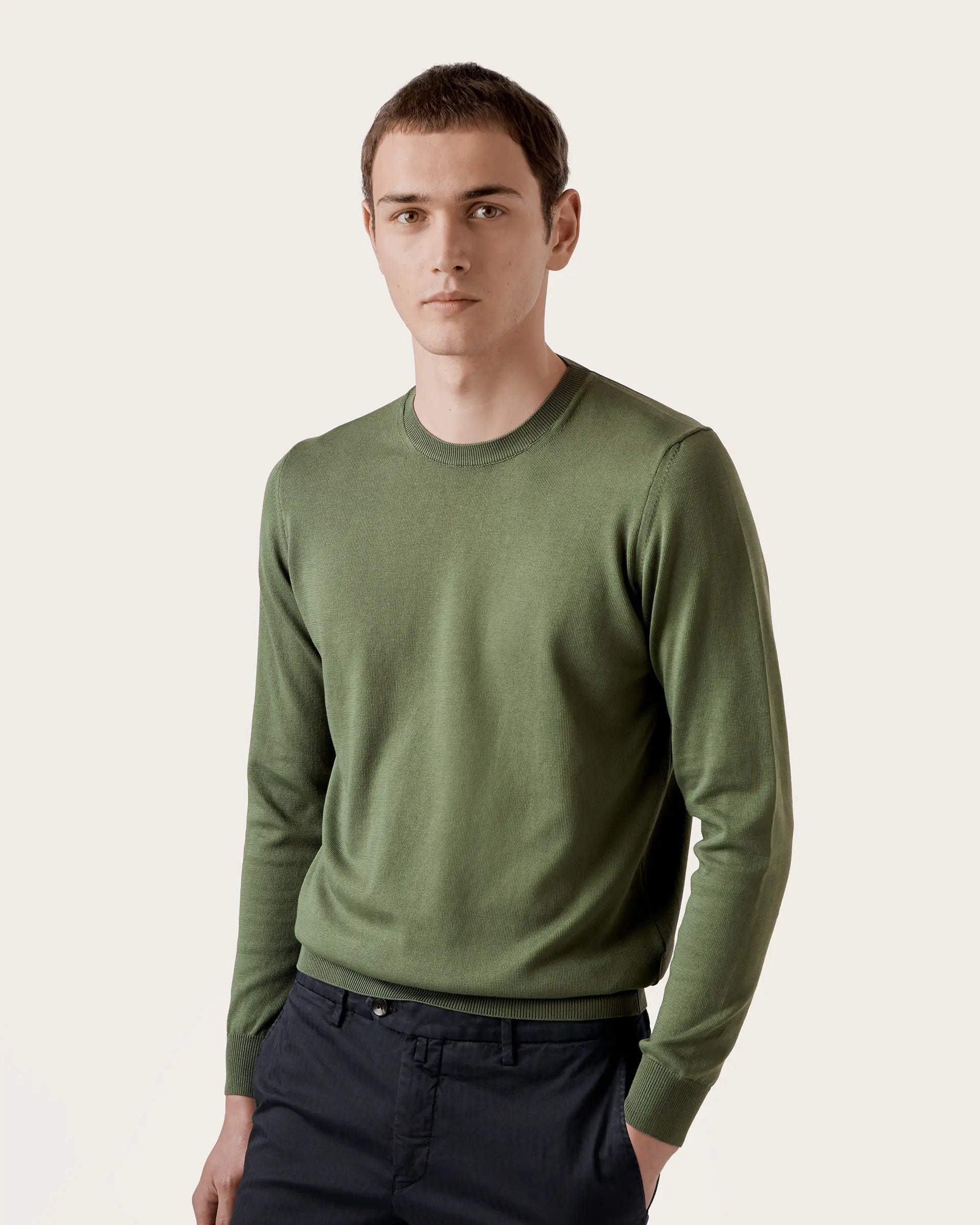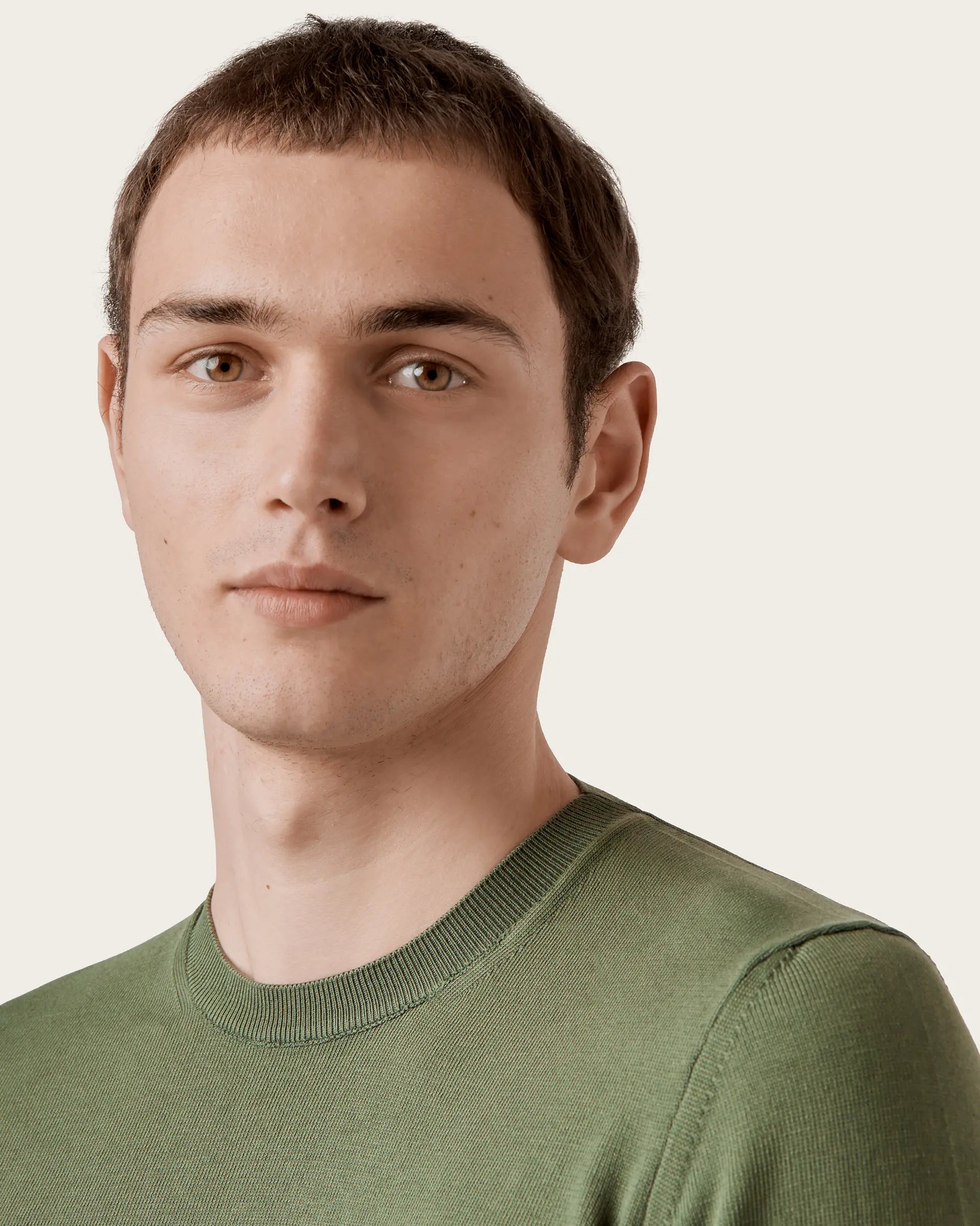 Crew neck, long-sleeved sweater made of extra-fine shaved cotton worked with a single thread in gauge 14. A garment with an essential style, comfortable and light, embellished by the garment dyeing that gives it a soft touch and unique and intense shades of color and by the characteristic texture that gives it the right weight to face the change of season.