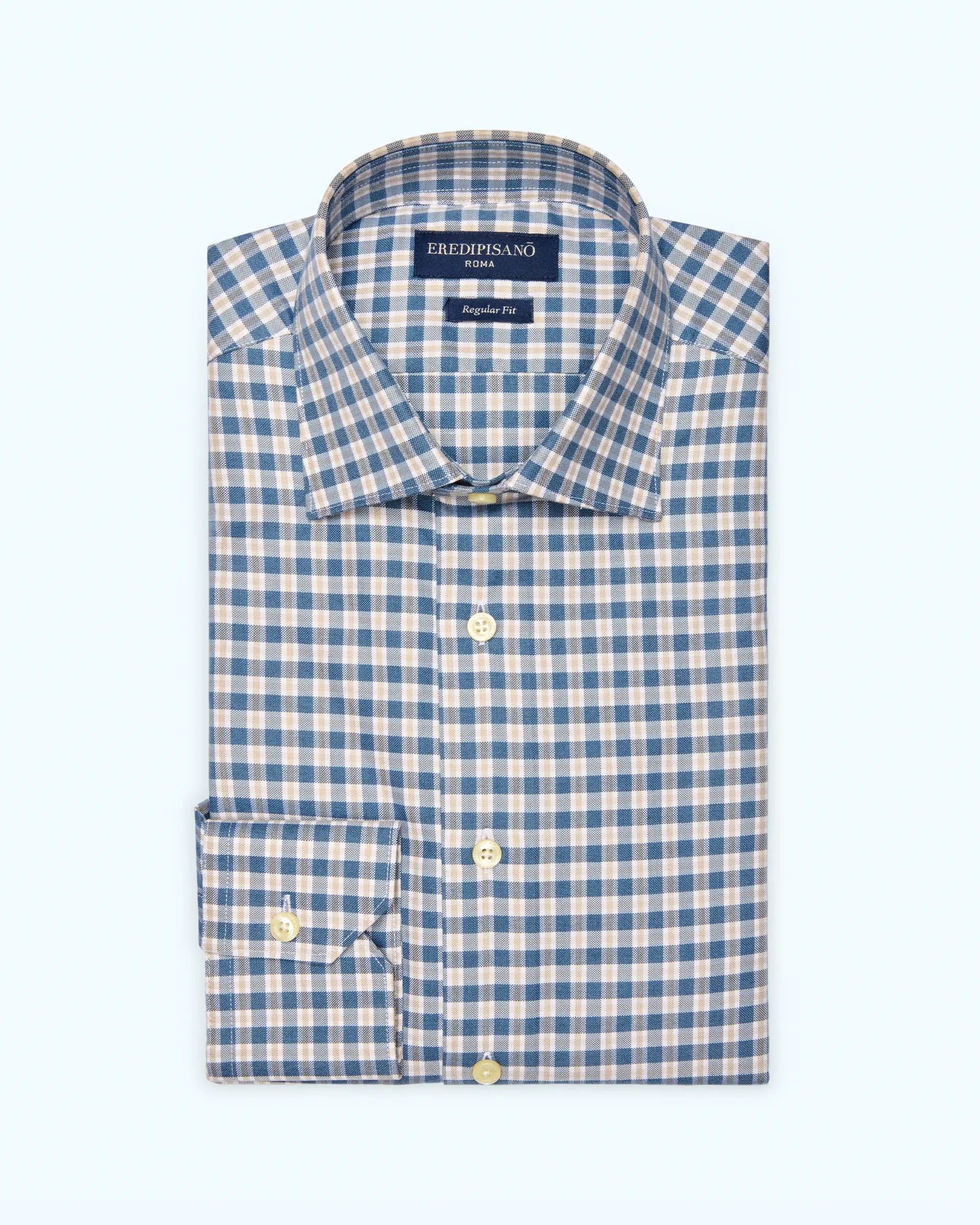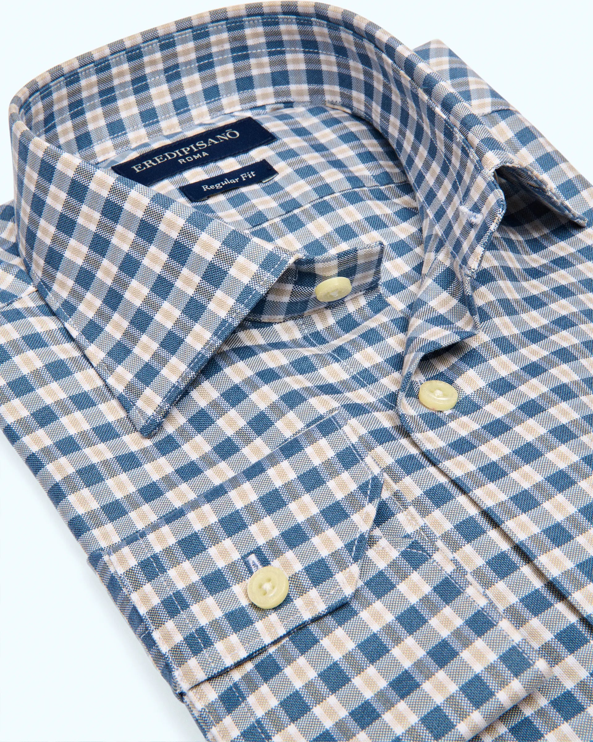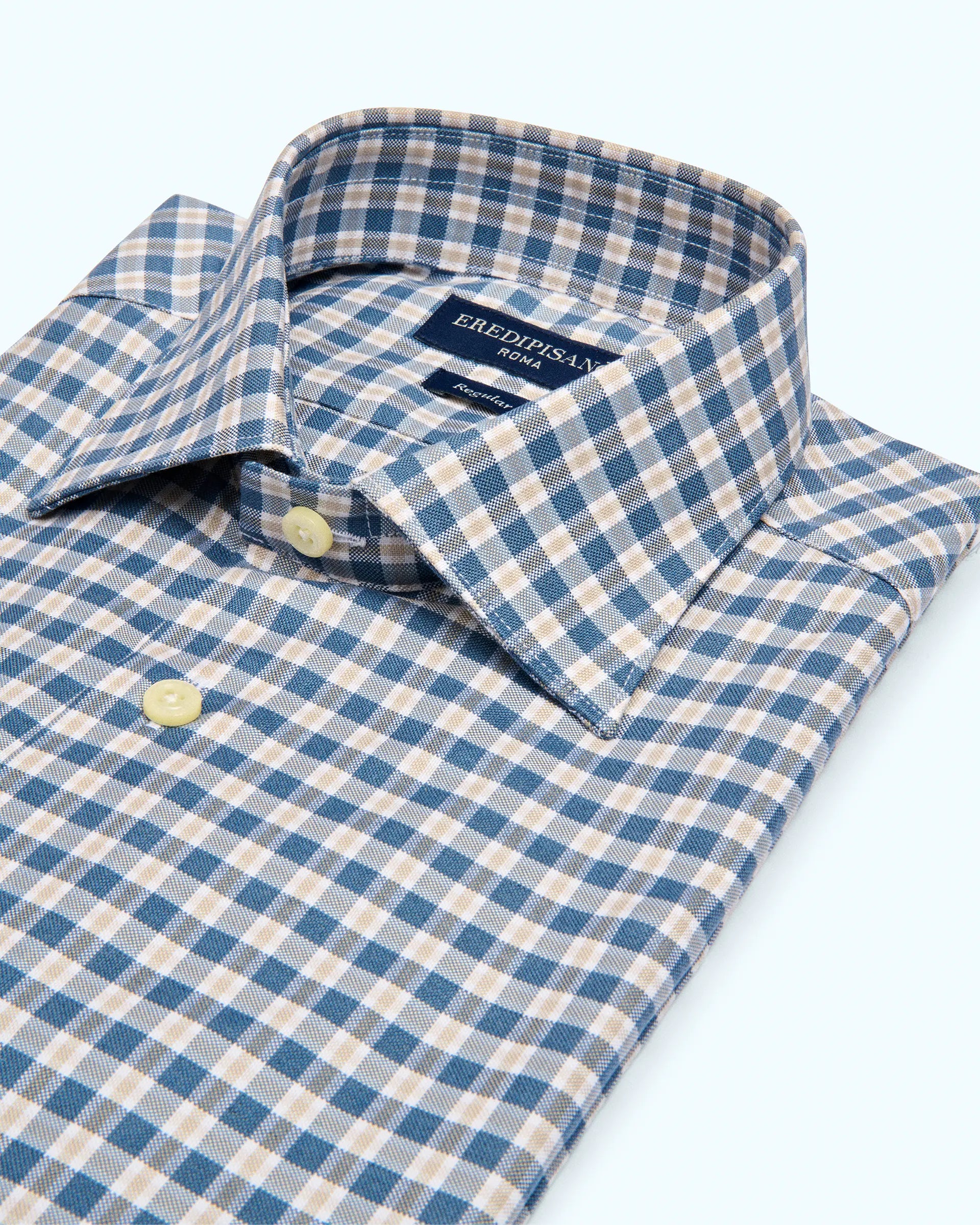 Tailored shirt made with fabric from the Albini cotton mill of natural origin and low environmental impact to define new standards of sustainability and comfort. The blend of yarns gives the garment softness and breathability and makes it ideal for those who need an impeccable and comfortable shirt all day long. Characterized by the comfort line of the regular fit, it stands out for the madras pattern enhanced by the Milan collar that adds a touch of classic.