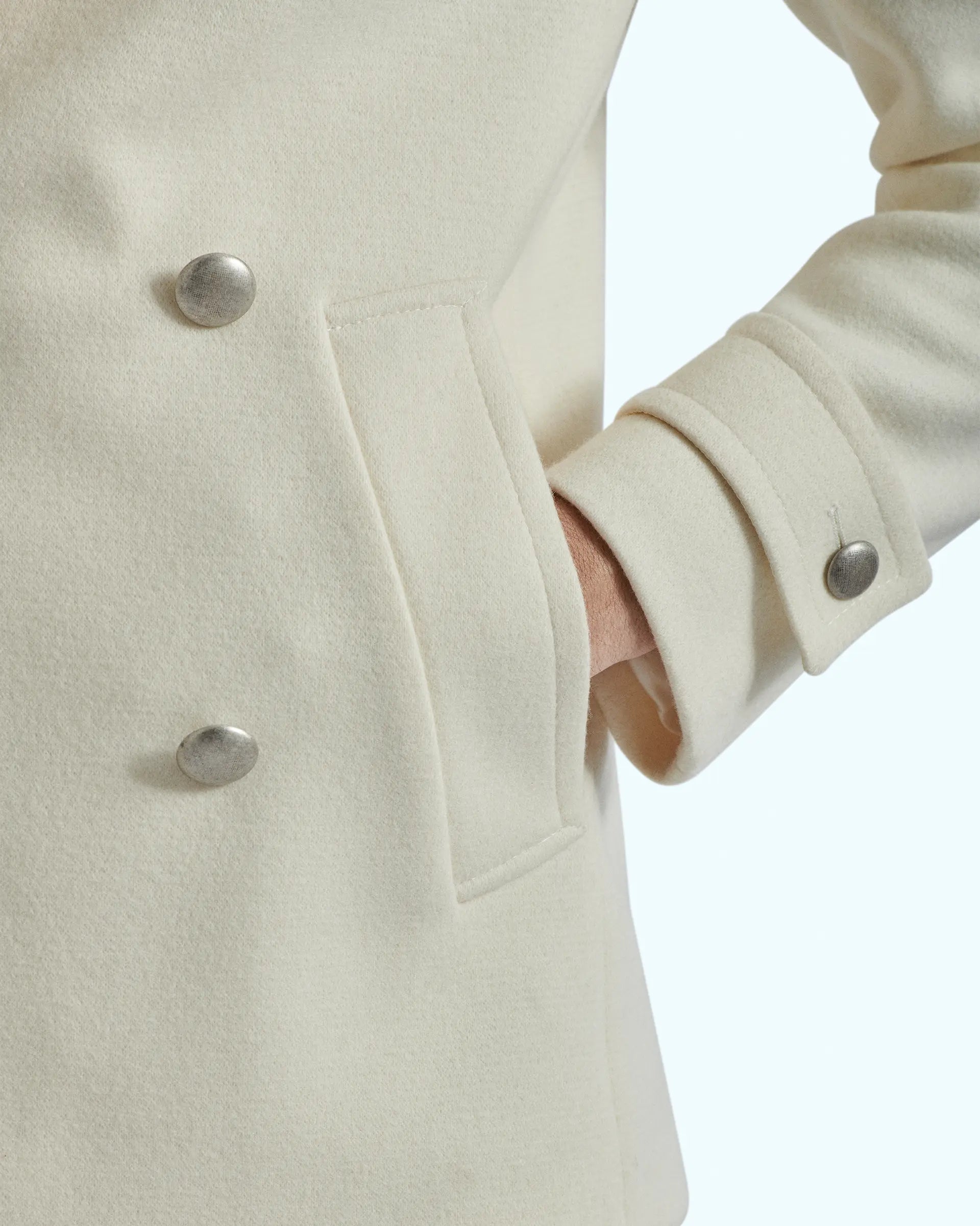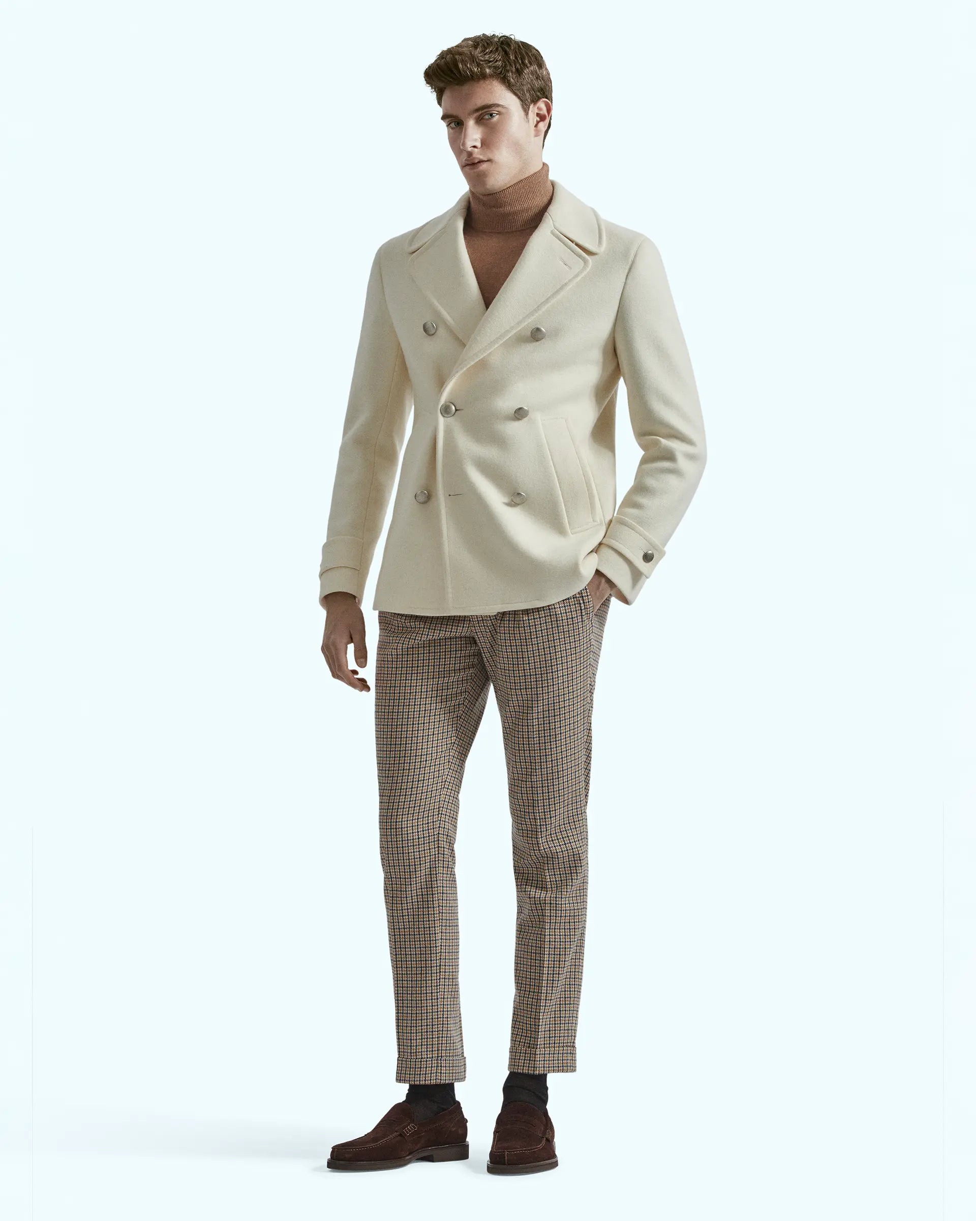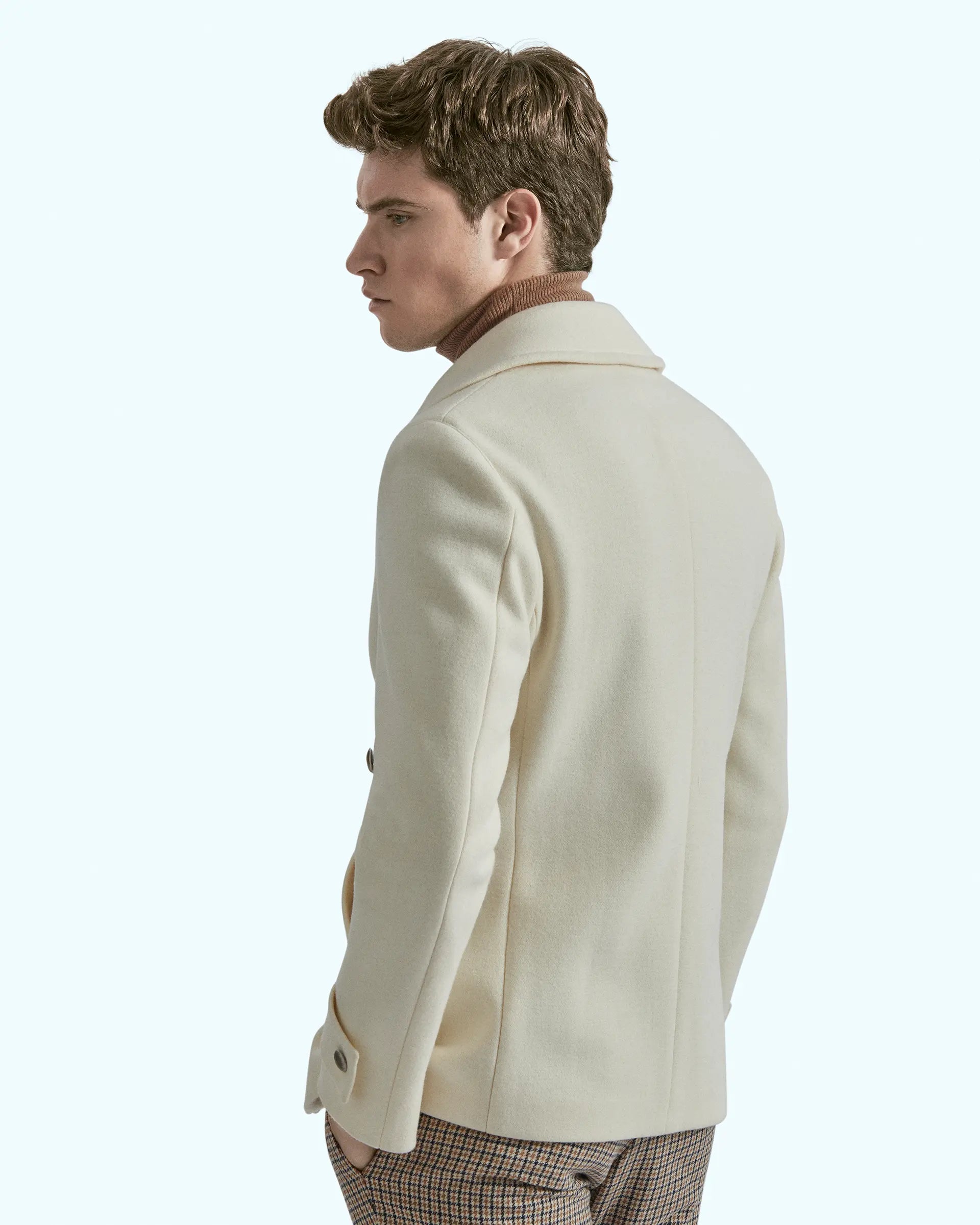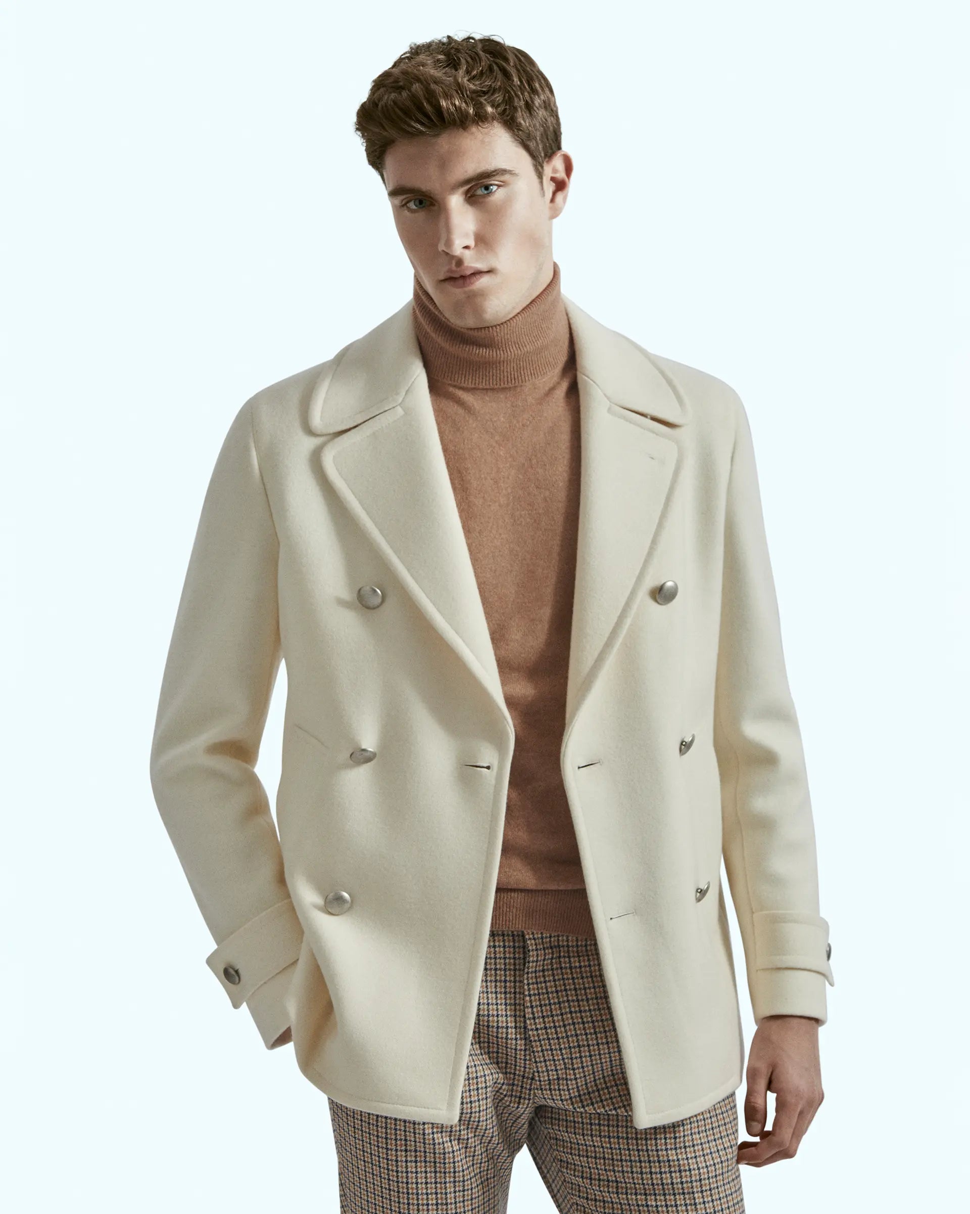 Double-breasted peacoat with a classic and timeless style. The warm and comfortable fabric is accompanied by lines inspired by traditional navy models. The wide lapels and metal buttons define the retro style of this garment which has now become an essential element for casual elegance.
