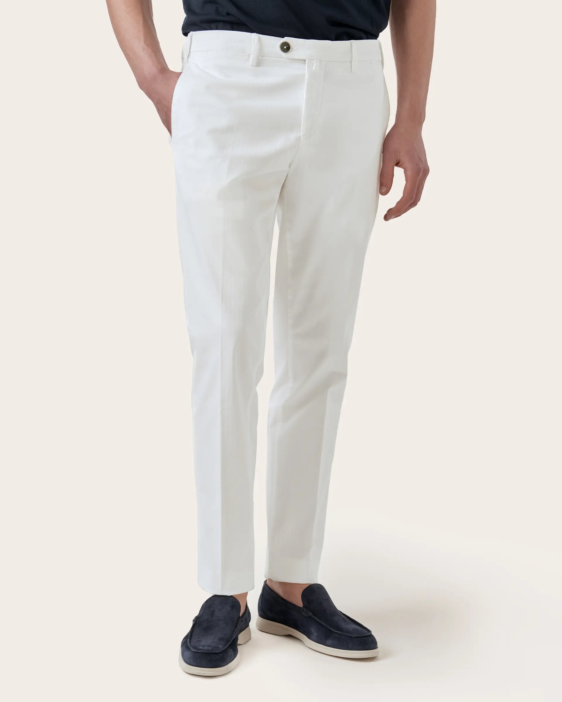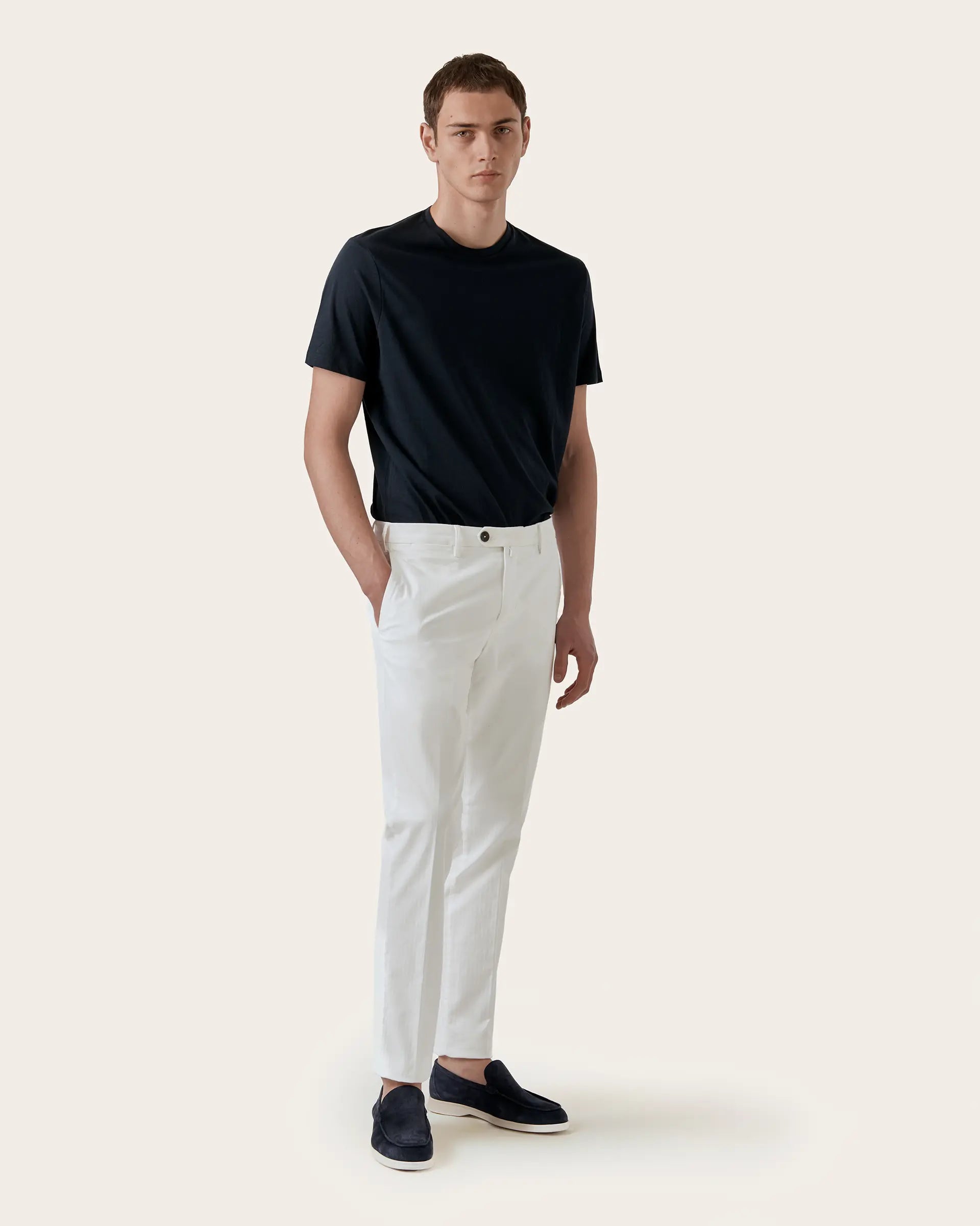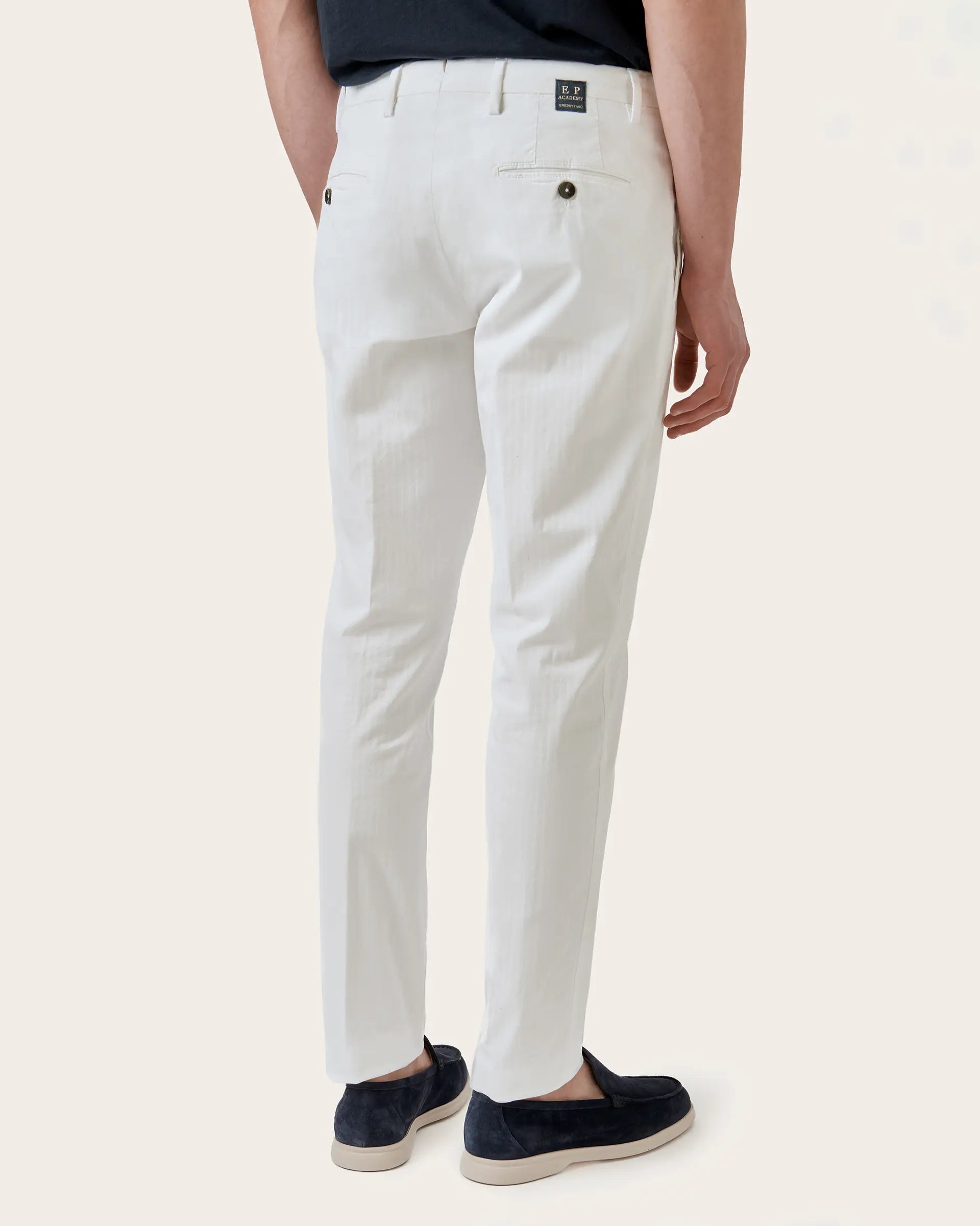 Chino trousers in stretch cotton herringbone, garment-dyed, featuring a texture with a delicate tone-on-tone design. A garment made of stretch cotton, to ensure that elegance and comfortable fit required by today's men's wardrobe. The garment dyeing adds a pleasant chromatic effect to a smart casual garment, enhancing your outfits with sobriety and elegance.
