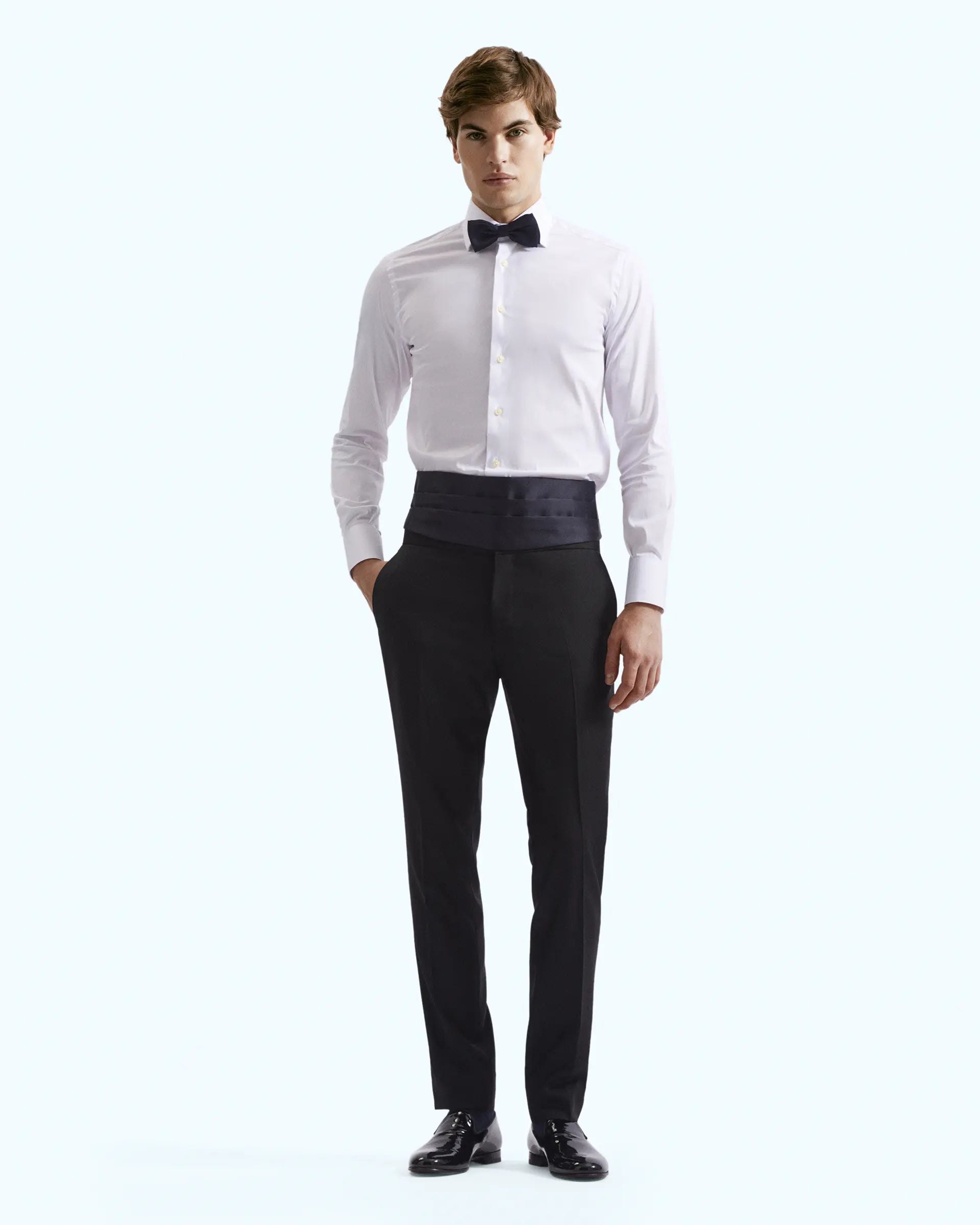 The jacquard silk satin sash is an essential complement to the formal dress. The fabric with a typical texture is presented in a medium size and with three pleats.