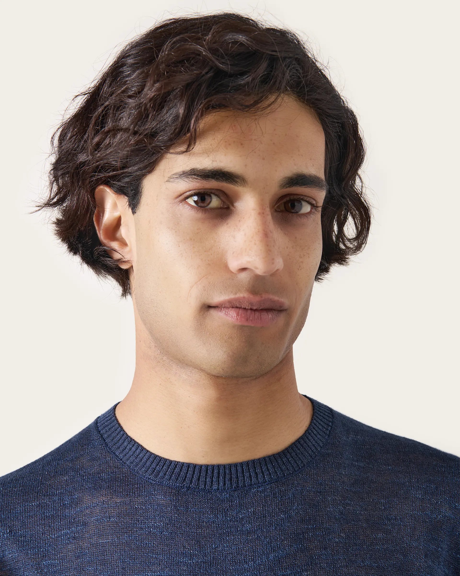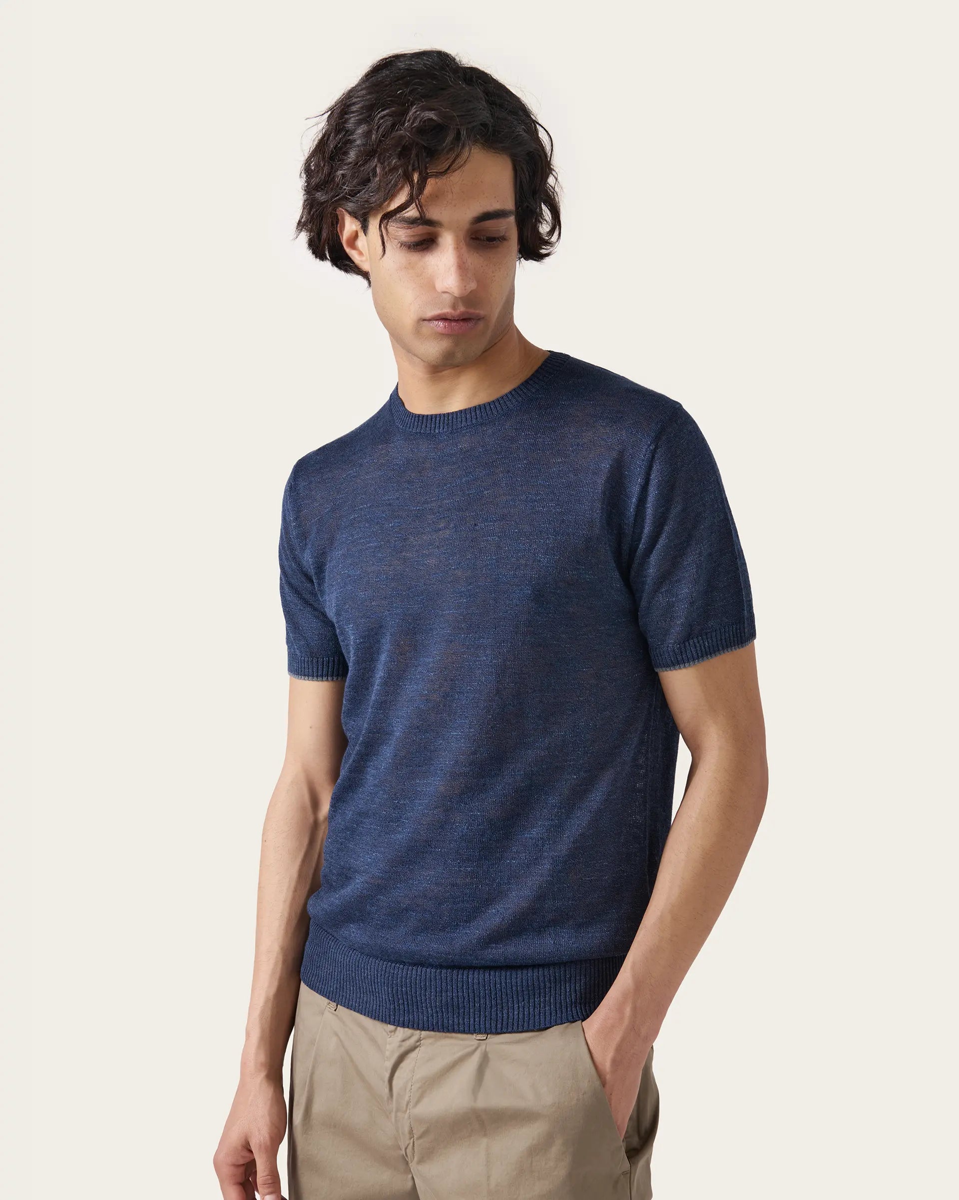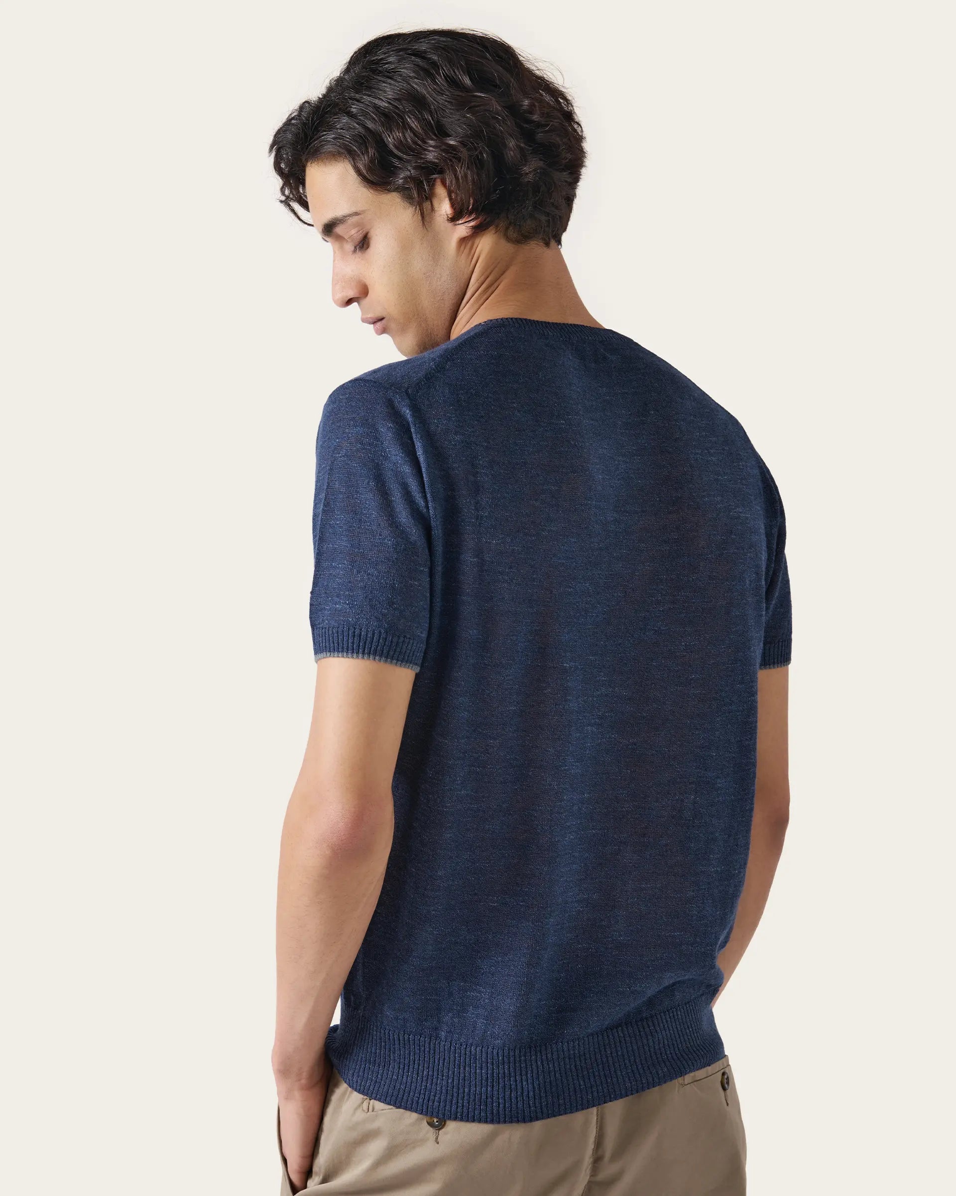 Short-sleeved sweater made with a fine blend of linen and extra-fine 14-gauge shaved cotton to guarantee a sensation of freshness perfect for summer days. The melange effect gives three-dimensionality to the garment while maintaining a classic elegance revisited in a contemporary key. To be worn under a jacket as an alternative to a shirt or alone with a pair of casual trousers.