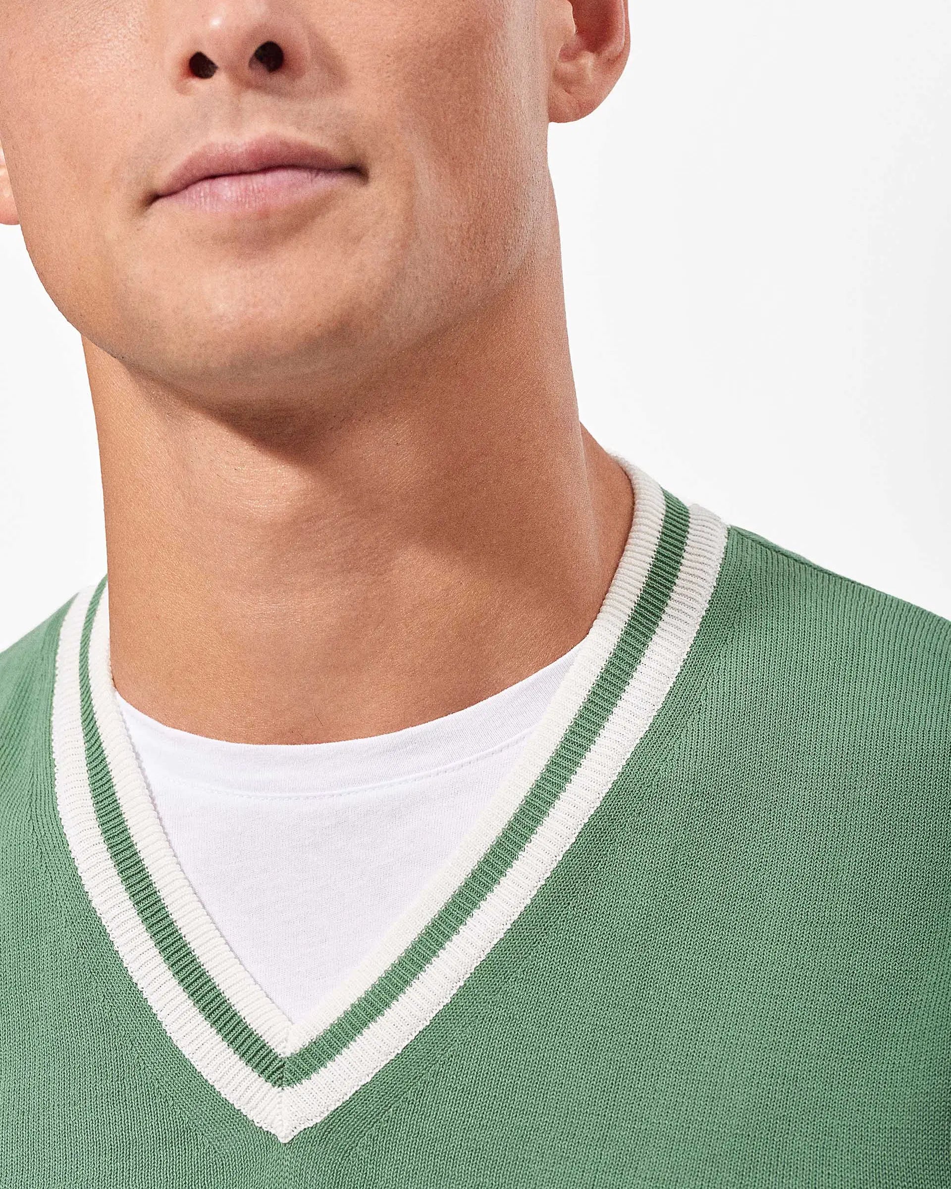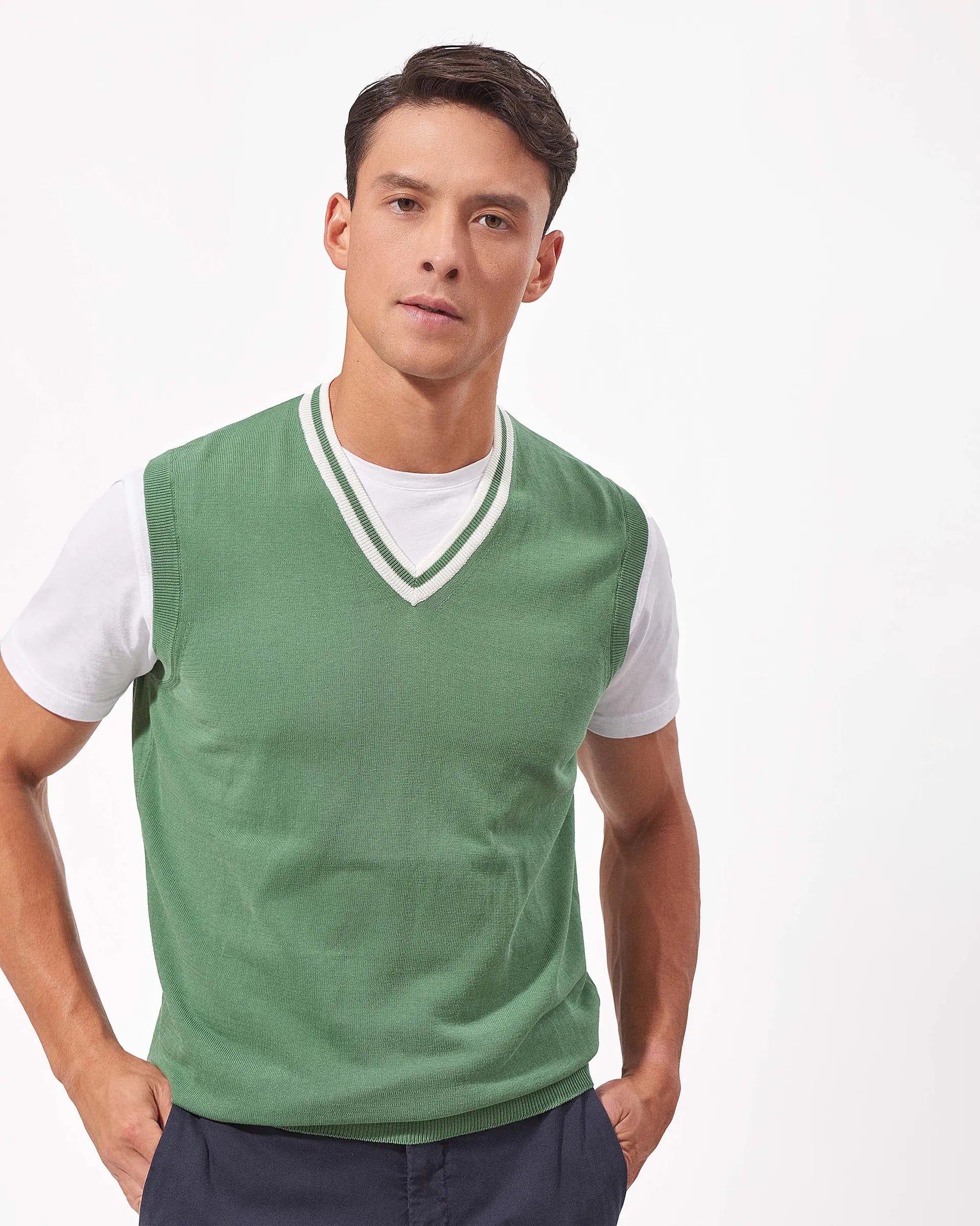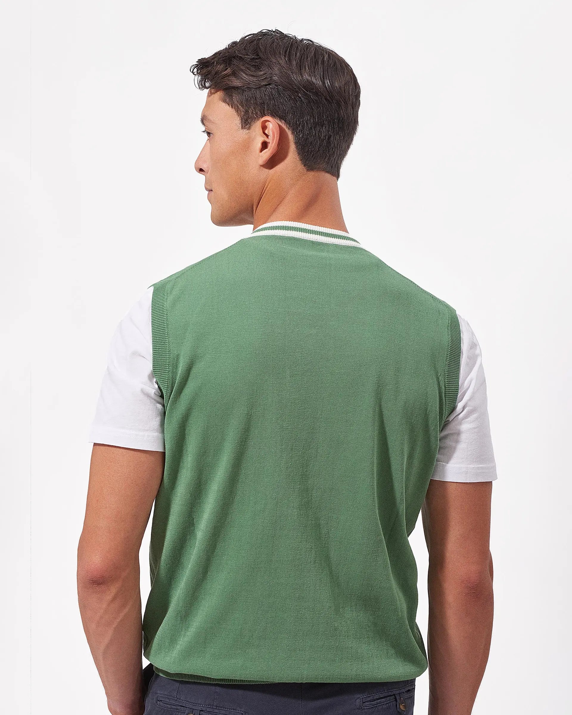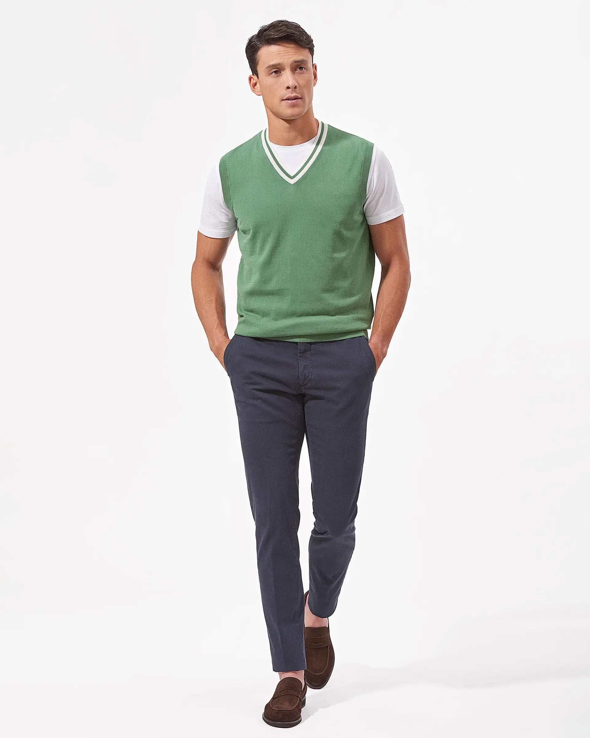 V-neck waistcoat made of pure extrafine cotton with 12 gauge workmanship. Reinforced edges and cannolè. A distinctive and contemporary garment, ideal for giving a refined touch to leisure outfits. Made in Italy.