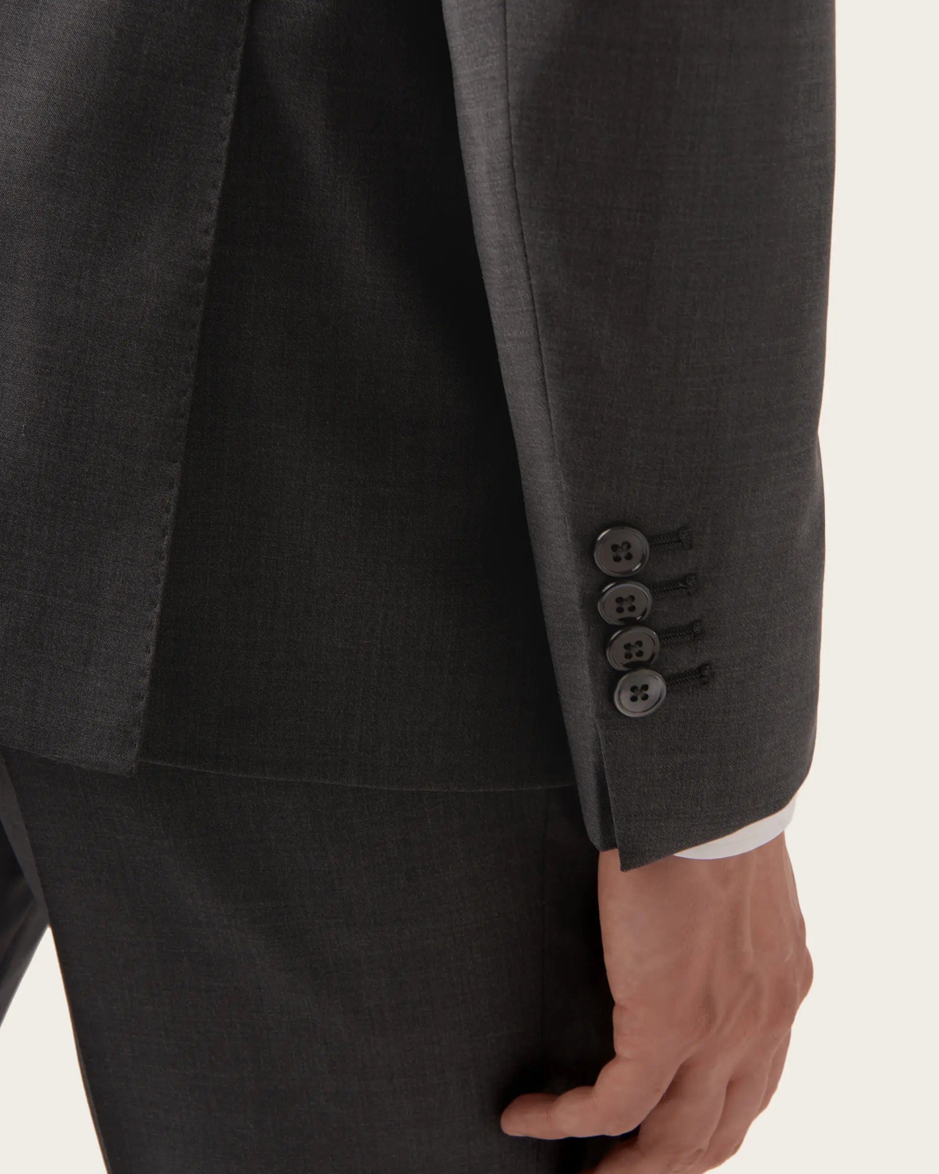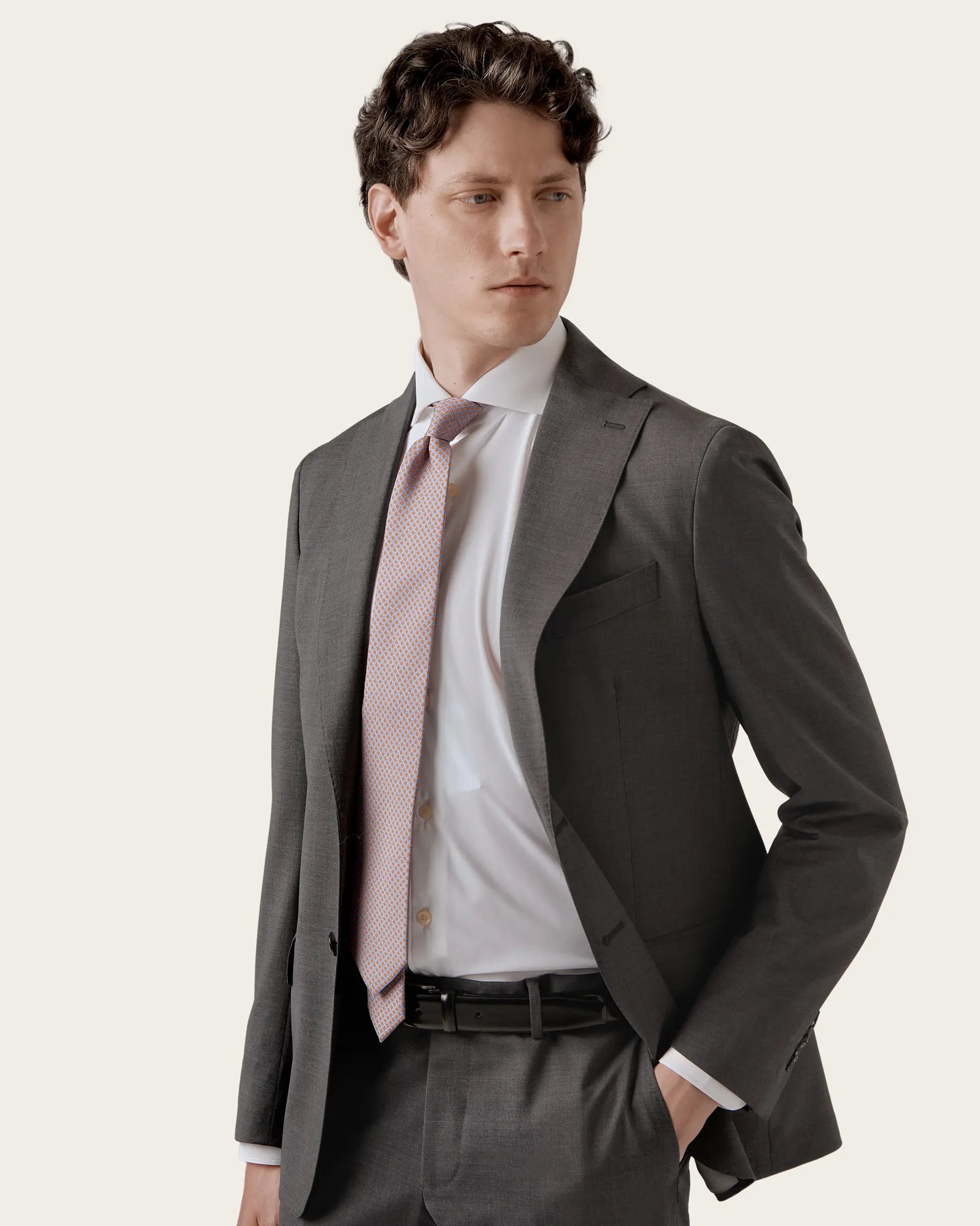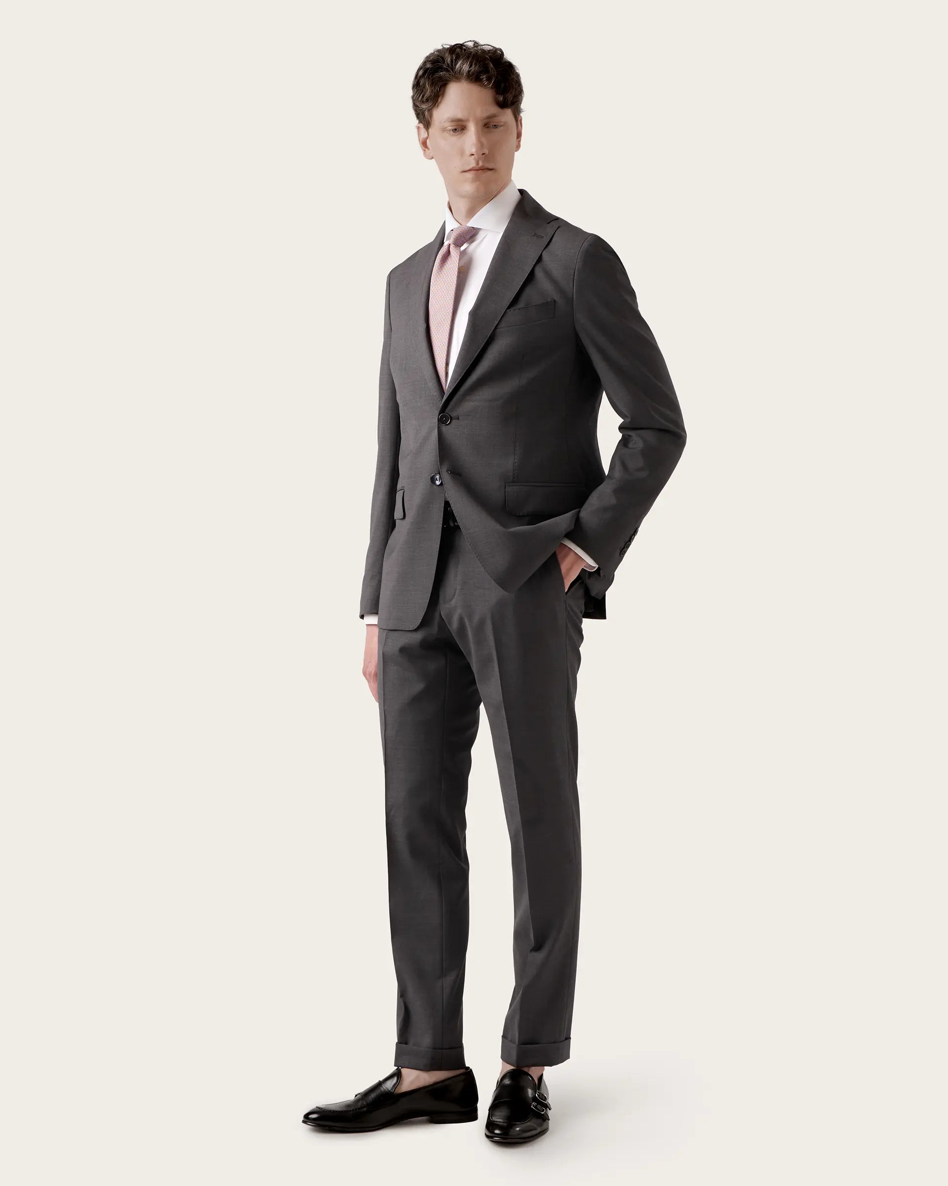 Suit with a strong sartorial accent, made in solid color with high-end "super 100" fabric that expresses the best of the Italian textile tradition with the desire to renew the classic culture of formal wear through refined textures and technical solutions that guarantee an impeccable fit. The lined jacket, combined with pleated trousers, gives life to a perfect balance of shapes and volumes. The finishing details complete an extremely versatile and exclusive suit.