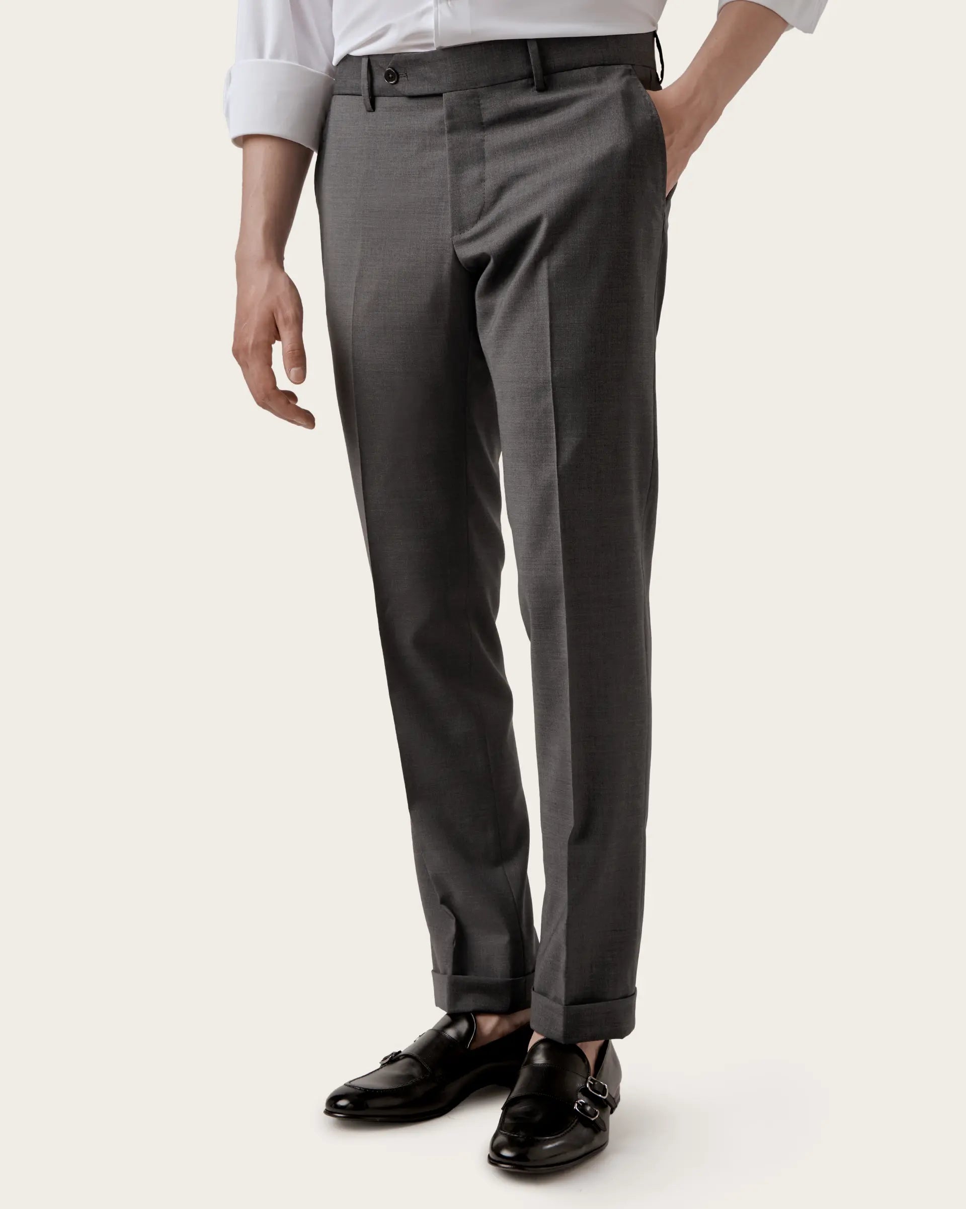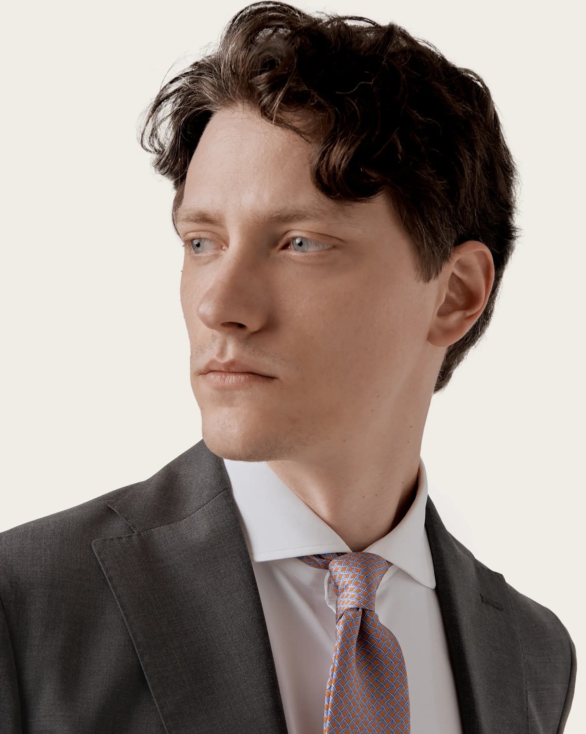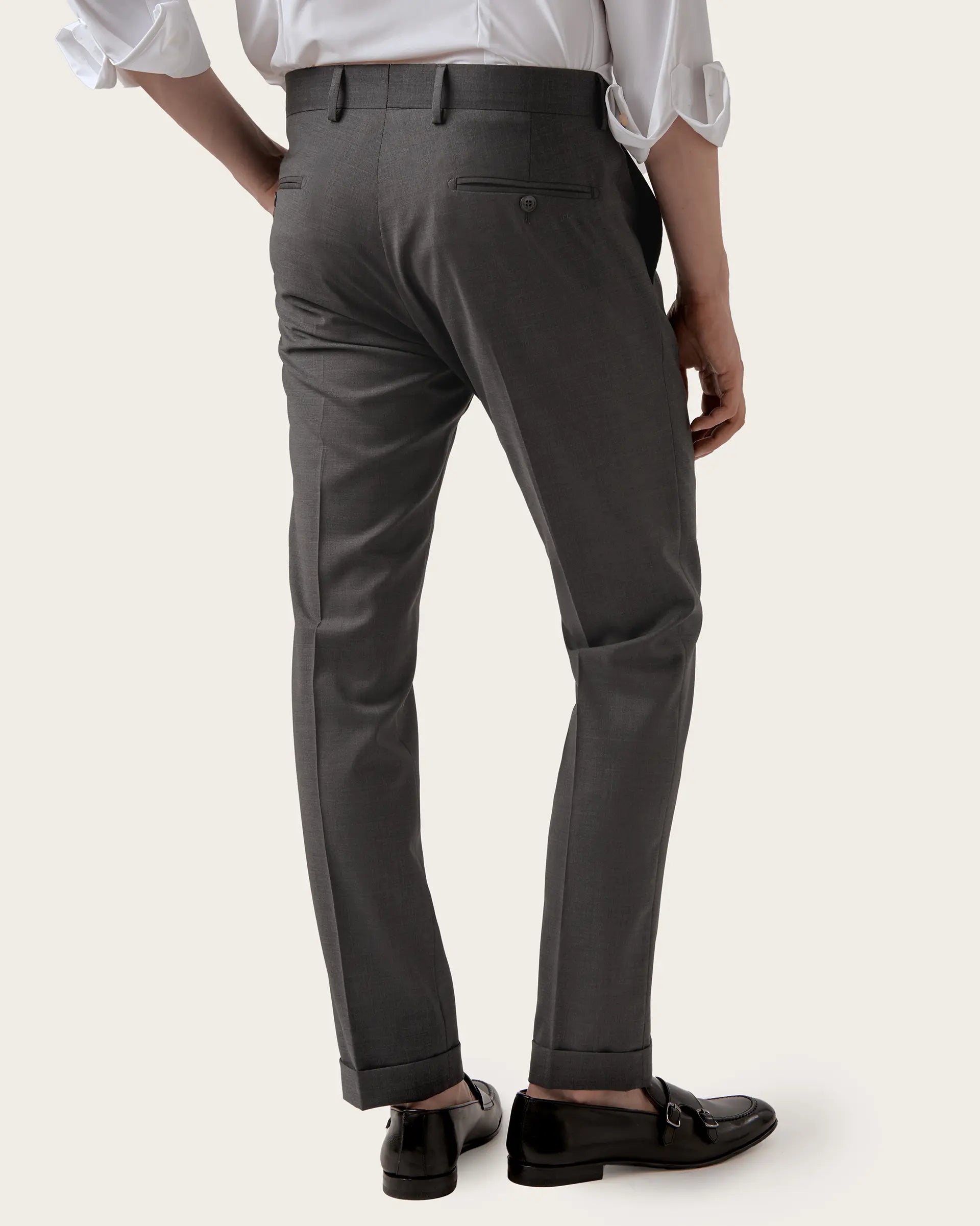 Suit with a strong sartorial accent, made in solid color with high-end "super 100" fabric that expresses the best of the Italian textile tradition with the desire to renew the classic culture of formal wear through refined textures and technical solutions that guarantee an impeccable fit. The lined jacket, combined with pleated trousers, gives life to a perfect balance of shapes and volumes. The finishing details complete an extremely versatile and exclusive suit.