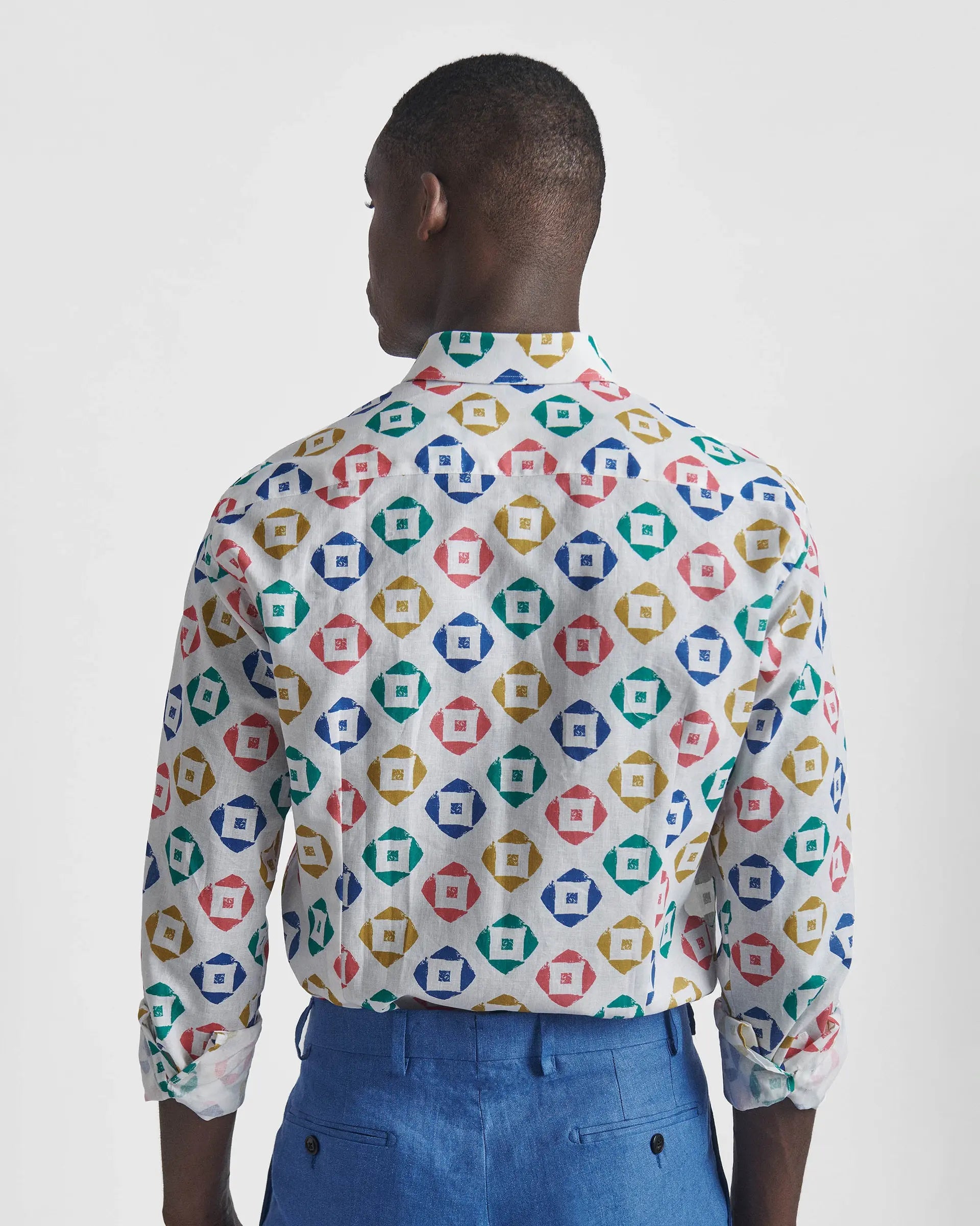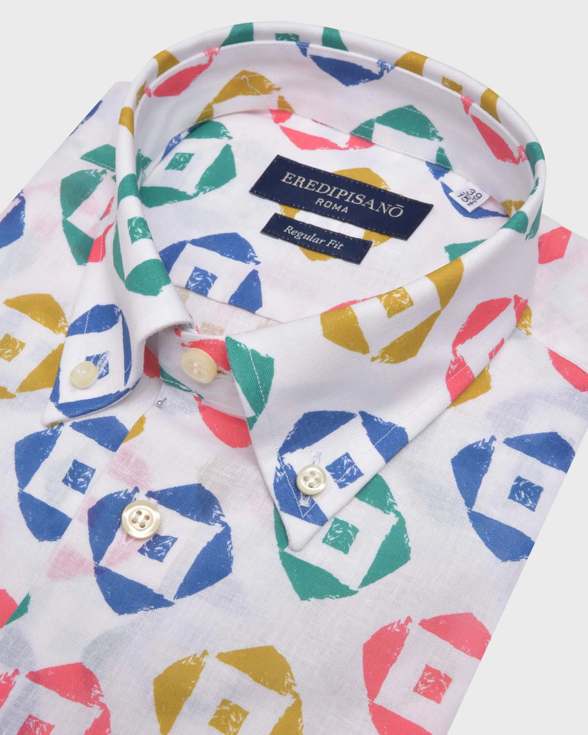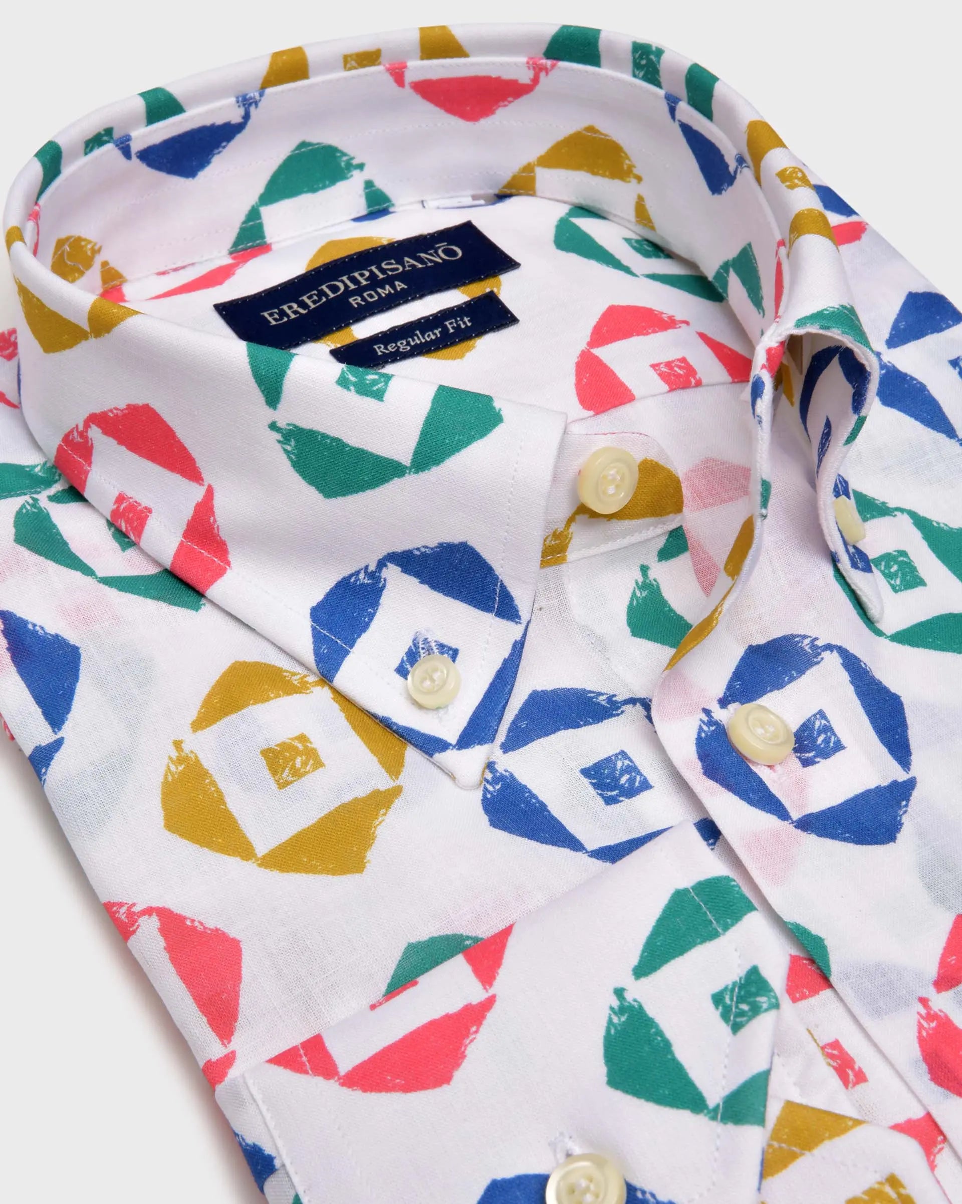 Camisa estampada de lino y algodón, corte regular, cuello abotonado