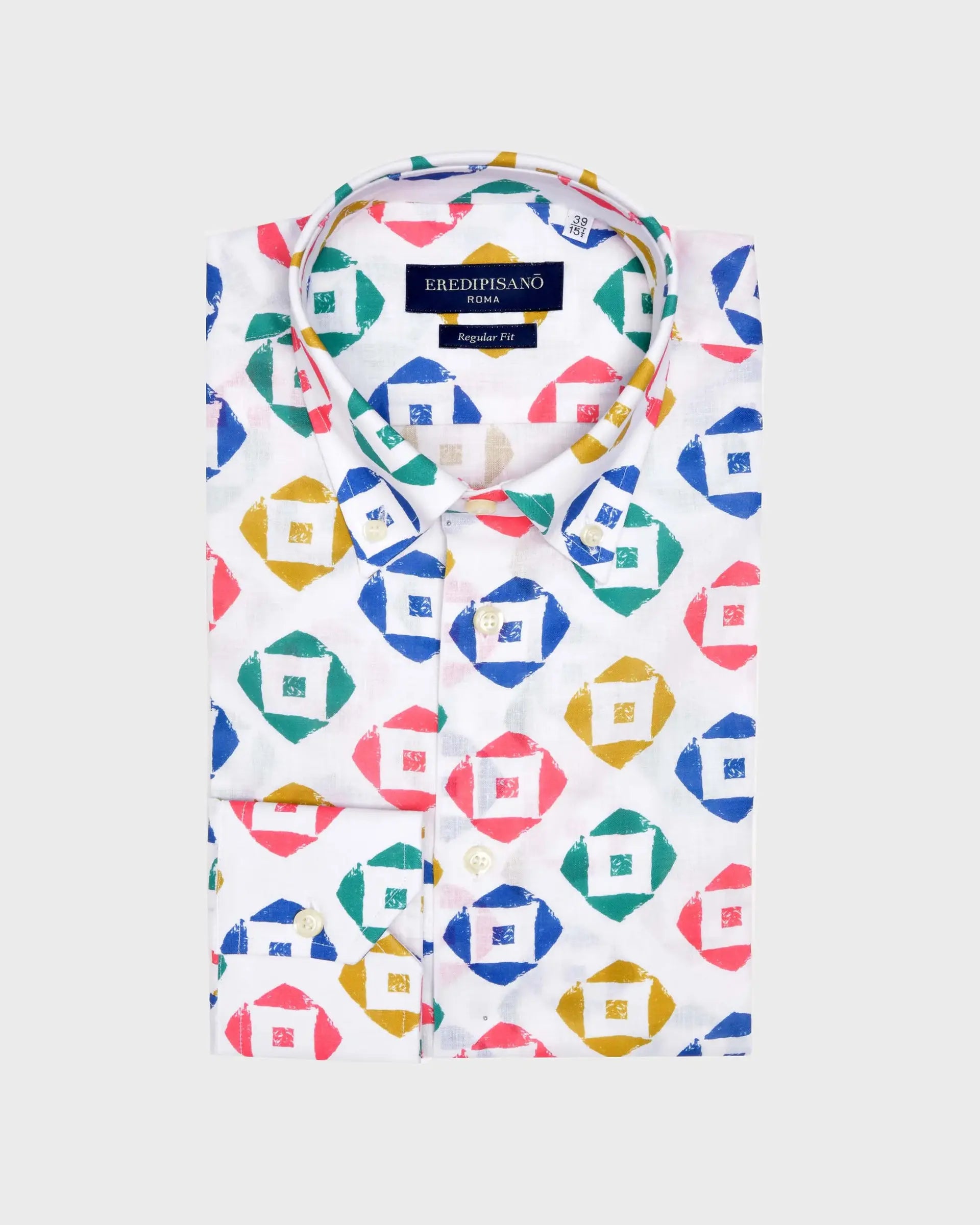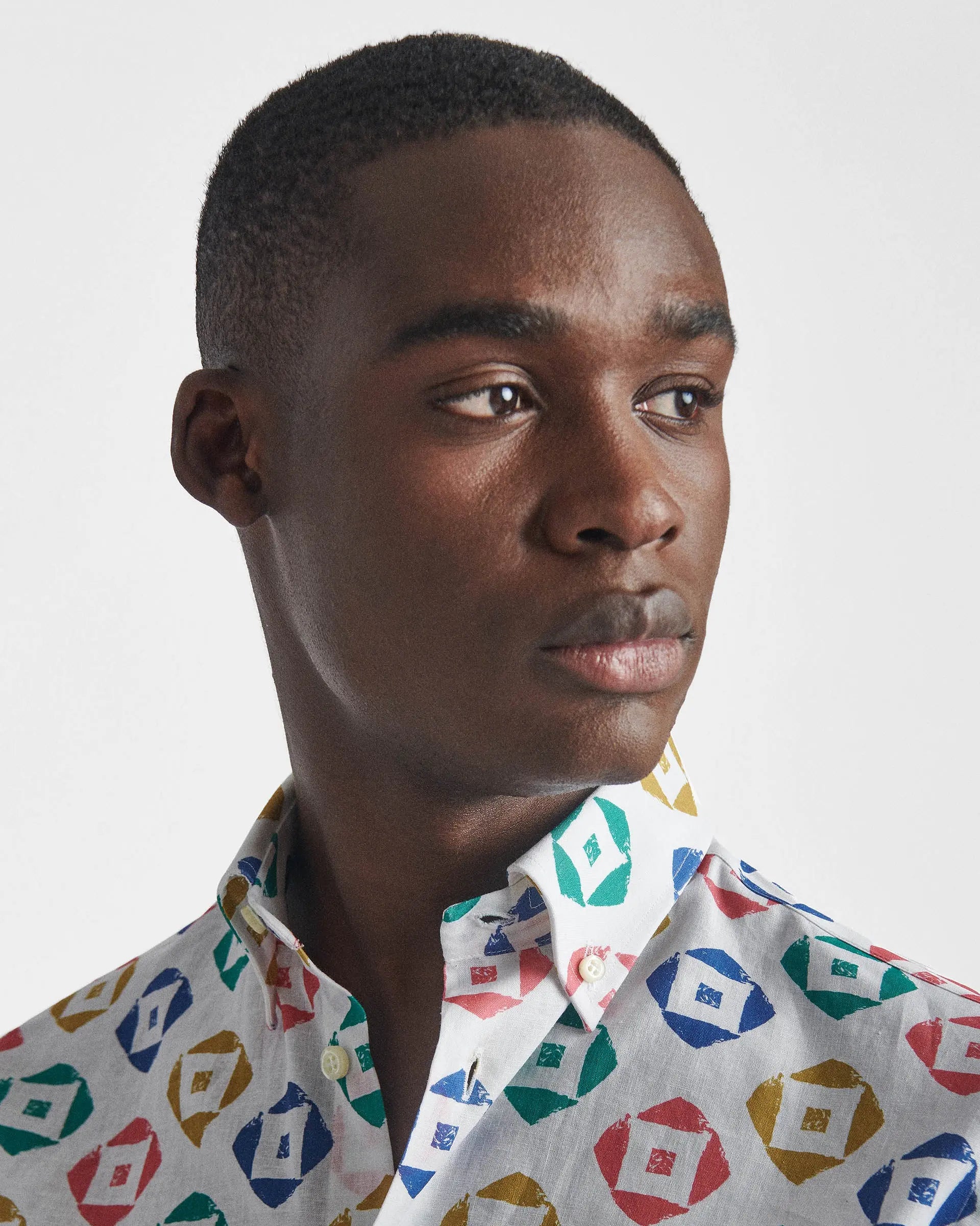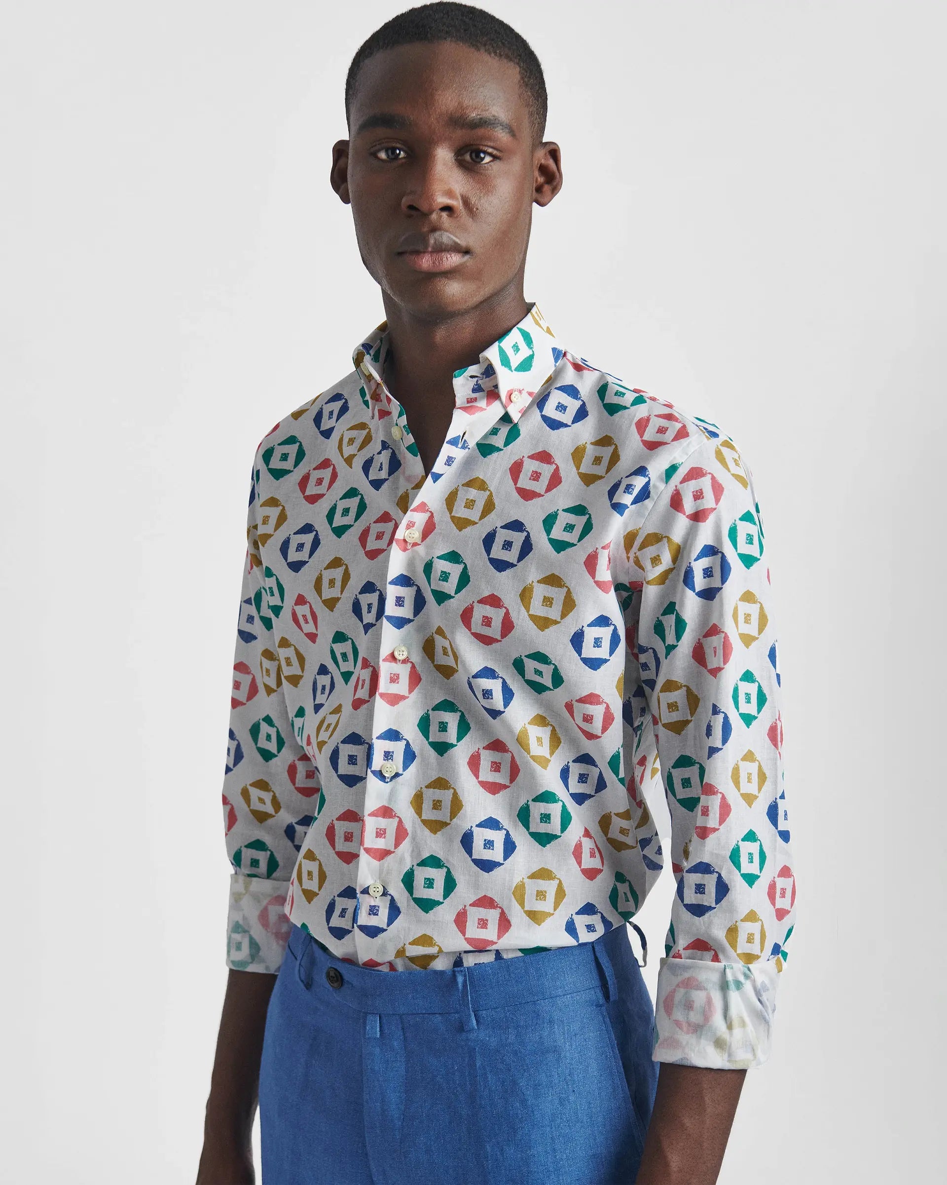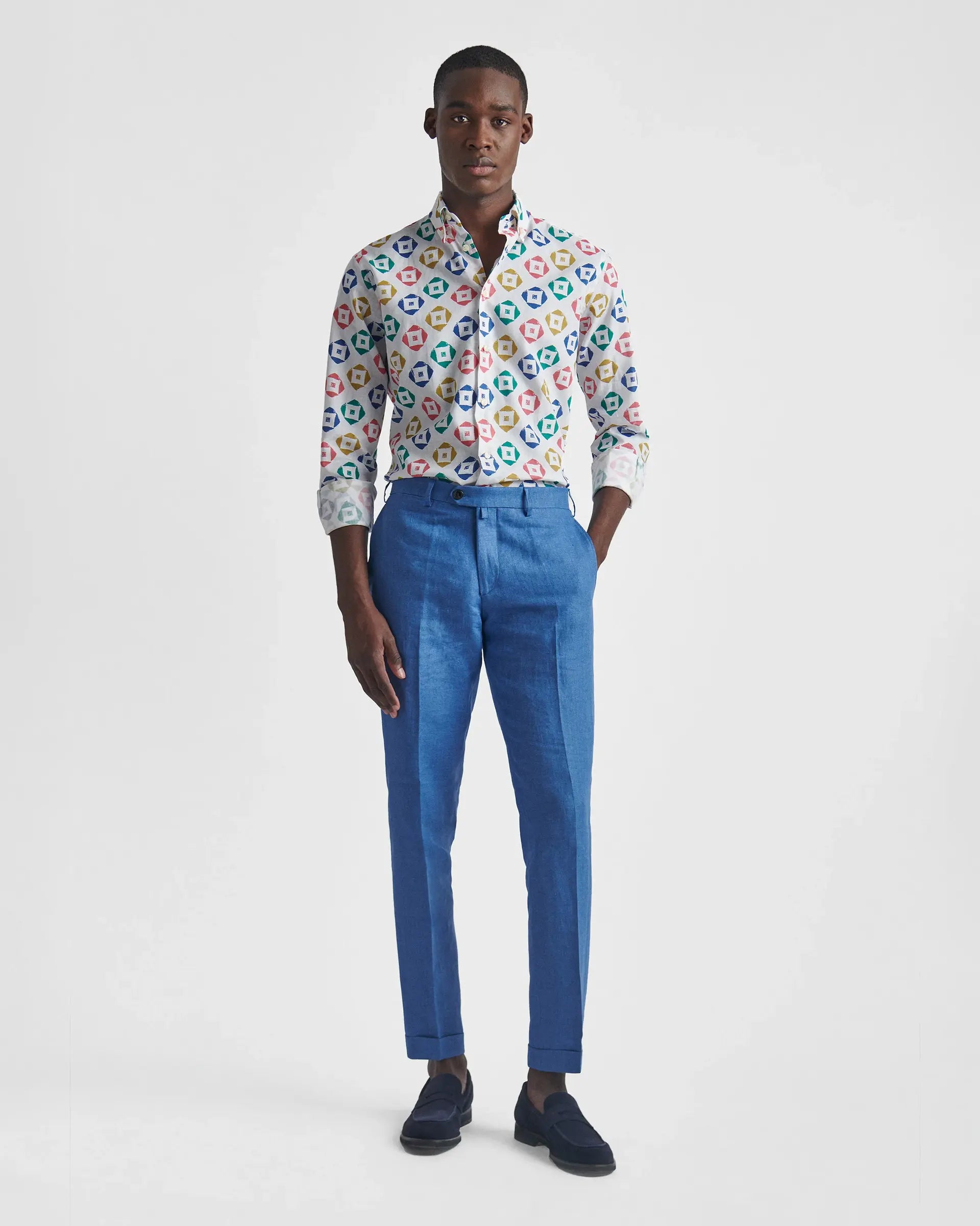 Camisa estampada de lino y algodón, corte regular, cuello abotonado