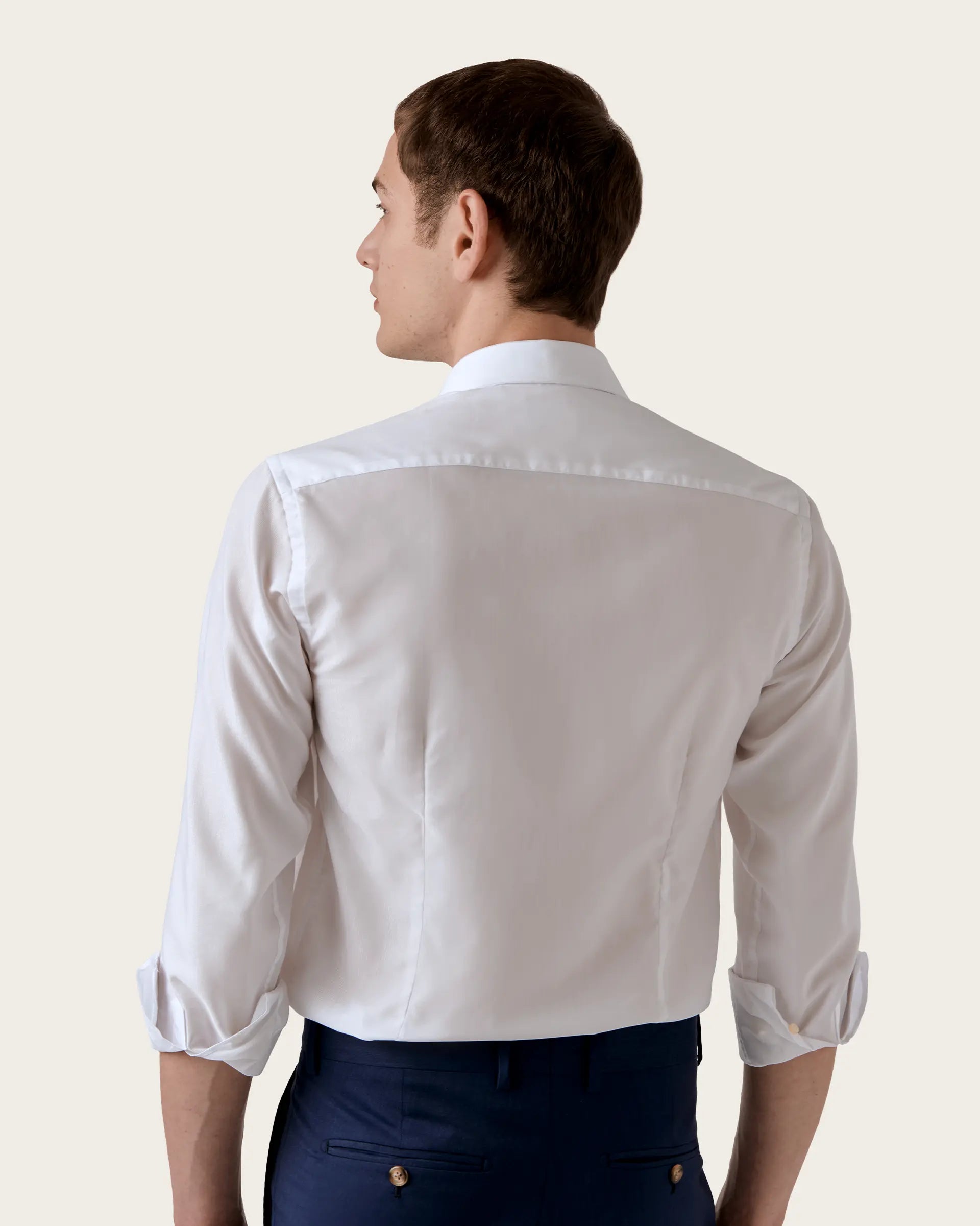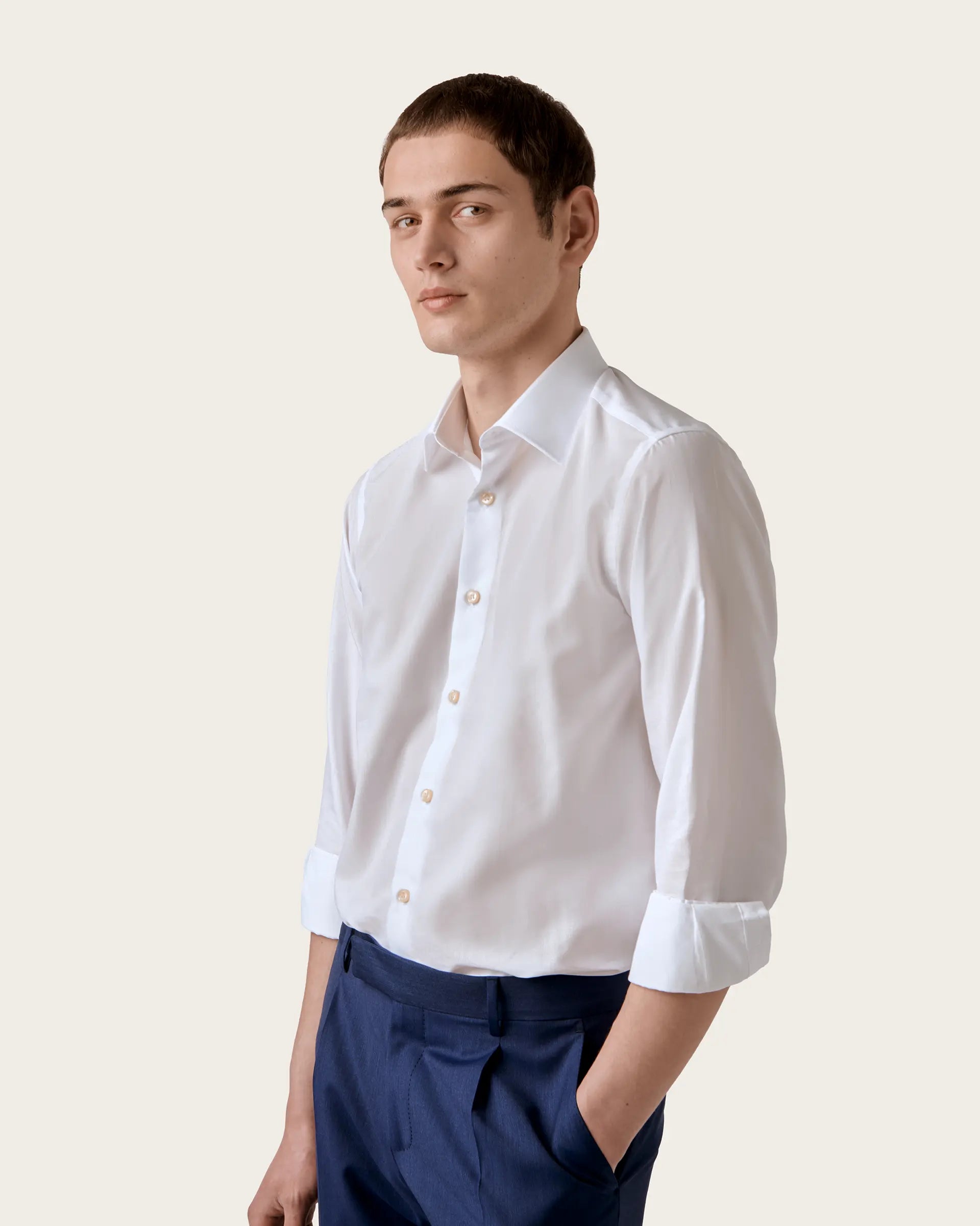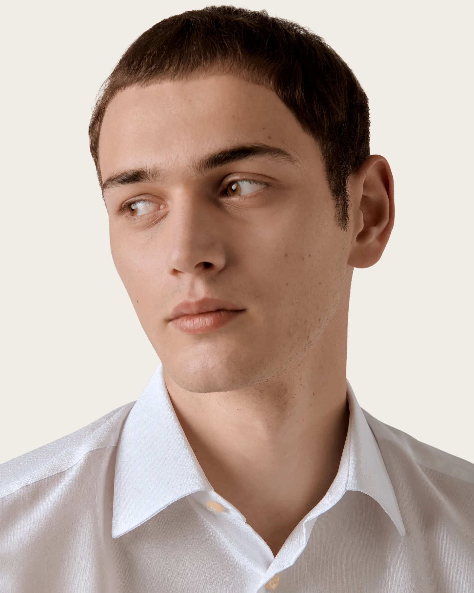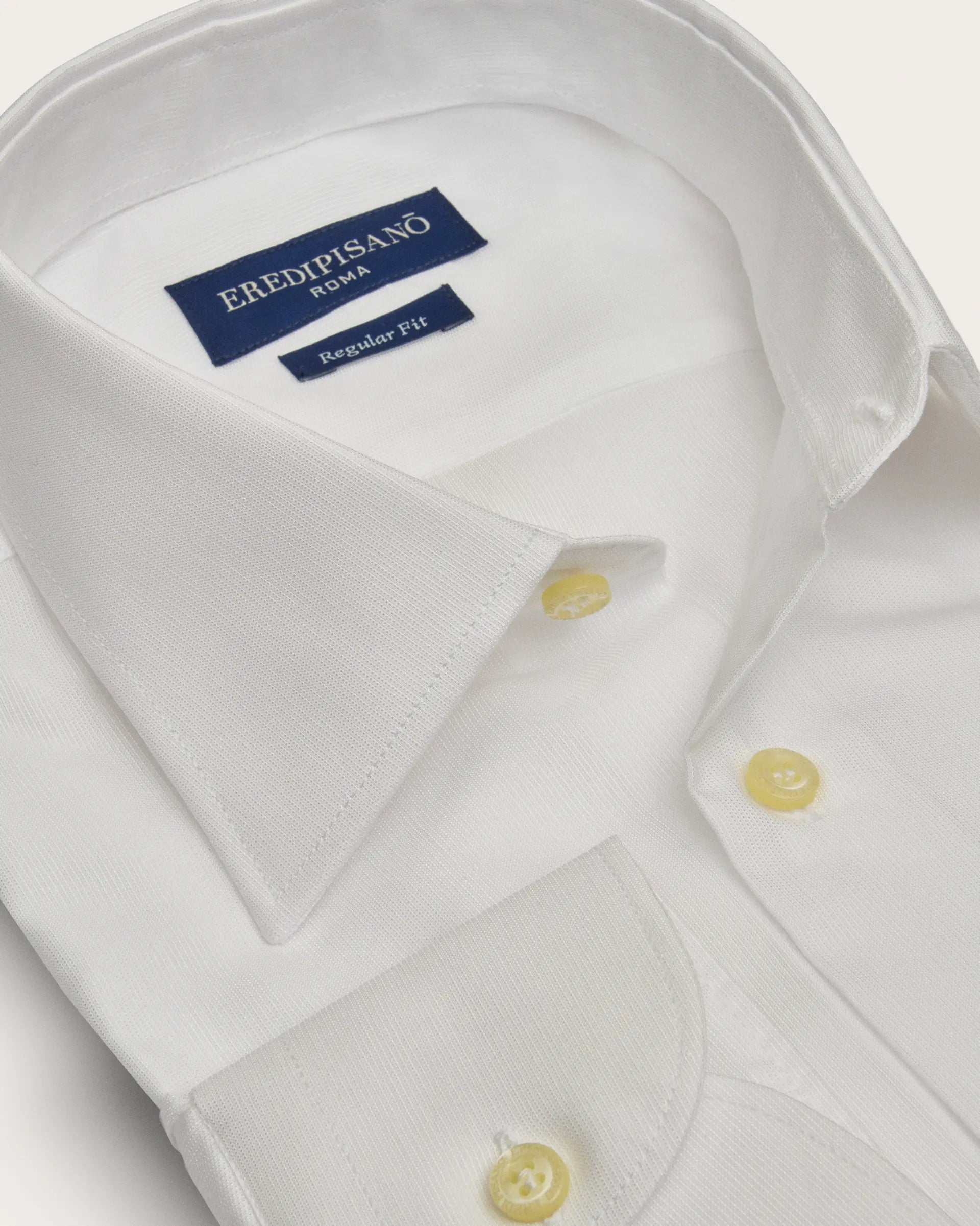 Tailored shirt made of pure double twisted cotton with a renewed Italian collar, a great classic presented in an updated version suitable for more formal occasions but also for everyday life. It is proposed in the comfortable regular fit in a fine blend of cotton and viscose to guarantee comfort and lightness on special occasions