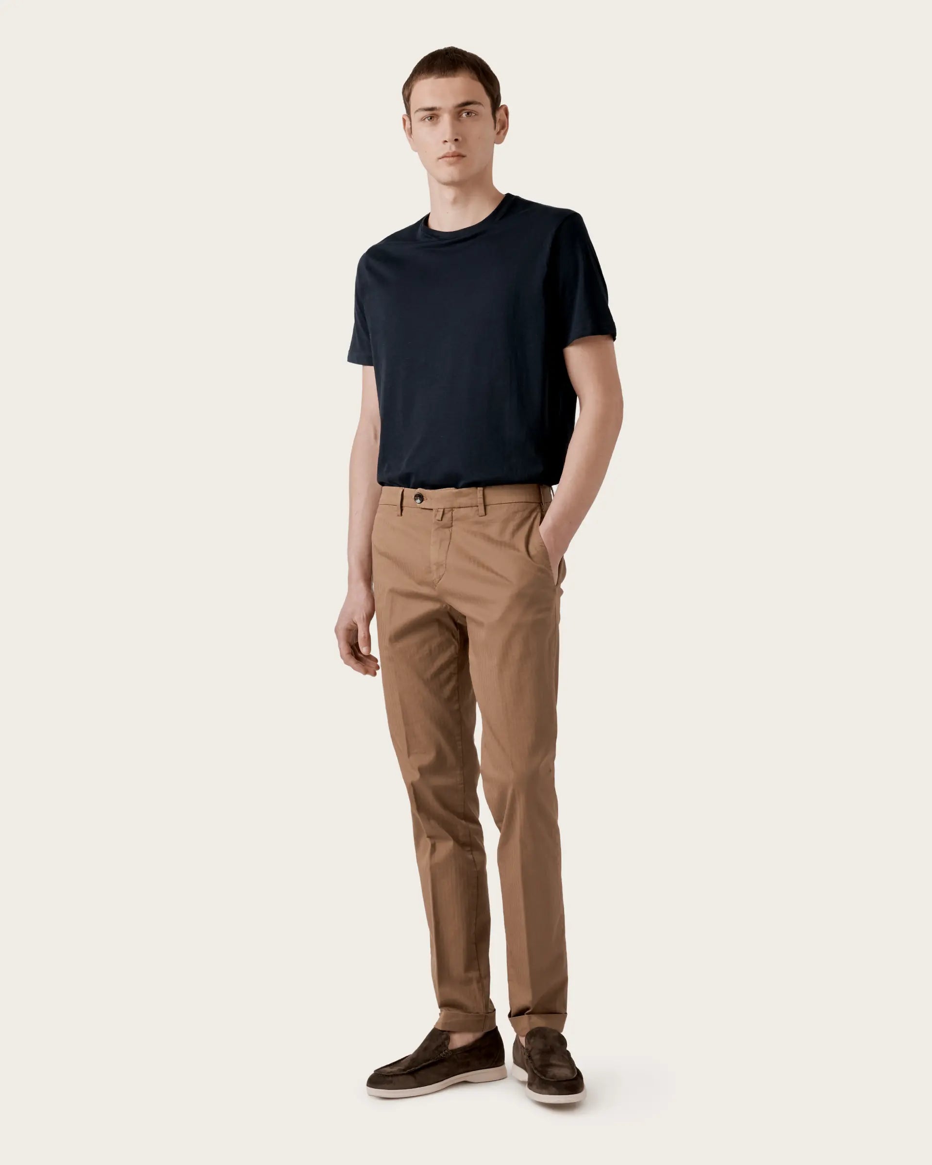 Chino trousers in stretch cotton herringbone, garment-dyed, featuring a texture with a delicate tone-on-tone design. A garment made of stretch cotton, to ensure that elegance and comfortable fit required by today's men's wardrobe. The garment dyeing adds a pleasant chromatic effect to a smart casual garment, enhancing your outfits with sobriety and elegance.