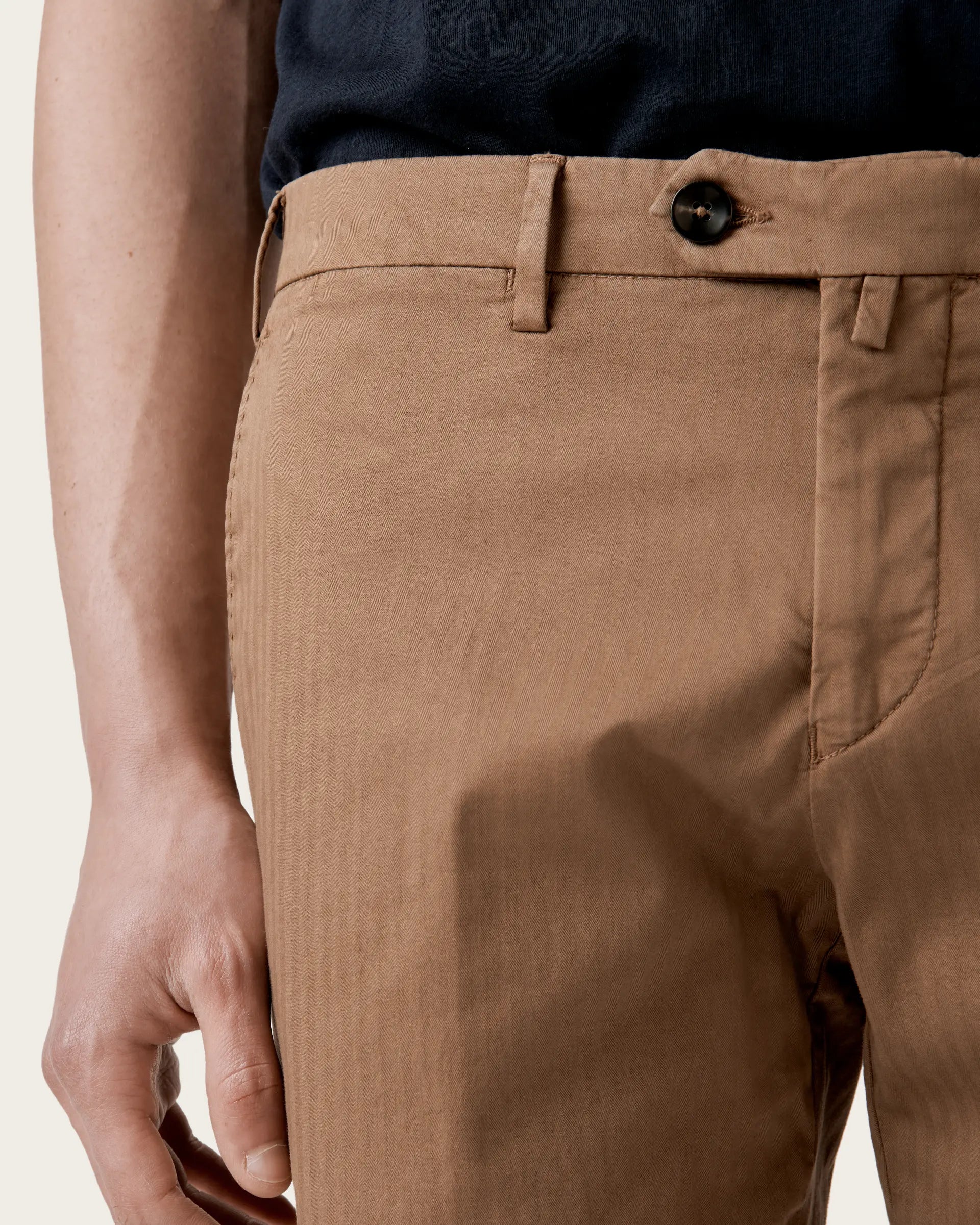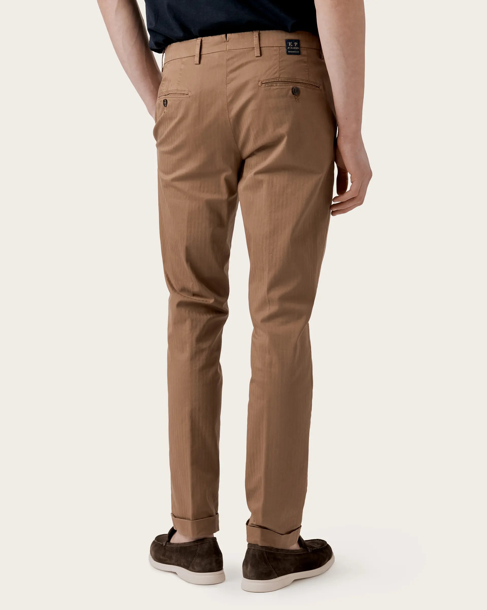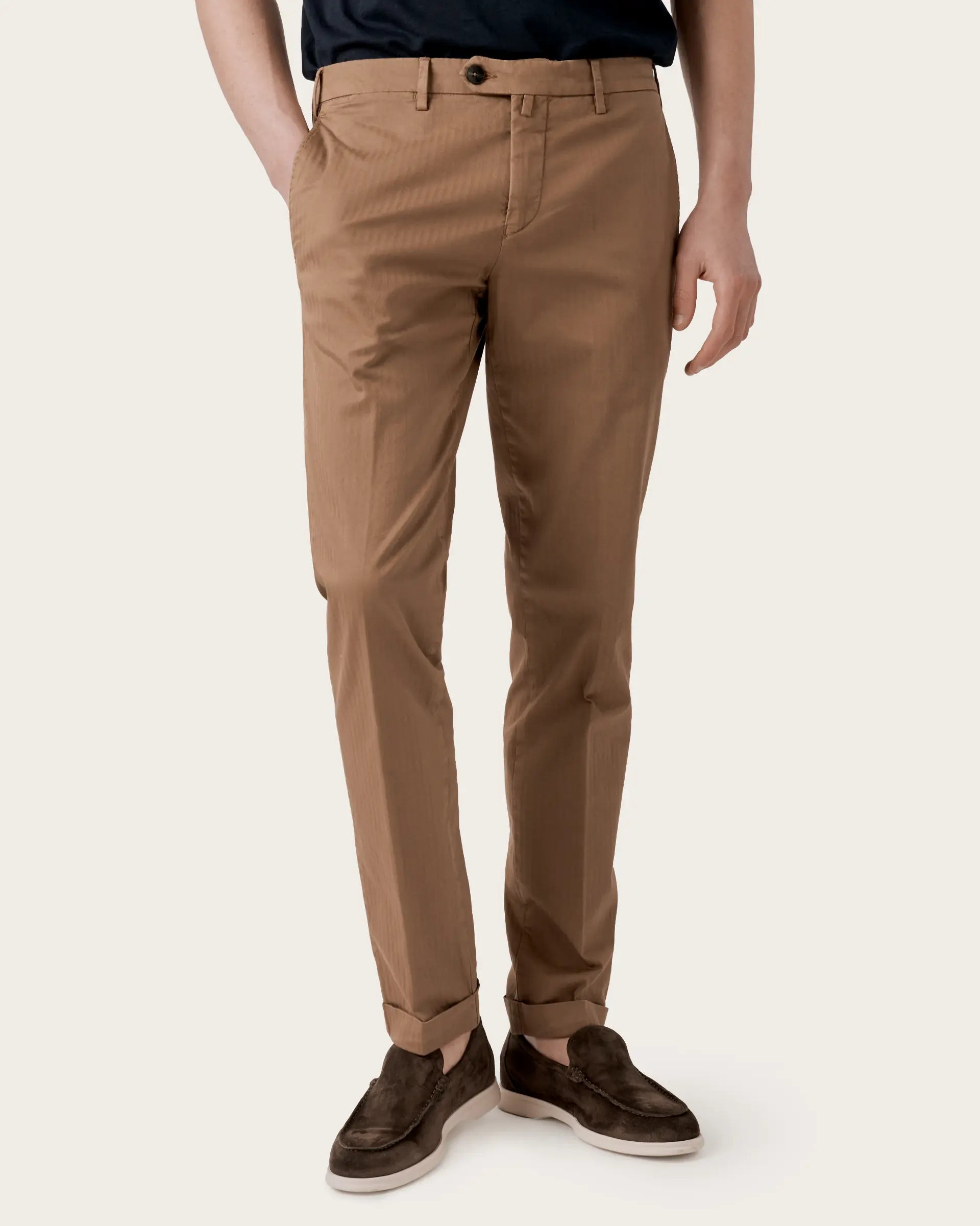 Hazelnut trousers with micro herringbone pattern in stretch cotton, garment dyed