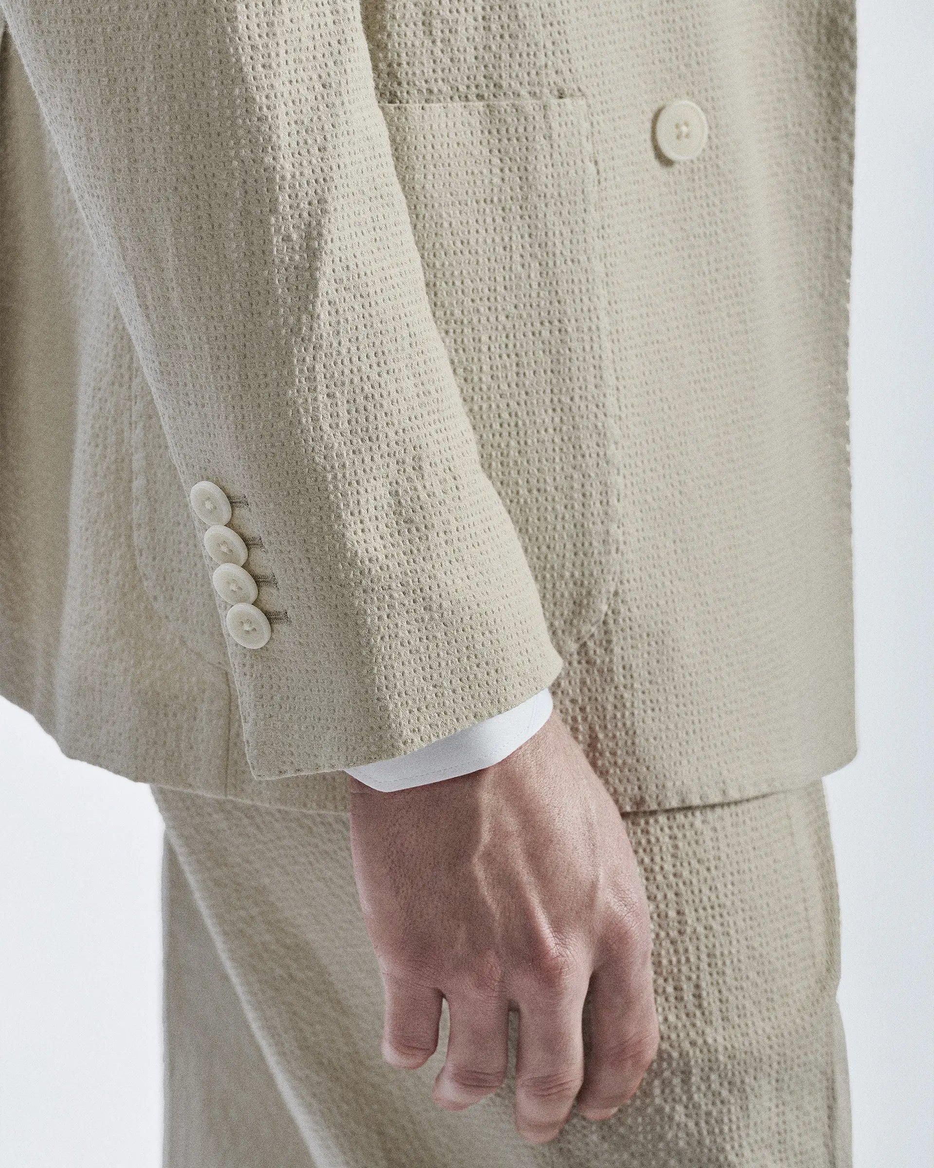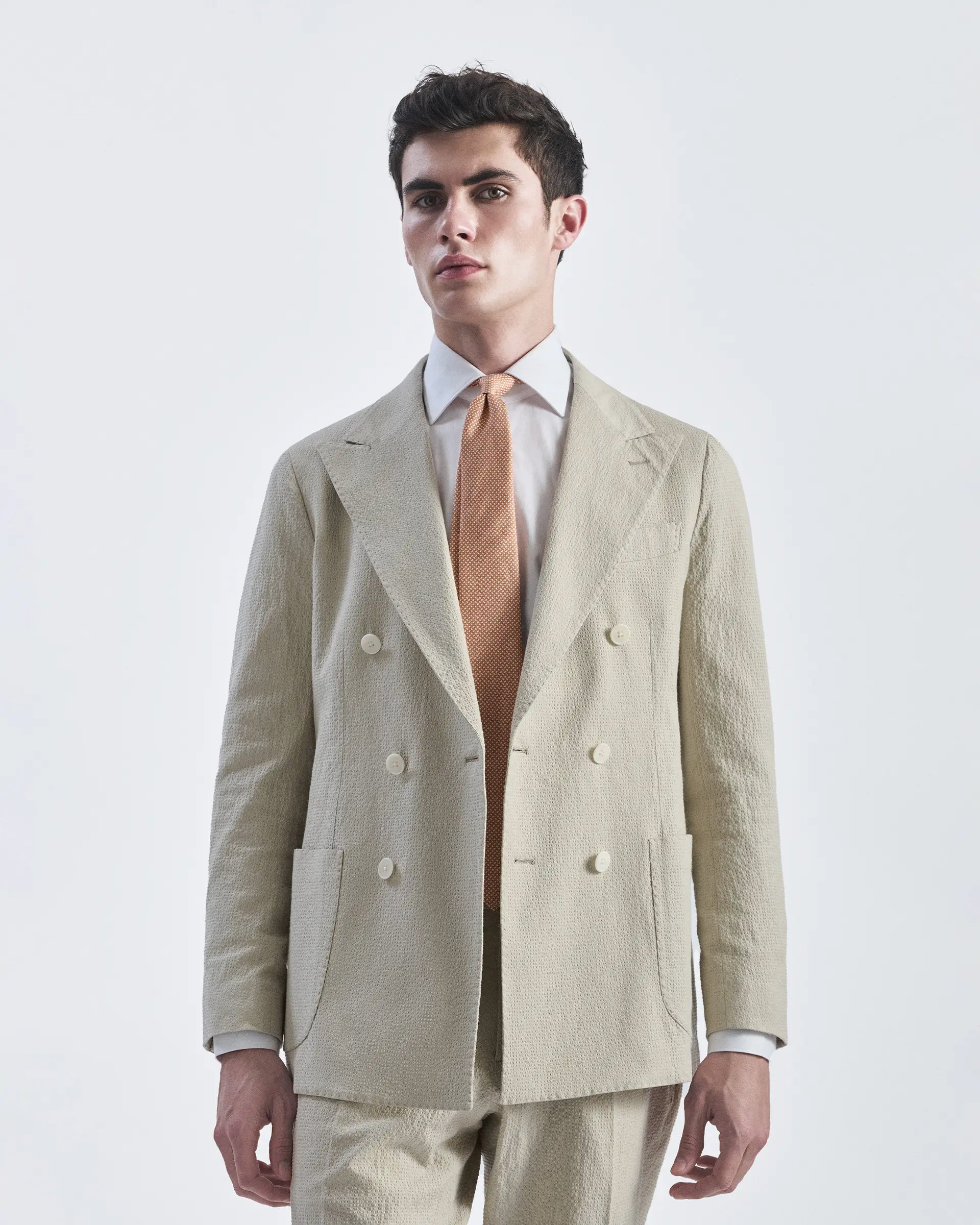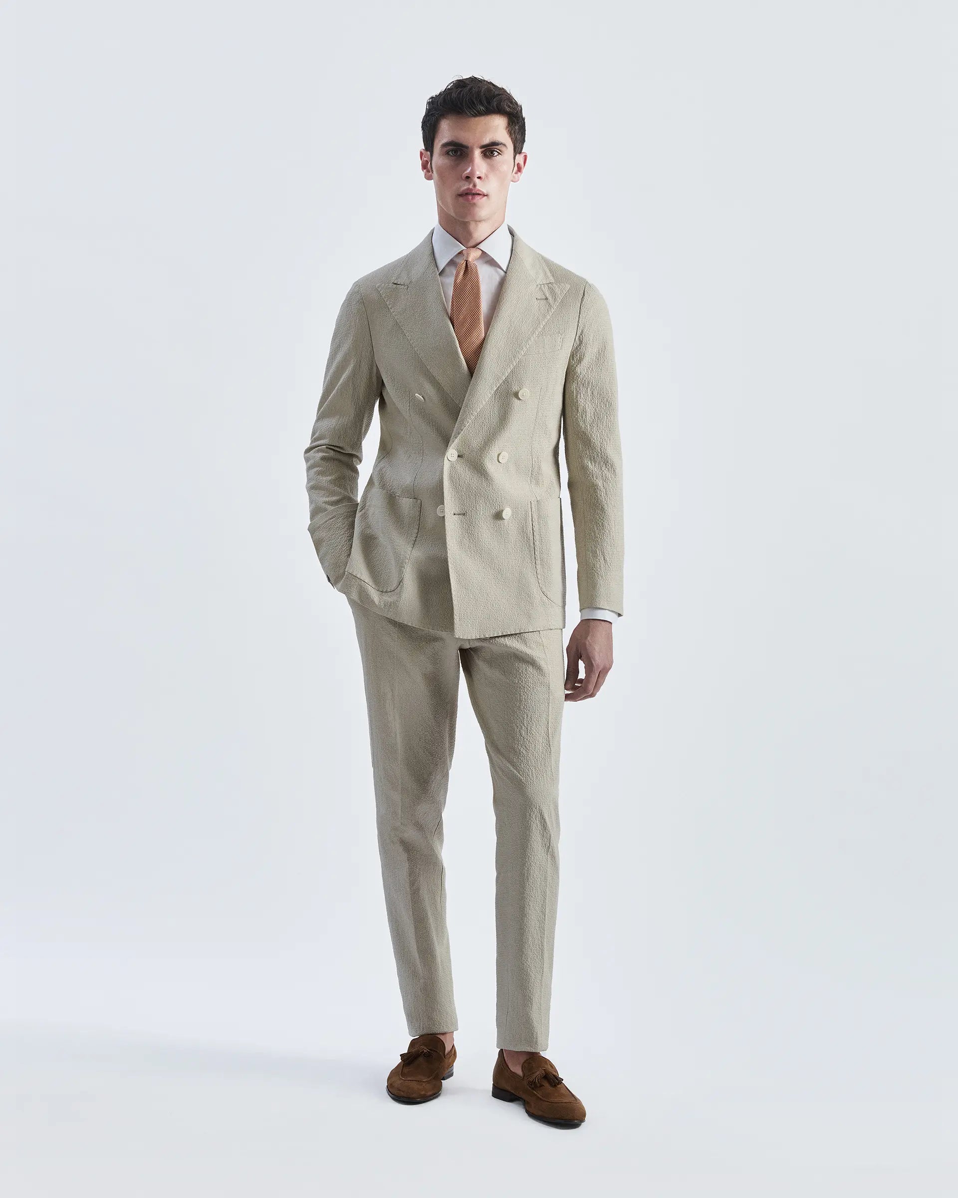 Traje cruzado beige en tejido seersucker de algodón y lino Subalpino