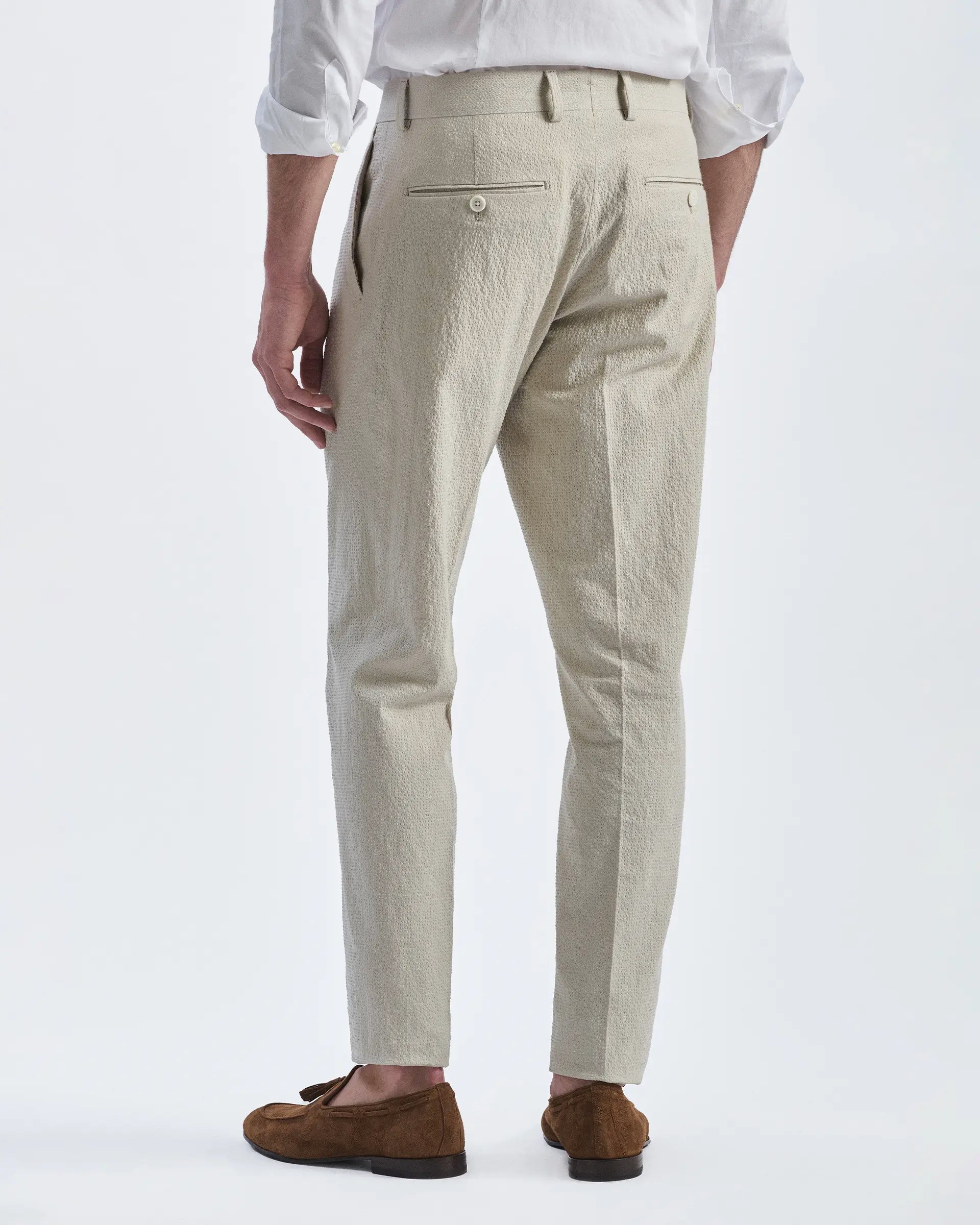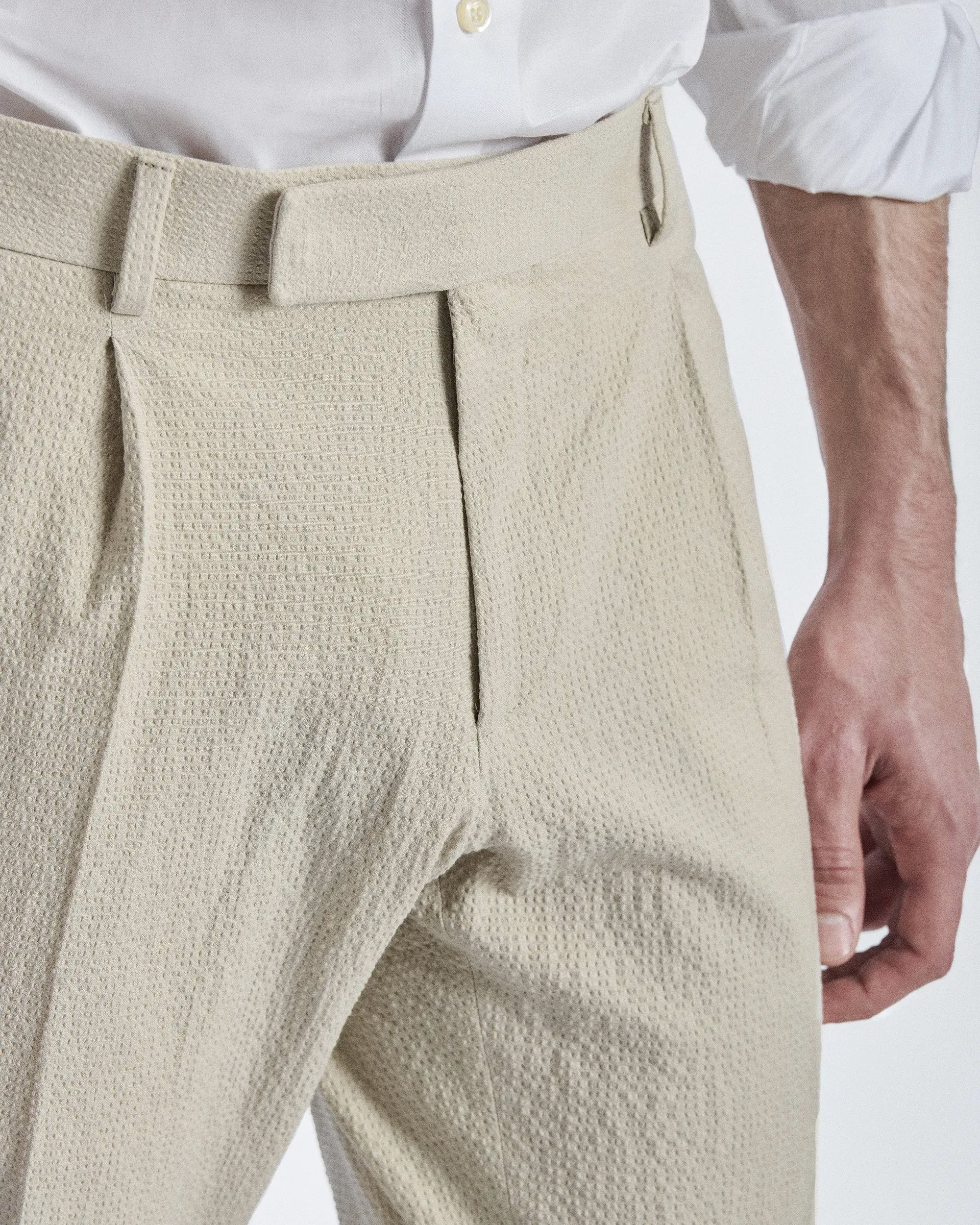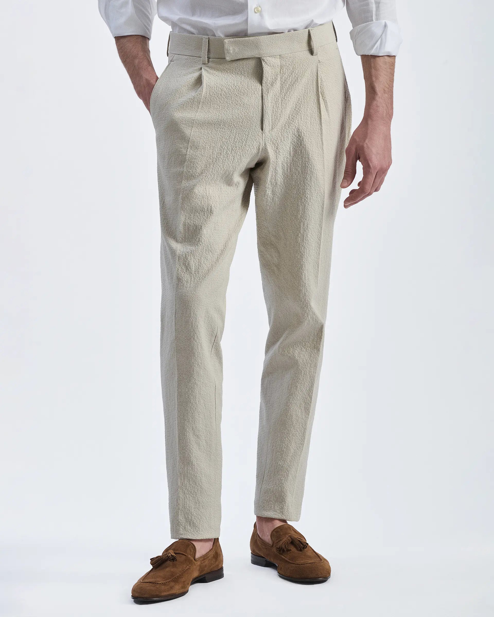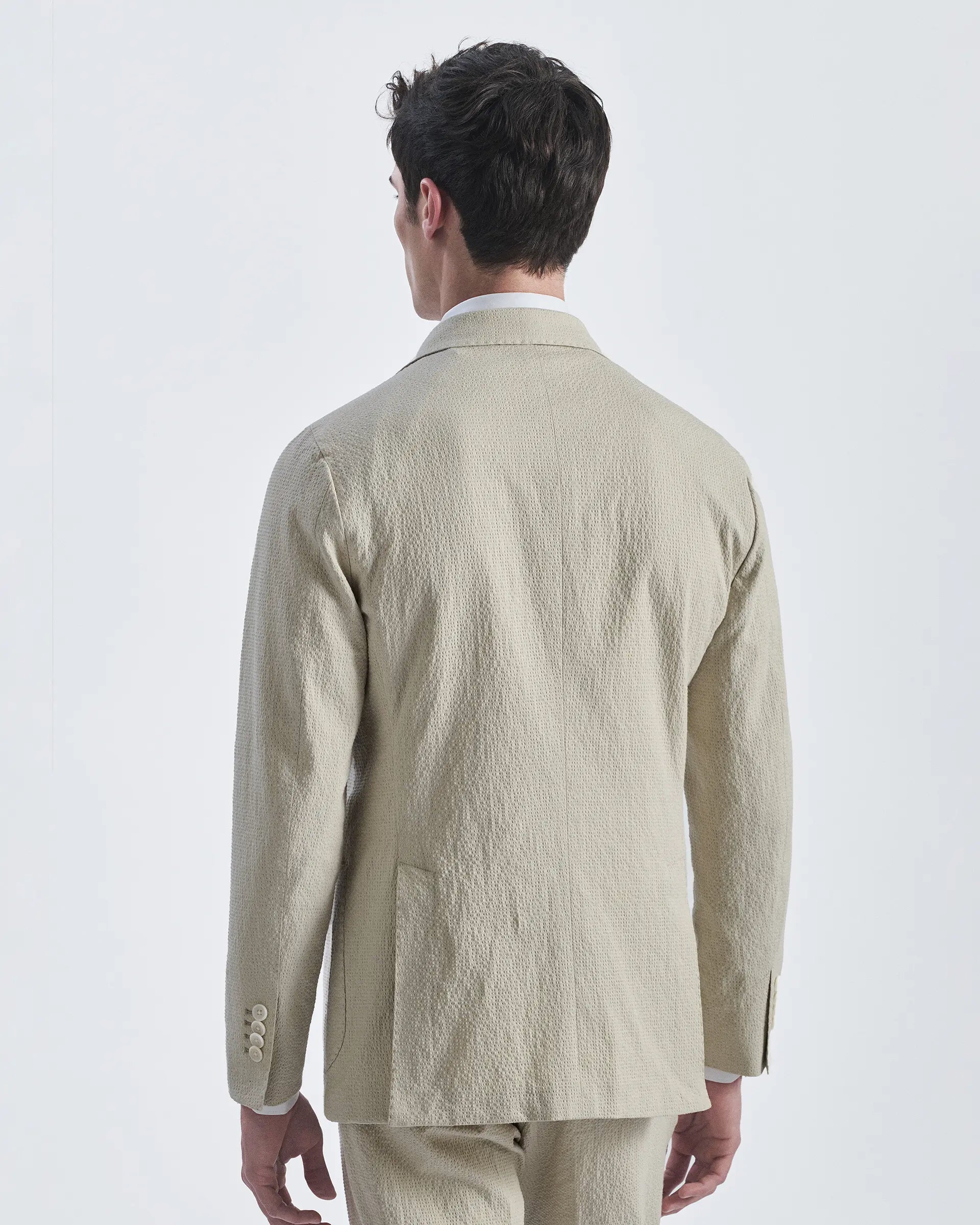 Traje cruzado beige en tejido seersucker de algodón y lino Subalpino