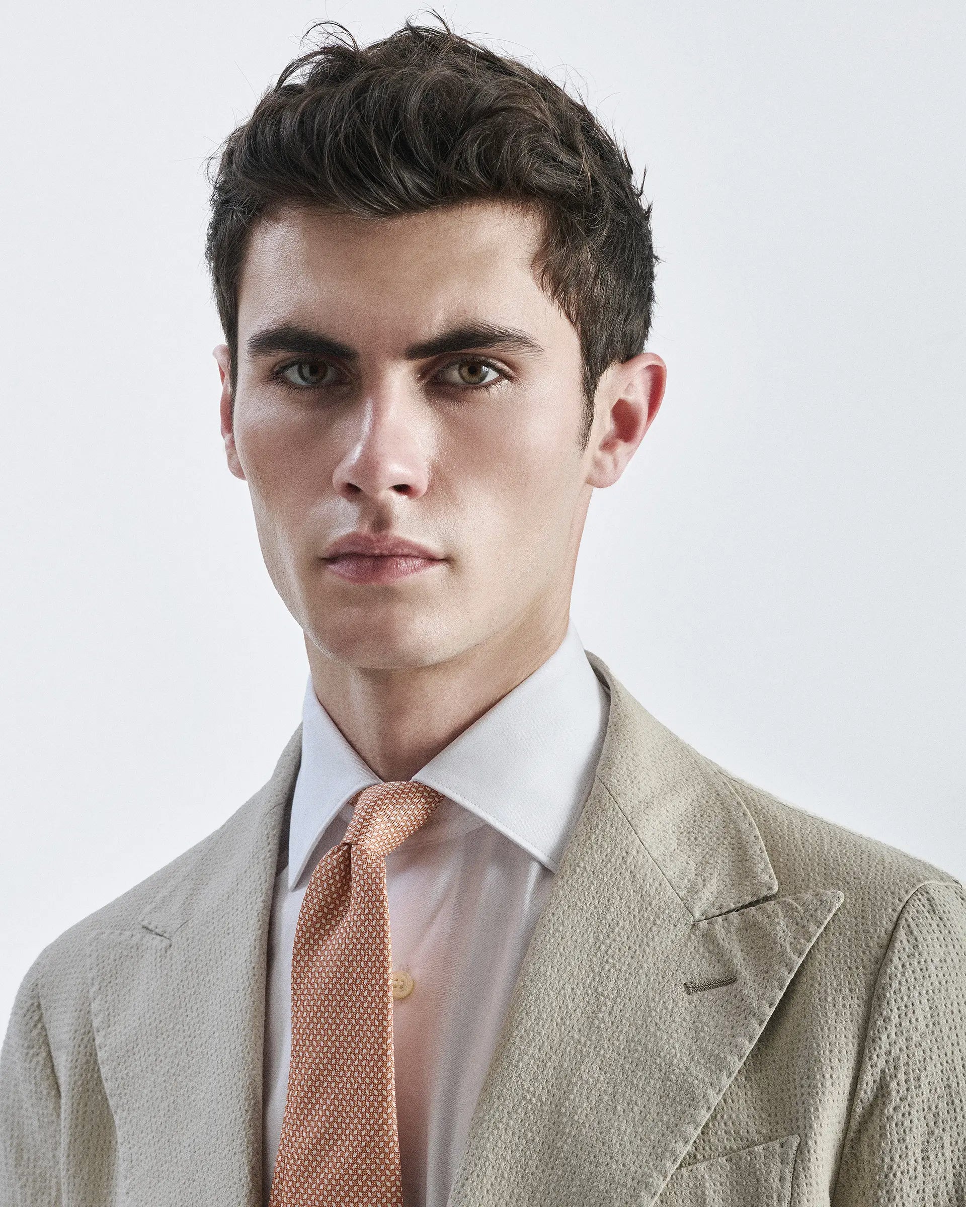 Traje cruzado confeccionado en seersucker de algodón elástico y lino para dar un toque de modernidad a un modelo clásico atemporal. La chaqueta deconstruida y sin forro se adapta perfectamente a la silueta gracias a su construcción sastre en semitela y se caracteriza por solapas de pico anchas, que le dan al traje un toque de refinamiento y por bolsillos de parche que añaden un toque de practicidad sin comprometer el estilo refinado de la chaqueta. Los pantalones de pinza simple completan el conjunto, ofreciendo un corte contemporáneo y una comodidad incomparable.
