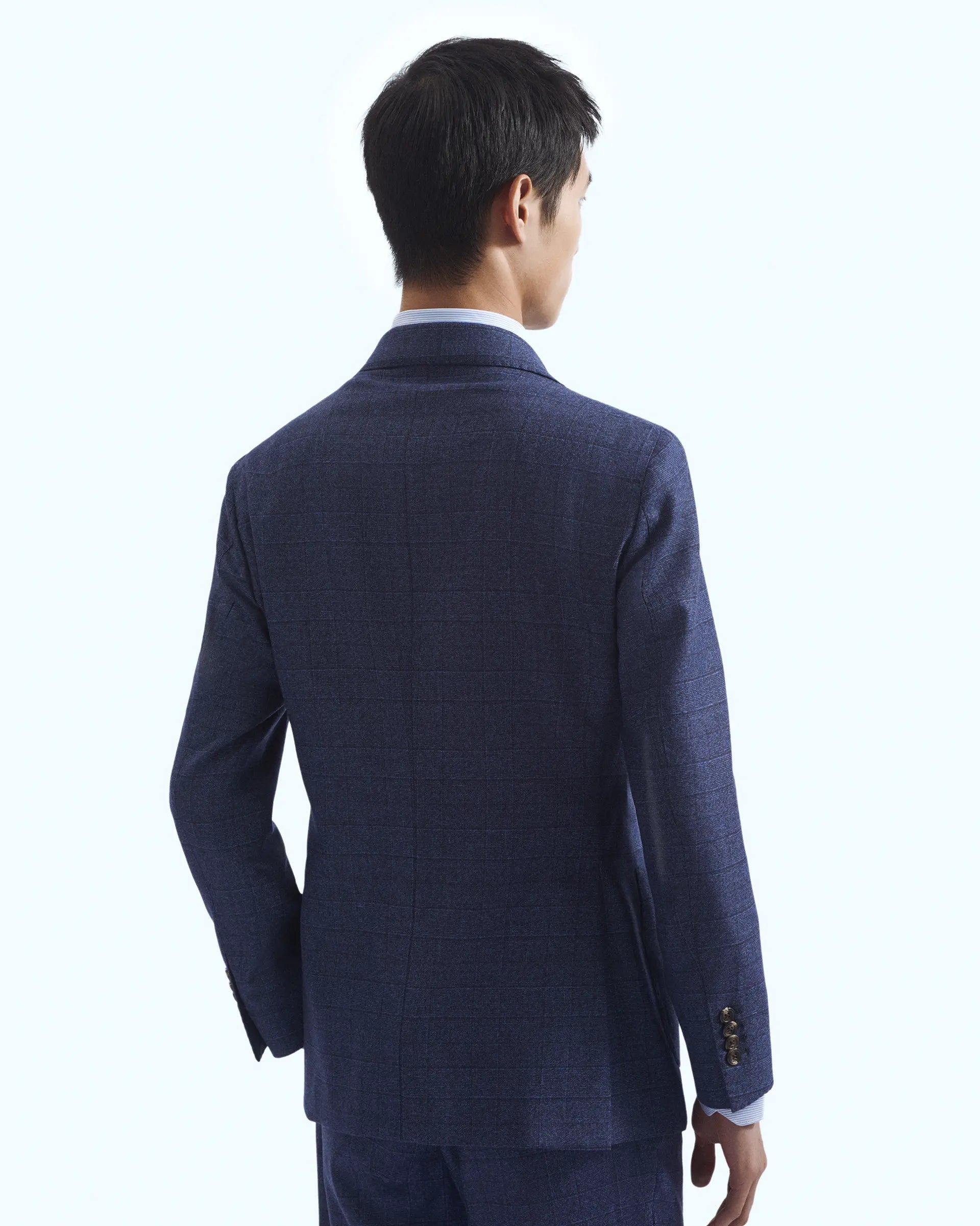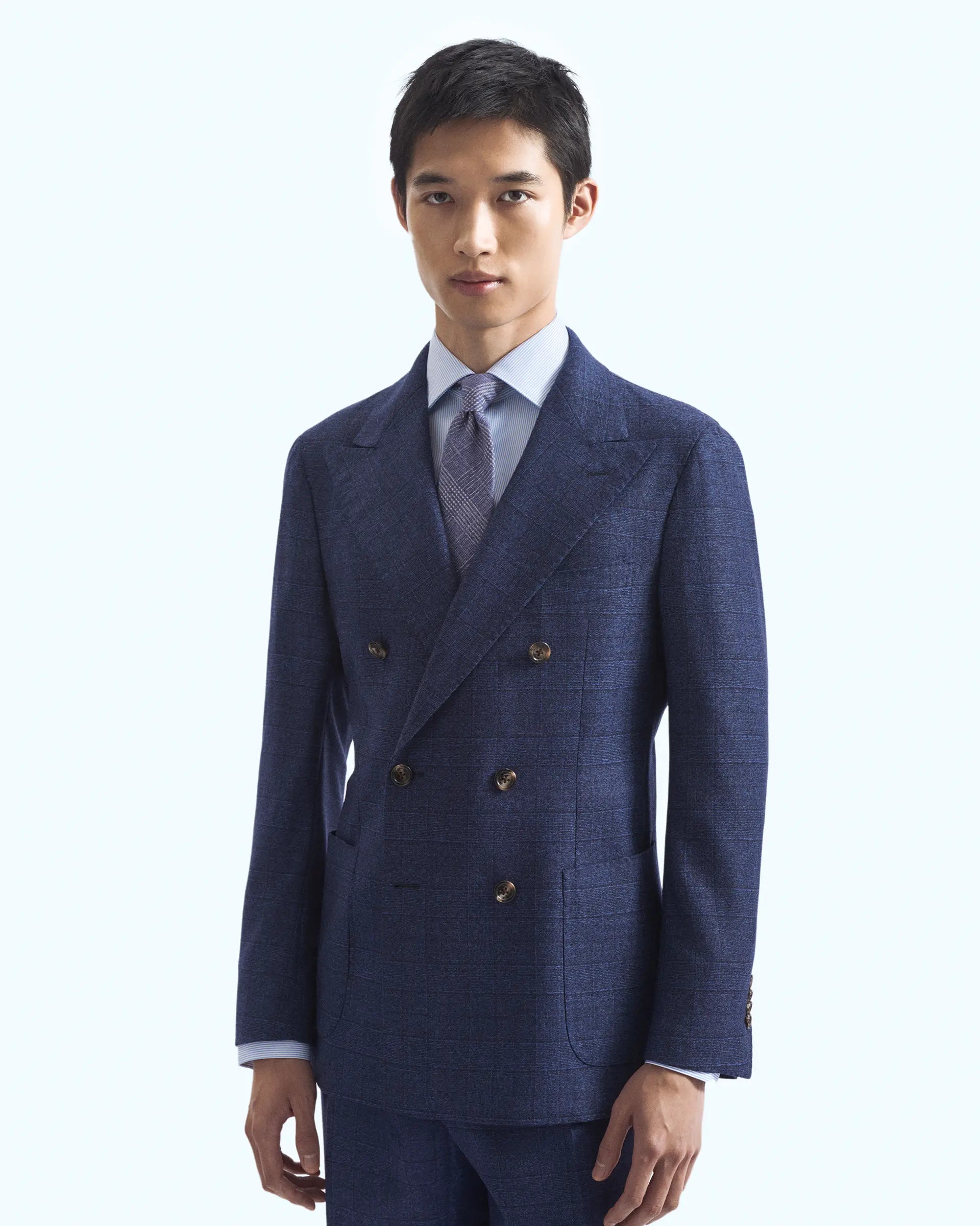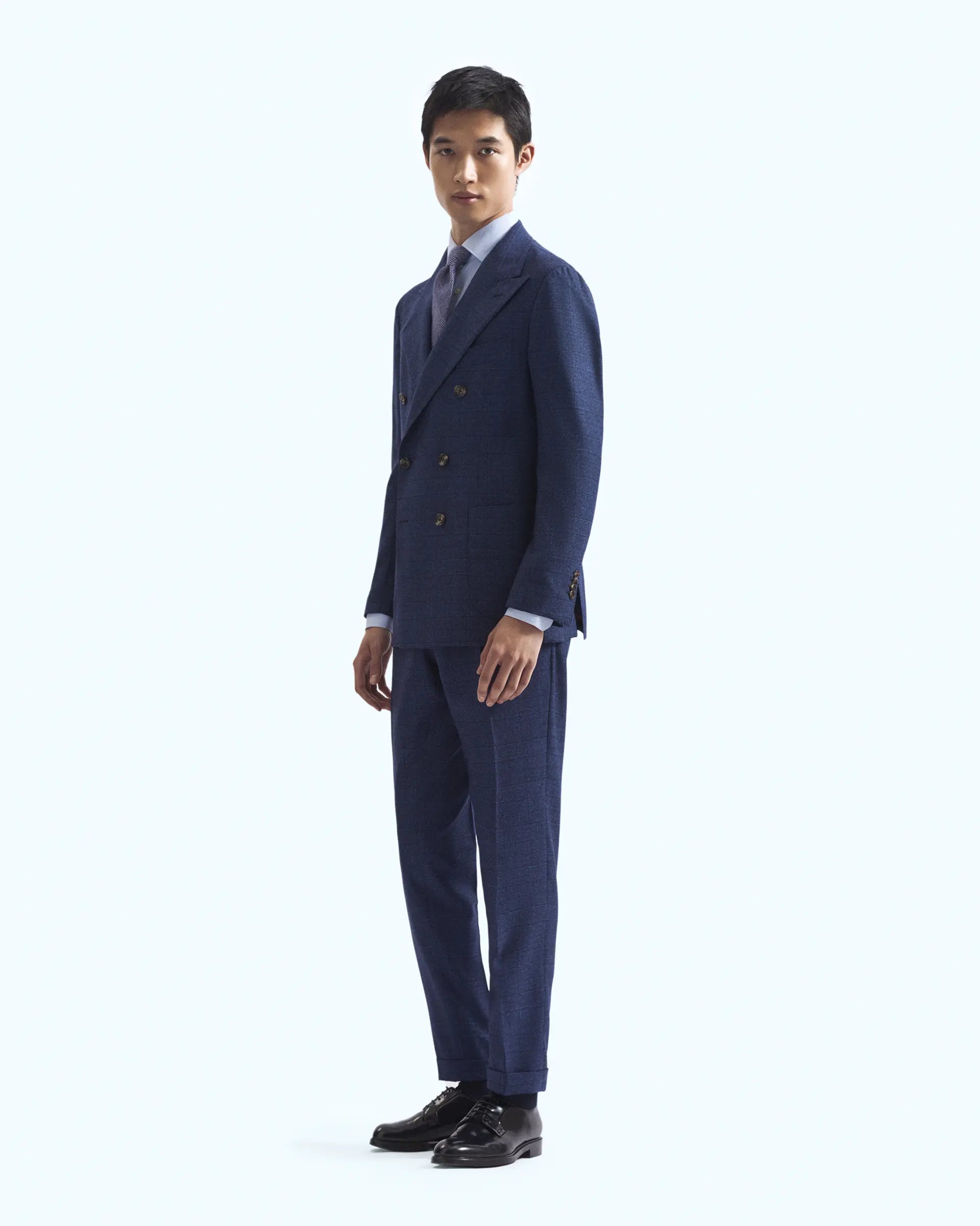 Vestido confeccionado con el exclusivo tejido “Zelander Natural Stretch” de Lanificio Loro Piana en un estampado que representa la combinación de la elegancia moderna y la tradición de la sastrería italiana. La chaqueta de seis botones sin forro tiene un ajuste clásico y presenta una solapa de pico ancha, bolsillos de parche y aberturas laterales para garantizar la máxima comodidad de movimiento. Se completa con un pantalón con pinza que define el estilo casual del traje.