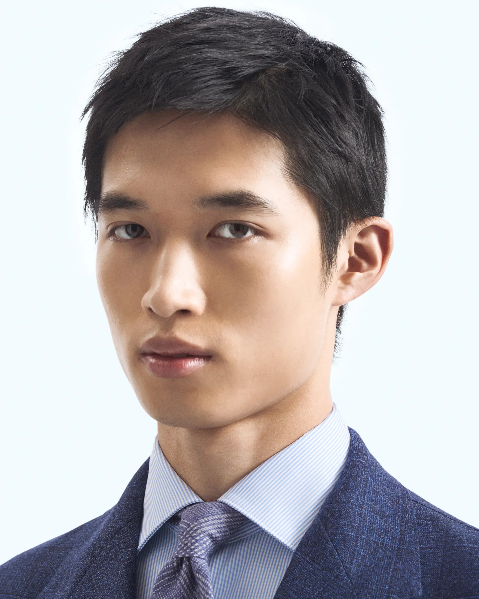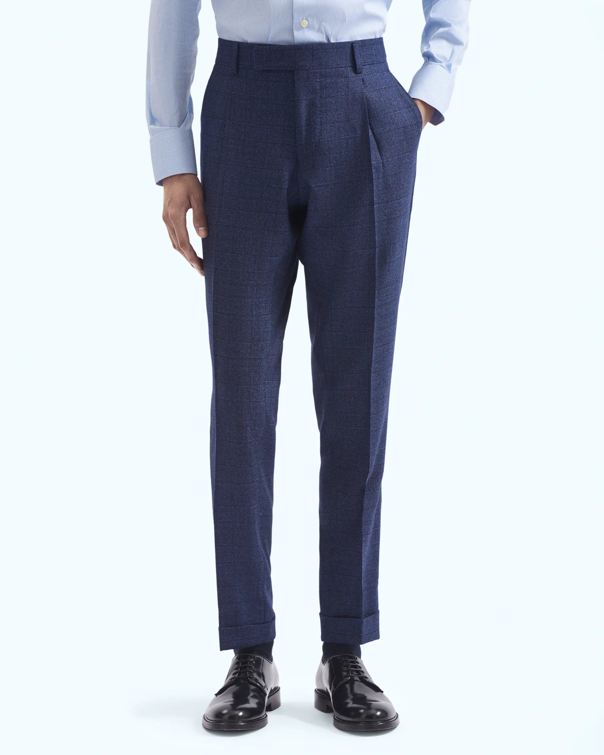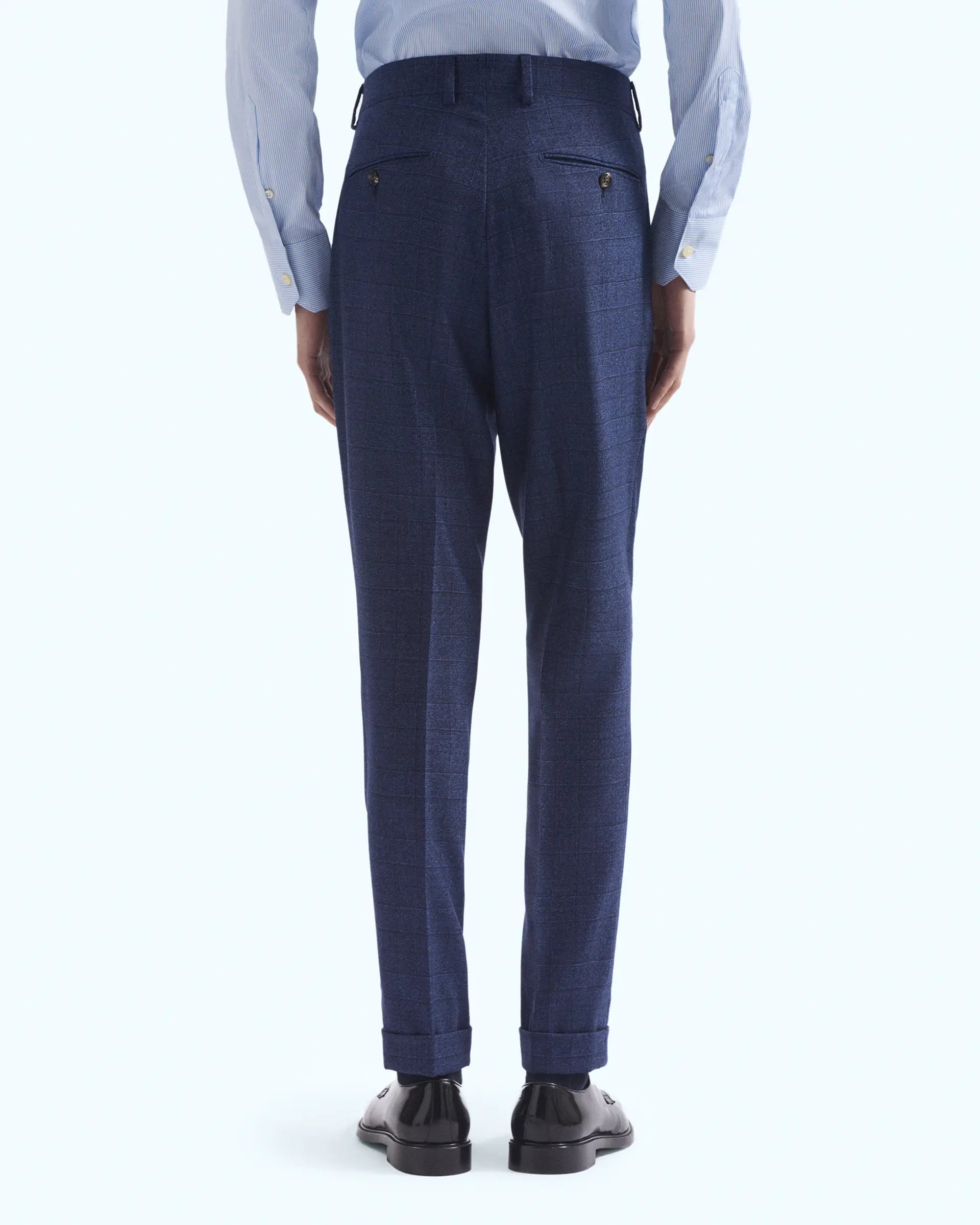 Vestido confeccionado con el exclusivo tejido “Zelander Natural Stretch” de Lanificio Loro Piana en un estampado que representa la combinación de la elegancia moderna y la tradición de la sastrería italiana. La chaqueta de seis botones sin forro tiene un ajuste clásico y presenta una solapa de pico ancha, bolsillos de parche y aberturas laterales para garantizar la máxima comodidad de movimiento. Se completa con un pantalón con pinza que define el estilo casual del traje.