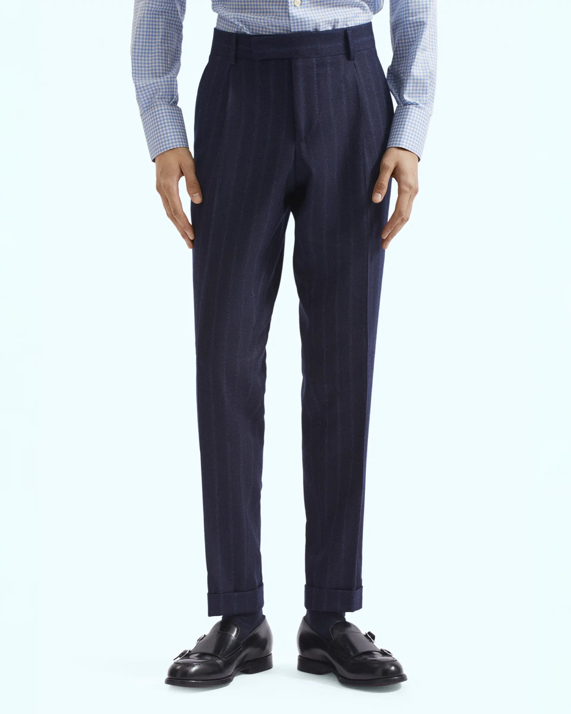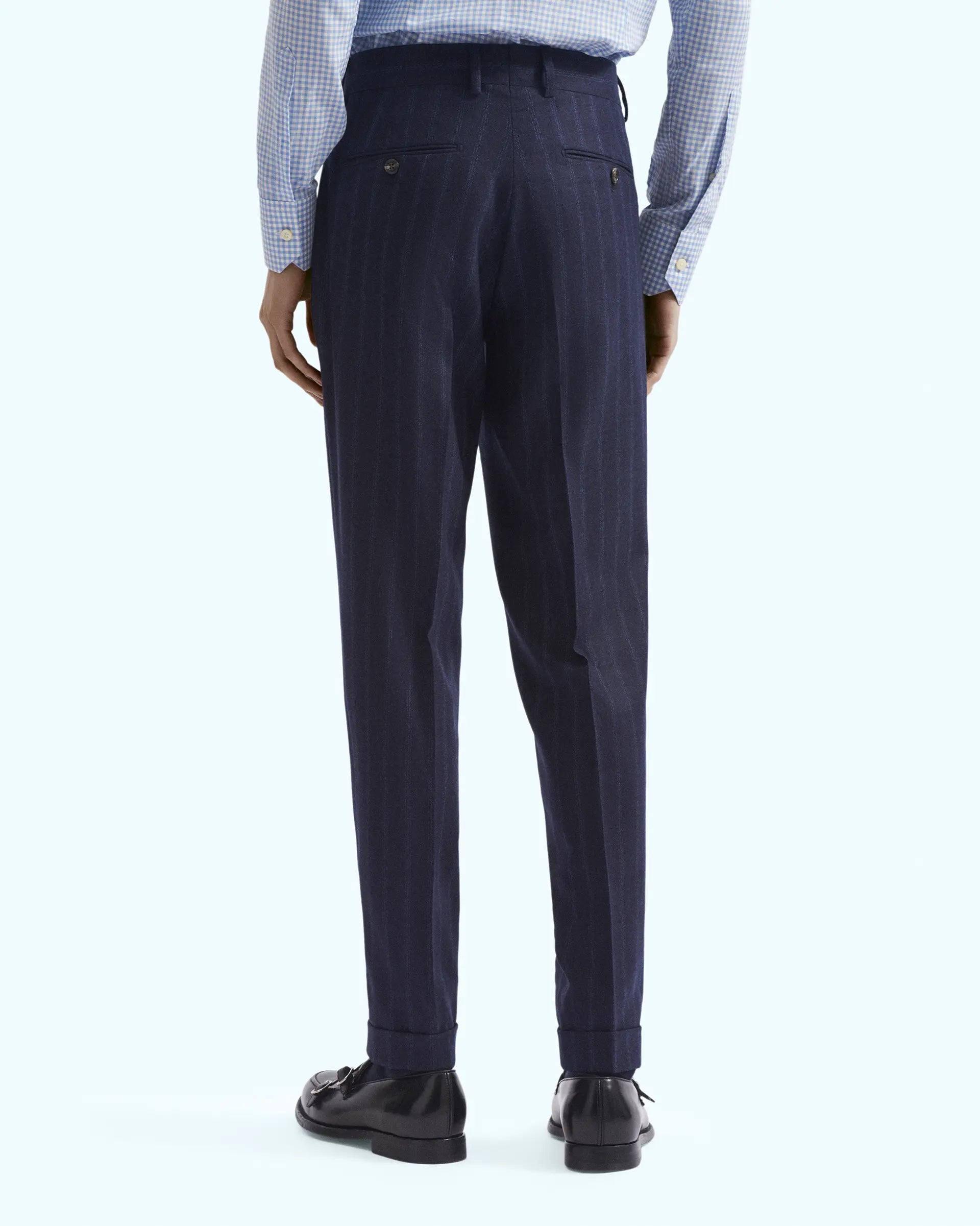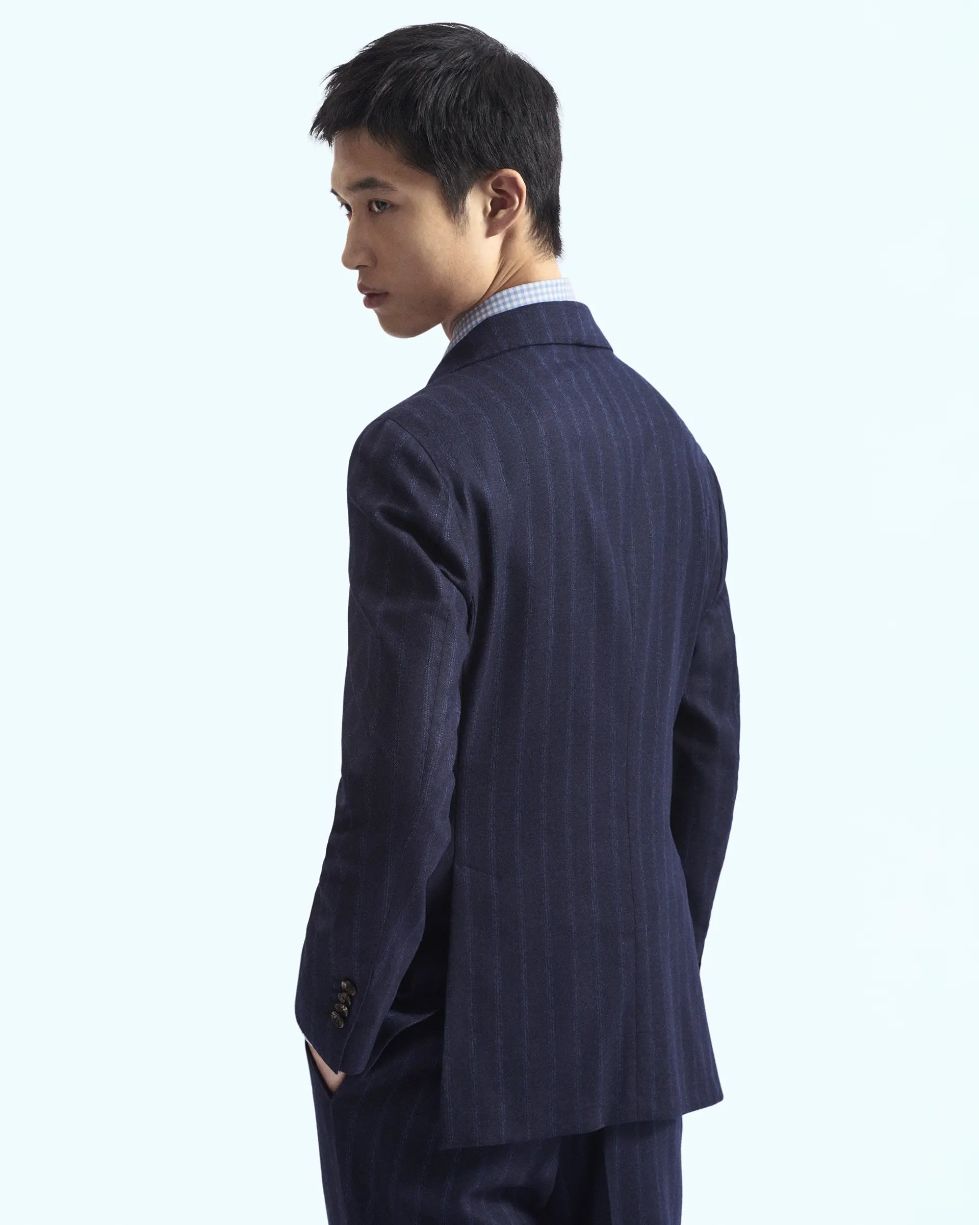 Vestido confeccionado con el exclusivo tejido “Zelander Natural Stretch” de Lanificio Loro Piana en un estampado que representa la combinación de la elegancia moderna y la tradición de la sastrería italiana. La chaqueta de seis botones sin forro tiene un ajuste clásico y presenta una solapa de pico ancha, bolsillos de parche y aberturas laterales para garantizar la máxima comodidad de movimiento. Se completa con un pantalón con pinza que define el estilo casual del traje.