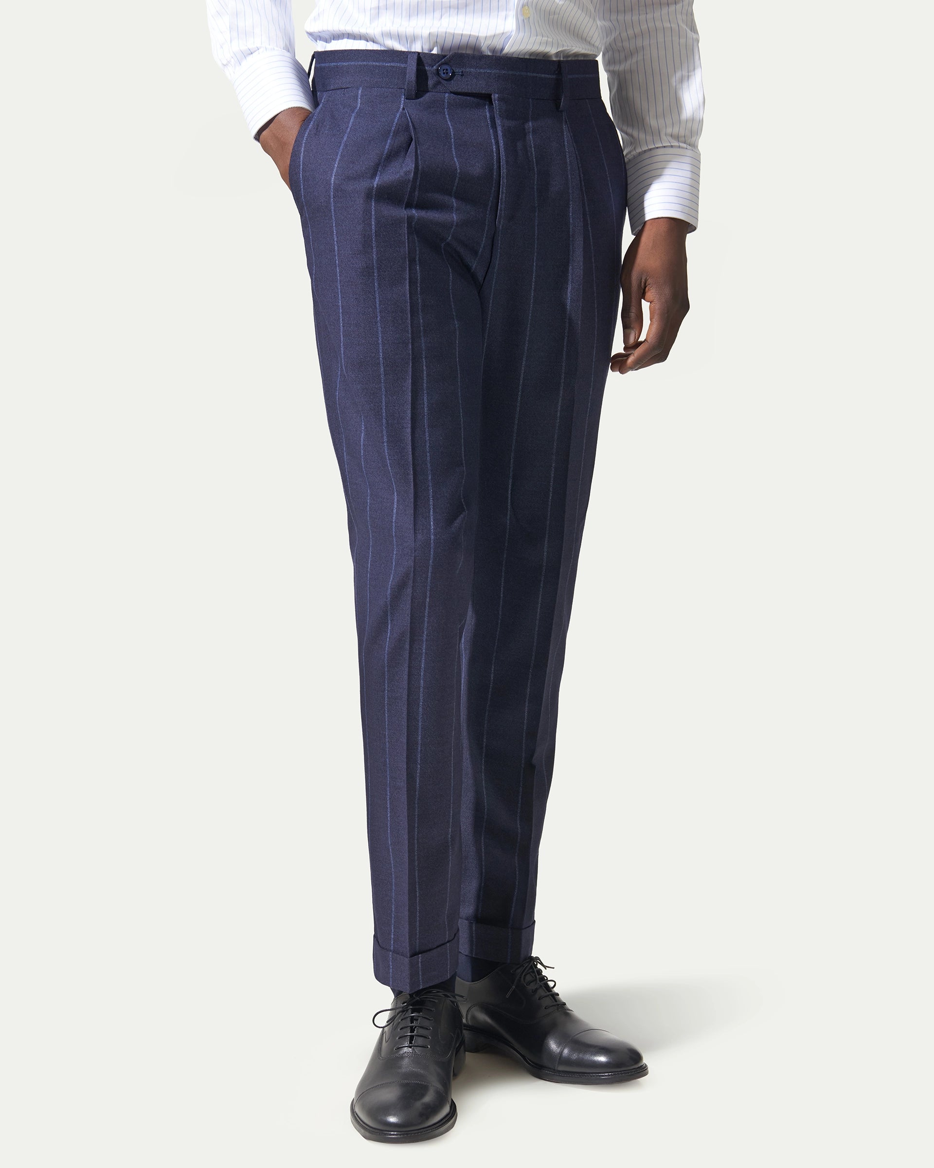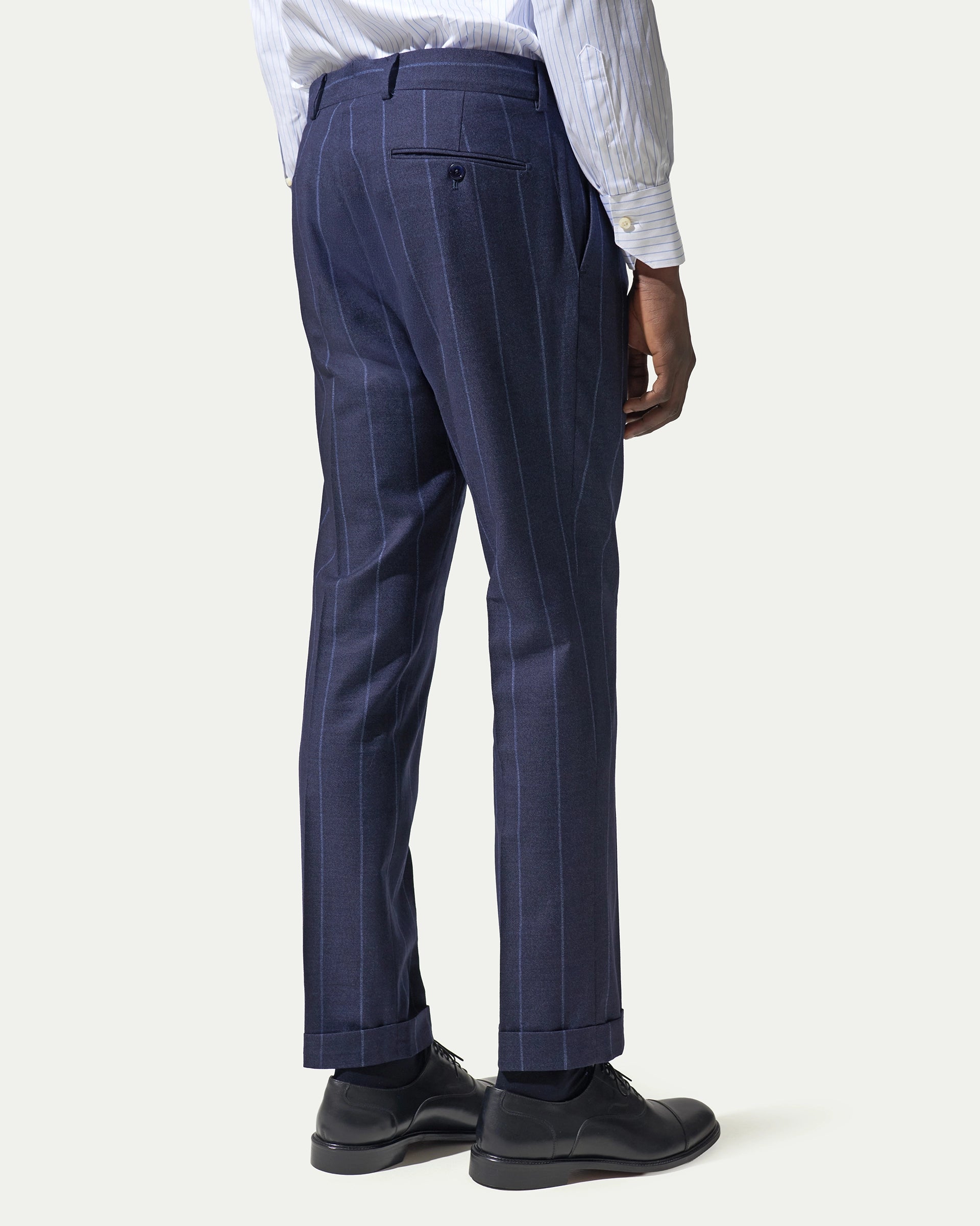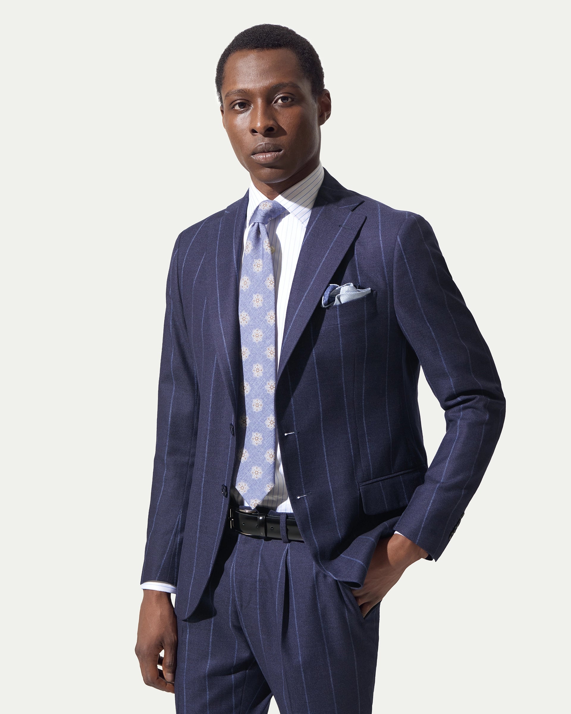 Tailored suit crafted from a high-performance, stretchy fabric that adapts to the body's movements. The lined, two-button jacket is paired with a refined, modern single-pleated waistcoat. The contrasting pinstripe adds a touch of vivacity to a timeless classic.