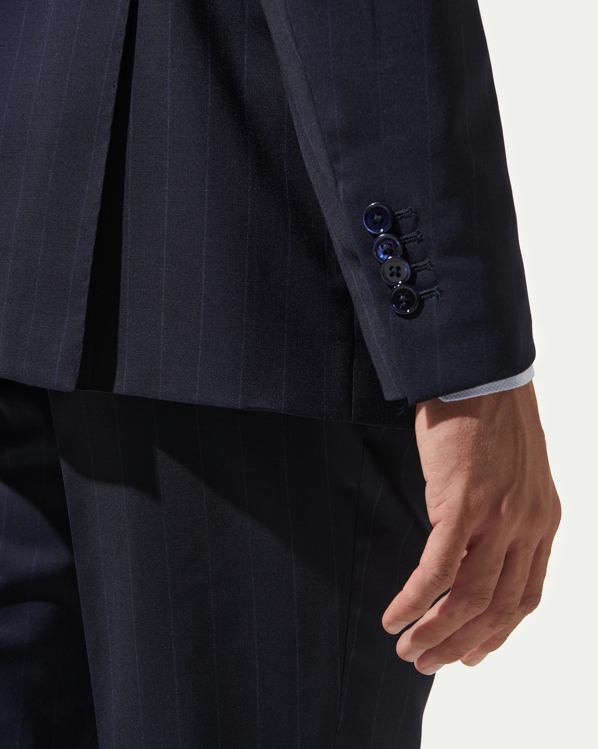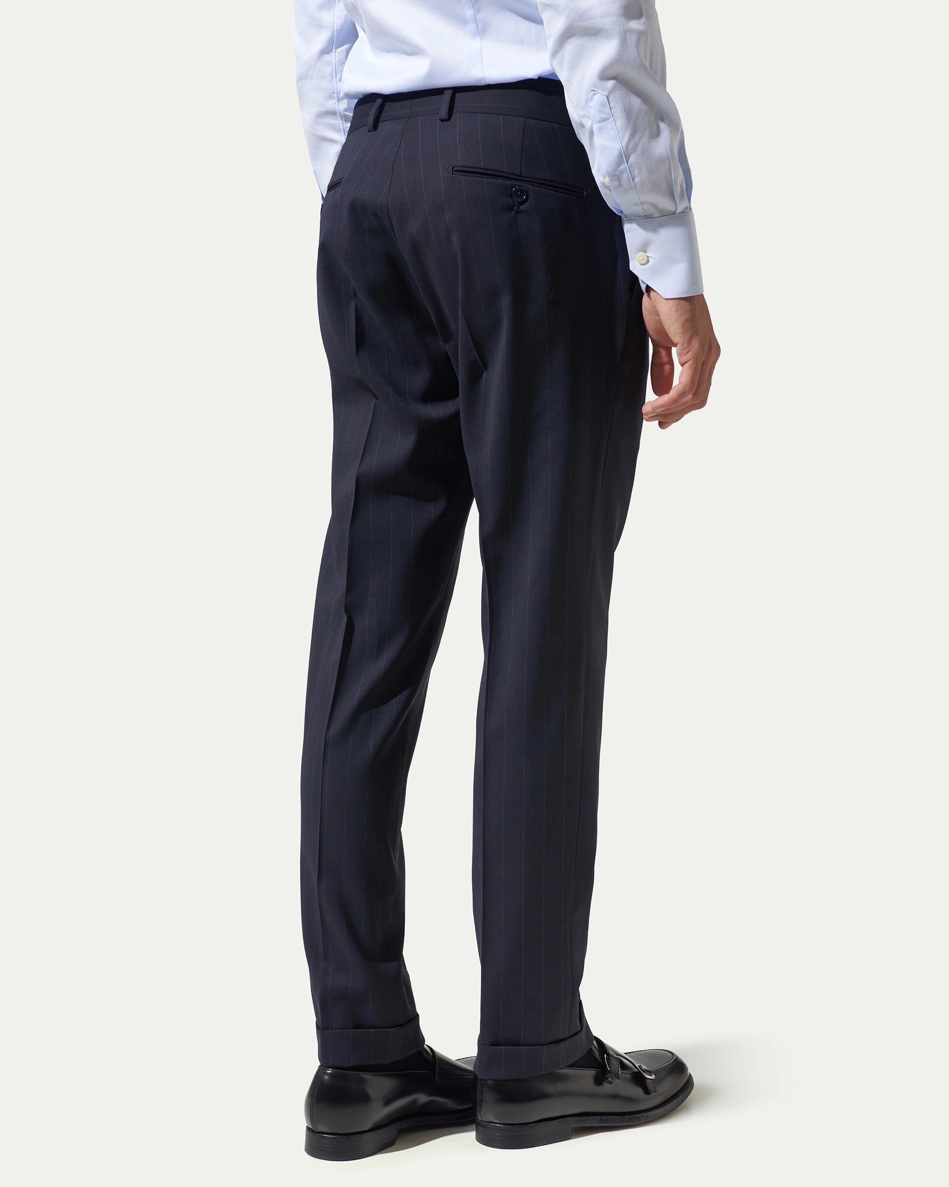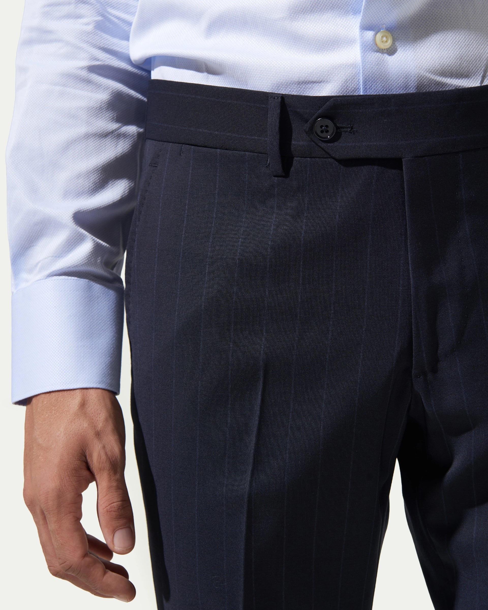 A suit with a strong sartorial accent, crafted in a contrasting pinstripe pattern that adds vivacity to a timeless classic. A men's wardrobe essential, customizable to suit your style. The lined jacket, paired with flat-front trousers, creates a perfect balance of shape and volume. The refined details complete this extremely versatile and impeccable suit.