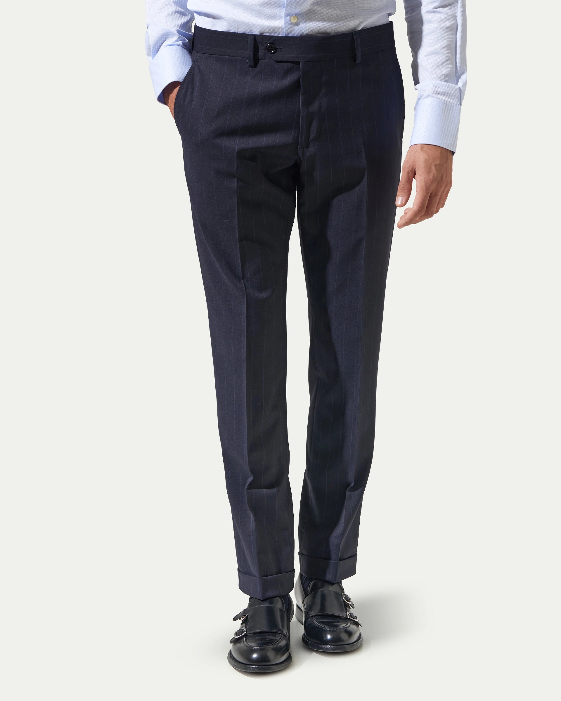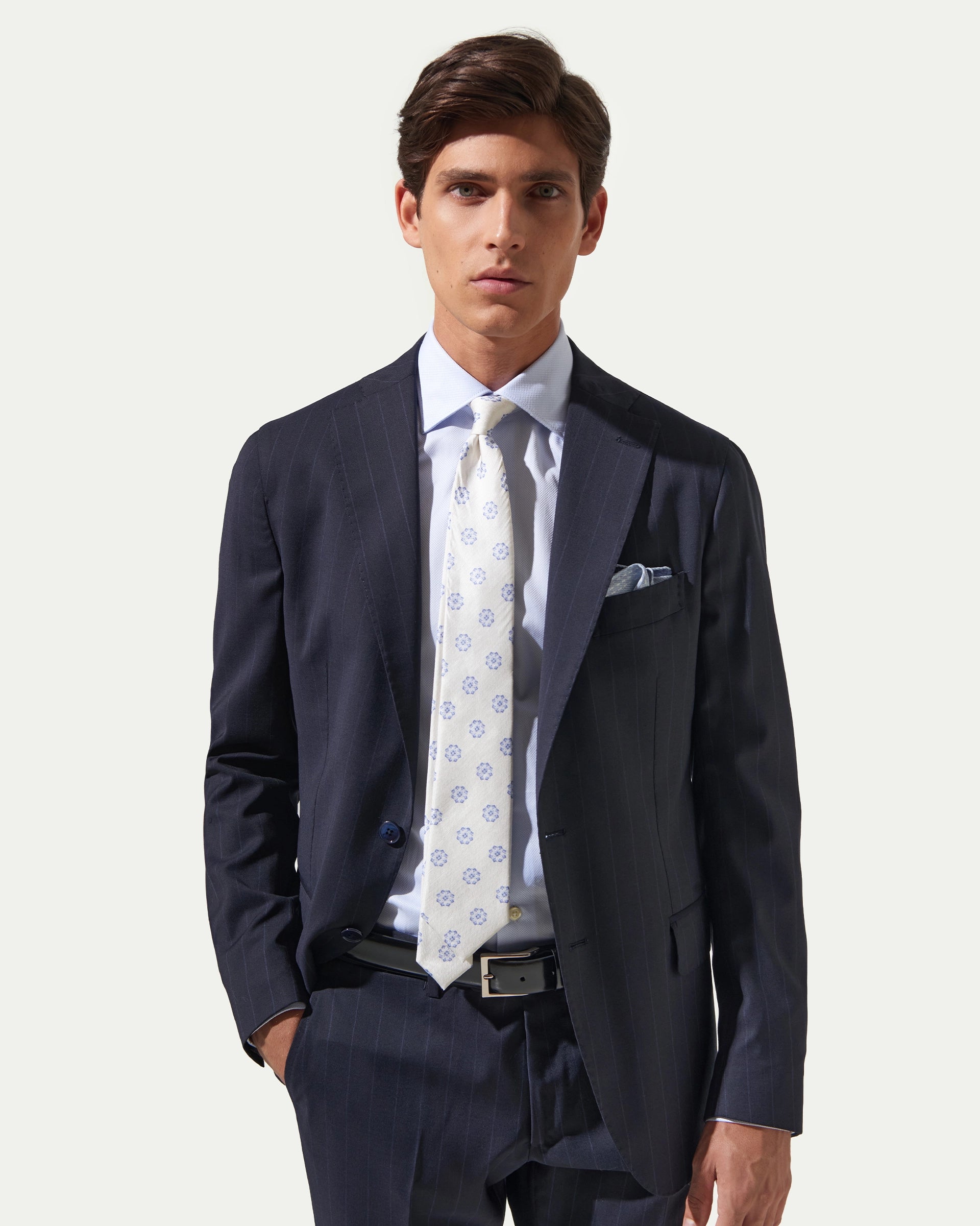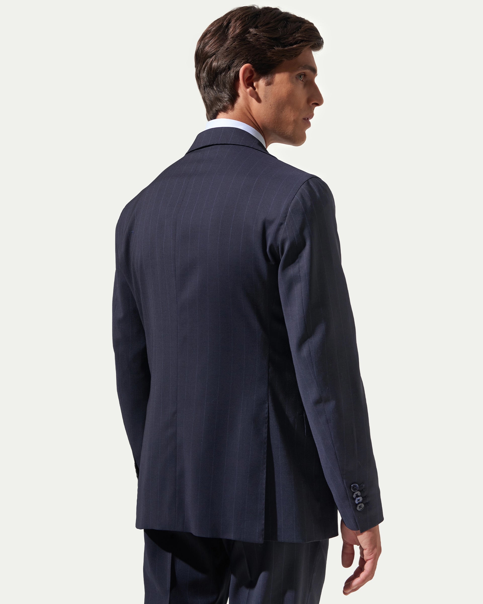 A suit with a strong sartorial accent, crafted in a contrasting pinstripe pattern that adds vivacity to a timeless classic. A men's wardrobe essential, customizable to suit your style. The lined jacket, paired with flat-front trousers, creates a perfect balance of shape and volume. The refined details complete this extremely versatile and impeccable suit.