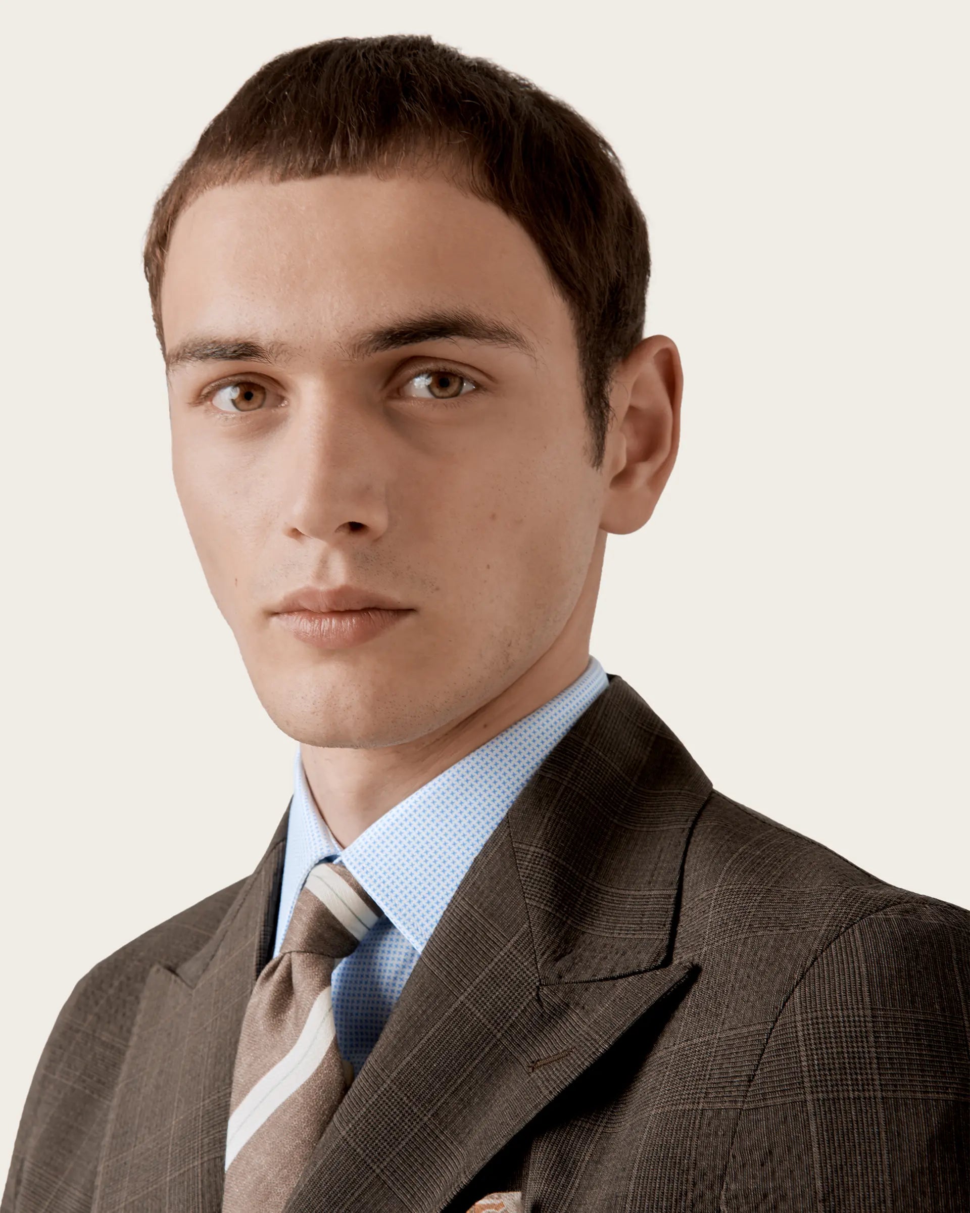 Abito doppiopetto nella classica fantasia Principe di Galles realizzato con tessuto altamente performante del Lanificio Zignone in grado di adattarsi naturalmente ai movimenti del corpo. La giacca sfoderata a sei bottoni presenta una vestibilità classica ed è caratterizzata da un ampio rever a lancia, tasche a toppa e spacchi laterali per garantire il massimo confort nei movimenti.