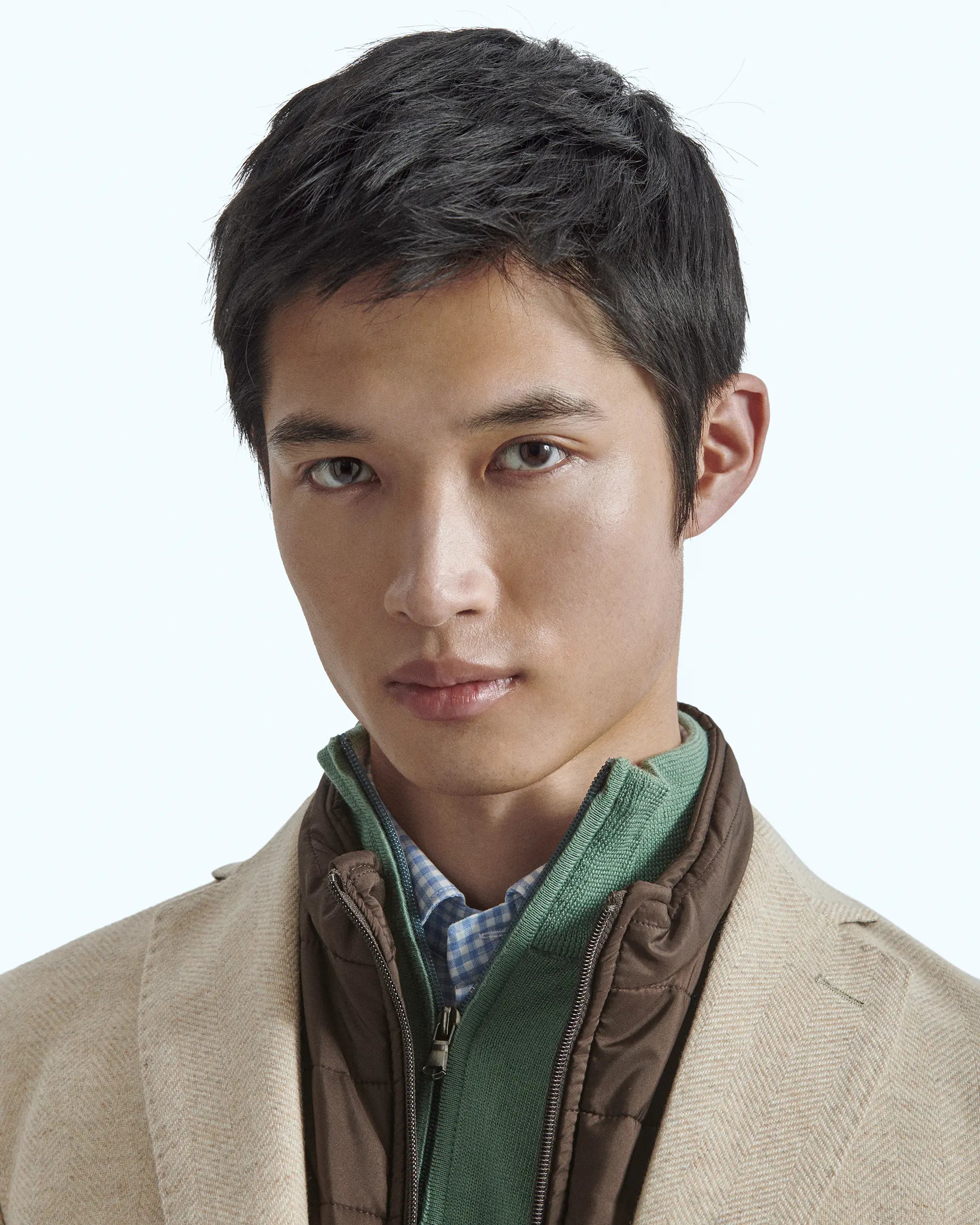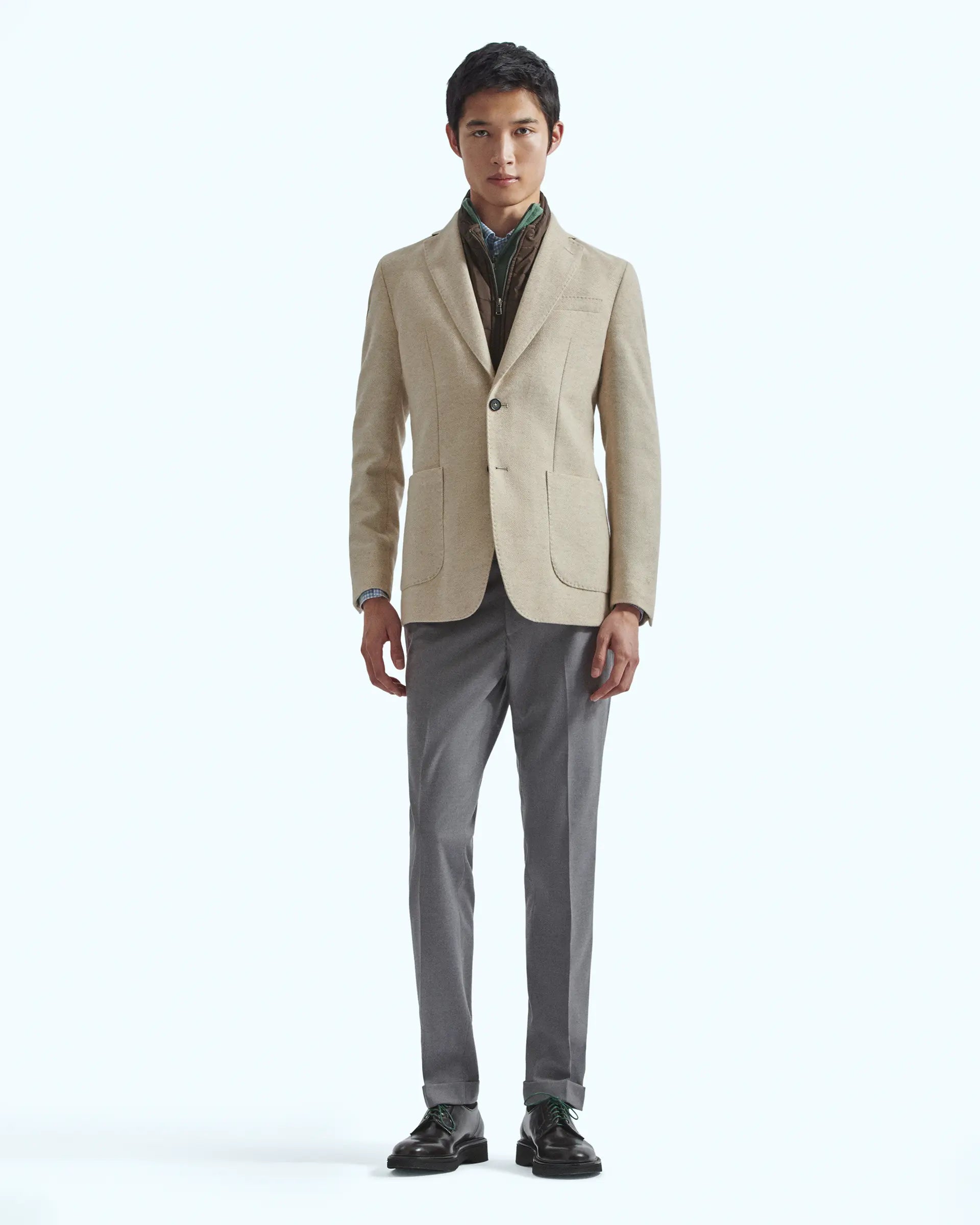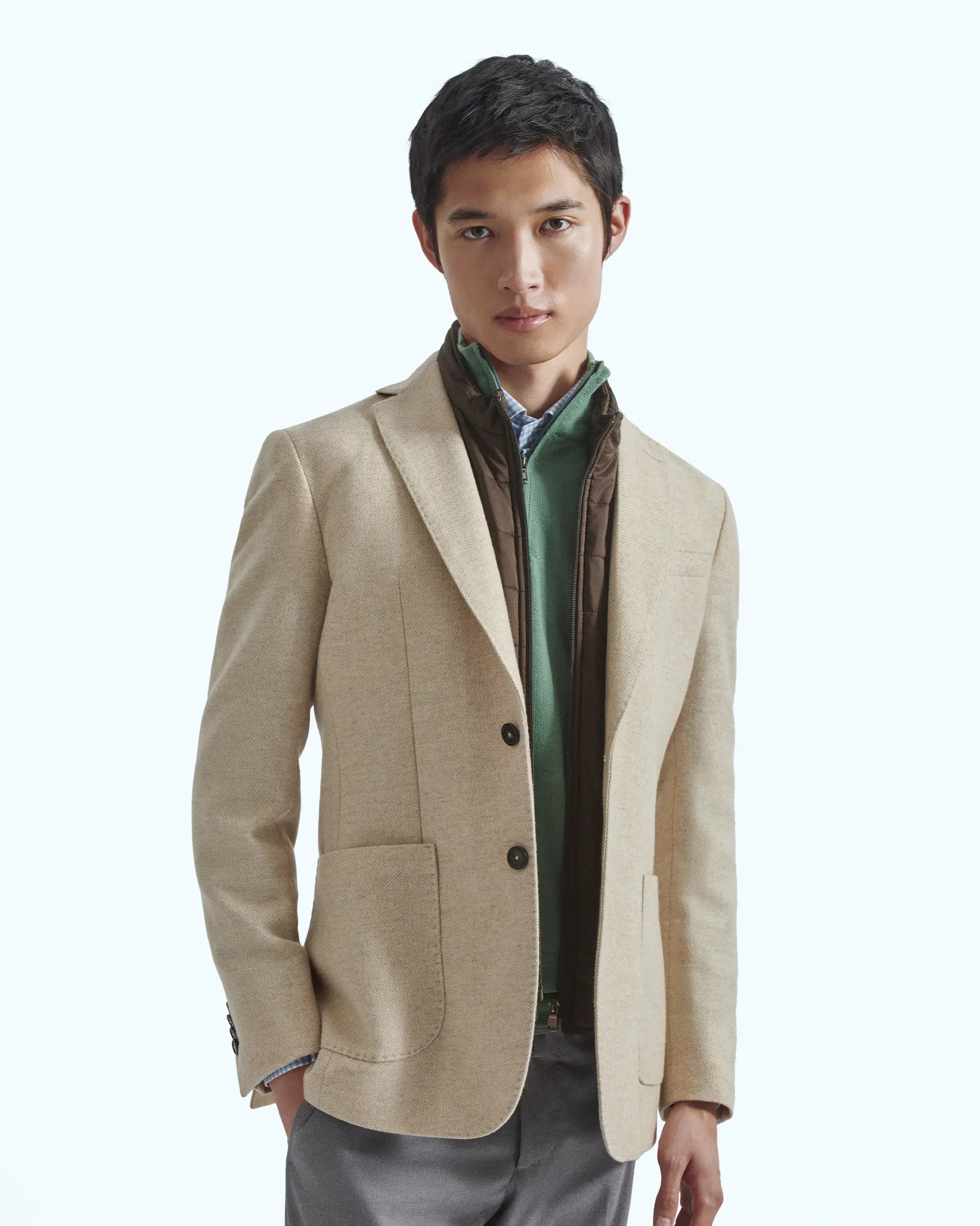 Lavorazione sartoriale e materiali pregiati incontrano lo stile informale di questo capo, mix perfetto tra giacca sportiva e un capo outwear, che acquista un appeal versatile e confortevole grazie alla pratica pettorina removibile. Realizzata nella versione monopetto a due bottini con le tasche applicate per un mood casual che si sposa perfettamente alla struttura della giacca, must have di un guardaroba maschile nuovo e dinamico.